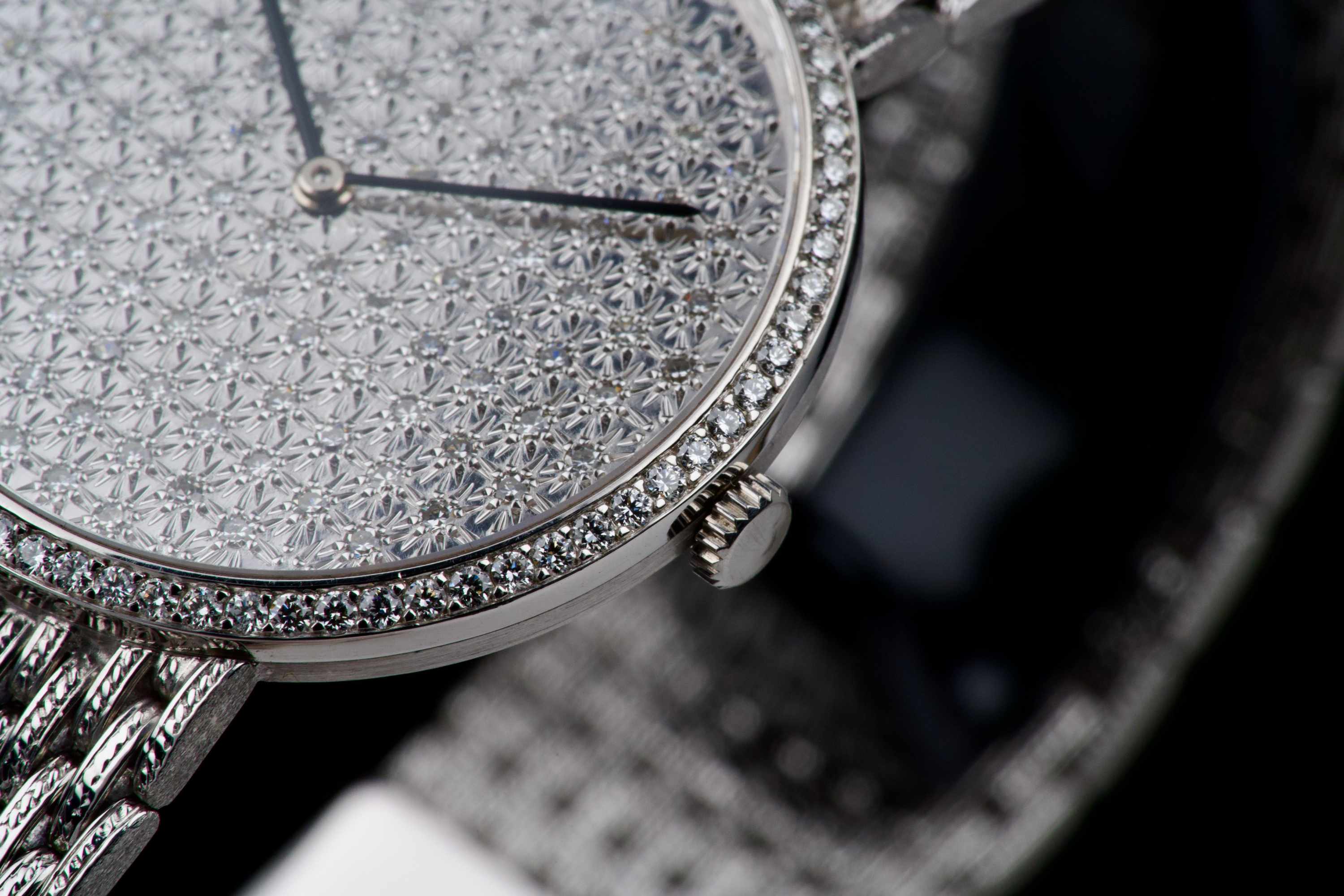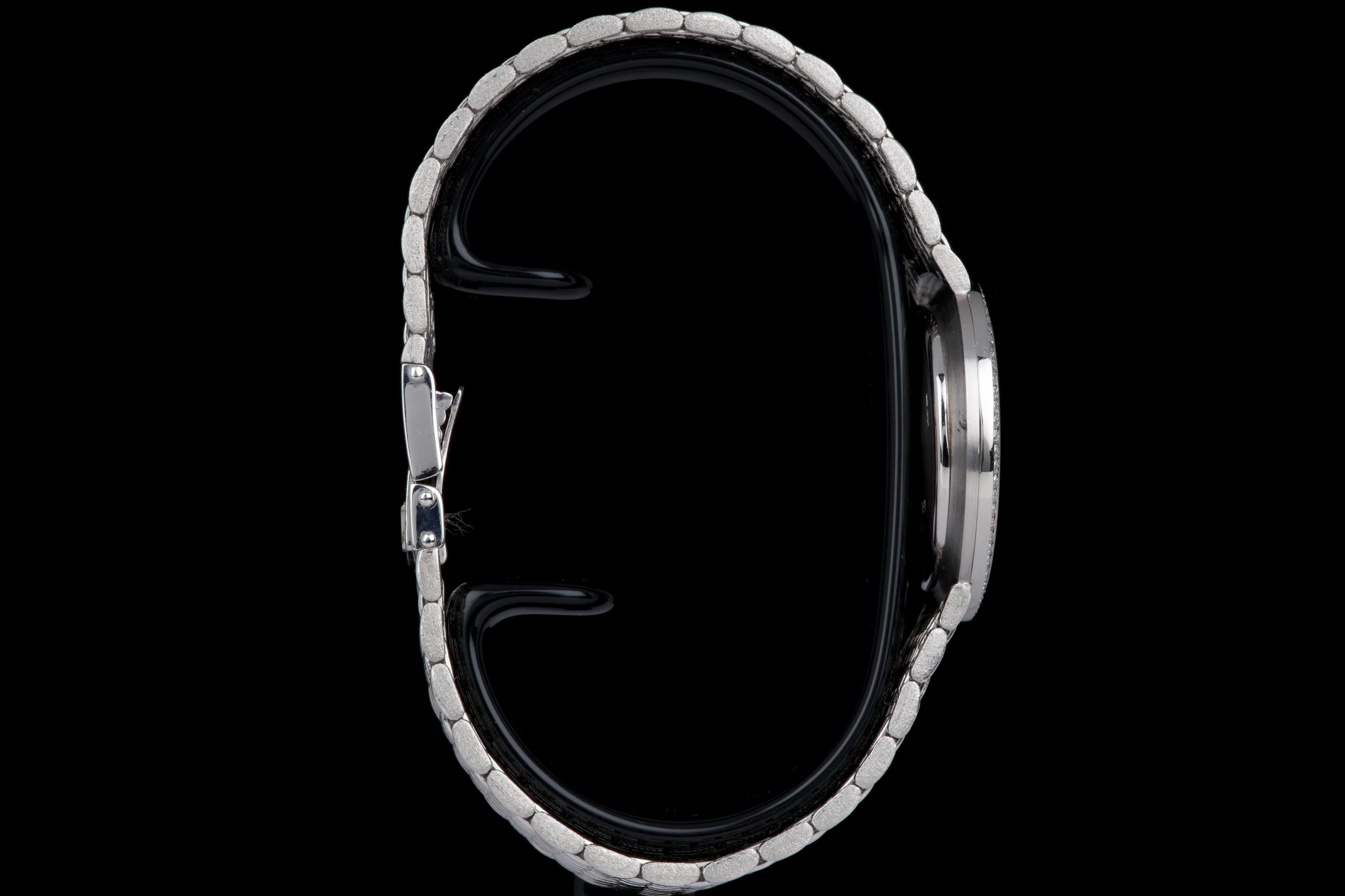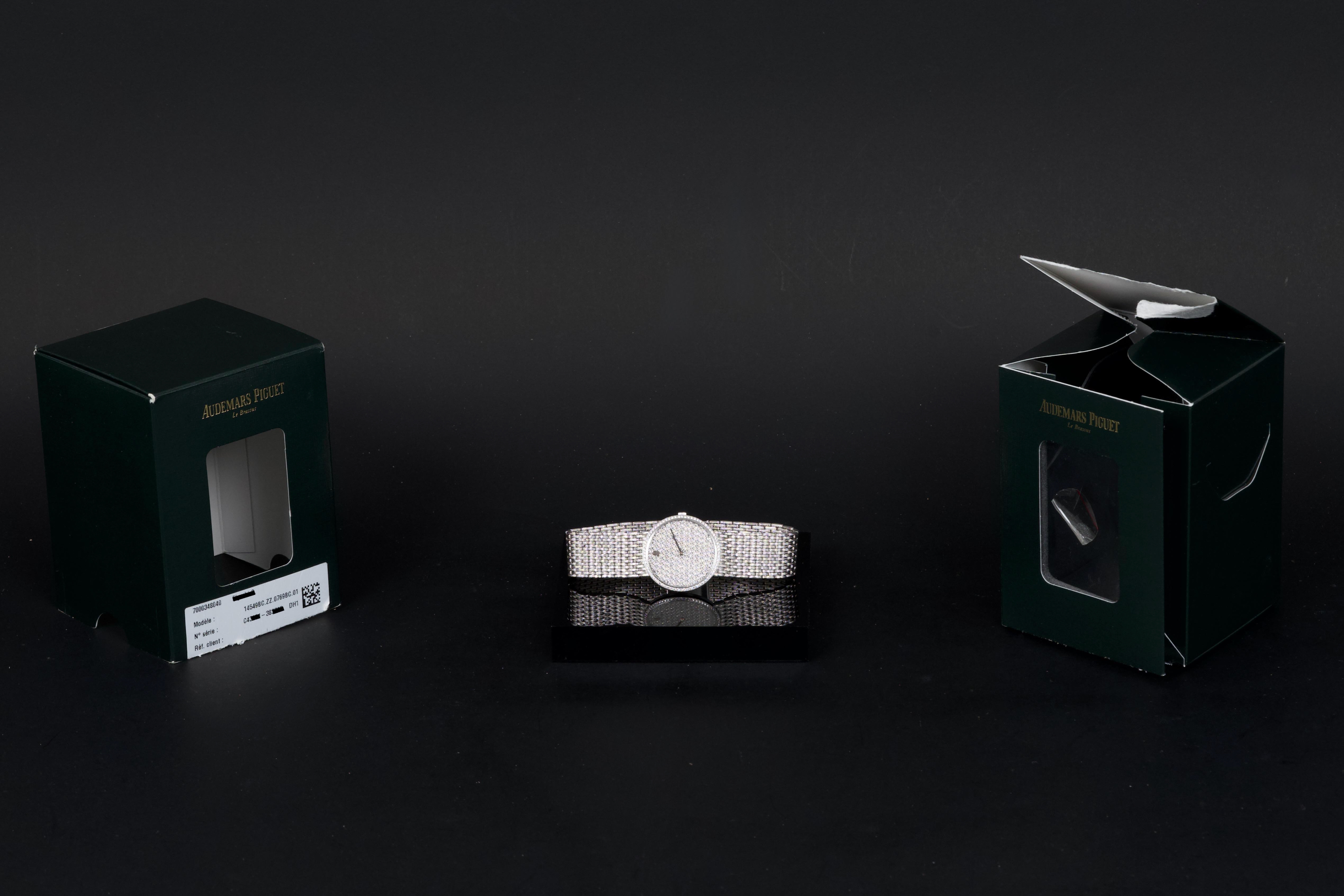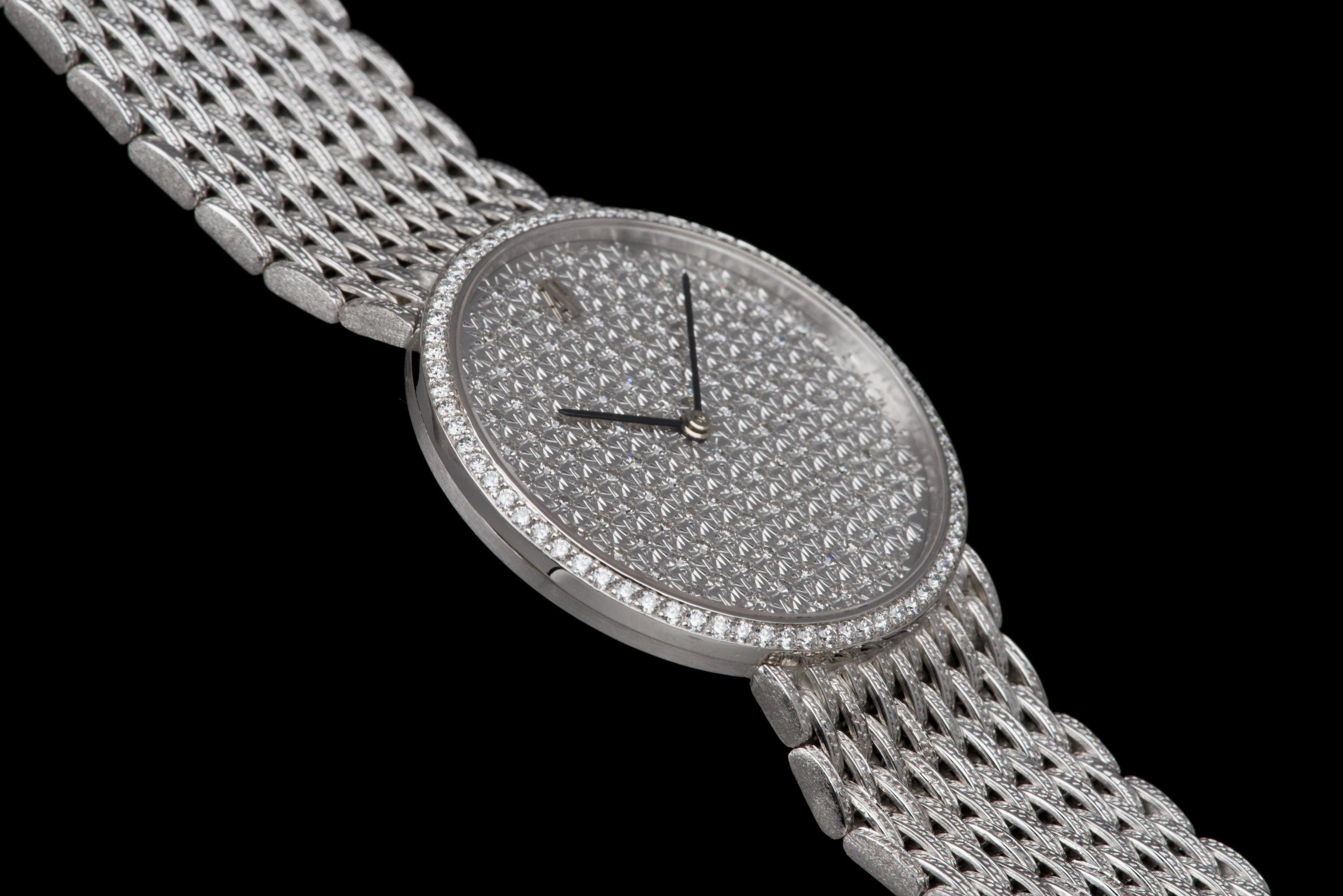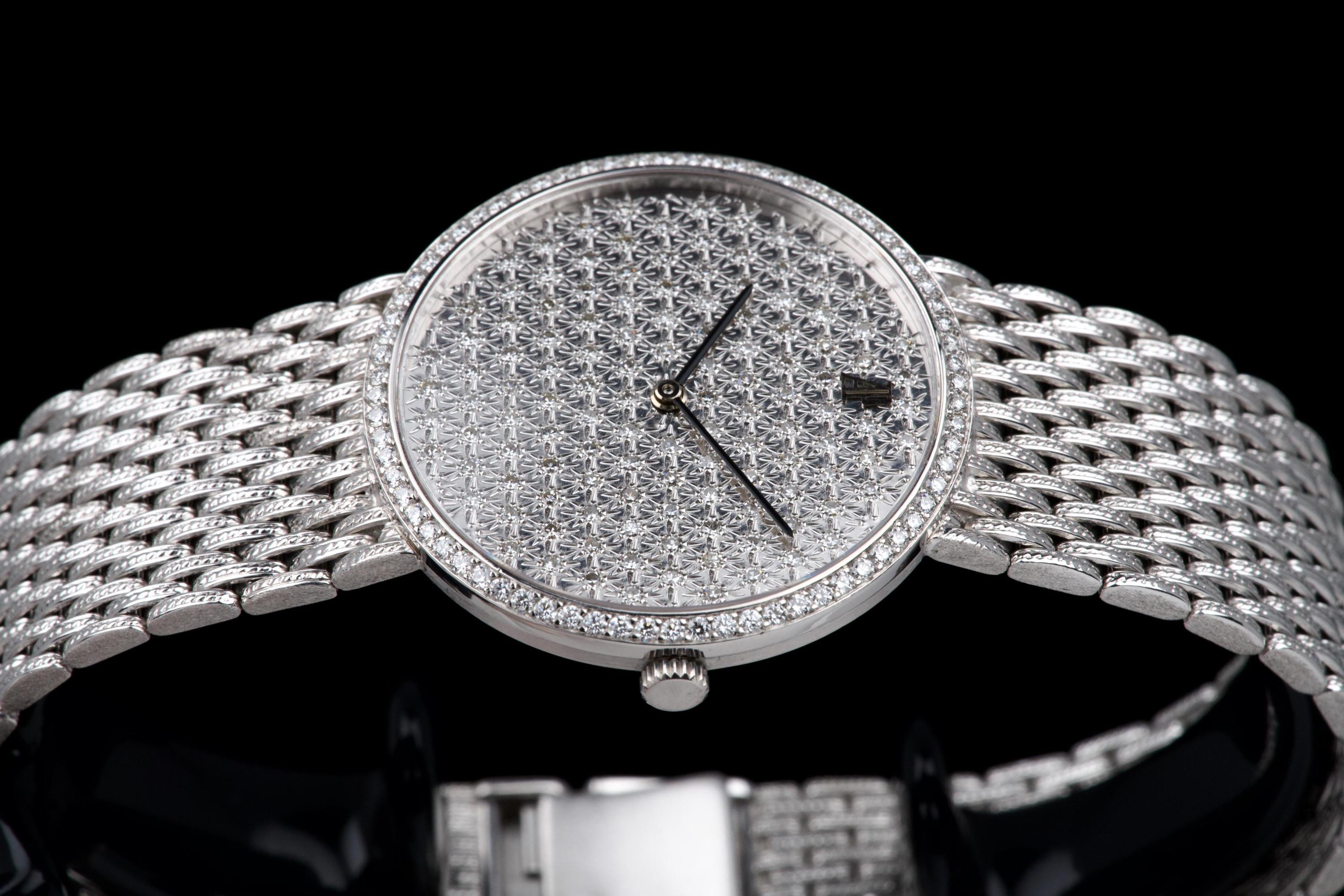 The present Audemars Piguet Classic reference 14549BC, dating to the 1970s, is an exceptionally rare and striking white-gold bracelet watch that perfectly reflects the bold and luxurious aesthetic of the era. Executed entirely in 18K white gold, the watch features a 31 mm round case set with a brilliant diamond-set bezel and a spectacular pavé diamond dial, creating a dazzling and highly refined appearance. The watch is further distinguished by its integrated “paillasson”-style white-gold bracelet, seamlessly soldered to the case and fully signed Audemars Piguet. The bracelet is generously proportioned and can accommodate wrists of up to approximately 19 cm, making it particularly comfortable despite its jewelry-like construction. The watch is powered by a manual-winding movement, consistent with the elegant, ultra-refined nature of high-jewelry watches produced by the manufacture during this period. It is likely that the watch has been recently serviced and polished by Audemars Piguet, as it is accompanied by a service presentation box, although no service invoice is present. The watch is preserved in excellent overall condition, with the diamonds, case, and bracelet presenting beautifully. Rare, luxurious, and emblematic of the daring design language of the 1970s, this Audemars Piguet reference 14549BC represents a remarkable opportunity to acquire an unusual and highly collectible vintage high-jewelry wristwatch from one of Switzerland’s most prestigious manufactures.