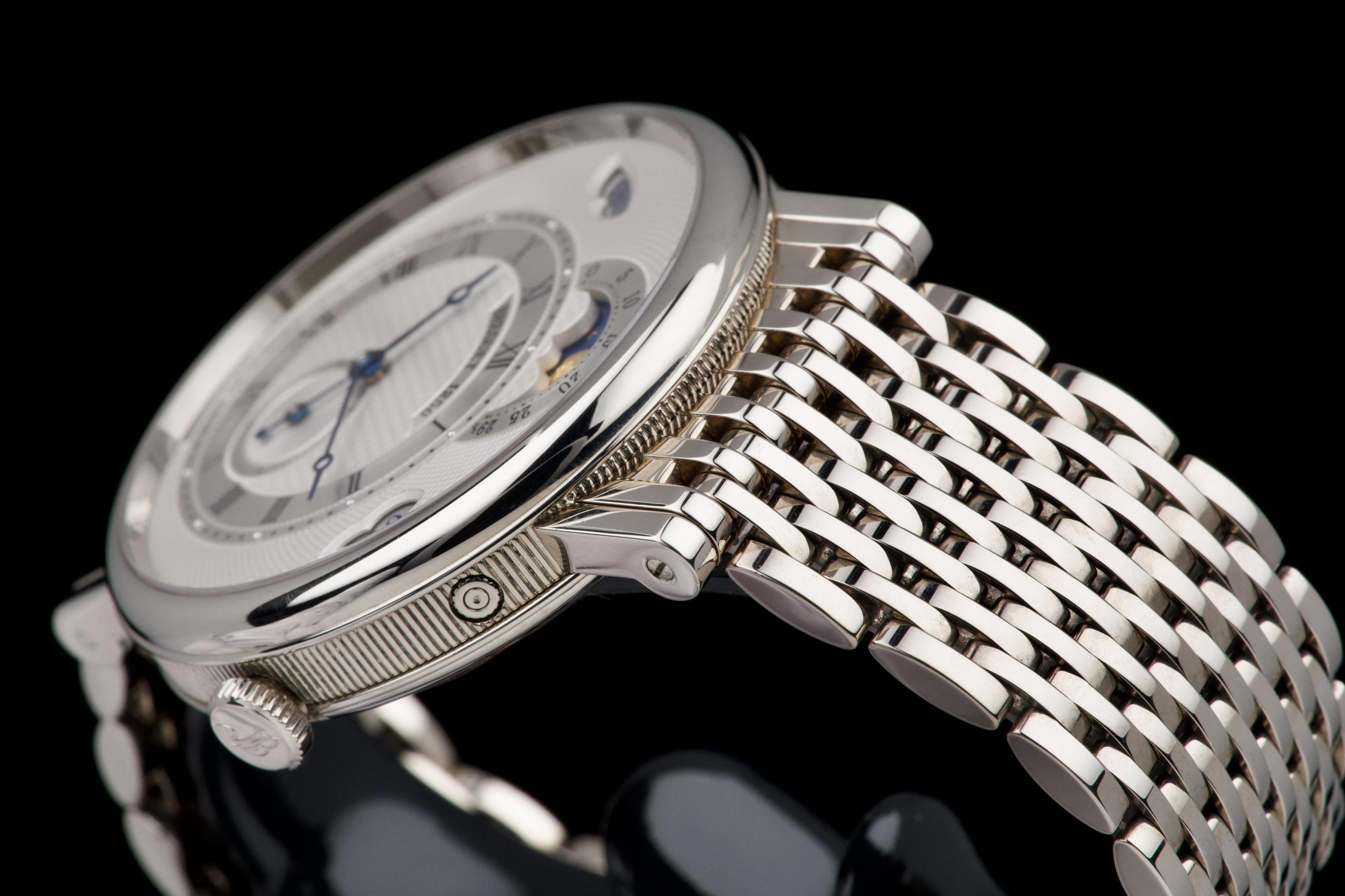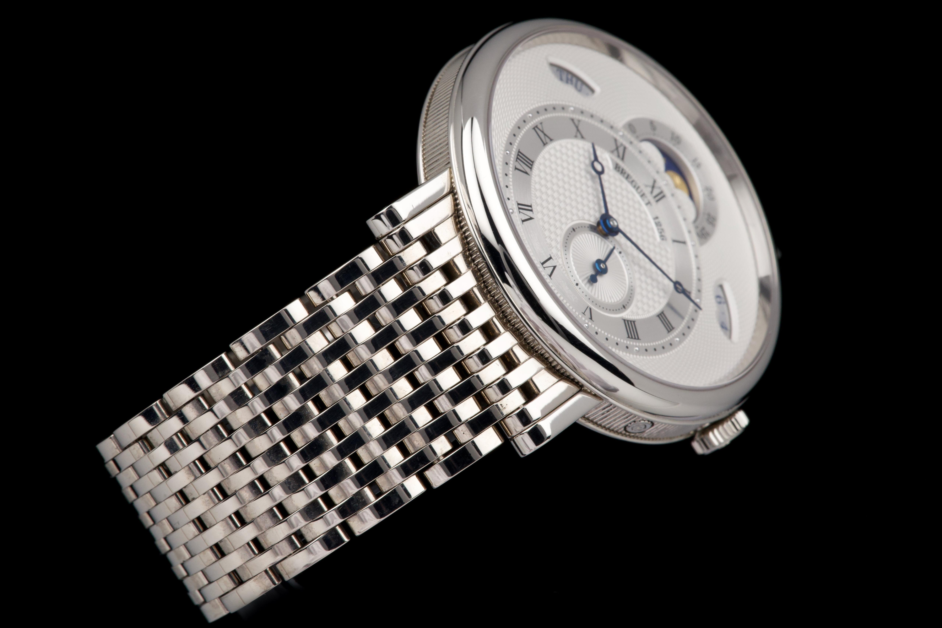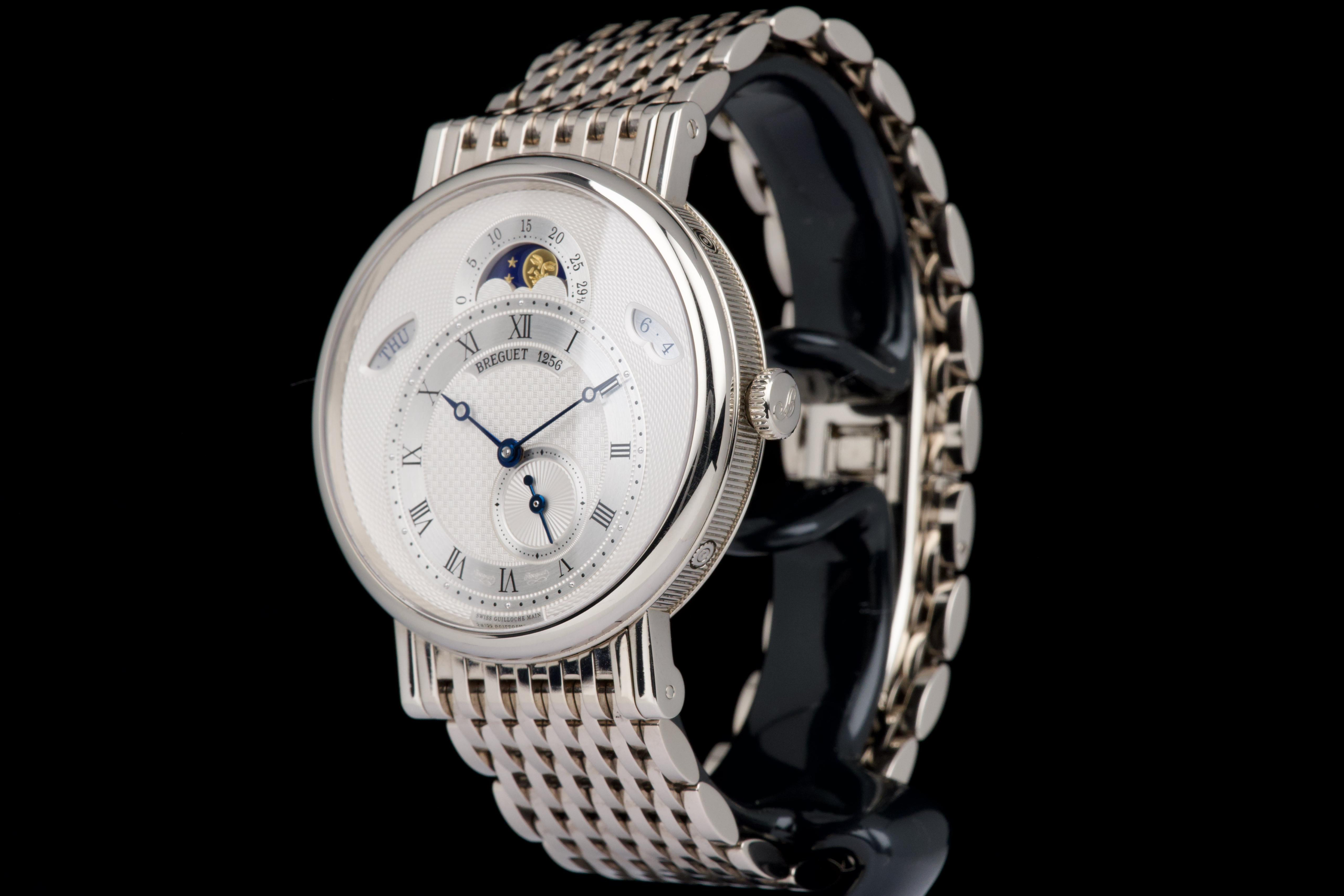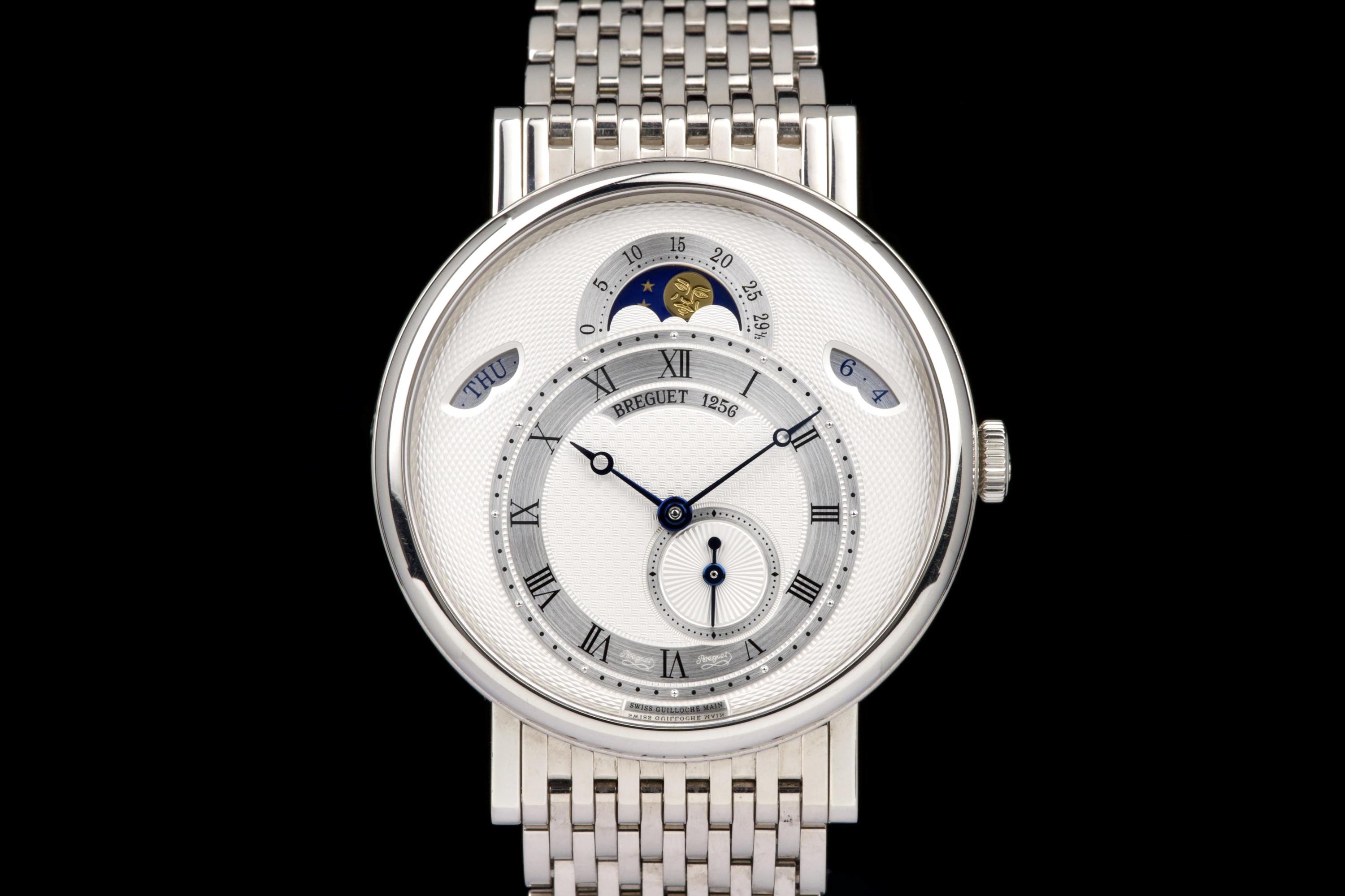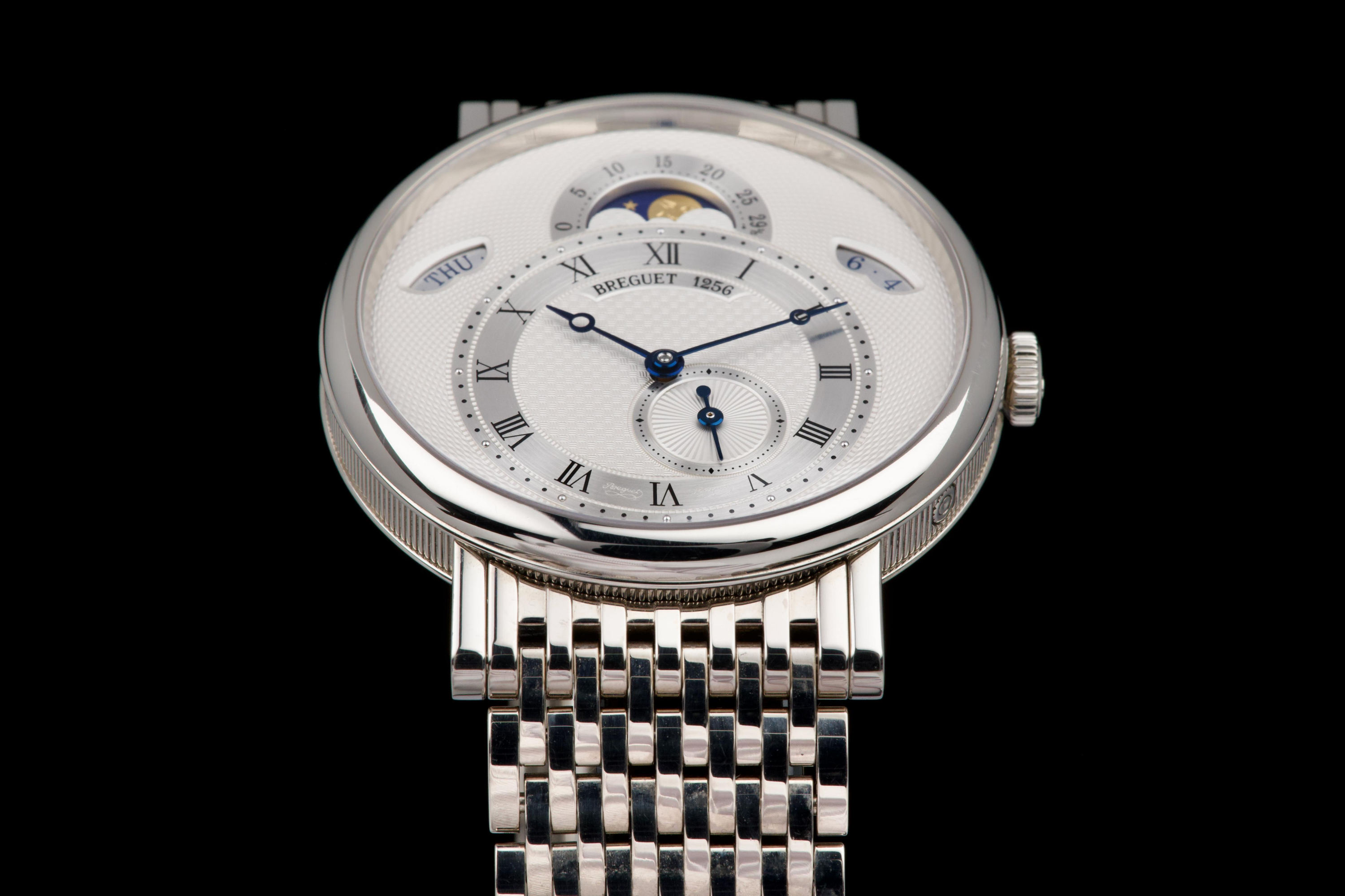Breguet Classique Moonphase, reference 7337BB/1E/BV0, white gold wristwatch with moon-phase, power reserve and date, white gold bracelet, full set, circa 2014. An elegant embodiment of Breguet’s classical watchmaking tradition, the present Classique Moonphase reference 7337BB/1E/BV0 is offered in excellent condition and accompanied by its full set. Produced in 2014, the watch showcases the refined aesthetic codes that have defined the Maison since the time of Abraham-Louis Breguet. The timepiece is housed in a finely fluted 39 mm case crafted in white gold, fitted with the brand’s signature welded lugs and straight caseband. The dial, executed in solid gold and decorated with multiple hand-guilloché patterns, displays an exquisitely balanced composition with the moon-phase indication at 12 o’clock, a power reserve indicator, and a pointer date with blued steel hand circling the dial’s periphery. The classic Breguet open-tipped hands and Roman numerals complete the harmonious design. Powering the watch is a finely finished automatic Breguet manufacture movement, visible through the sapphire caseback, showcasing traditional decorative techniques characteristic of the brand. According to the consignor, the watch appears to remain unpolished, preserving the crisp definition of the case and its fluted sides. The timepiece is fitted with its original white gold Breguet bracelet, a configuration far less common than the leather strap versions and adding to the overall presence and versatility of the watch. Delivered as a full set with its original box and papers, this Classique Moonphase represents a particularly attractive example of one of Breguet’s most elegant contemporary references, combining traditional craftsmanship with timeless design.