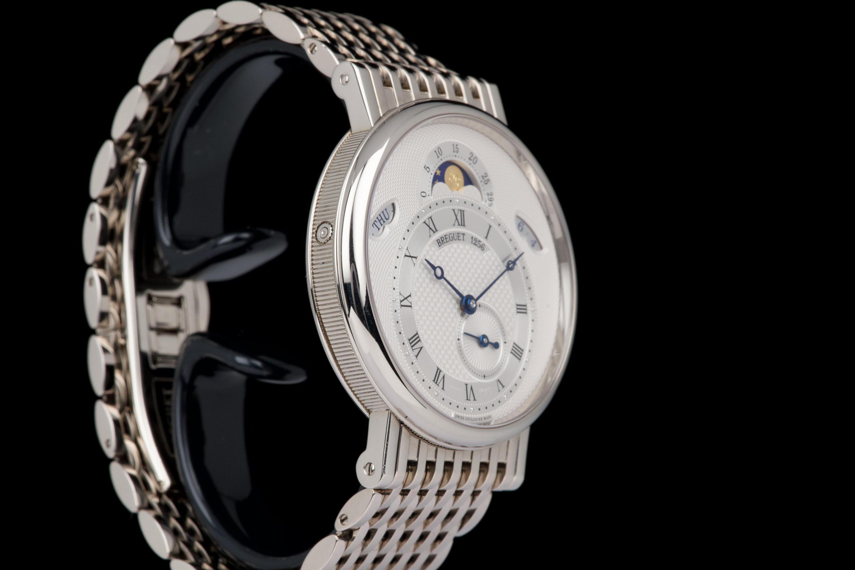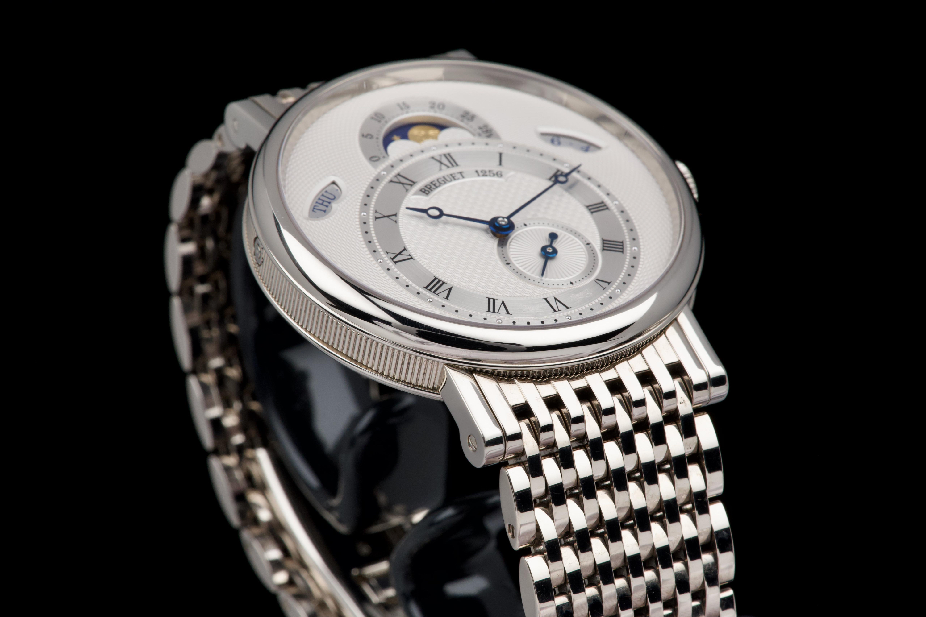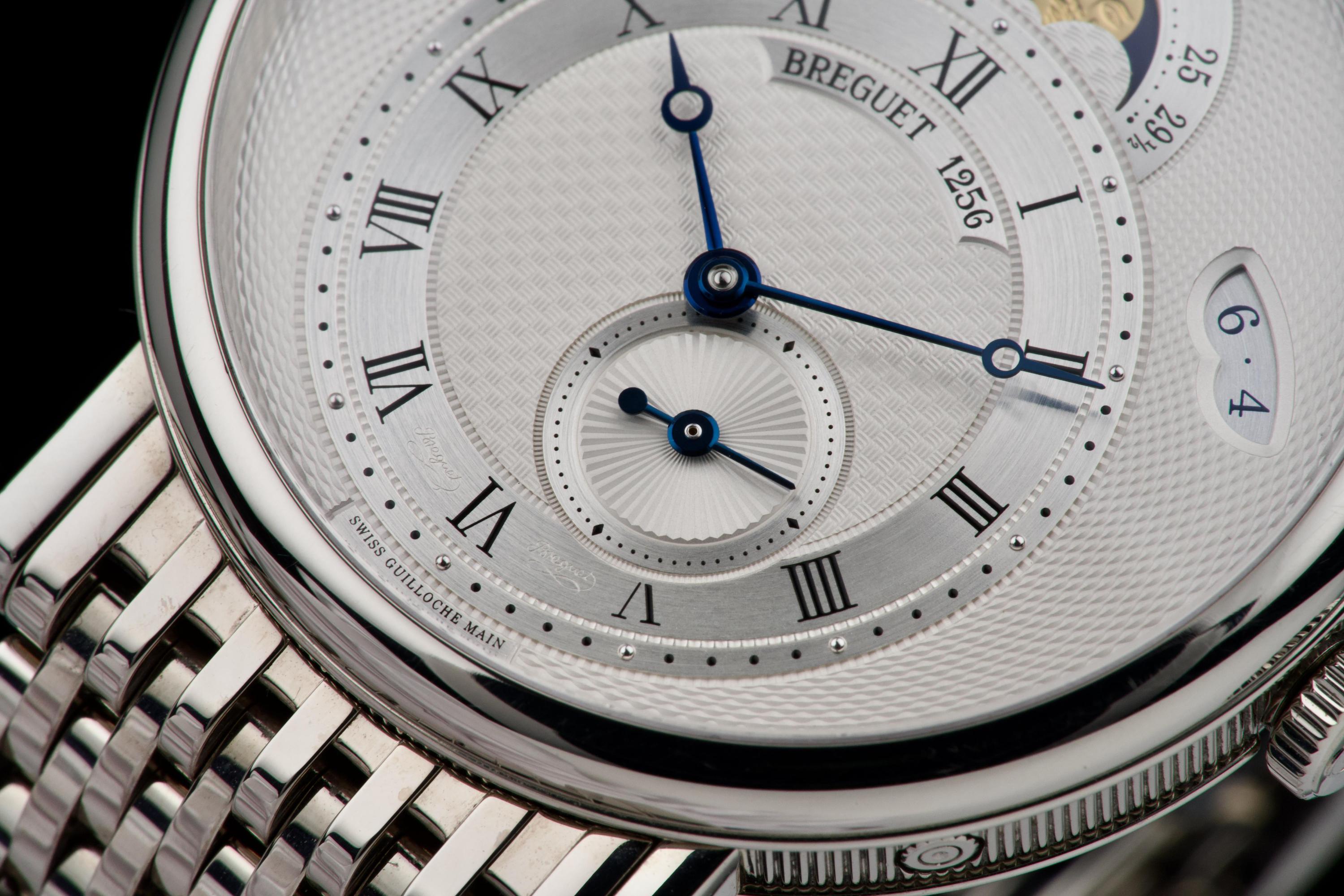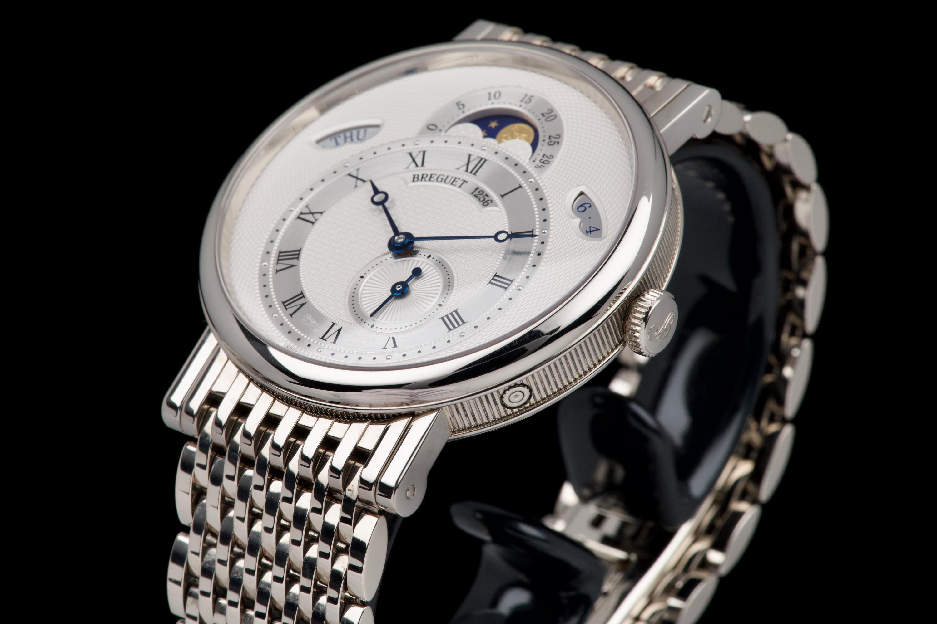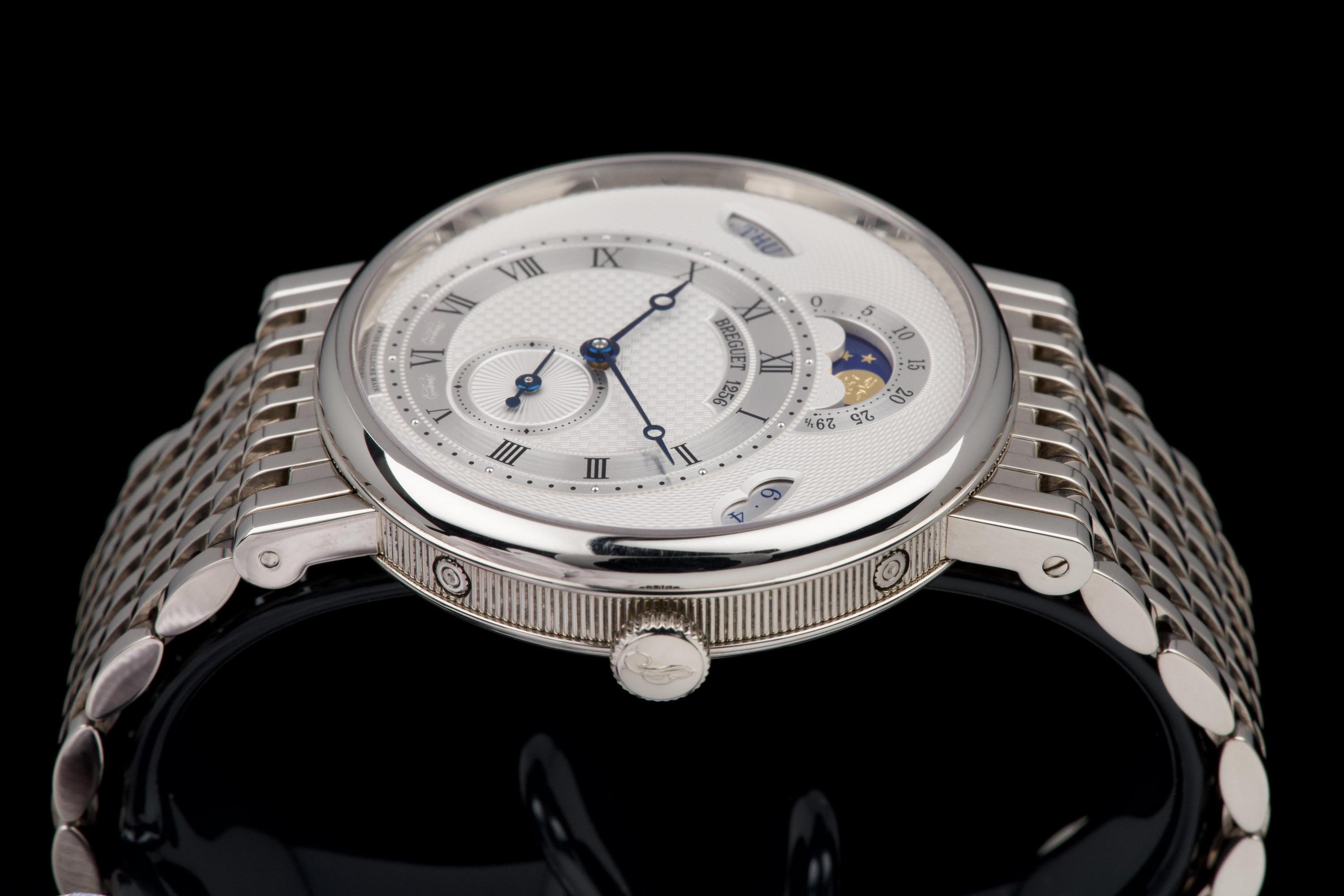 Breguet Classique Moonphase, reference 7337BB/1E/BV0, white gold wristwatch with moon-phase, power reserve and date, white gold bracelet, full set, circa 2014. An elegant embodiment of Breguet’s classical watchmaking tradition, the present Classique Moonphase reference 7337BB/1E/BV0 is offered in excellent condition and accompanied by its full set. Produced in 2014, the watch showcases the refined aesthetic codes that have defined the Maison since the time of Abraham-Louis Breguet. The timepiece is housed in a finely fluted 39 mm case crafted in white gold, fitted with the brand’s signature welded lugs and straight caseband. The dial, executed in solid gold and decorated with multiple hand-guilloché patterns, displays an exquisitely balanced composition with the moon-phase indication at 12 o’clock, a power reserve indicator, and a pointer date with blued steel hand circling the dial’s periphery. The classic Breguet open-tipped hands and Roman numerals complete the harmonious design. Powering the watch is a finely finished automatic Breguet manufacture movement, visible through the sapphire caseback, showcasing traditional decorative techniques characteristic of the brand. According to the consignor, the watch appears to remain unpolished, preserving the crisp definition of the case and its fluted sides. The timepiece is fitted with its original white gold Breguet bracelet, a configuration far less common than the leather strap versions and adding to the overall presence and versatility of the watch. Delivered as a full set with its original box and papers, this Classique Moonphase represents a particularly attractive example of one of Breguet’s most elegant contemporary references, combining traditional craftsmanship with timeless design.