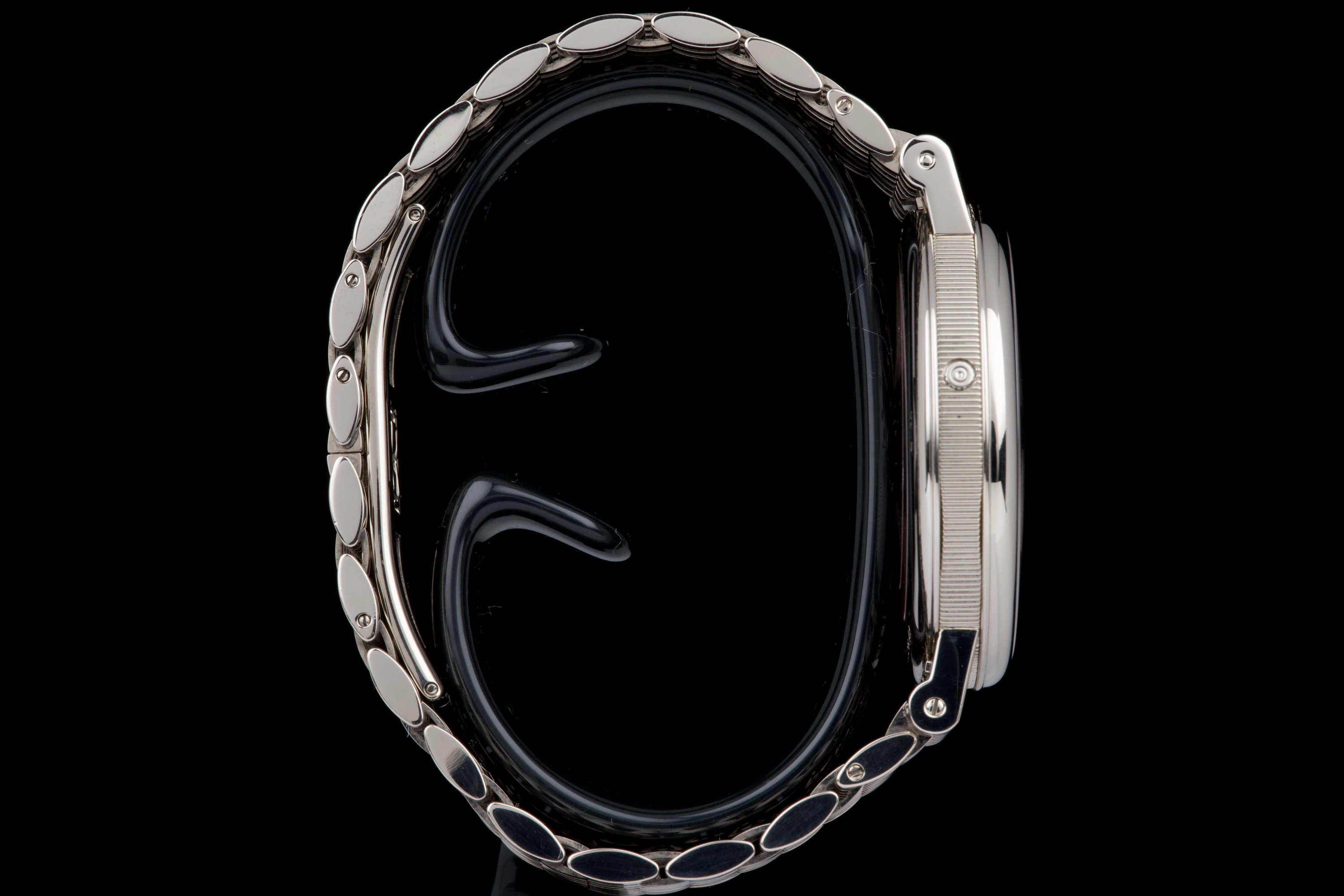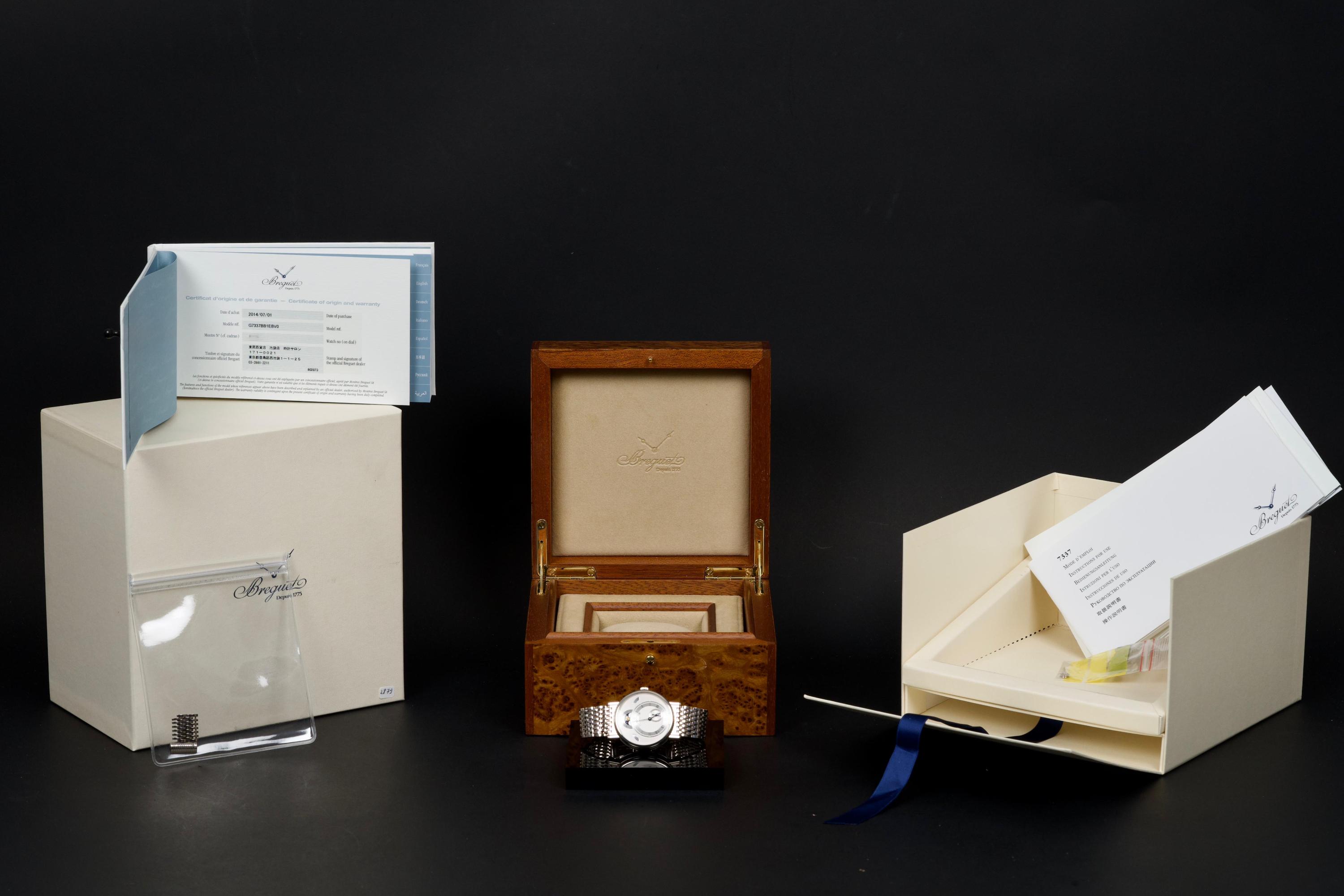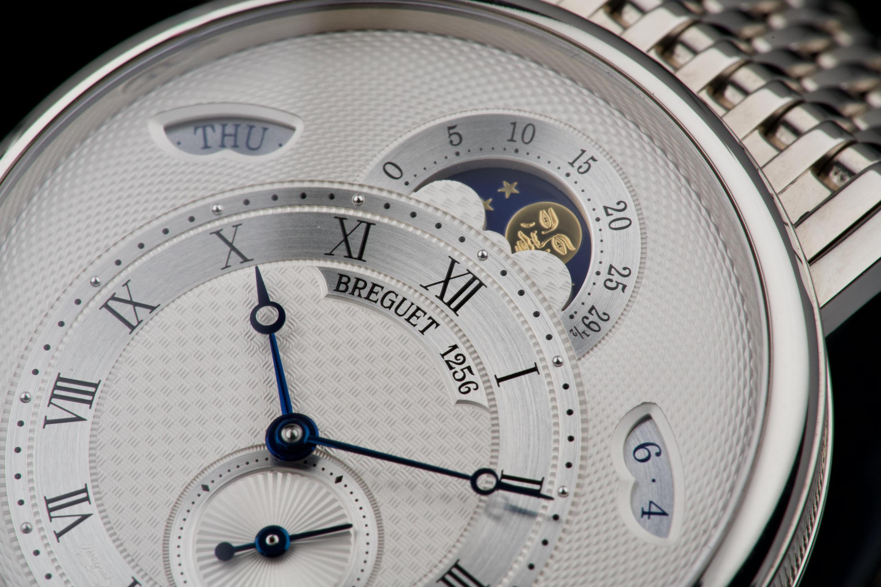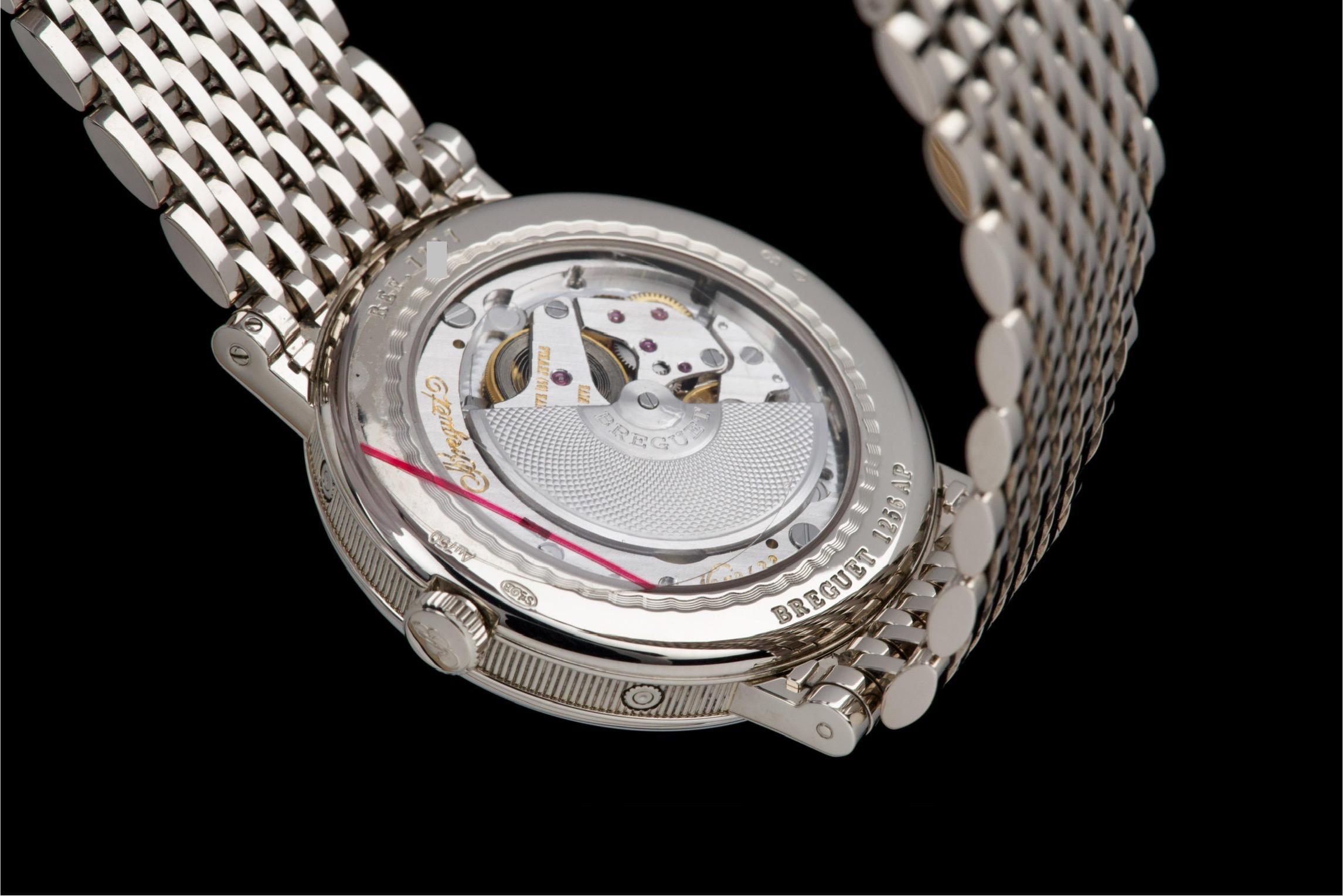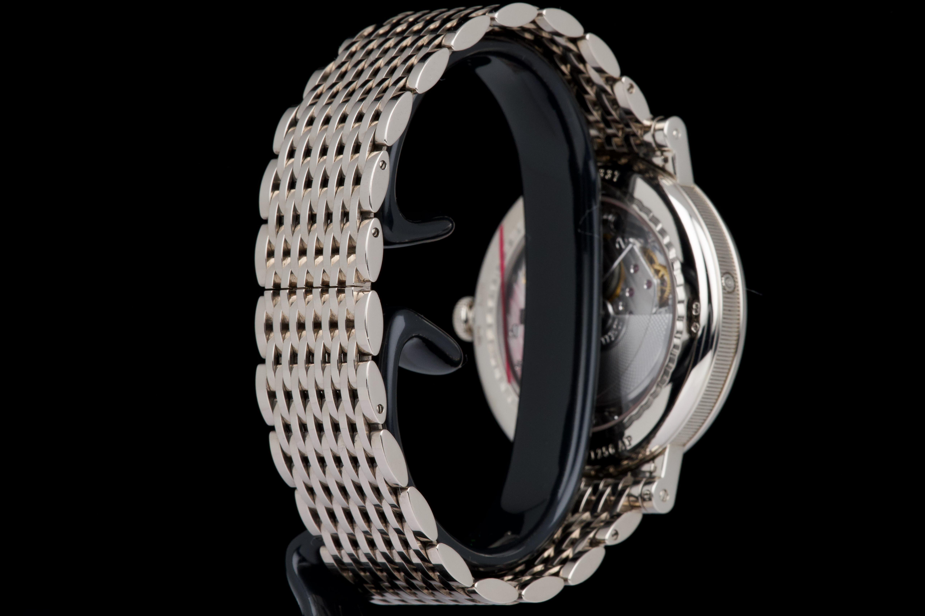 Breguet Classique Moonphase, reference 7337BB/1E/BV0, white gold wristwatch with moon-phase, power reserve and date, white gold bracelet, full set, circa 2014. An elegant embodiment of Breguet’s classical watchmaking tradition, the present Classique Moonphase reference 7337BB/1E/BV0 is offered in excellent condition and accompanied by its full set. Produced in 2014, the watch showcases the refined aesthetic codes that have defined the Maison since the time of Abraham-Louis Breguet. The timepiece is housed in a finely fluted 39 mm case crafted in white gold, fitted with the brand’s signature welded lugs and straight caseband. The dial, executed in solid gold and decorated with multiple hand-guilloché patterns, displays an exquisitely balanced composition with the moon-phase indication at 12 o’clock, a power reserve indicator, and a pointer date with blued steel hand circling the dial’s periphery. The classic Breguet open-tipped hands and Roman numerals complete the harmonious design. Powering the watch is a finely finished automatic Breguet manufacture movement, visible through the sapphire caseback, showcasing traditional decorative techniques characteristic of the brand. According to the consignor, the watch appears to remain unpolished, preserving the crisp definition of the case and its fluted sides. The timepiece is fitted with its original white gold Breguet bracelet, a configuration far less common than the leather strap versions and adding to the overall presence and versatility of the watch. Delivered as a full set with its original box and papers, this Classique Moonphase represents a particularly attractive example of one of Breguet’s most elegant contemporary references, combining traditional craftsmanship with timeless design.