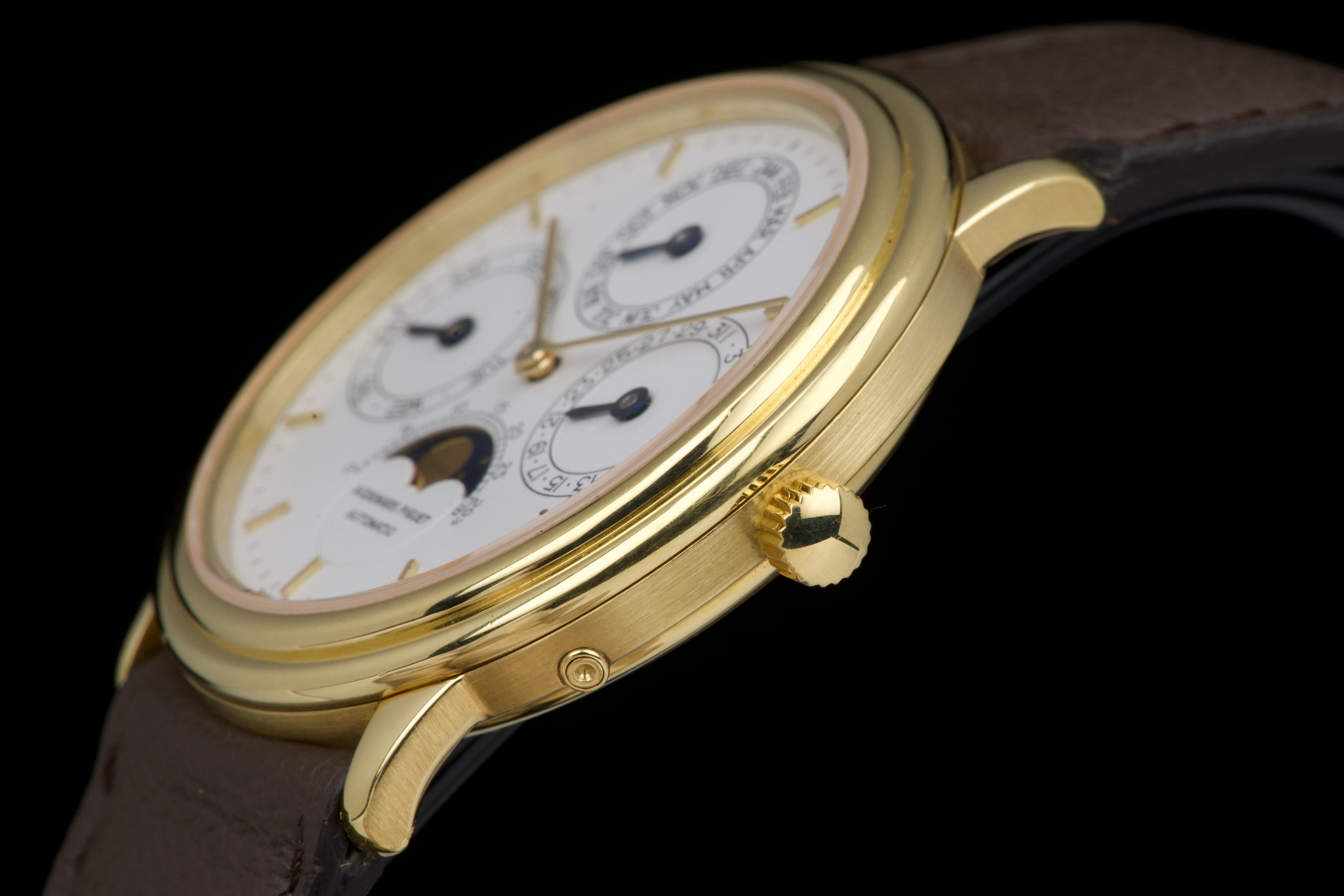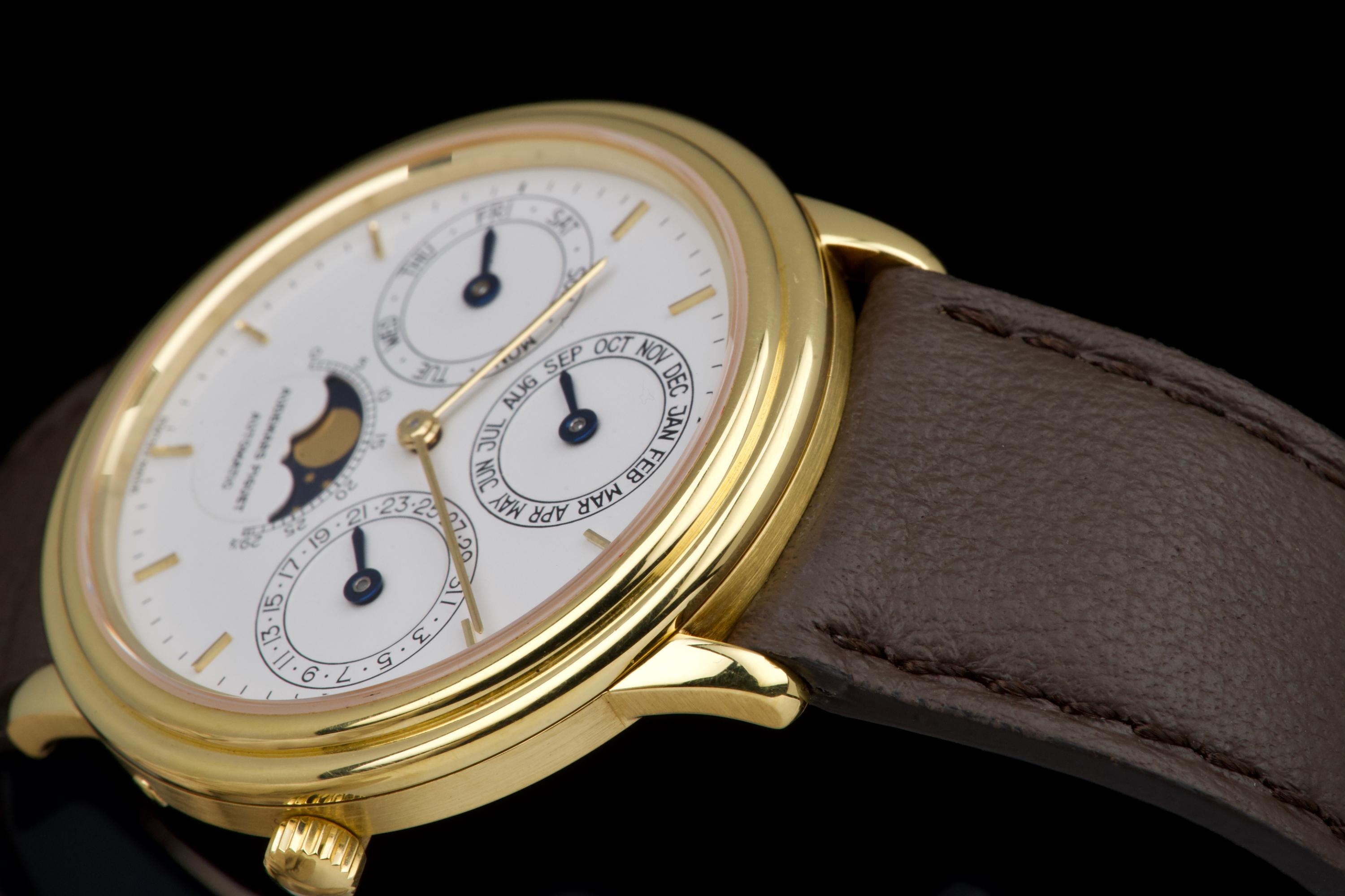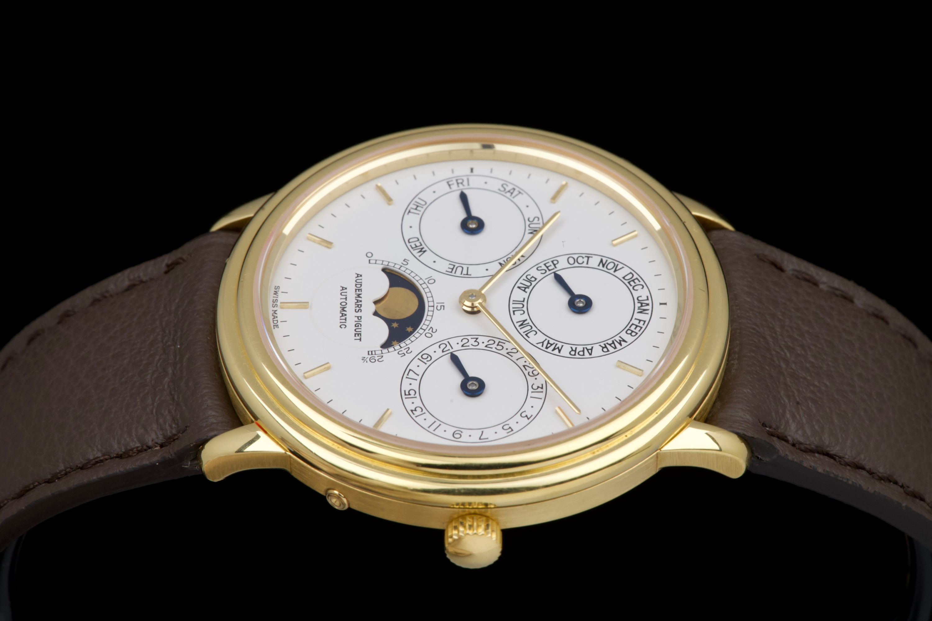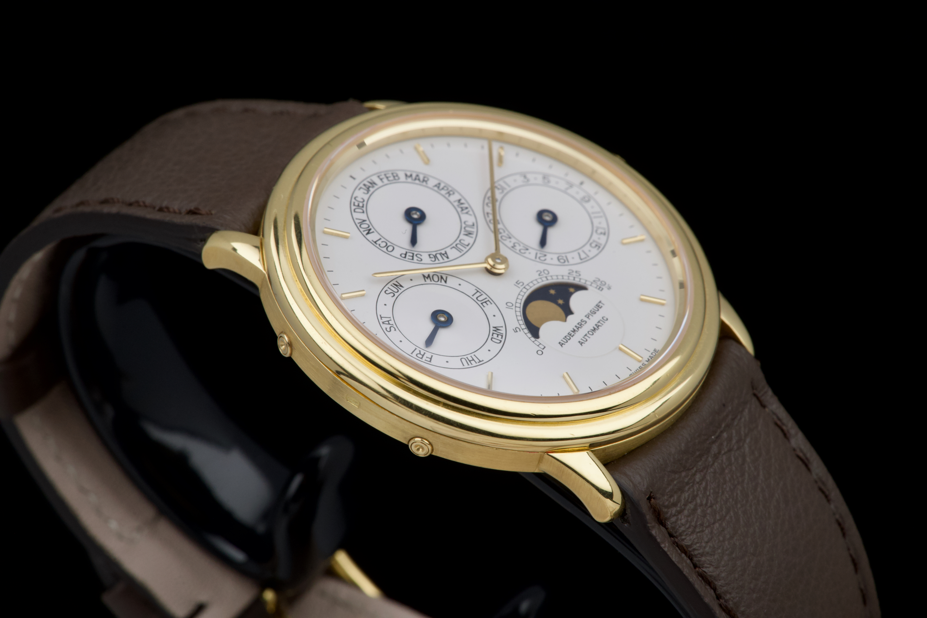 An extraordinary and museum-grade example of the Audemars Piguet Perpetual Calendar reference 5548BA, one of the very first automatic perpetual calendar wristwatches ever produced by Audemars Piguet. This piece belongs to the desirable B-series, placing its production in the late 1970s, and is accompanied by an exceptionally complete and historically rich set. Included are the original box, period Japanese catalogue folder, leather document holder, original certificate, and the original warranty (undated). The watch also comes with Audemars Piguet Japan service papers from 2025, confirming a movement service only (no polishing), preserving the original sharp case geometry. The 18k yellow-gold case is in superb condition, with deep and crisp hallmarks. The white enamel dial is exceptional, showing only a few microscopic hairlines invisible to the naked eye — a normal and completely acceptable characteristic of enamel dials from this era. It is fitted with its original yellow-gold AP buckle and a new (non-AP) leather strap. With only 2066 pieces produced in yellow gold across the 5548/25548 family, this model is one of the most important and collectible early AP perpetual calendars, representing the birth of the ultra-thin automatic QP lineage that later defined the brand. A truly outstanding example — unparalleled condition, a phenomenal set, and a historically significant perpetual calendar from the golden age of Audemars Piguet.