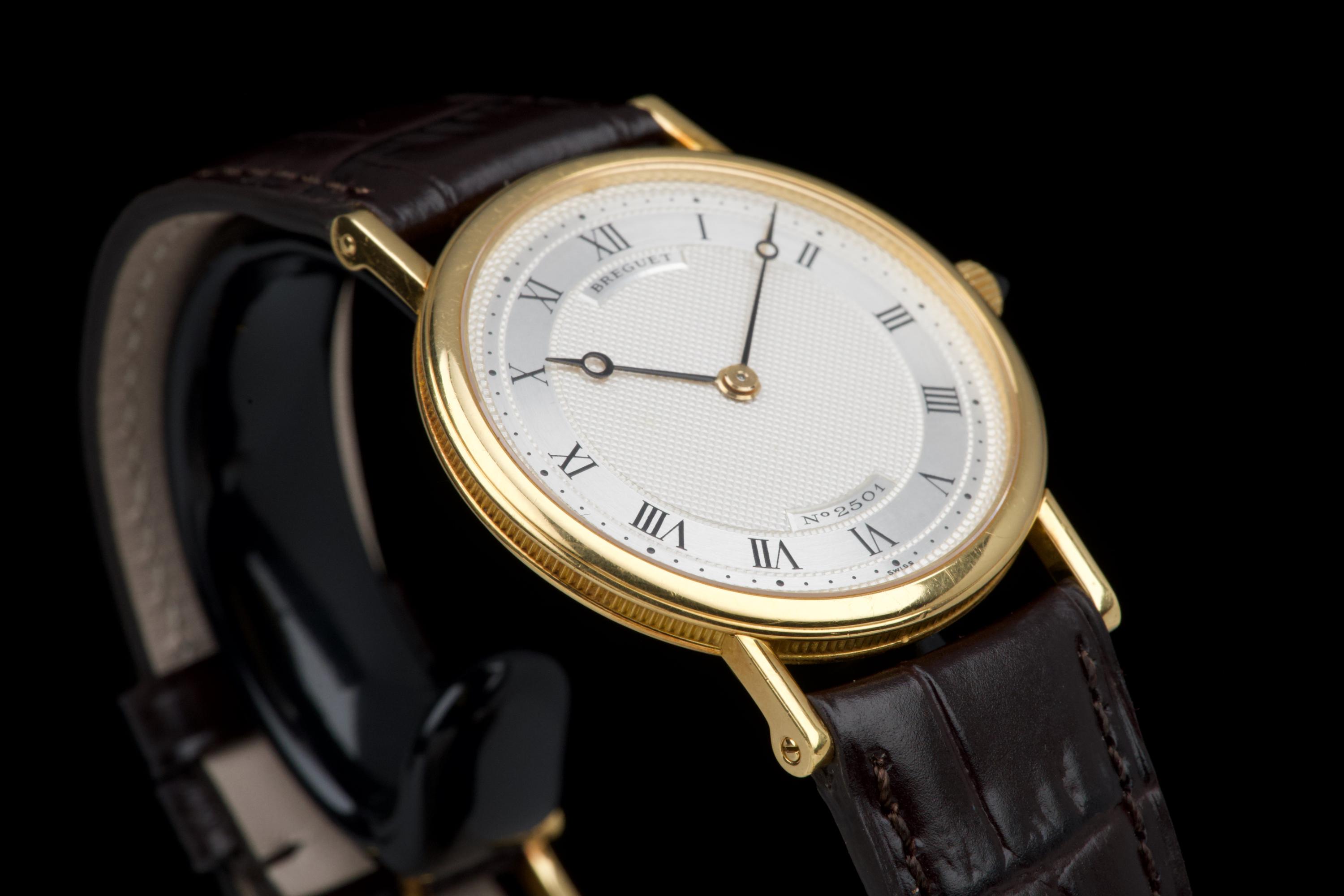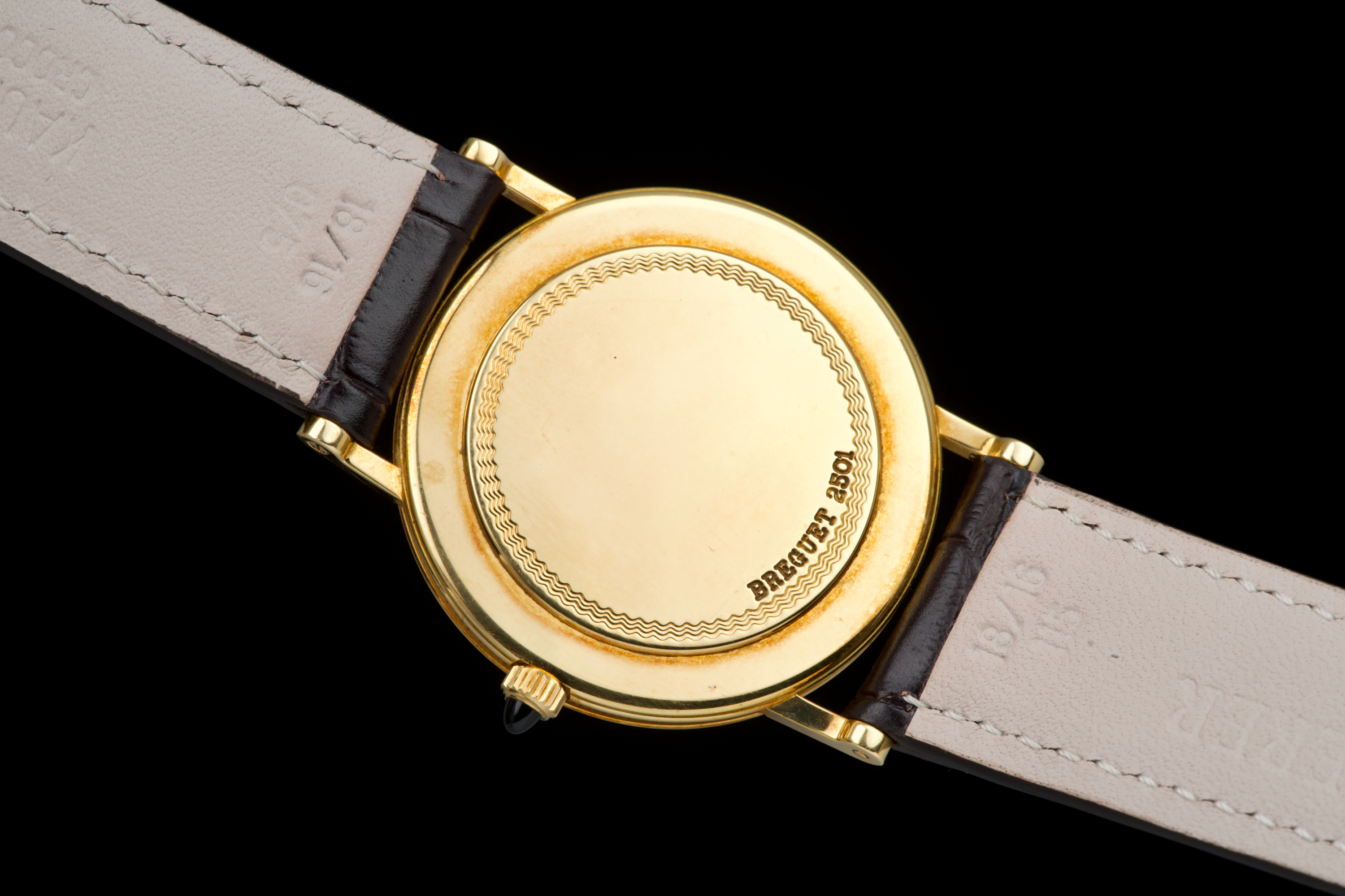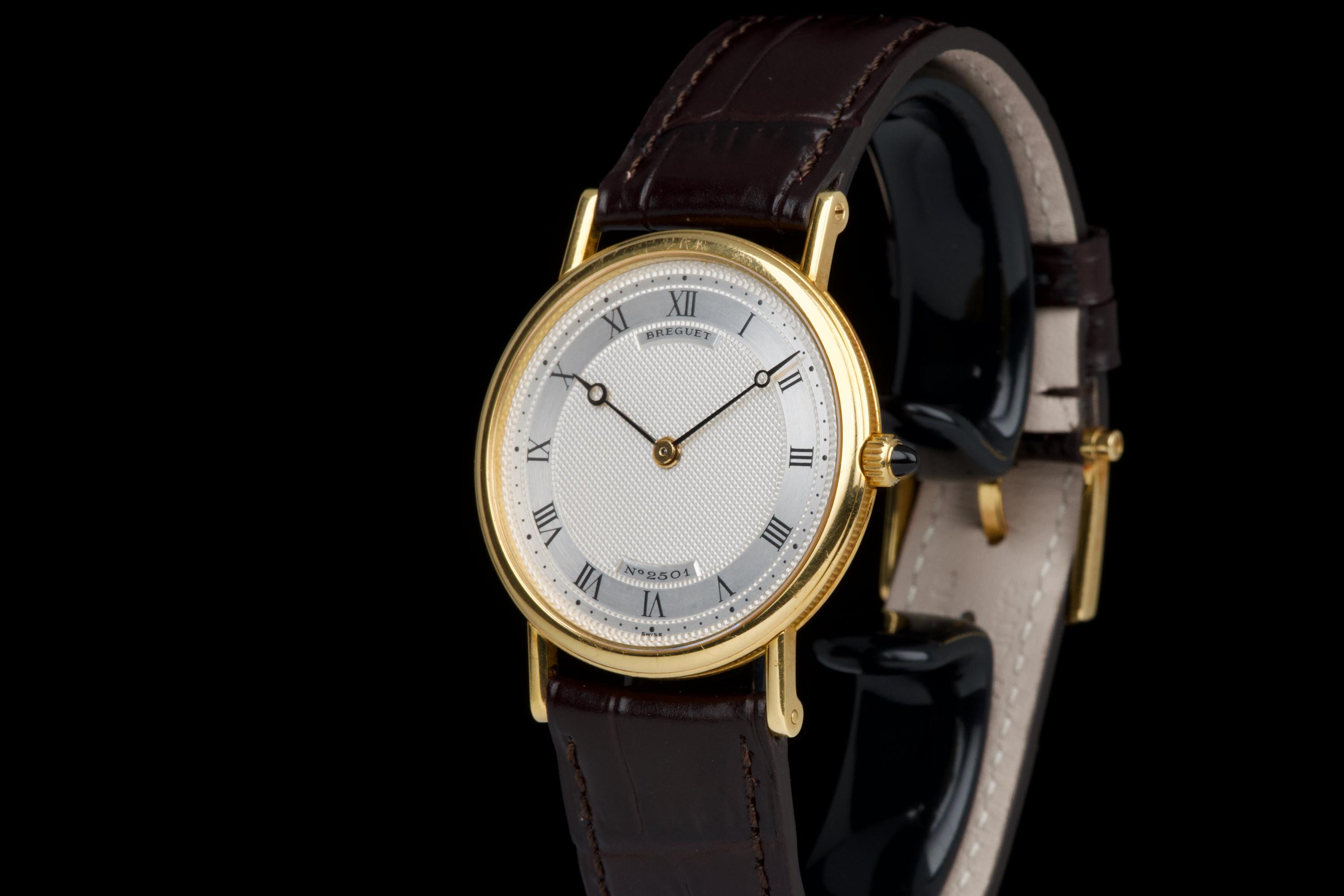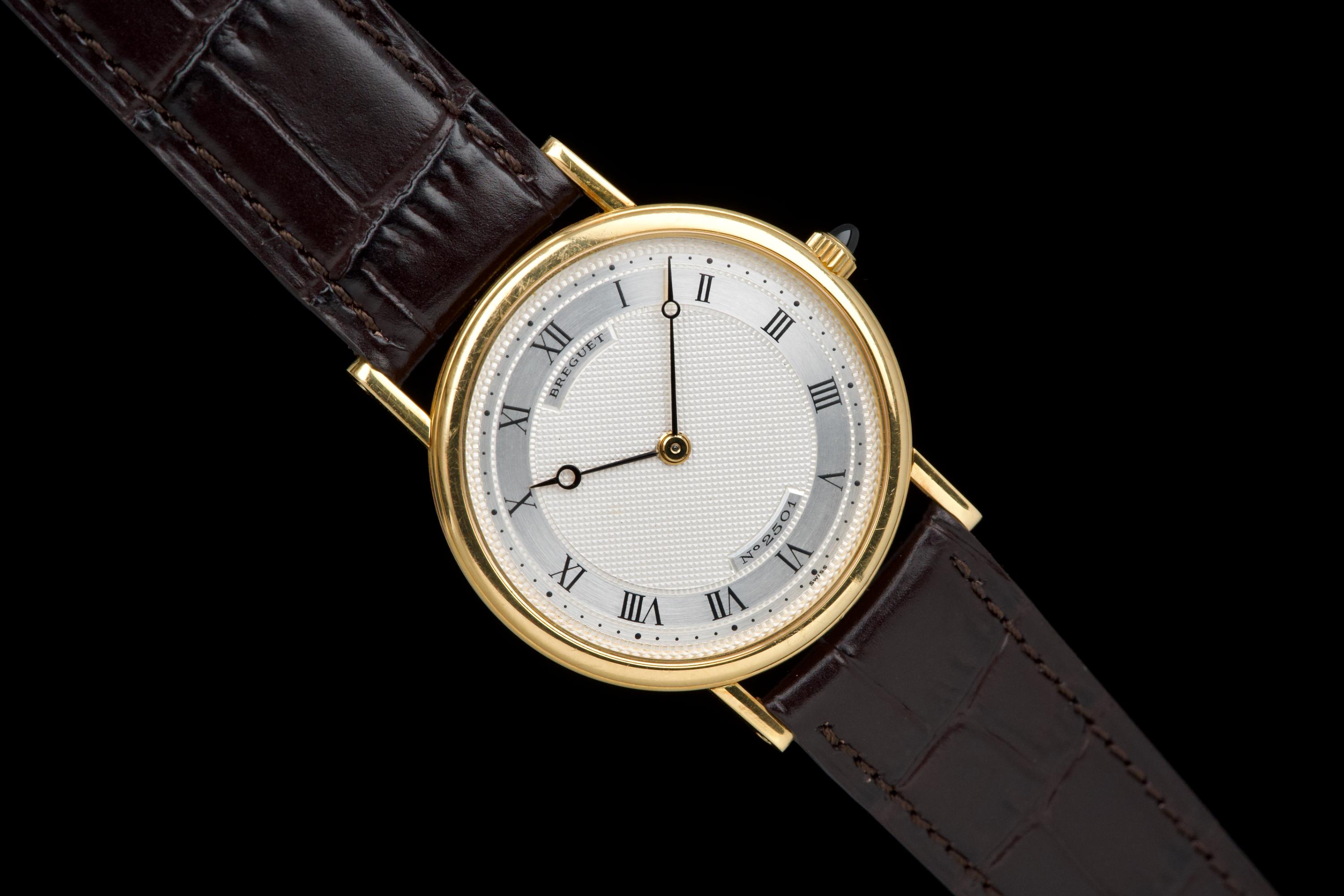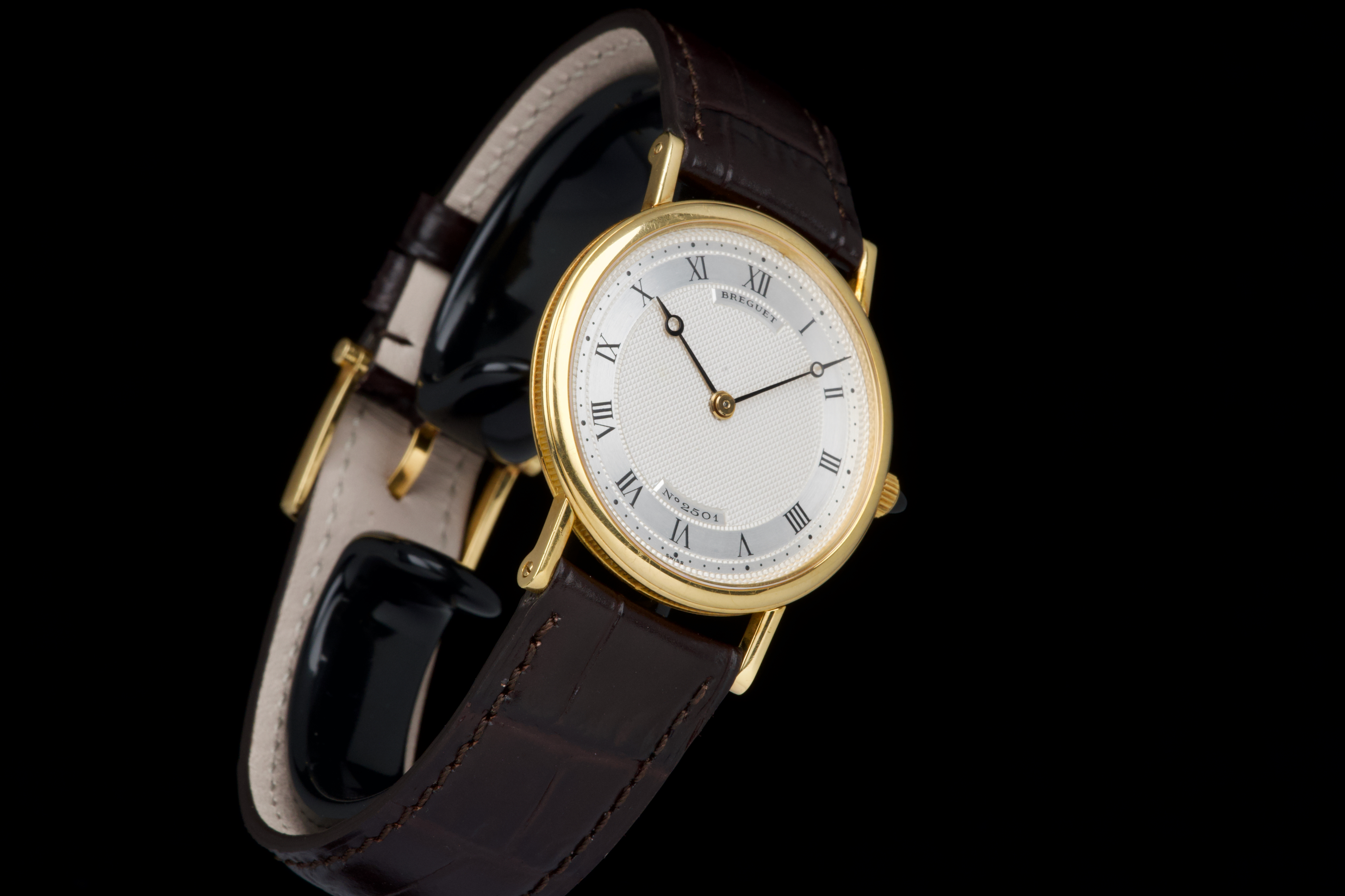 The present Breguet Classique reference 3150, measuring 32.5 mm and dating from the 1980s, is a refined and elegant example of Breguet’s traditional watchmaking, offered with particularly appealing original-owner provenance. The gold case appears to be unpolished and shows light wear consistent with age and careful use, retaining crisp lines and the discreet elegance characteristic of Breguet’s classical proportions from this period. Its modest diameter reflects the era’s aesthetic while offering timeless wearability. The dial is especially attractive, featuring a finely guilloché centre contrasted by brushed metal-style concentric ringsbearing Roman numerals, a layout that beautifully illustrates Breguet’s mastery of texture, depth, and legibility. The overall dial presentation remains in excellent condition, with strong visual balance and classical harmony. The watch is fitted with a brand-new dark brown alligator leather strap (non-Breguet), paired with its original gold tang buckle, maintaining material and period coherence. No service history accompanies the watch. Elegant, understated, and preserved with honest originality, this Breguet Classique 3150 represents a compelling opportunity to acquire a well-preserved 1980s Breguet with strong provenance, refined dial work, and enduring classical appeal.