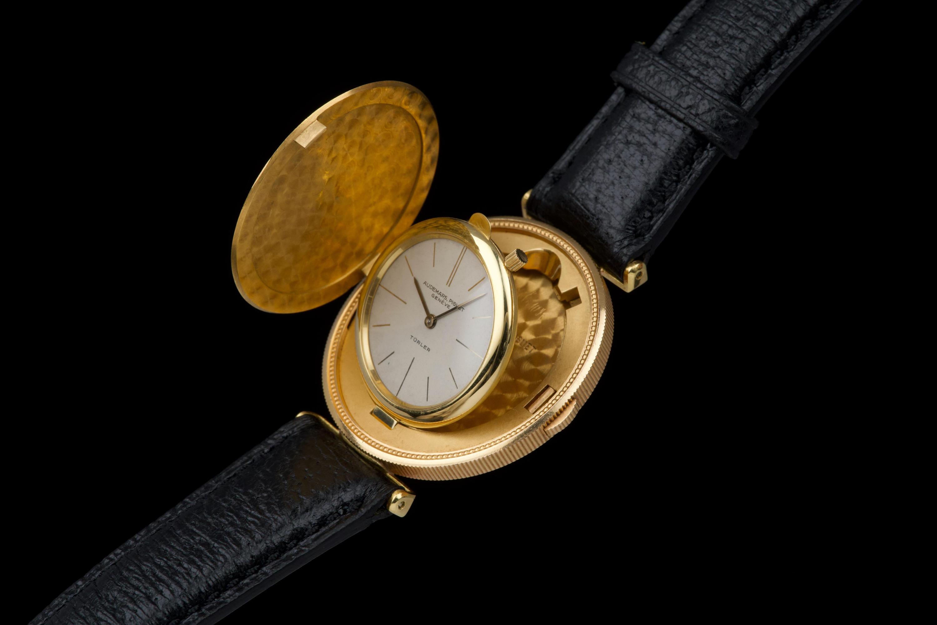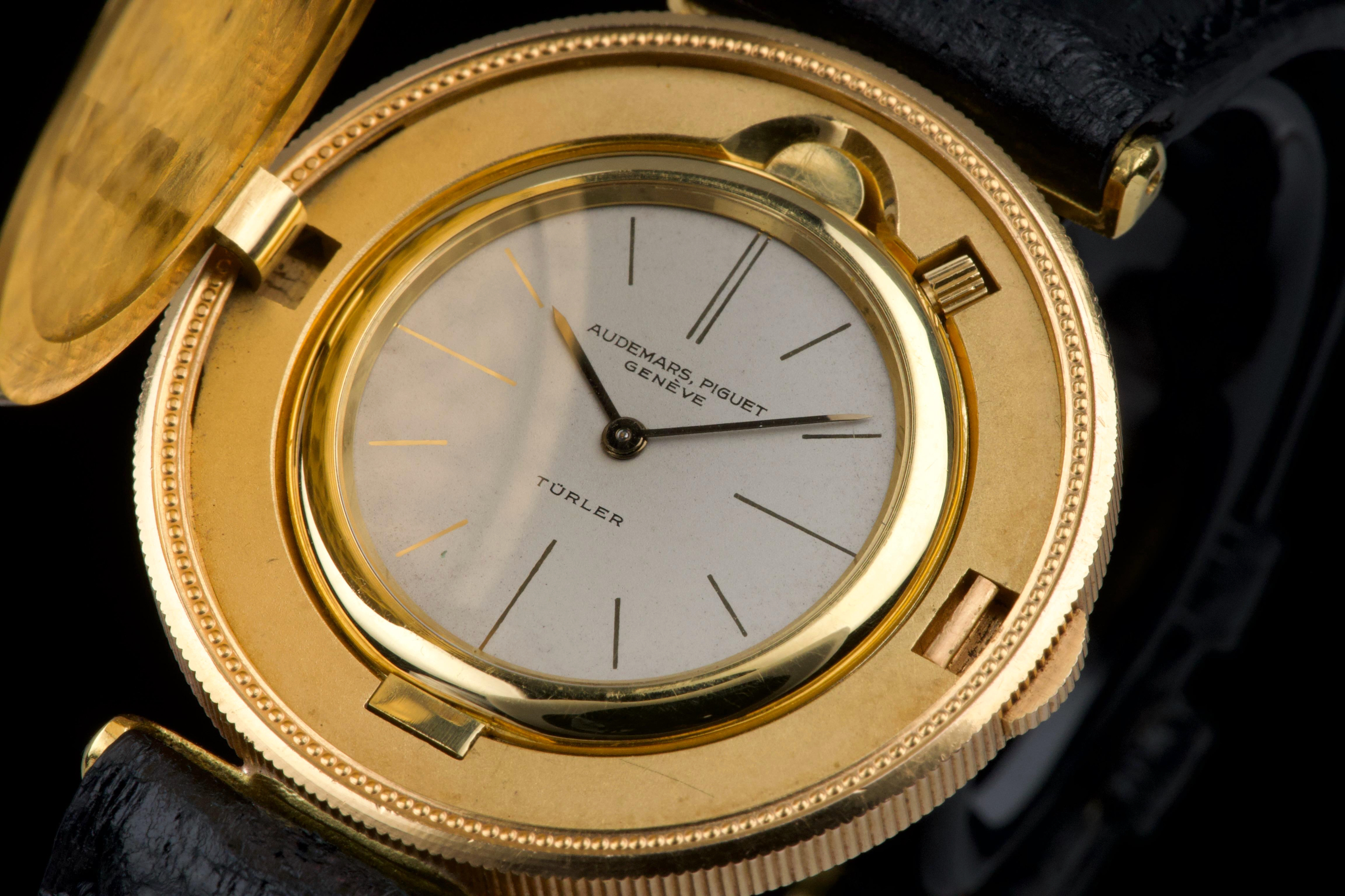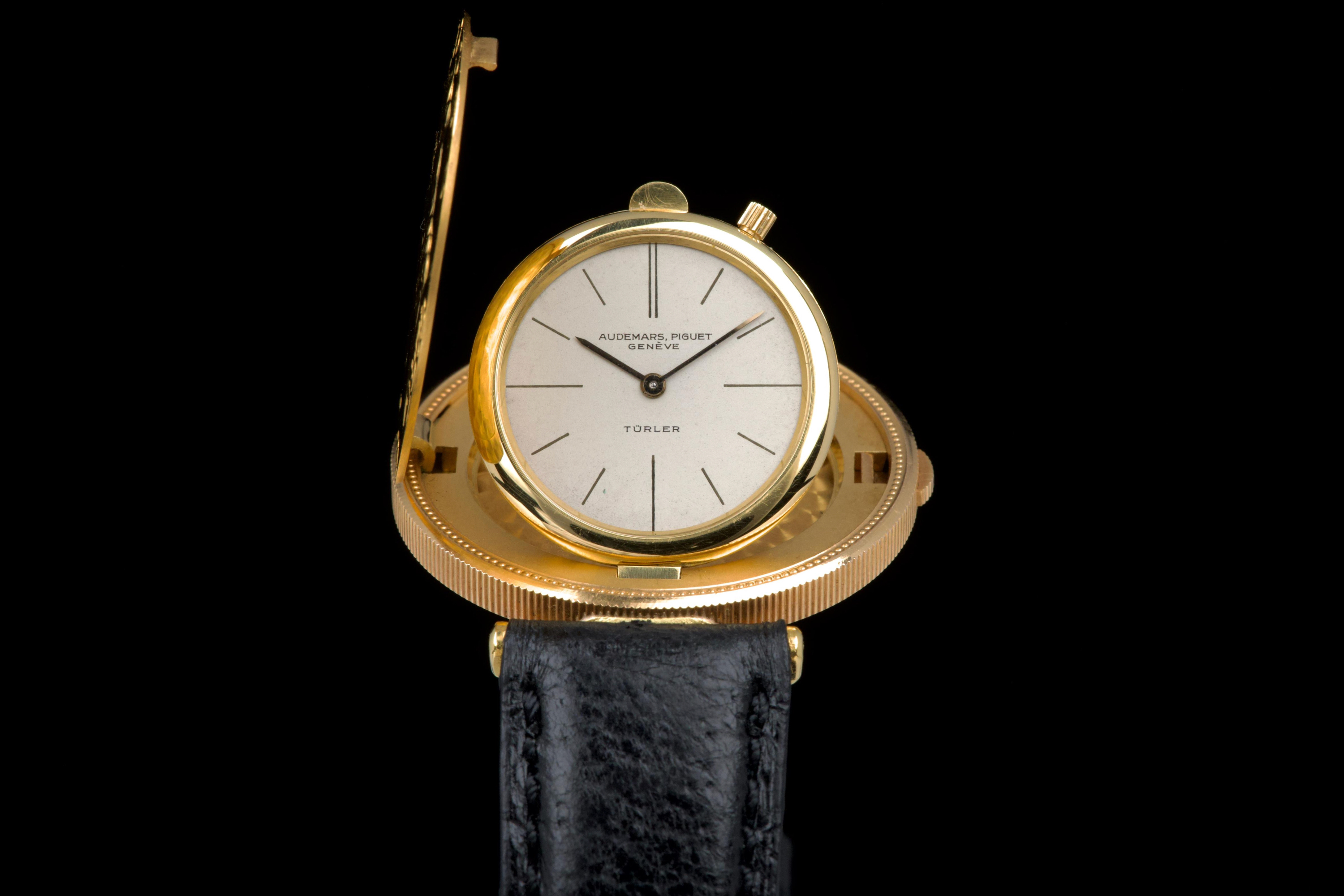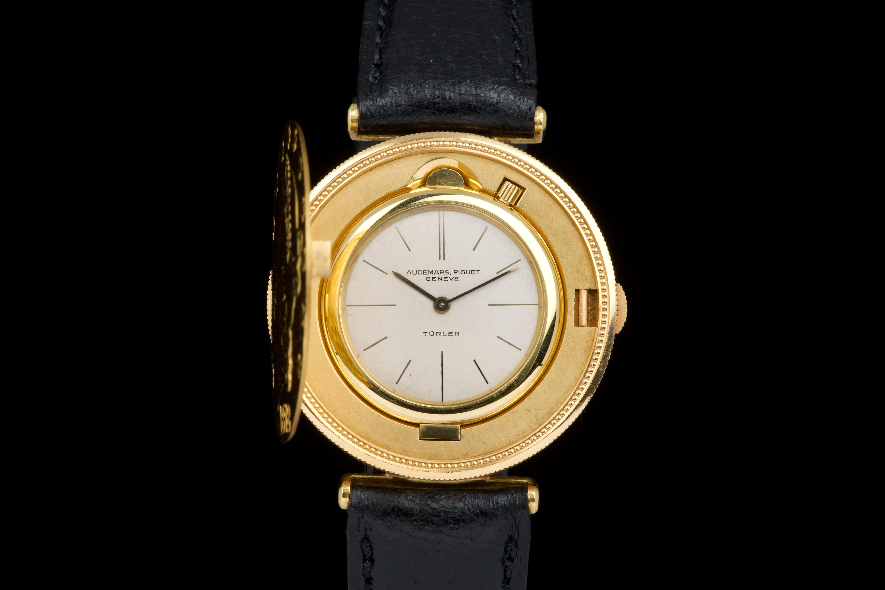 The present Audemars Piguet Coin Watch, double-signed Türler, dating to the 1970s, is a refined and historically evocative example of one of the most discreet and intellectually playful genres in 20th-century Swiss watchmaking. Executed in 18K yellow gold and measuring 34 mm in diameter, this watch reflects Audemars Piguet’s mastery of ultra-thin construction and elegant concealment. Coin watches emerged primarily during the 1950s–1970s, a period when several high-end manufactures—including Audemars Piguet, Patek Philippe, Piaget, and Vacheron Constantin—experimented with watches hidden inside genuine gold coins. Typically crafted from coins such as 20-dollar Double Eagles or European gold pieces, these watches were designed to appear entirely innocuous when closed, revealing their true nature only when hinged open. Beyond their novelty, coin watches were feats of technical ingenuity, requiring exceptionally thin movements and precise case engineering to preserve the coin’s original appearance and proportions. Audemars Piguet was among the most respected producers of such pieces, often supplying them to prestigious retailers like Türler, whose double signature on the dial adds an extra layer of collectability and provenance. Türler, based in Zurich, was known for commissioning discreet, high-quality complications for a refined clientele who valued understatement over ostentation. This example is fitted with a black leather strap (non-Audemars Piguet) and a gold-tone buckle (non-AP). No service history accompanies the watch. Nonetheless, it remains a charming and historically significant object, illustrating a fascinating chapter in Swiss watchmaking where technical sophistication was deliberately hidden behind the guise of everyday objects. Elegant, discreet, and rich in horological lore, this double-signed Audemars Piguet Coin Watch offers a rare opportunity to acquire a piece that perfectly encapsulates the playful ingenuity and refined discretion of haute horlogerie in the mid-20th century.