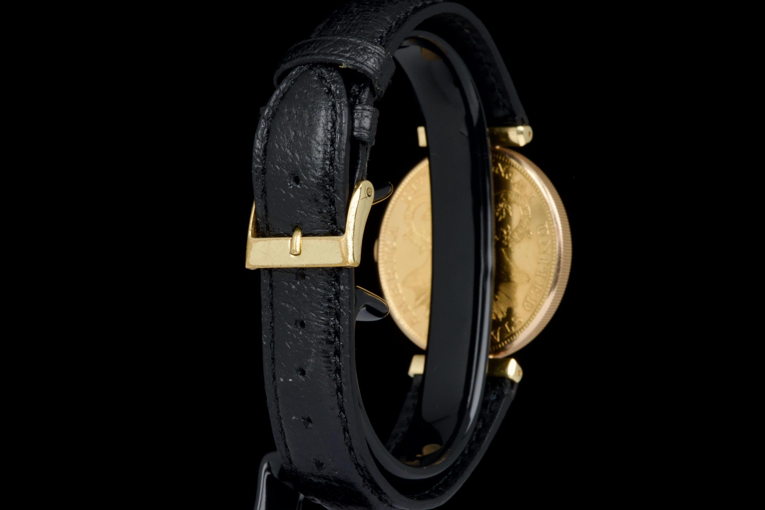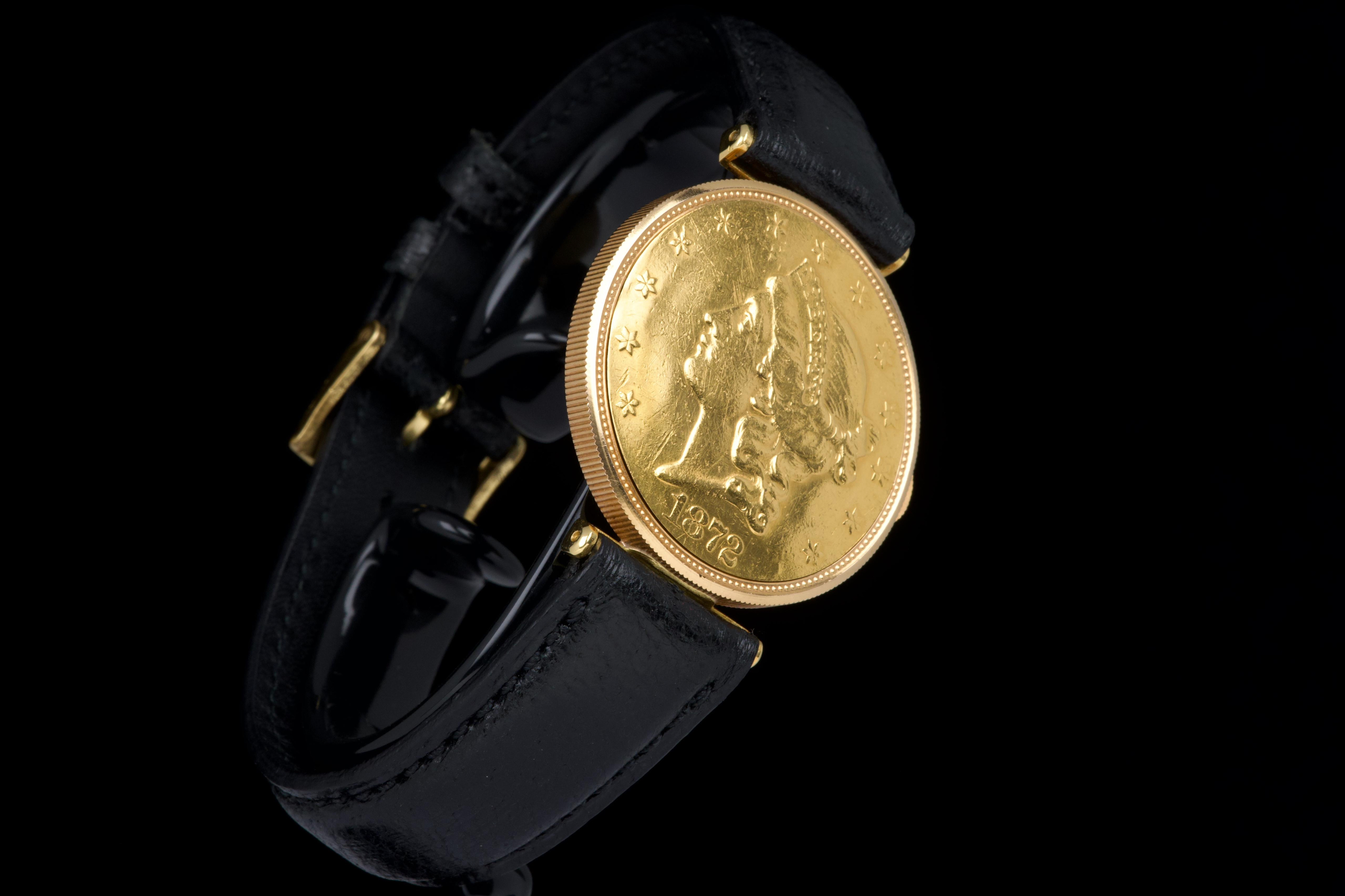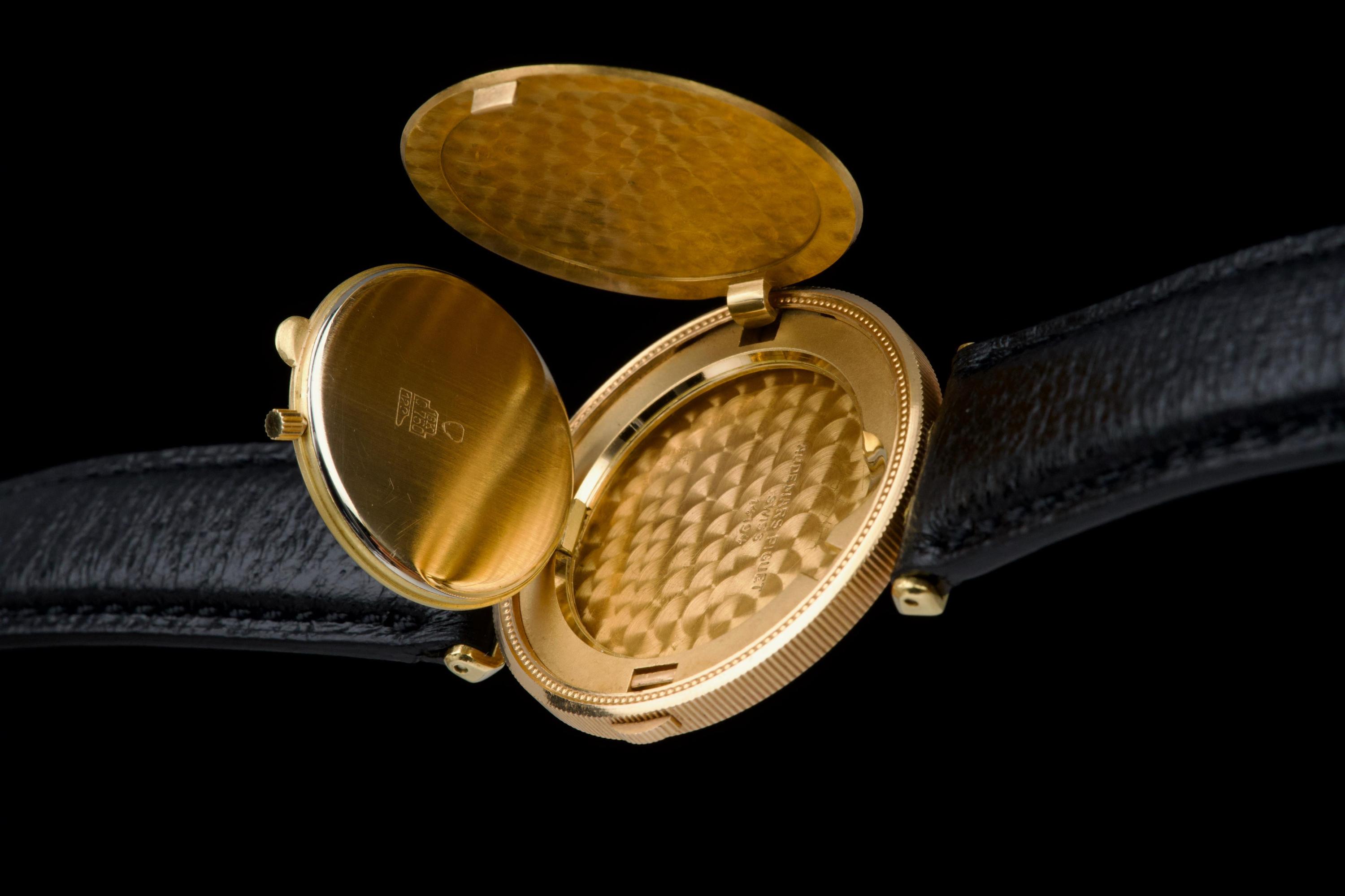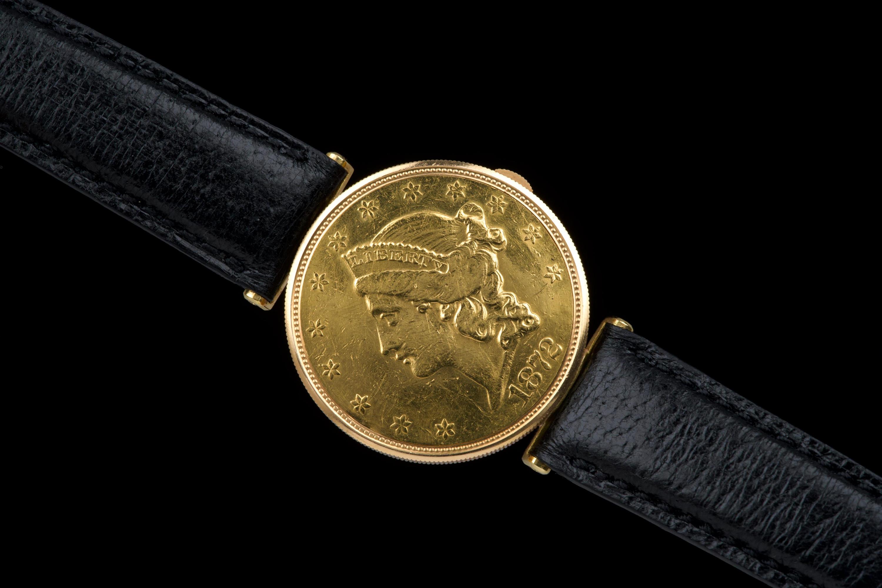 The present Audemars Piguet Coin Watch, double-signed Türler, dating to the 1970s, is a refined and historically evocative example of one of the most discreet and intellectually playful genres in 20th-century Swiss watchmaking. Executed in 18K yellow gold and measuring 34 mm in diameter, this watch reflects Audemars Piguet’s mastery of ultra-thin construction and elegant concealment. Coin watches emerged primarily during the 1950s–1970s, a period when several high-end manufactures—including Audemars Piguet, Patek Philippe, Piaget, and Vacheron Constantin—experimented with watches hidden inside genuine gold coins. Typically crafted from coins such as 20-dollar Double Eagles or European gold pieces, these watches were designed to appear entirely innocuous when closed, revealing their true nature only when hinged open. Beyond their novelty, coin watches were feats of technical ingenuity, requiring exceptionally thin movements and precise case engineering to preserve the coin’s original appearance and proportions. Audemars Piguet was among the most respected producers of such pieces, often supplying them to prestigious retailers like Türler, whose double signature on the dial adds an extra layer of collectability and provenance. Türler, based in Zurich, was known for commissioning discreet, high-quality complications for a refined clientele who valued understatement over ostentation. This example is fitted with a black leather strap (non-Audemars Piguet) and a gold-tone buckle (non-AP). No service history accompanies the watch. Nonetheless, it remains a charming and historically significant object, illustrating a fascinating chapter in Swiss watchmaking where technical sophistication was deliberately hidden behind the guise of everyday objects. Elegant, discreet, and rich in horological lore, this double-signed Audemars Piguet Coin Watch offers a rare opportunity to acquire a piece that perfectly encapsulates the playful ingenuity and refined discretion of haute horlogerie in the mid-20th century.