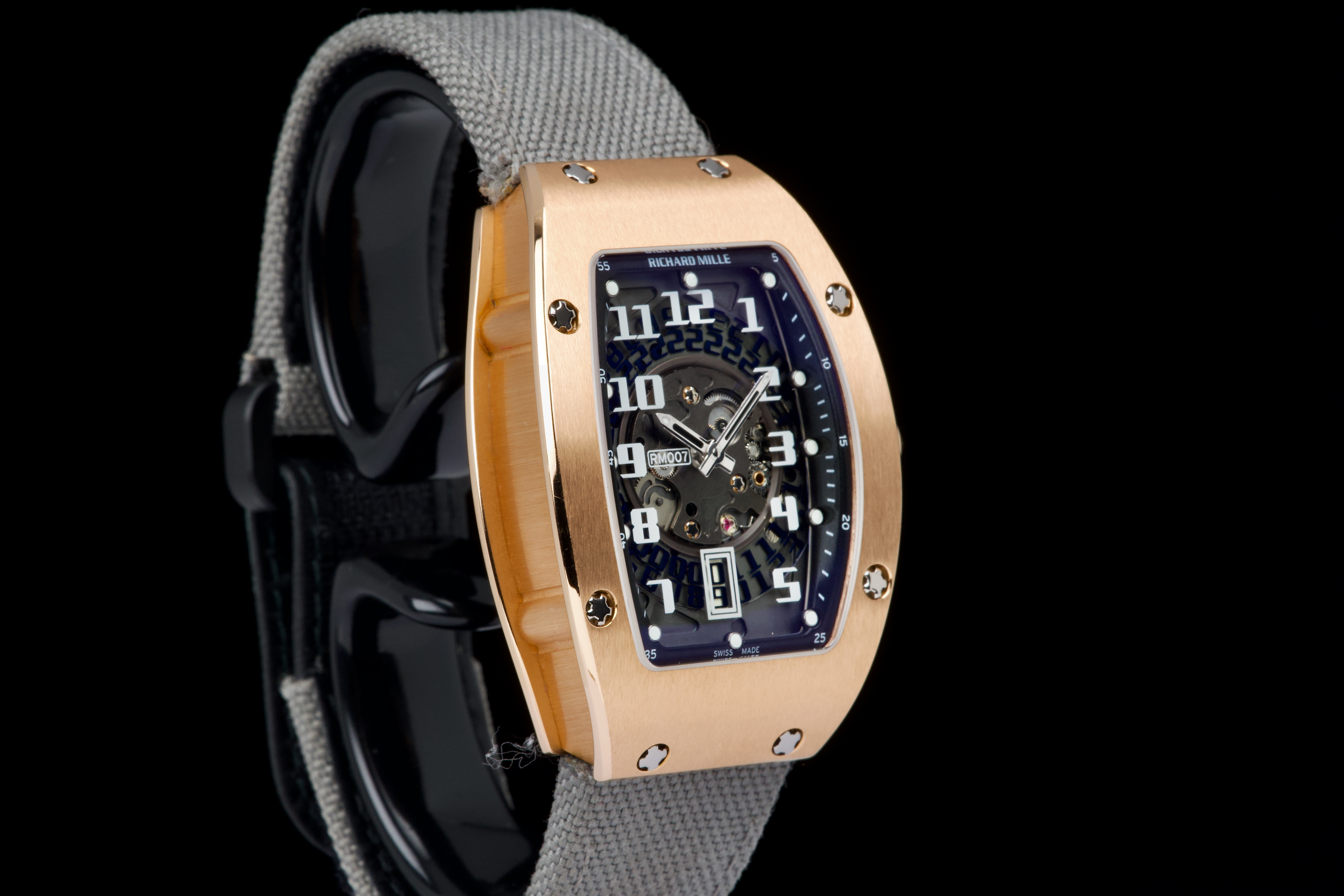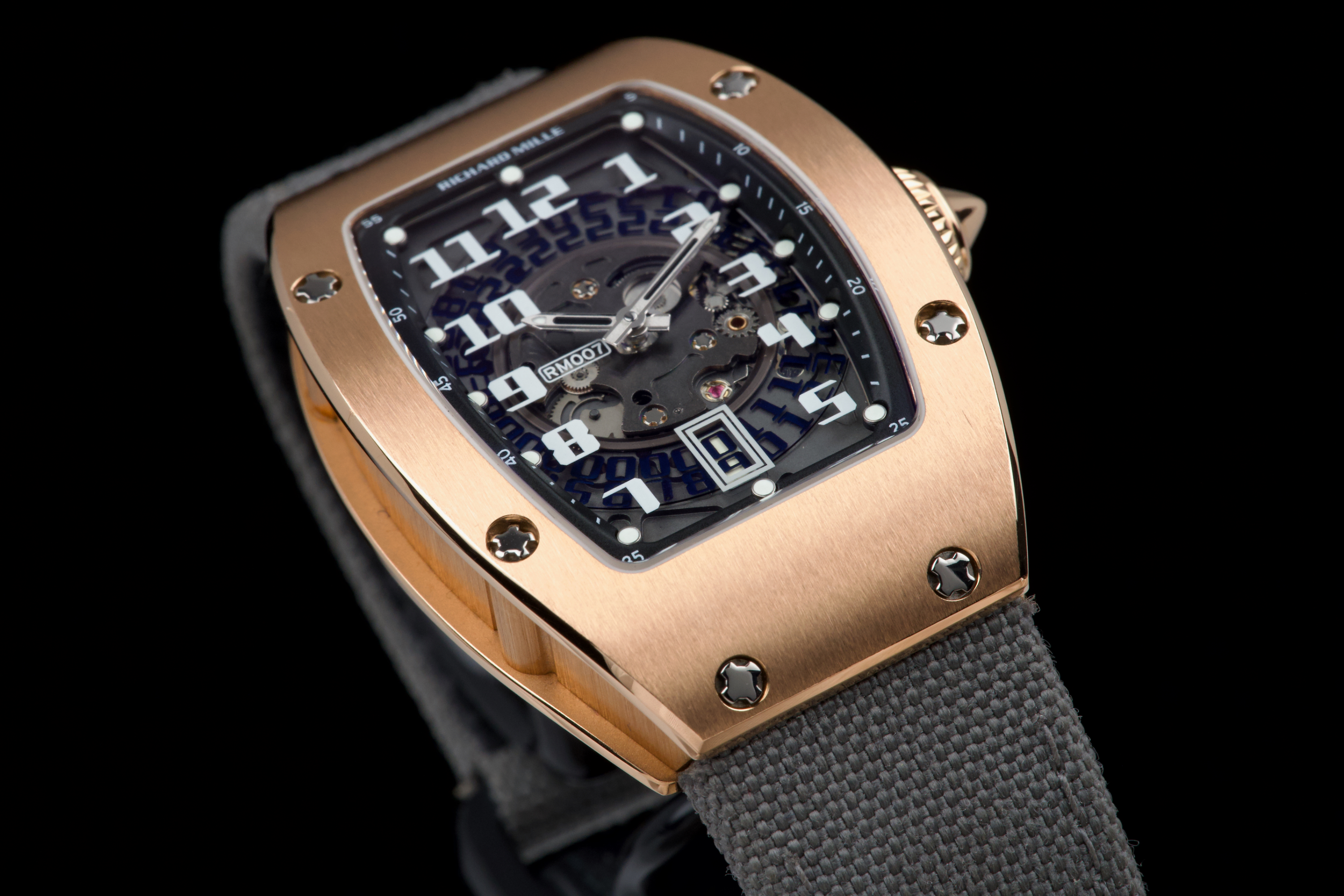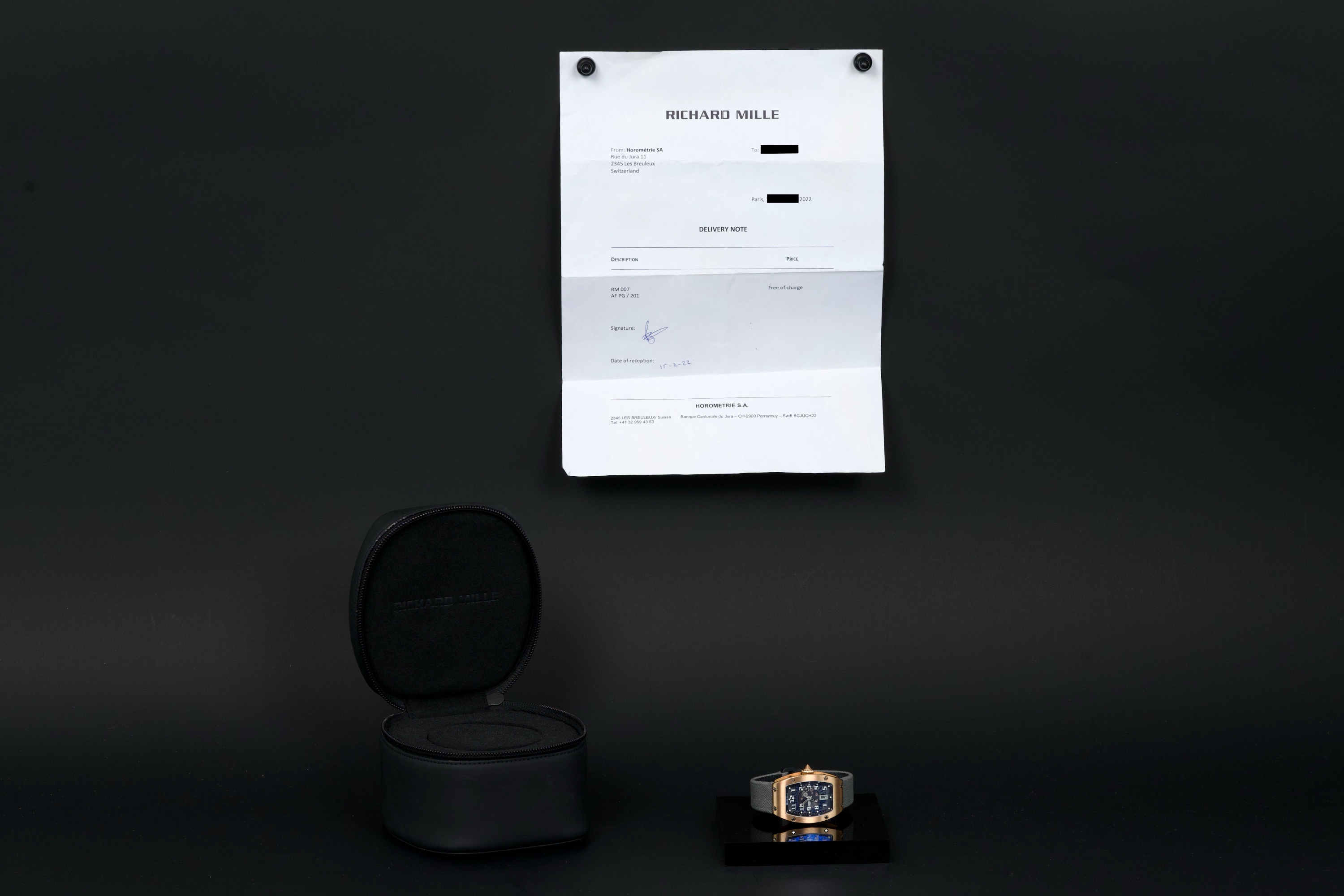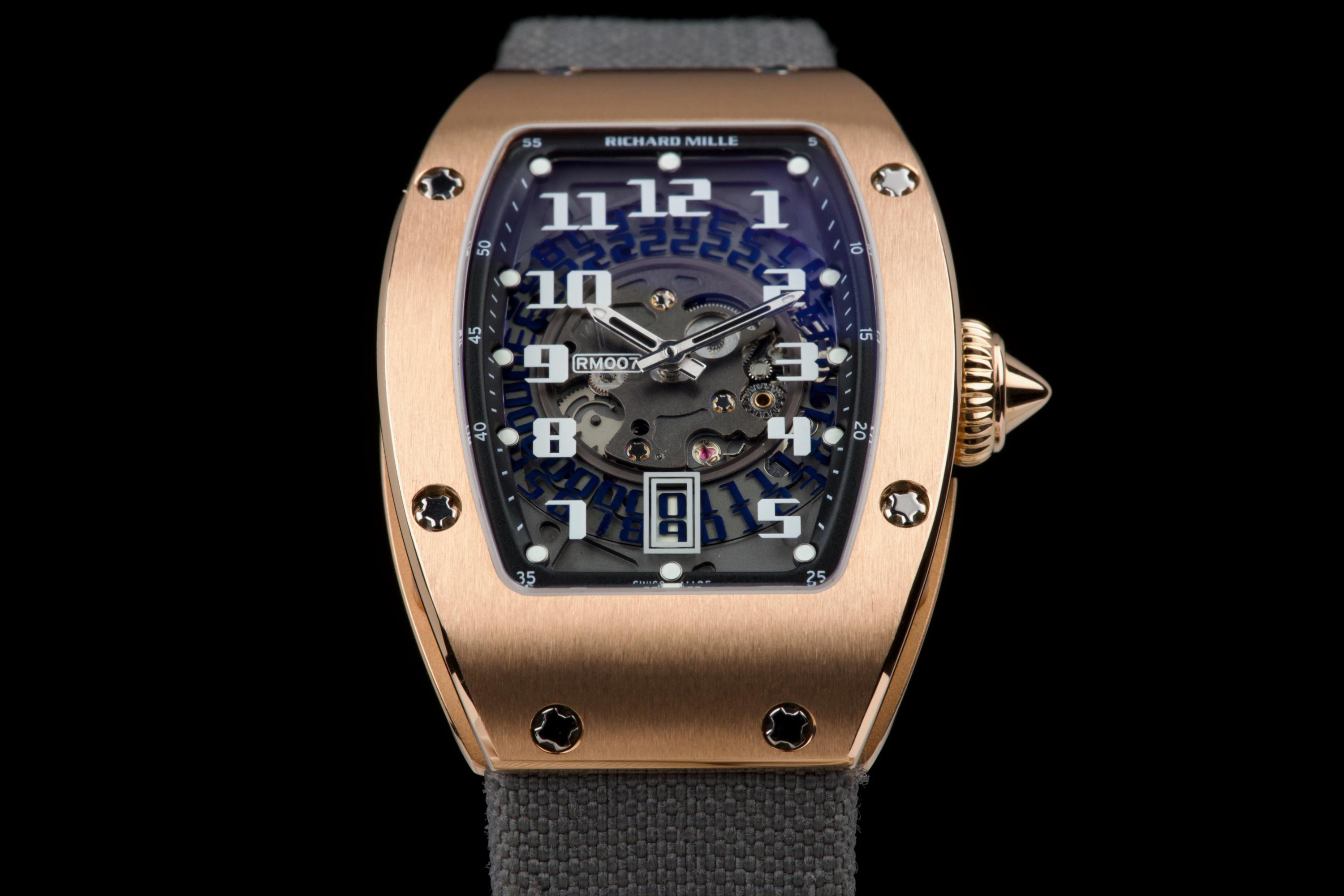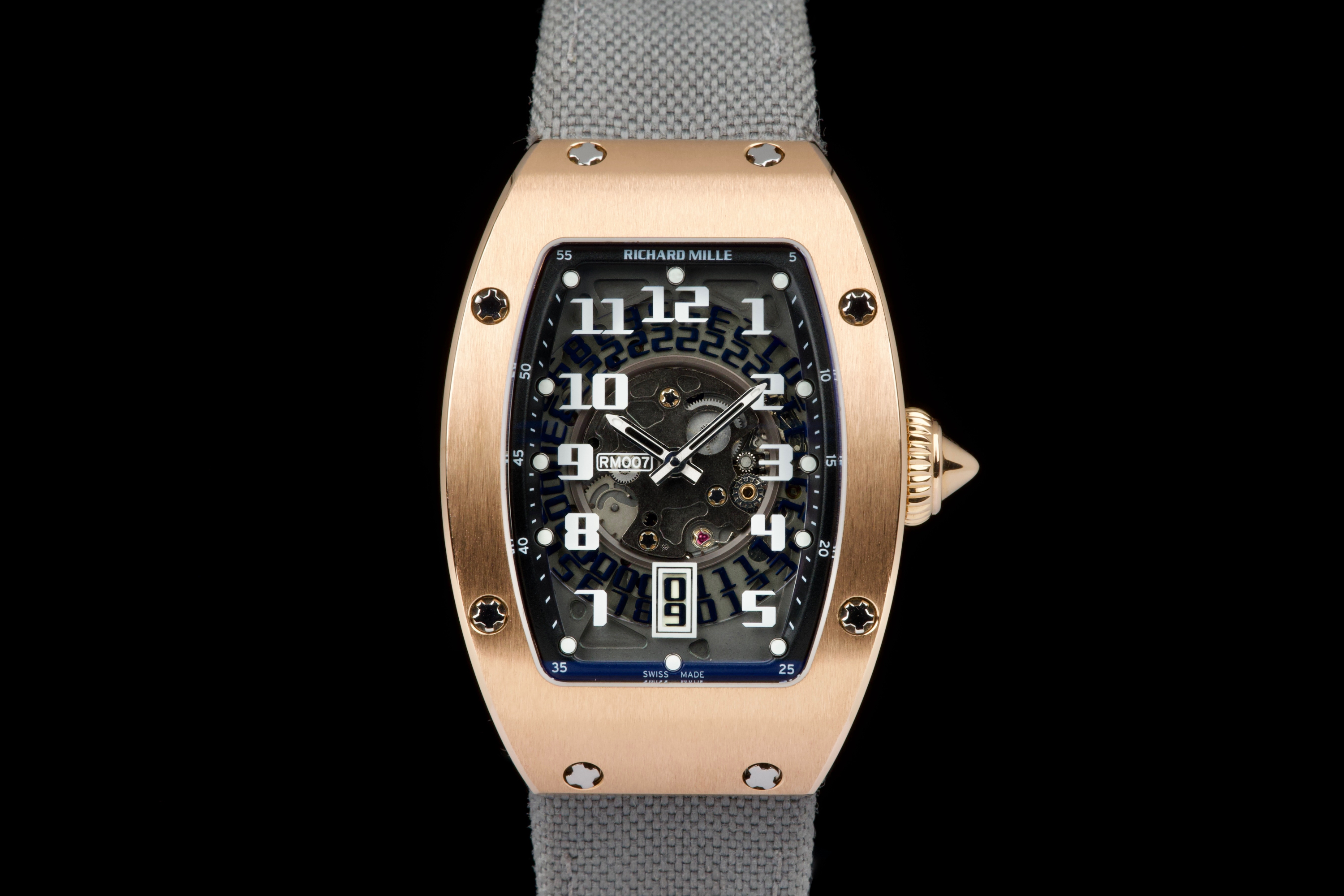 A beautifully preserved example of the Richard Mille RM007, one of the earliest and most emblematic ladies’ models from the brand’s pioneering years. This curved tonneau case in 18k pink gold measures 45 × 31.5 mm with an 11.5 mm thickness, offering the signature Richard Mille ergonomics and presence on the wrist. The watch features a sapphire crystal dial revealing the automatic calibre RM007-1, equipped with a pierced rotor containing 18k gold micro-balls — an early expression of the brand’s technical creativity. The dial presents Arabic numerals with luminescent accents, skeletonized luminous hands, and a date aperture at 6 o’clock. The enlarged bezel, secured by eight signature screws, integrates seamlessly with the hidden lugs. The sapphire display back, fixed with four screws, allows a clear view of the movement. The watch appears to have been lightly polished in the past, and shows extremely minimal wear consistent with very careful use. The movement is running well at the time of cataloguing, though a service may be advisable in the future to ensure optimal long-term preservation. It comes fitted with a fabric strap with a Velcro-style (scratch) fastening system, ensuring comfort and lightness, and is accompanied by a Richard Mille delivery note, likely issued for a warranty-related repair, dated 2022. A rare opportunity to acquire an early, historically significant Richard Mille creation in elegant lady size, combining technical innovation, sculptural design, and refined precious-metal construction.