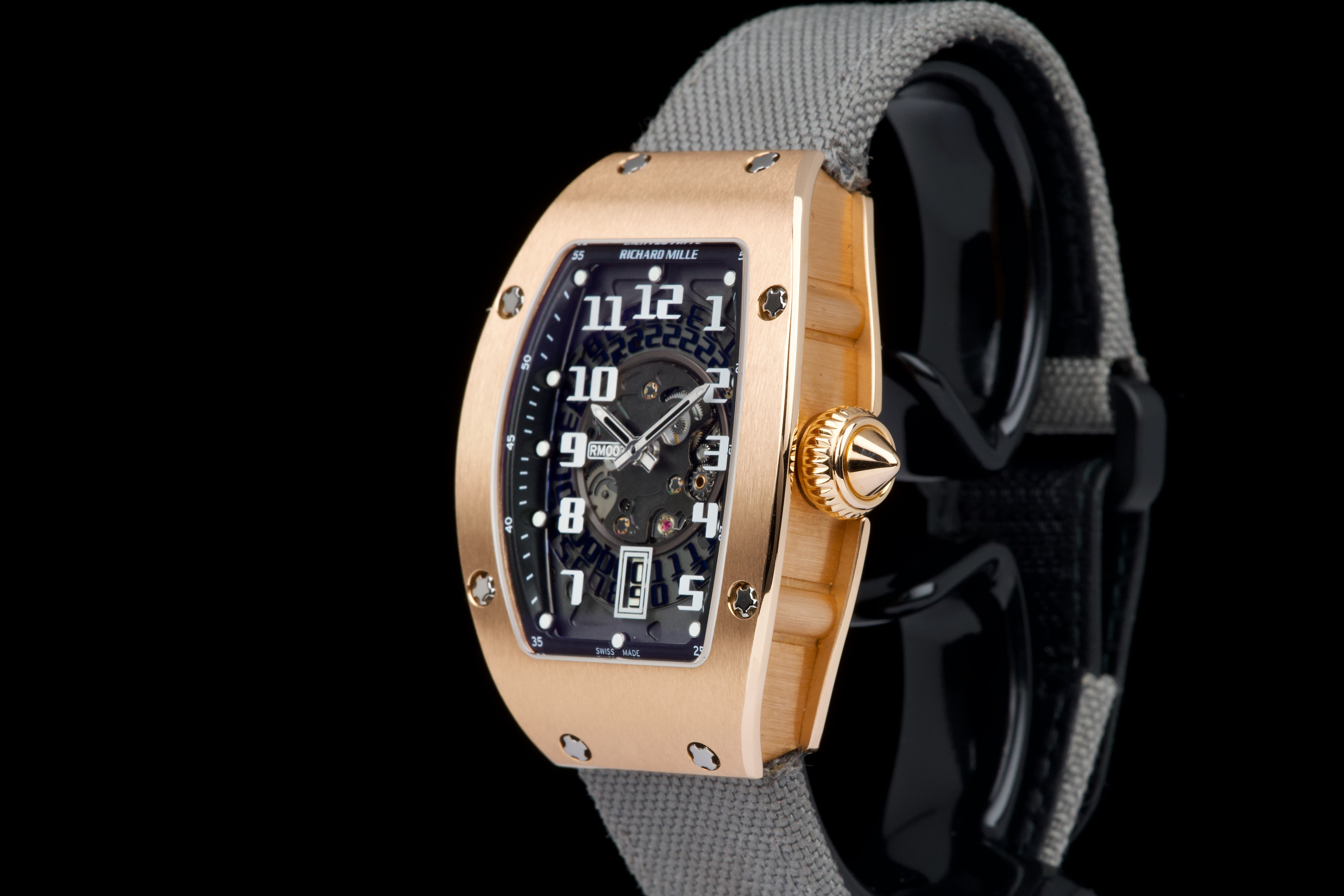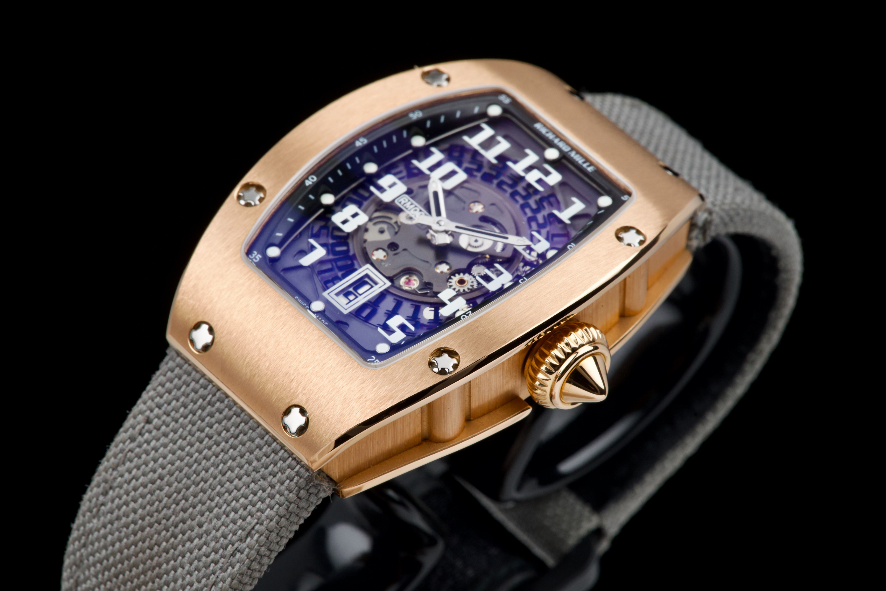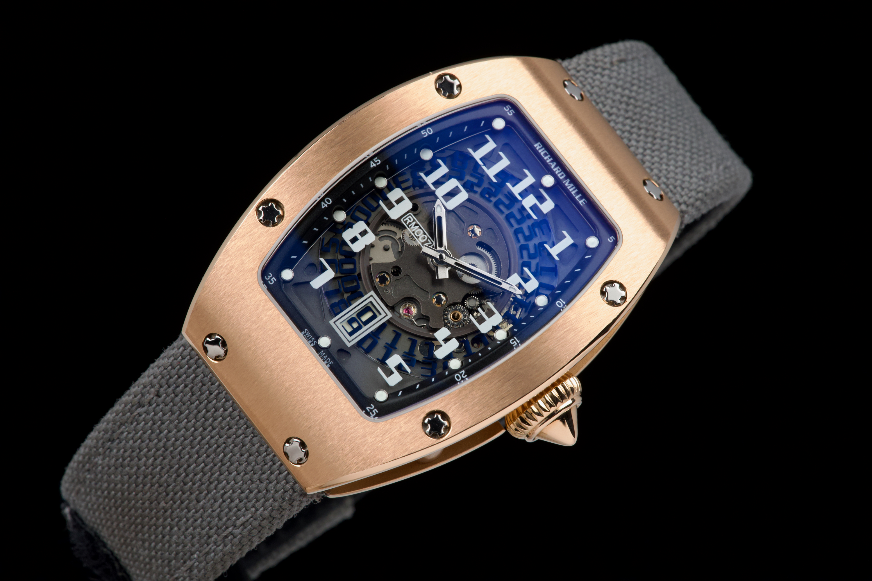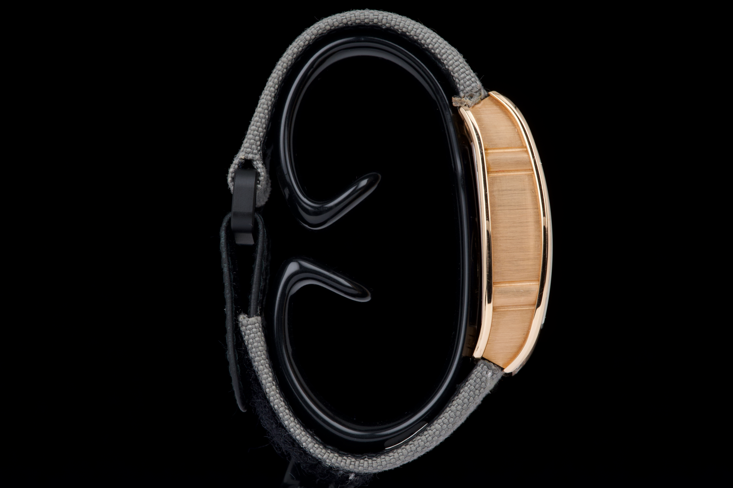 A beautifully preserved example of the Richard Mille RM007, one of the earliest and most emblematic ladies’ models from the brand’s pioneering years. This curved tonneau case in 18k pink gold measures 45 × 31.5 mm with an 11.5 mm thickness, offering the signature Richard Mille ergonomics and presence on the wrist. The watch features a sapphire crystal dial revealing the automatic calibre RM007-1, equipped with a pierced rotor containing 18k gold micro-balls — an early expression of the brand’s technical creativity. The dial presents Arabic numerals with luminescent accents, skeletonized luminous hands, and a date aperture at 6 o’clock. The enlarged bezel, secured by eight signature screws, integrates seamlessly with the hidden lugs. The sapphire display back, fixed with four screws, allows a clear view of the movement. The watch appears to have been lightly polished in the past, and shows extremely minimal wear consistent with very careful use. The movement is running well at the time of cataloguing, though a service may be advisable in the future to ensure optimal long-term preservation. It comes fitted with a fabric strap with a Velcro-style (scratch) fastening system, ensuring comfort and lightness, and is accompanied by a Richard Mille delivery note, likely issued for a warranty-related repair, dated 2022. A rare opportunity to acquire an early, historically significant Richard Mille creation in elegant lady size, combining technical innovation, sculptural design, and refined precious-metal construction.
