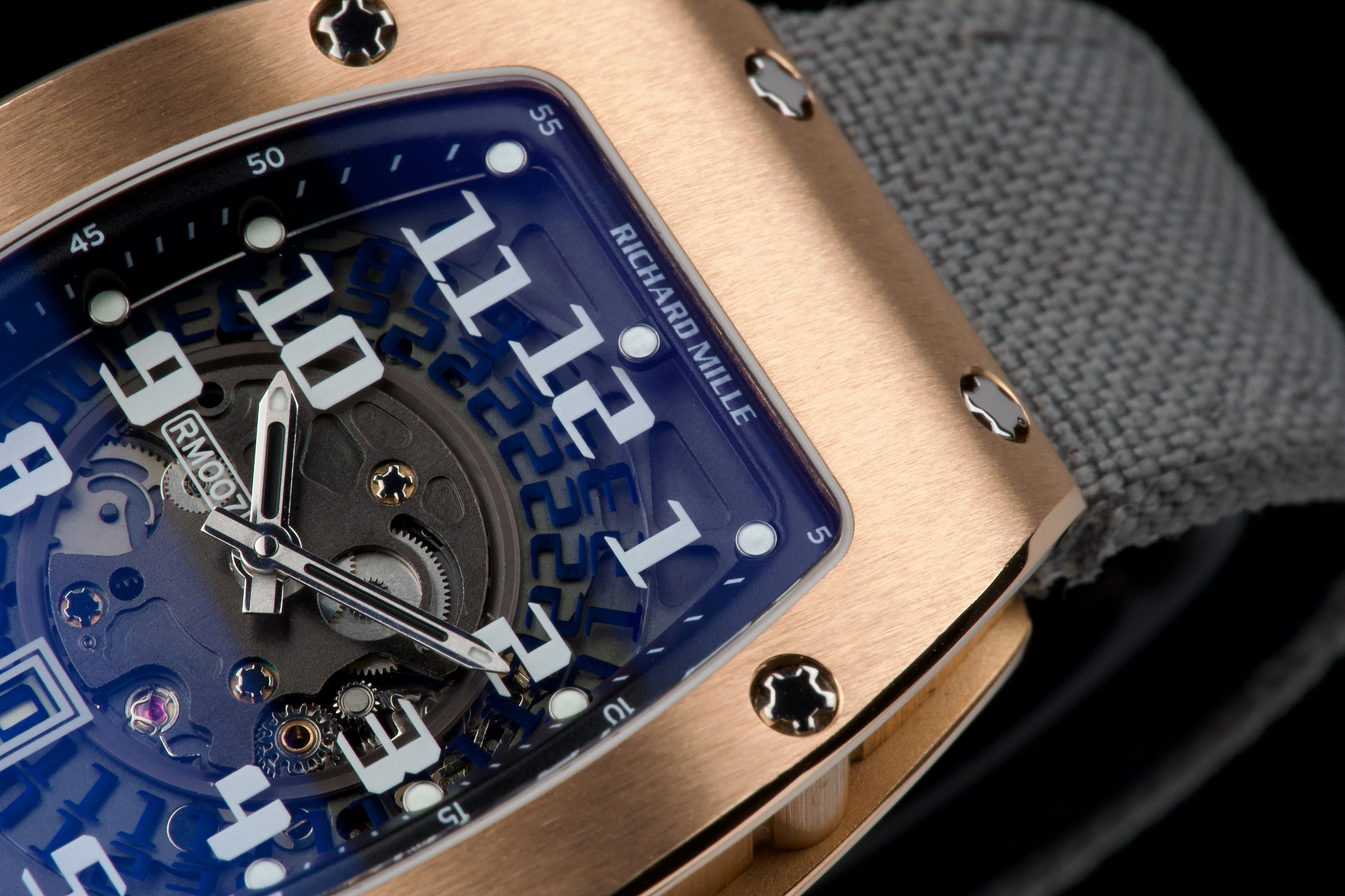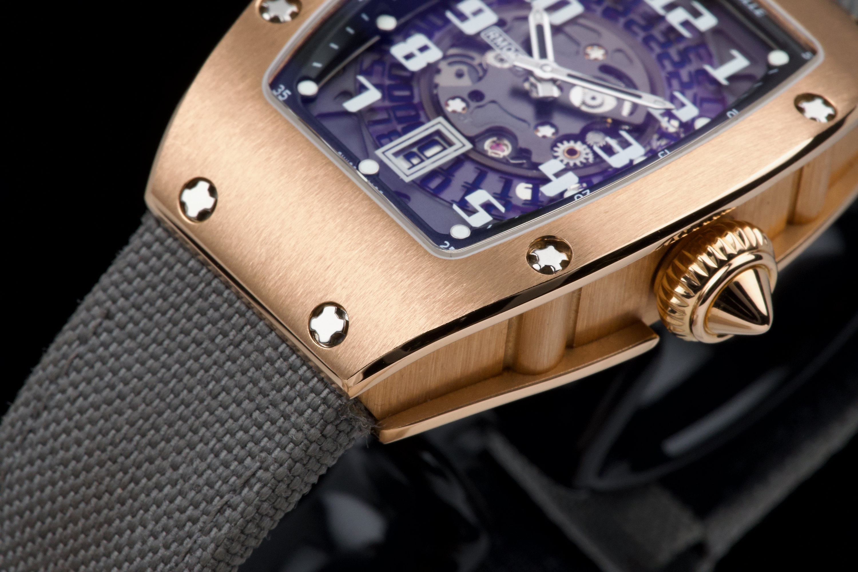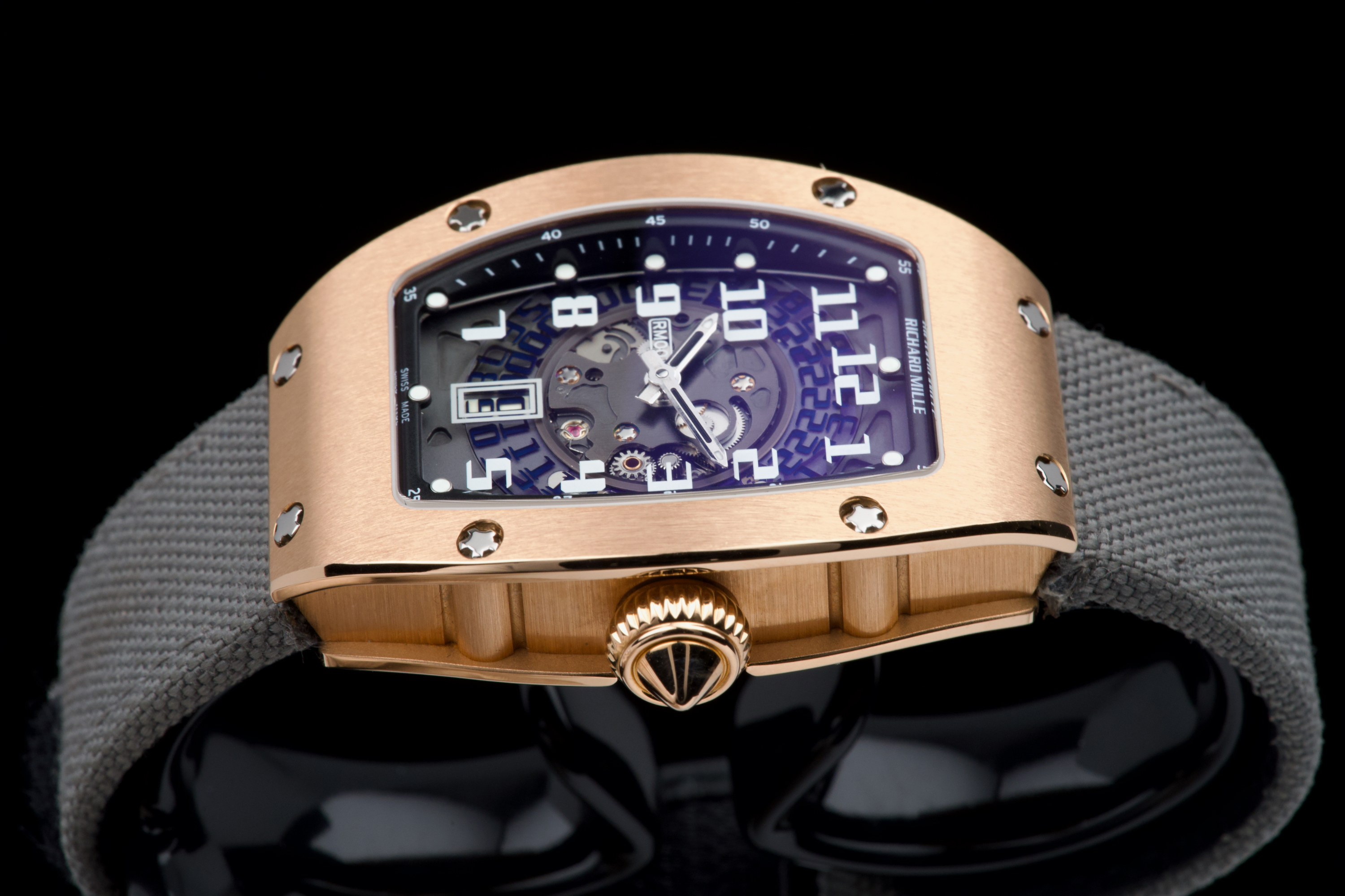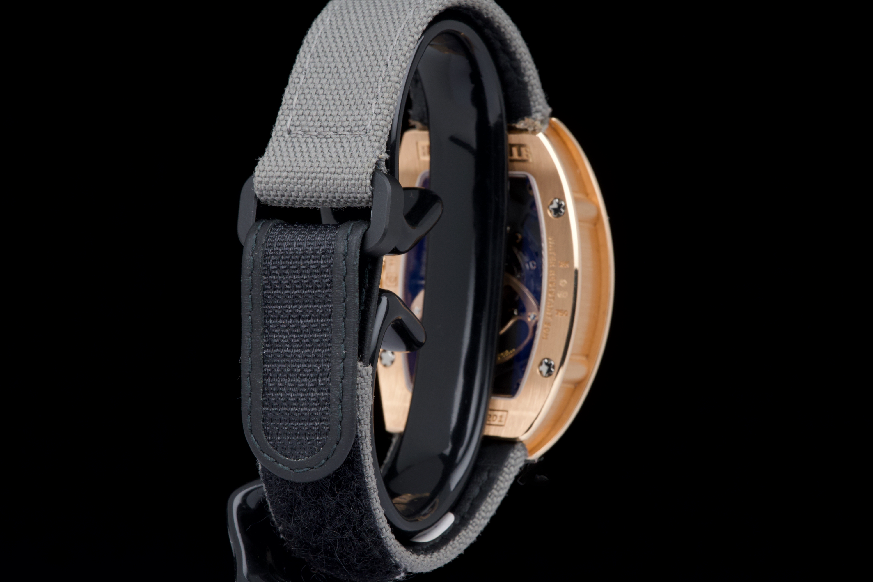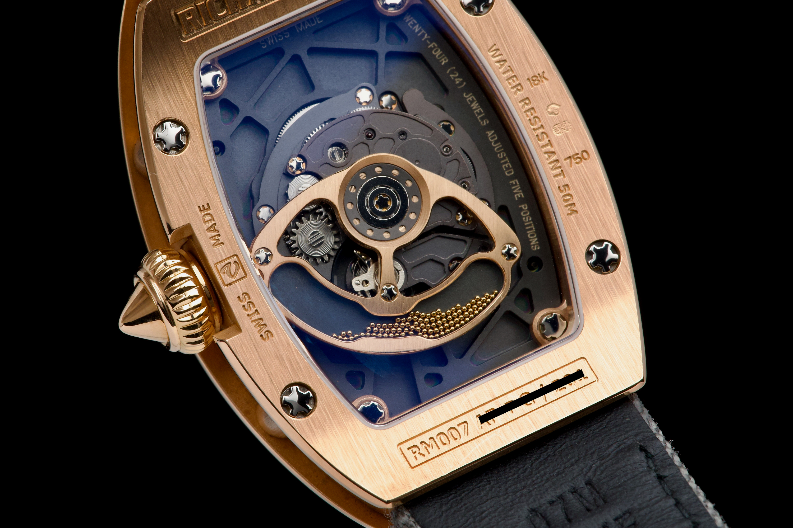 A beautifully preserved example of the Richard Mille RM007, one of the earliest and most emblematic ladies’ models from the brand’s pioneering years. This curved tonneau case in 18k pink gold measures 45 × 31.5 mm with an 11.5 mm thickness, offering the signature Richard Mille ergonomics and presence on the wrist. The watch features a sapphire crystal dial revealing the automatic calibre RM007-1, equipped with a pierced rotor containing 18k gold micro-balls — an early expression of the brand’s technical creativity. The dial presents Arabic numerals with luminescent accents, skeletonized luminous hands, and a date aperture at 6 o’clock. The enlarged bezel, secured by eight signature screws, integrates seamlessly with the hidden lugs. The sapphire display back, fixed with four screws, allows a clear view of the movement. The watch appears to have been lightly polished in the past, and shows extremely minimal wear consistent with very careful use. The movement is running well at the time of cataloguing, though a service may be advisable in the future to ensure optimal long-term preservation. It comes fitted with a fabric strap with a Velcro-style (scratch) fastening system, ensuring comfort and lightness, and is accompanied by a Richard Mille delivery note, likely issued for a warranty-related repair, dated 2022. A rare opportunity to acquire an early, historically significant Richard Mille creation in elegant lady size, combining technical innovation, sculptural design, and refined precious-metal construction.