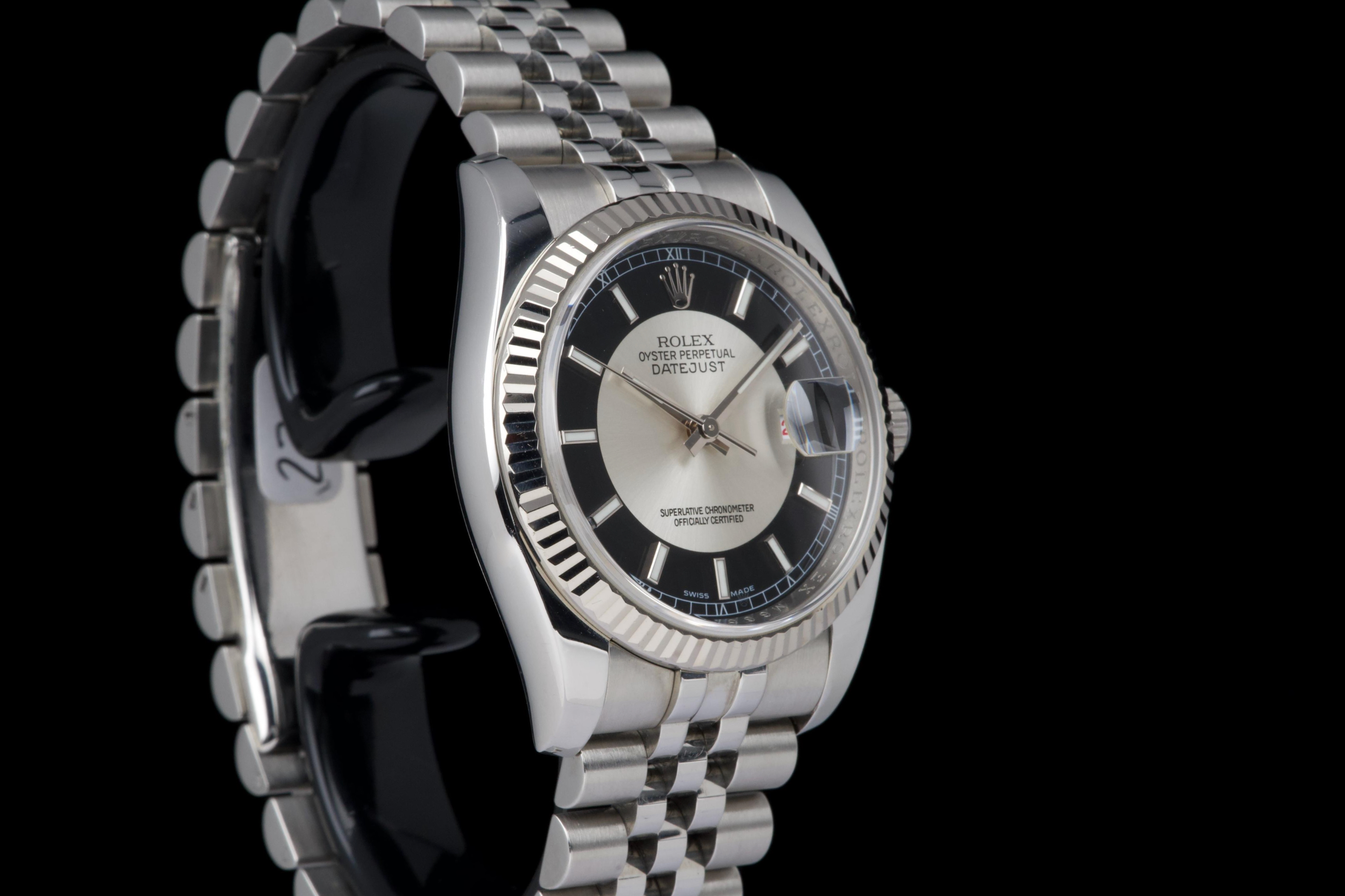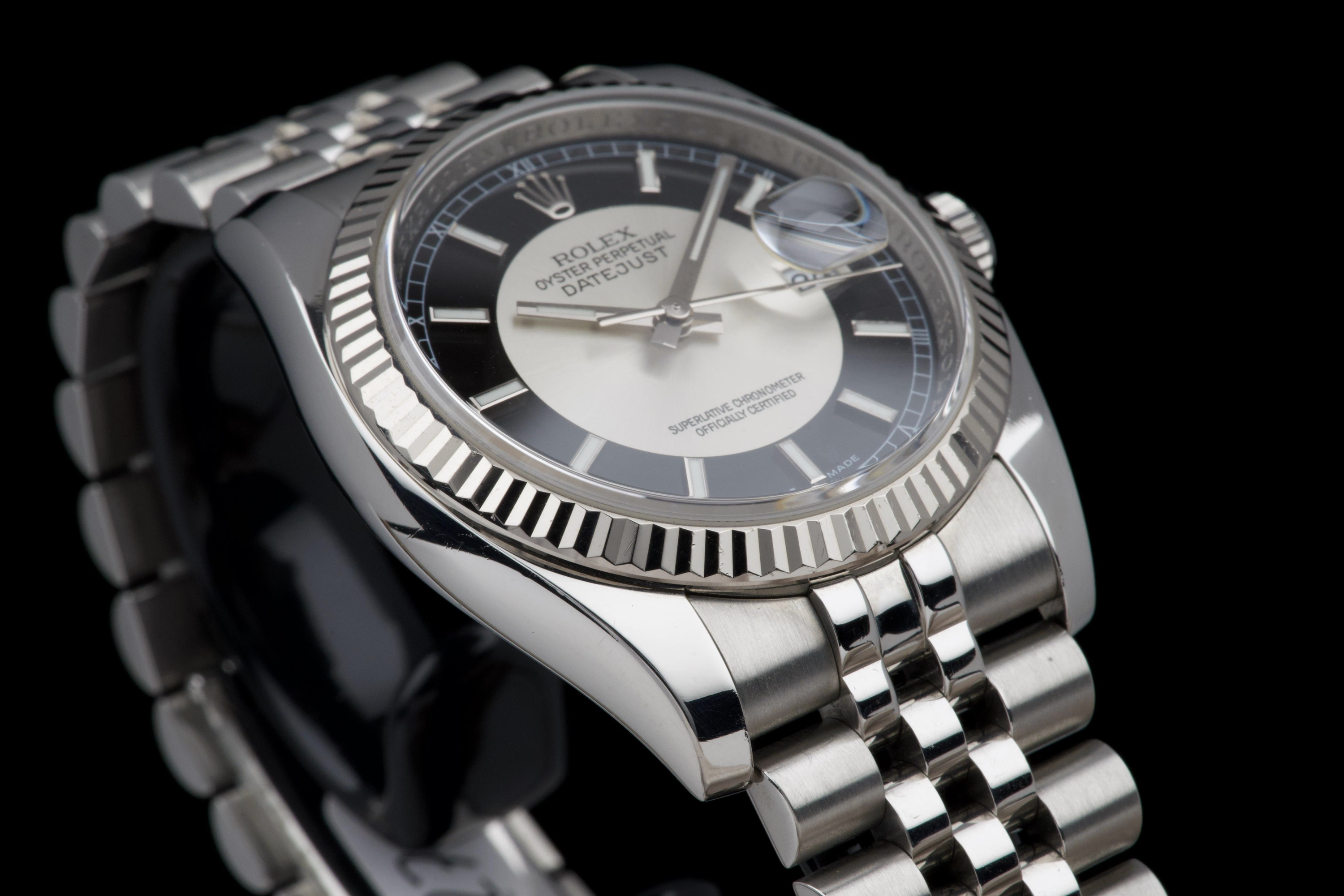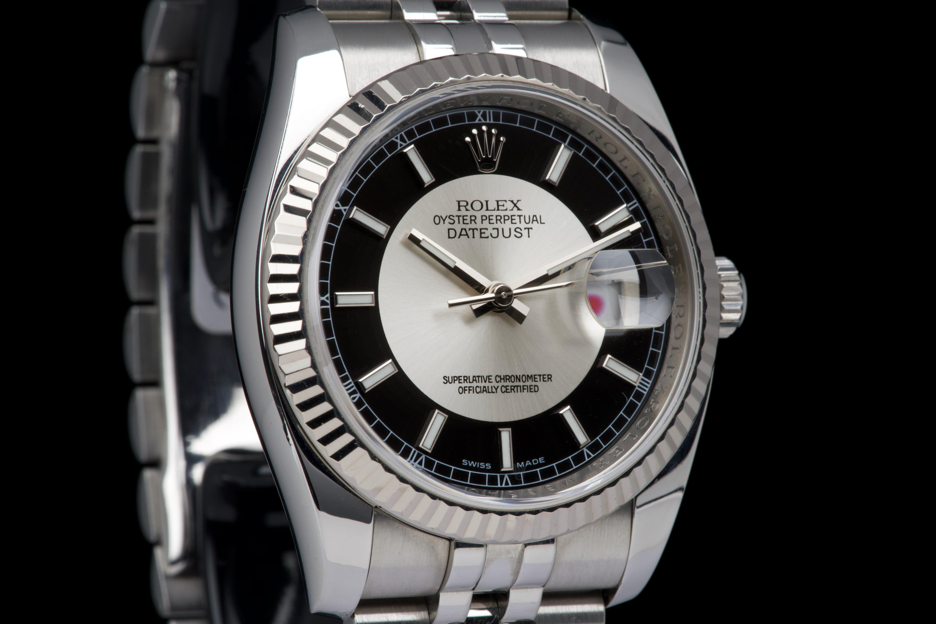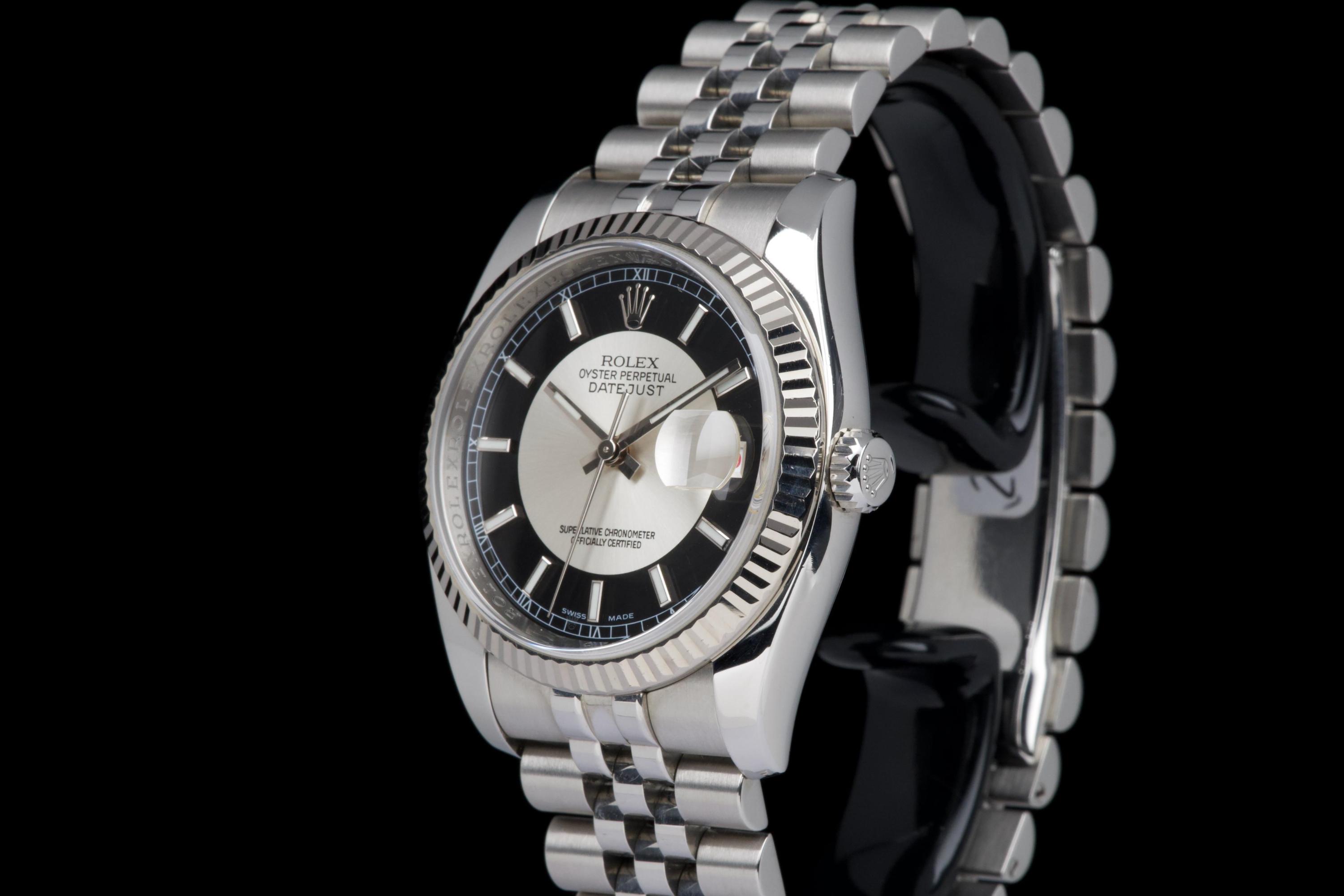 The present Rolex Datejust reference 116234, dating to 2008, is an elegant and increasingly sought-after example featuring the distinctive black “Tuxedo” dial. Offered with its box and papers as shown (not a full set), this configuration stands out for its refined contrast and timeless appeal. The stainless-steel case with white-gold fluted bezel appears to have been polished in the past and is preserved in excellent overall condition, showing only very light wear consistent with careful use. The fluted bezel remains crisp and well defined, contributing to the watch’s classic Datejust profile. The black “Tuxedo” dial, characterized by its contrasting grey inner circle, is particularly attractive and gives the watch a sophisticated, graphic presence on the wrist. The watch is fitted with a Jubilee bracelet that shows very little stretch, underscoring the careful wear it has seen. The movement has been checked by our watchmaker and is functioning correctly at the time of cataloguing. Delivered with the set shown in the photographs, including its box and original papers, this Datejust 116234 with Tuxedo dial represents a compelling opportunity to acquire a well-preserved and distinctive modern Rolex Datejust, combining classic proportions with an uncommon and elegant dial configuration.