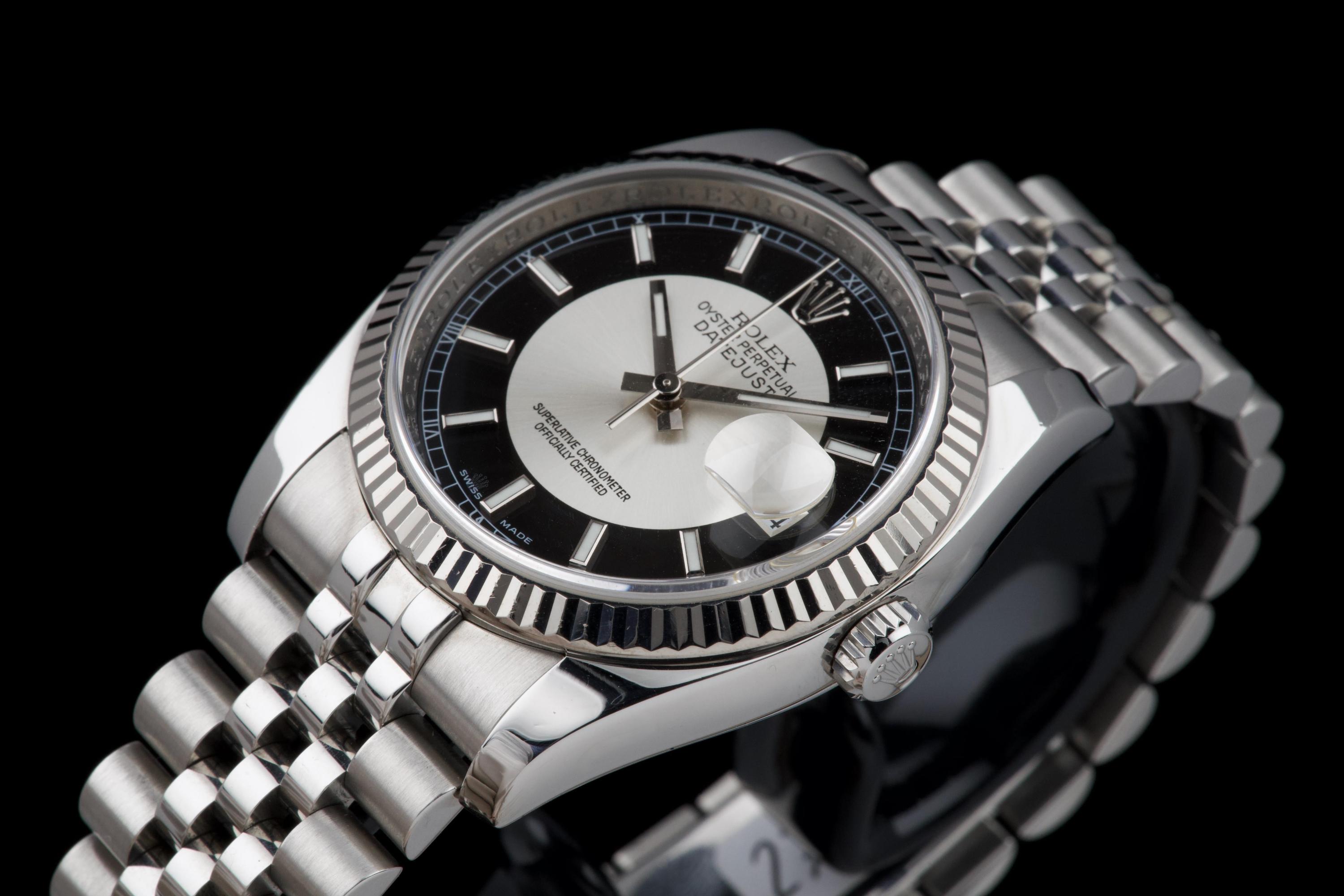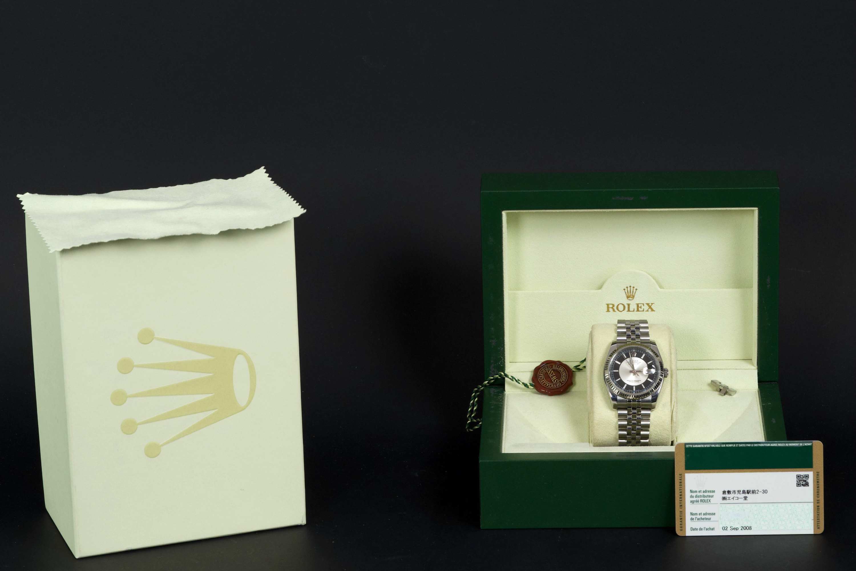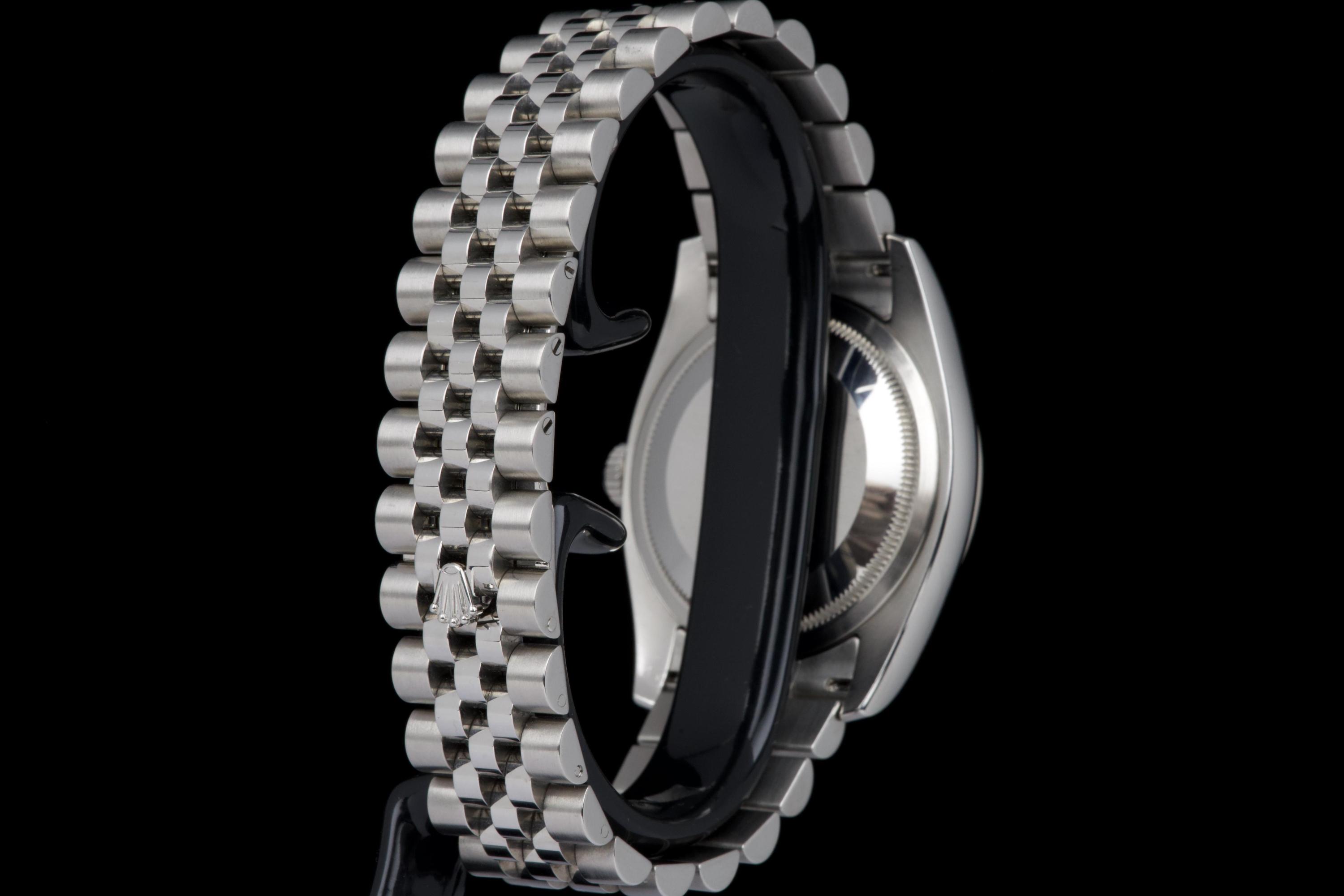 The present Rolex Datejust reference 116234, dating to 2008, is an elegant and increasingly sought-after example featuring the distinctive black “Tuxedo” dial. Offered with its box and papers as shown (not a full set), this configuration stands out for its refined contrast and timeless appeal. The stainless-steel case with white-gold fluted bezel appears to have been polished in the past and is preserved in excellent overall condition, showing only very light wear consistent with careful use. The fluted bezel remains crisp and well defined, contributing to the watch’s classic Datejust profile. The black “Tuxedo” dial, characterized by its contrasting grey inner circle, is particularly attractive and gives the watch a sophisticated, graphic presence on the wrist. The watch is fitted with a Jubilee bracelet that shows very little stretch, underscoring the careful wear it has seen. The movement has been checked by our watchmaker and is functioning correctly at the time of cataloguing. Delivered with the set shown in the photographs, including its box and original papers, this Datejust 116234 with Tuxedo dial represents a compelling opportunity to acquire a well-preserved and distinctive modern Rolex Datejust, combining classic proportions with an uncommon and elegant dial configuration.