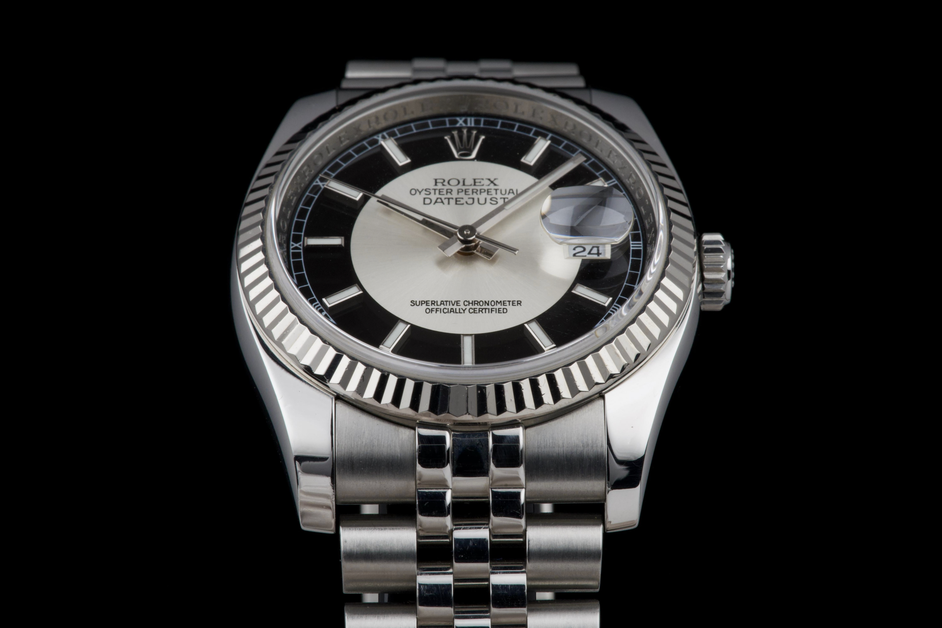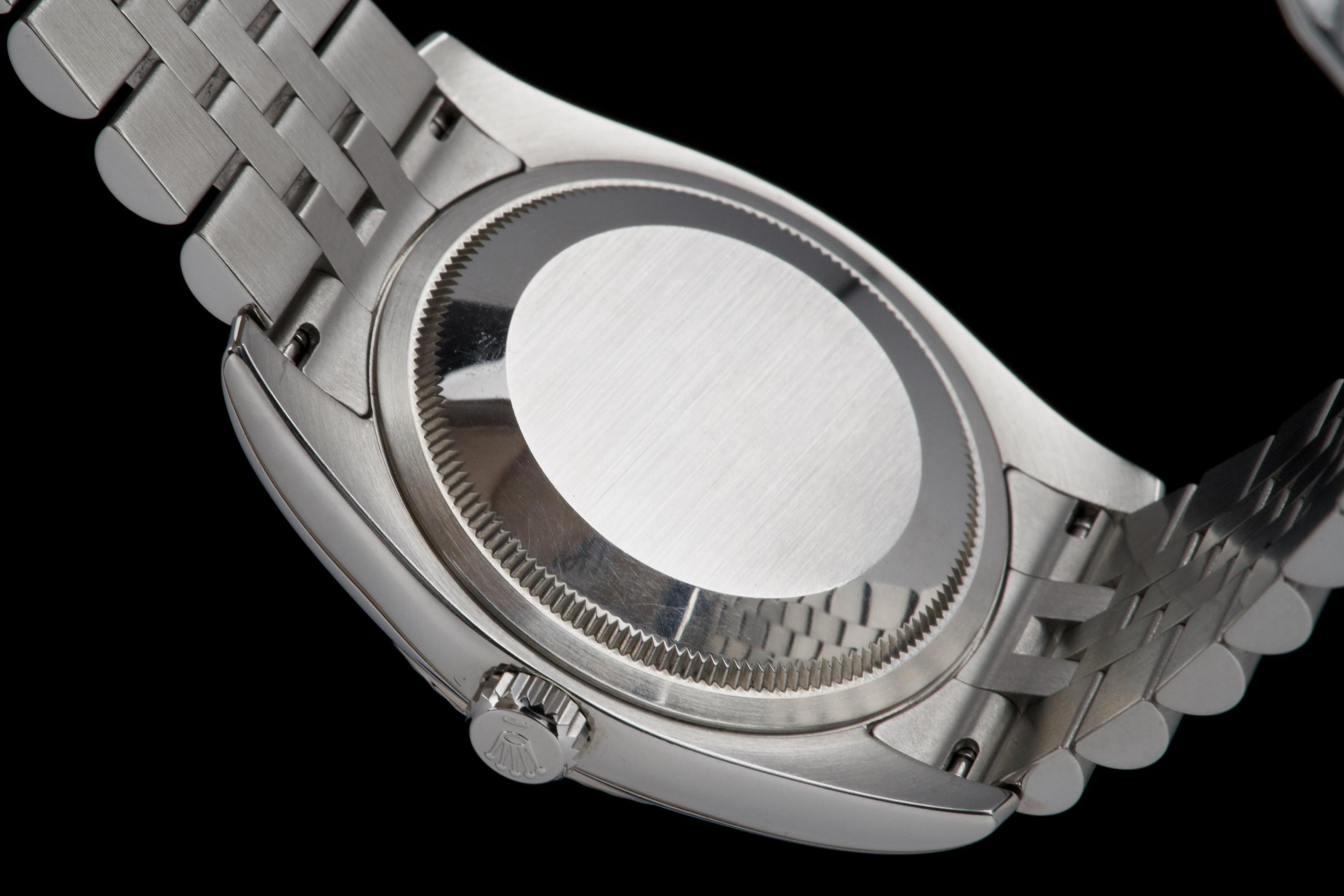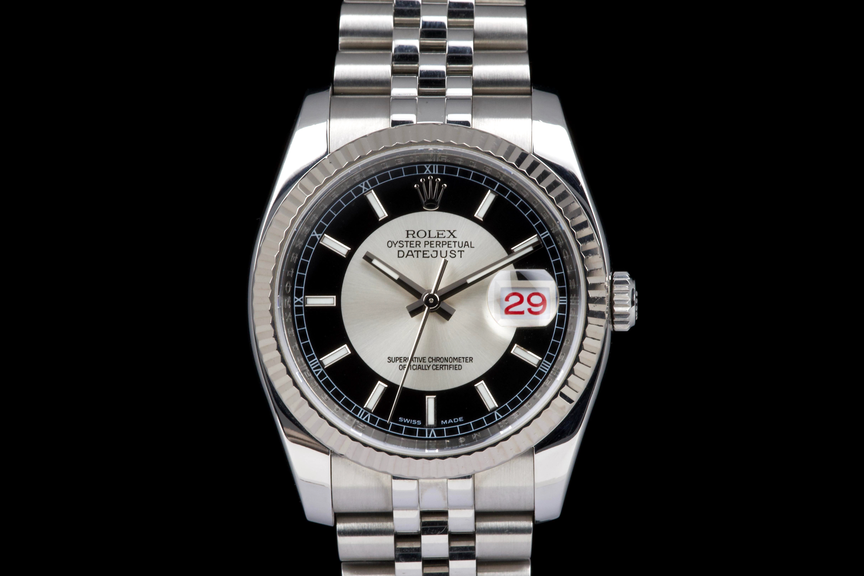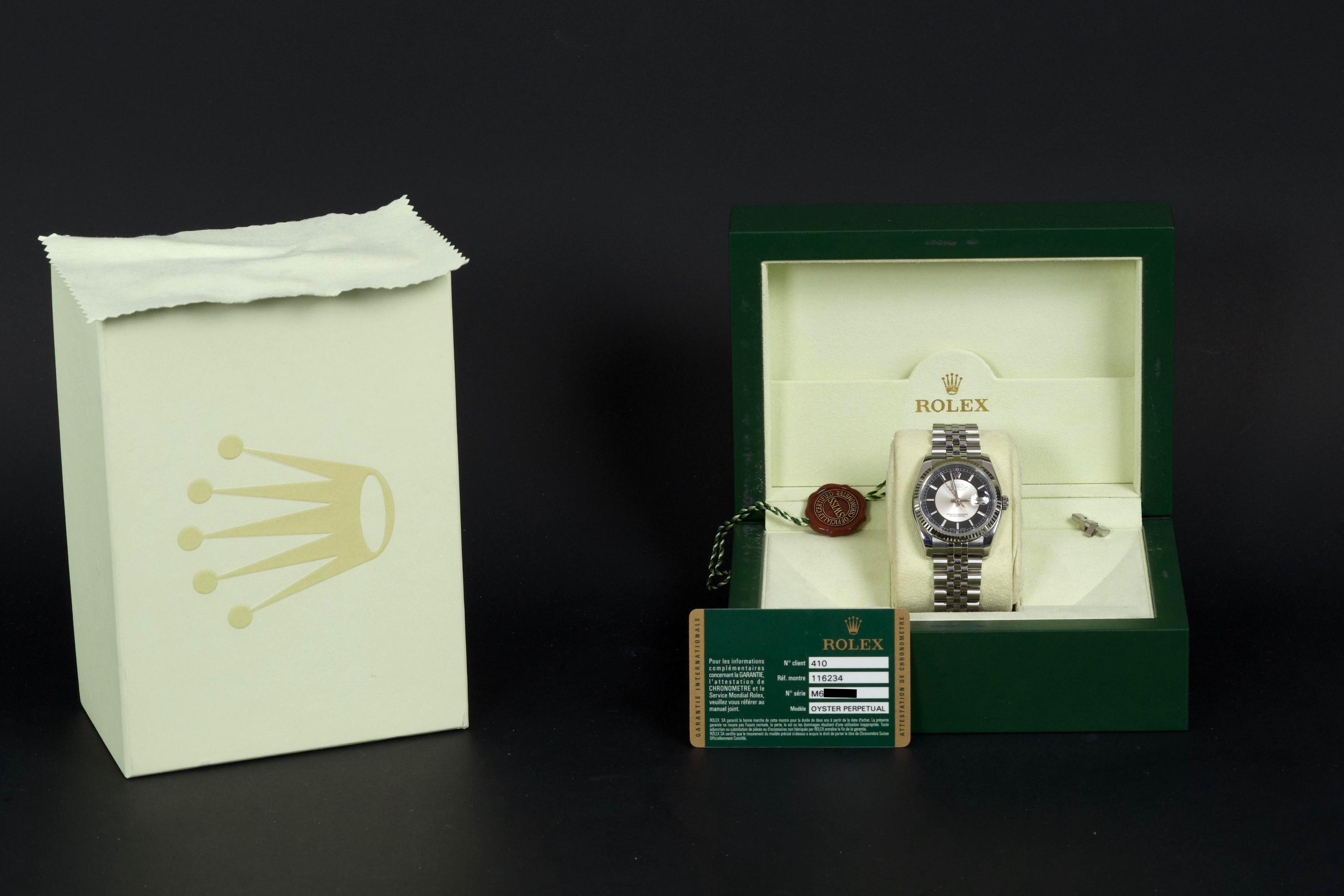 The present Rolex Datejust reference 116234, dating to 2008, is an elegant and increasingly sought-after example featuring the distinctive black “Tuxedo” dial. Offered with its box and papers as shown (not a full set), this configuration stands out for its refined contrast and timeless appeal. The stainless-steel case with white-gold fluted bezel appears to have been polished in the past and is preserved in excellent overall condition, showing only very light wear consistent with careful use. The fluted bezel remains crisp and well defined, contributing to the watch’s classic Datejust profile. The black “Tuxedo” dial, characterized by its contrasting grey inner circle, is particularly attractive and gives the watch a sophisticated, graphic presence on the wrist. The watch is fitted with a Jubilee bracelet that shows very little stretch, underscoring the careful wear it has seen. The movement has been checked by our watchmaker and is functioning correctly at the time of cataloguing. Delivered with the set shown in the photographs, including its box and original papers, this Datejust 116234 with Tuxedo dial represents a compelling opportunity to acquire a well-preserved and distinctive modern Rolex Datejust, combining classic proportions with an uncommon and elegant dial configuration.