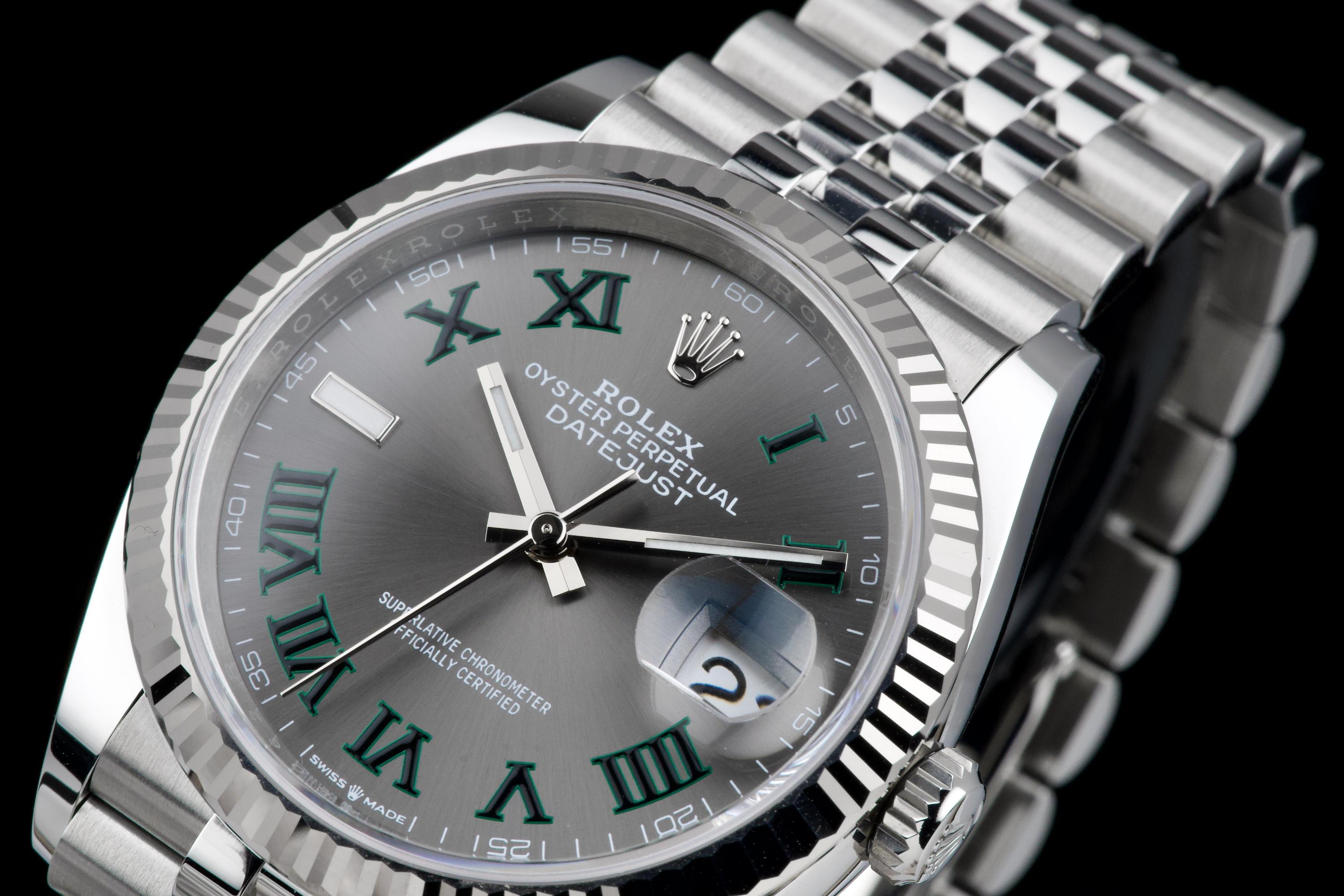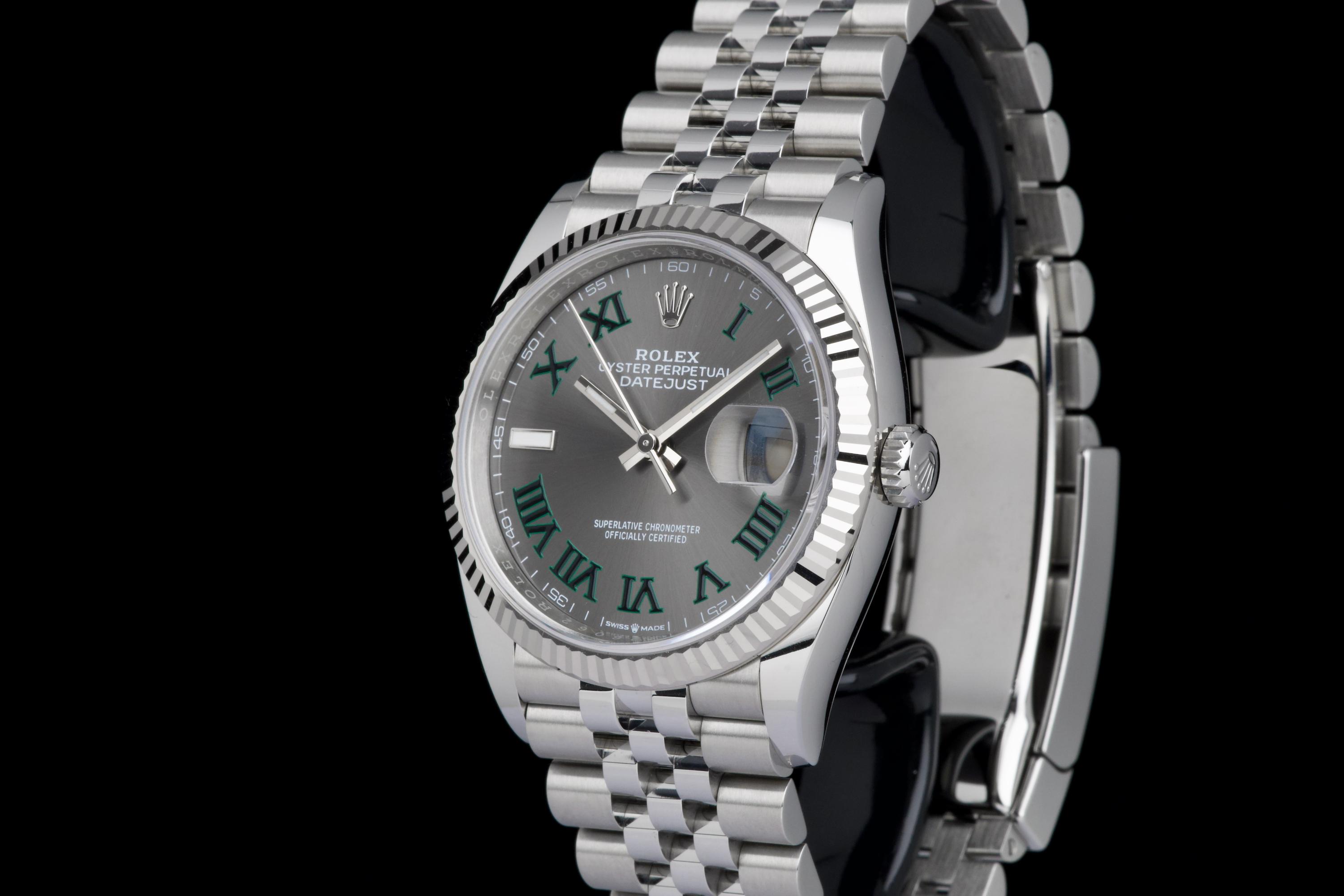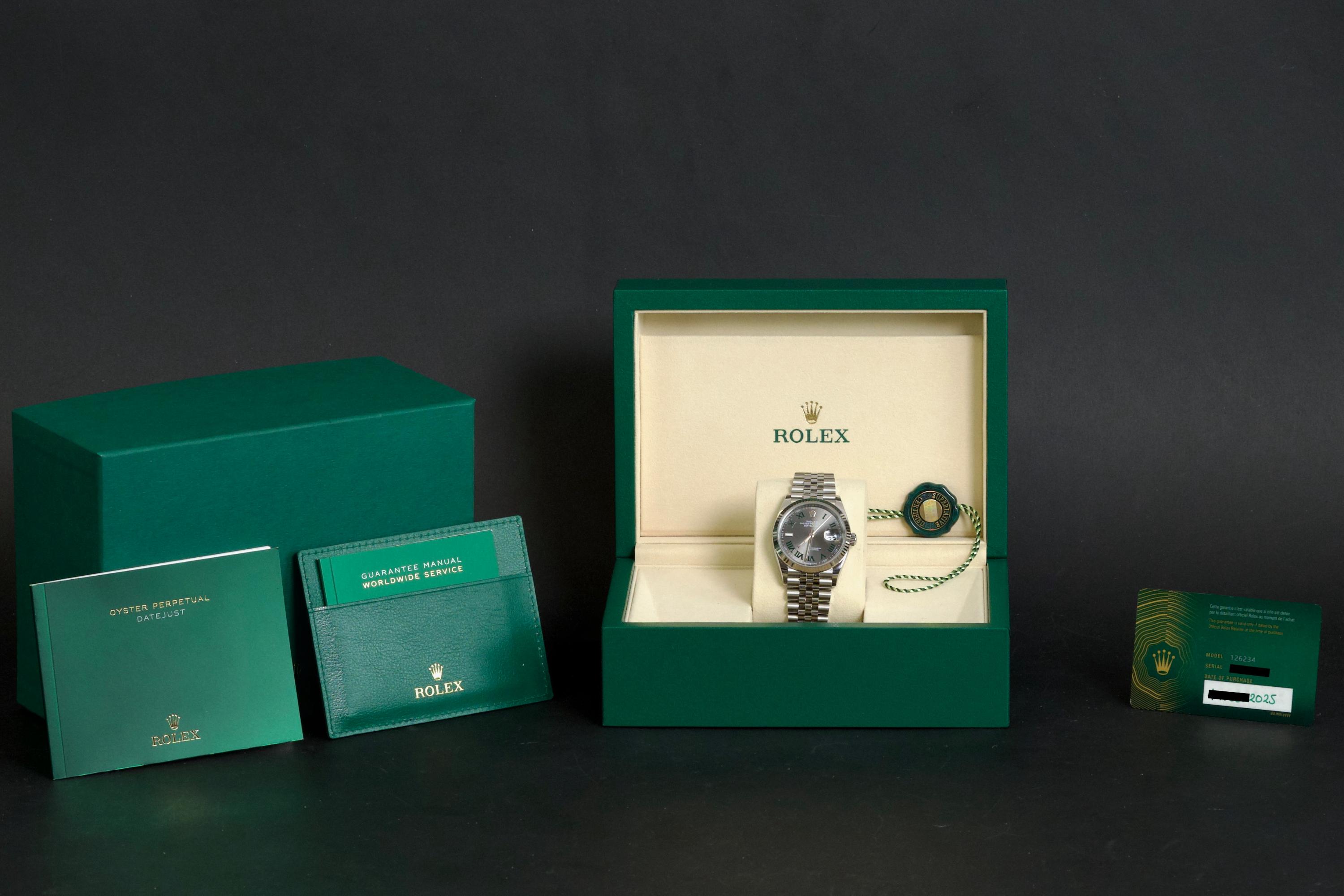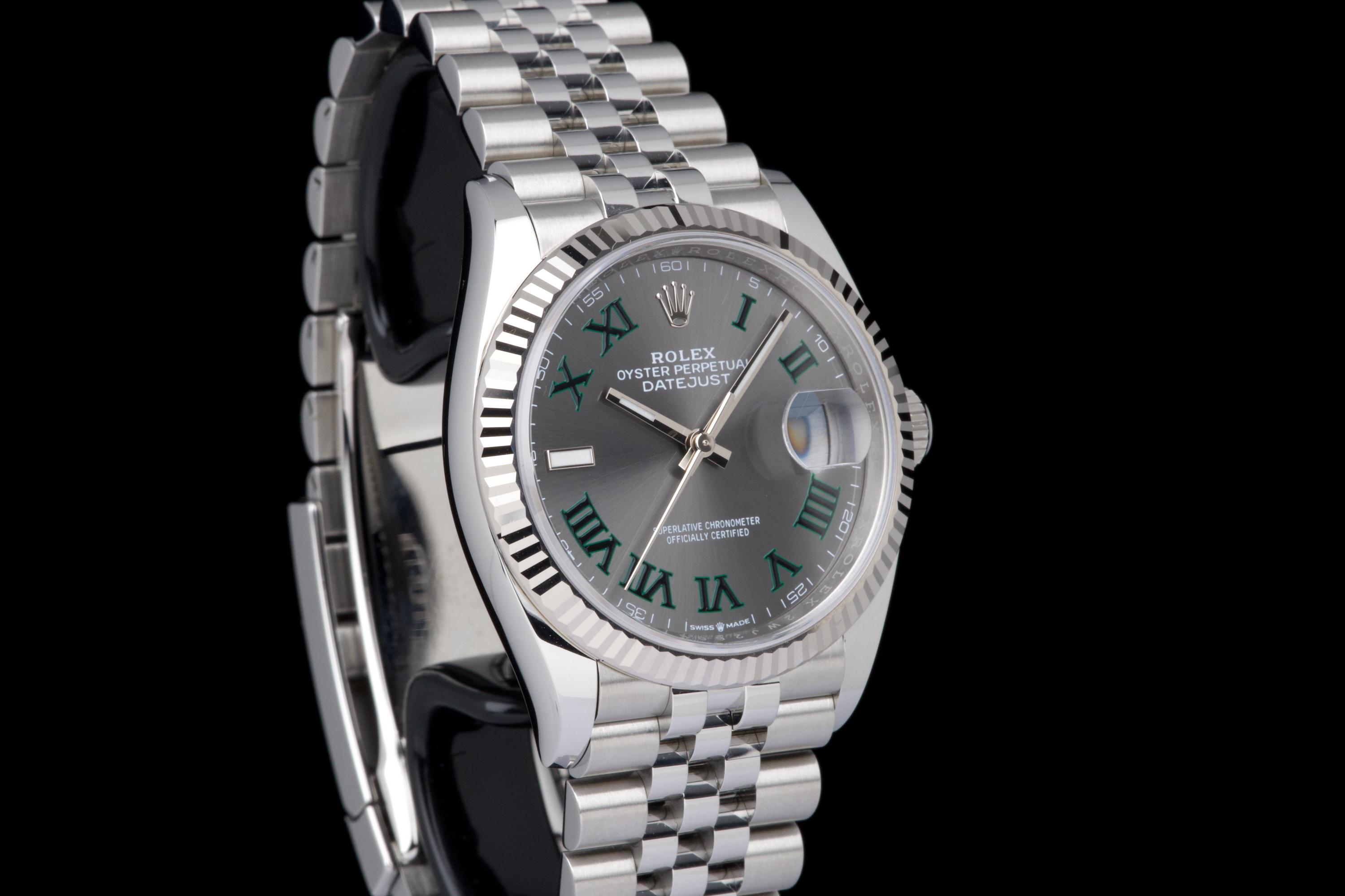 A stunning and mint example of the iconic Rolex Datejust 36 “Wimbledon,” featuring the distinctive slate grey dial with green Roman numerals — one of the most recognizable and sought-after configurations in the modern Datejust line. Crafted in stainless steel with an 18k white gold fluted bezel, and fitted on the Jubilee bracelet, this piece embodies timeless Rolex elegance. Powered by the automatic caliber 3235 with Chronergy escapement, 70-hour power reserve, and Superlative Chronometer precision. Complete with its original box, 2025 warranty card, booklets, and accessories. A perfect example of the modern Datejust 36 “Wimbledon,” combining sporty sophistication, luxury detailing, and flawless condition.
