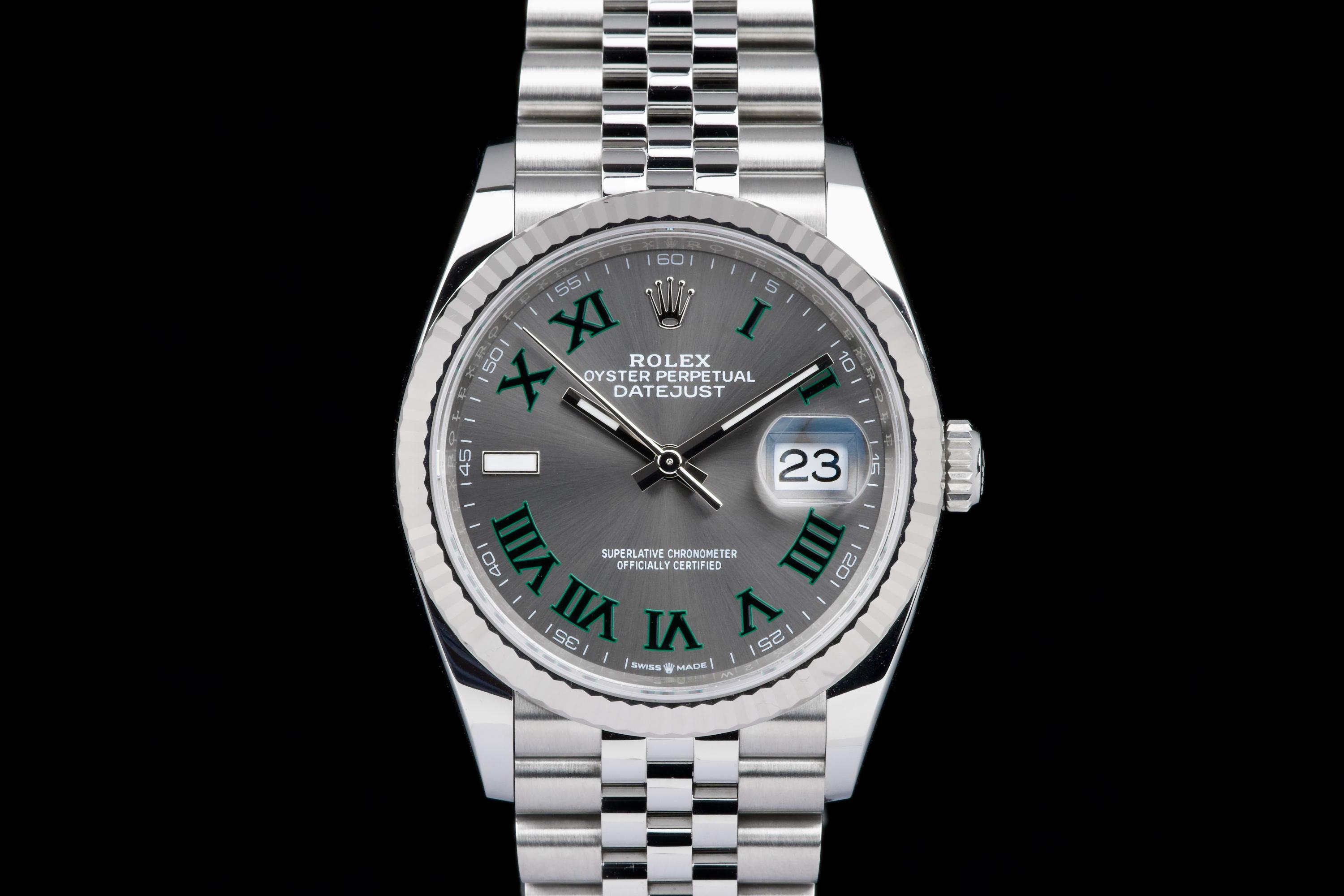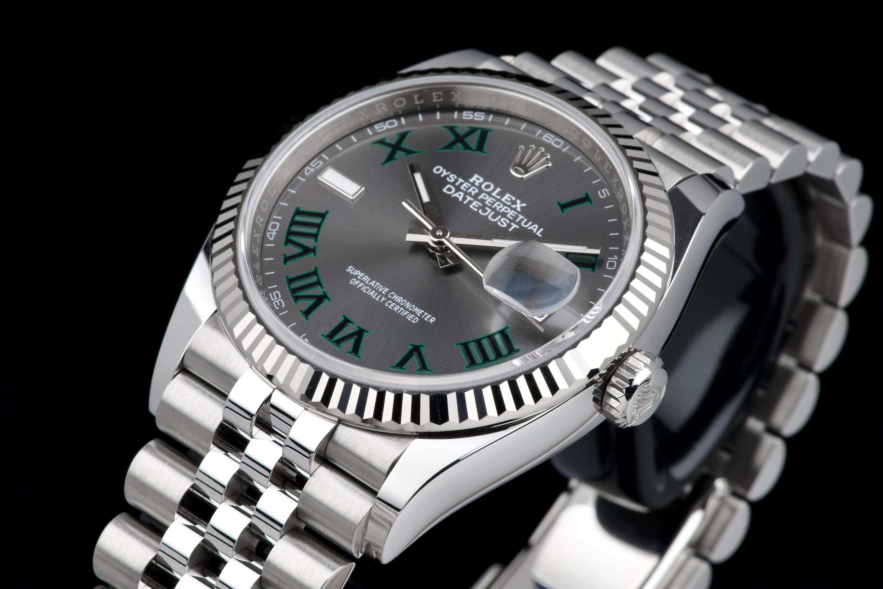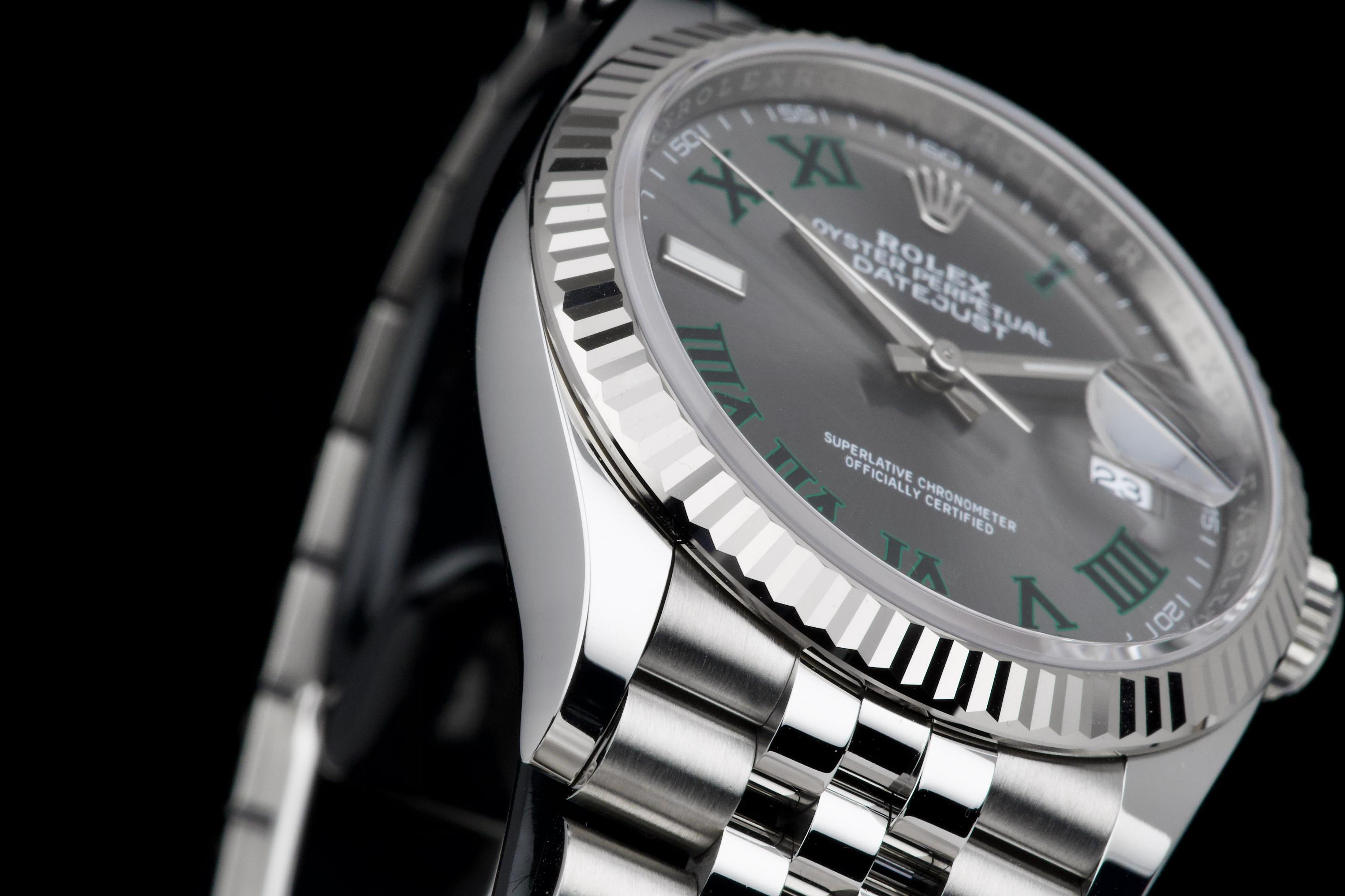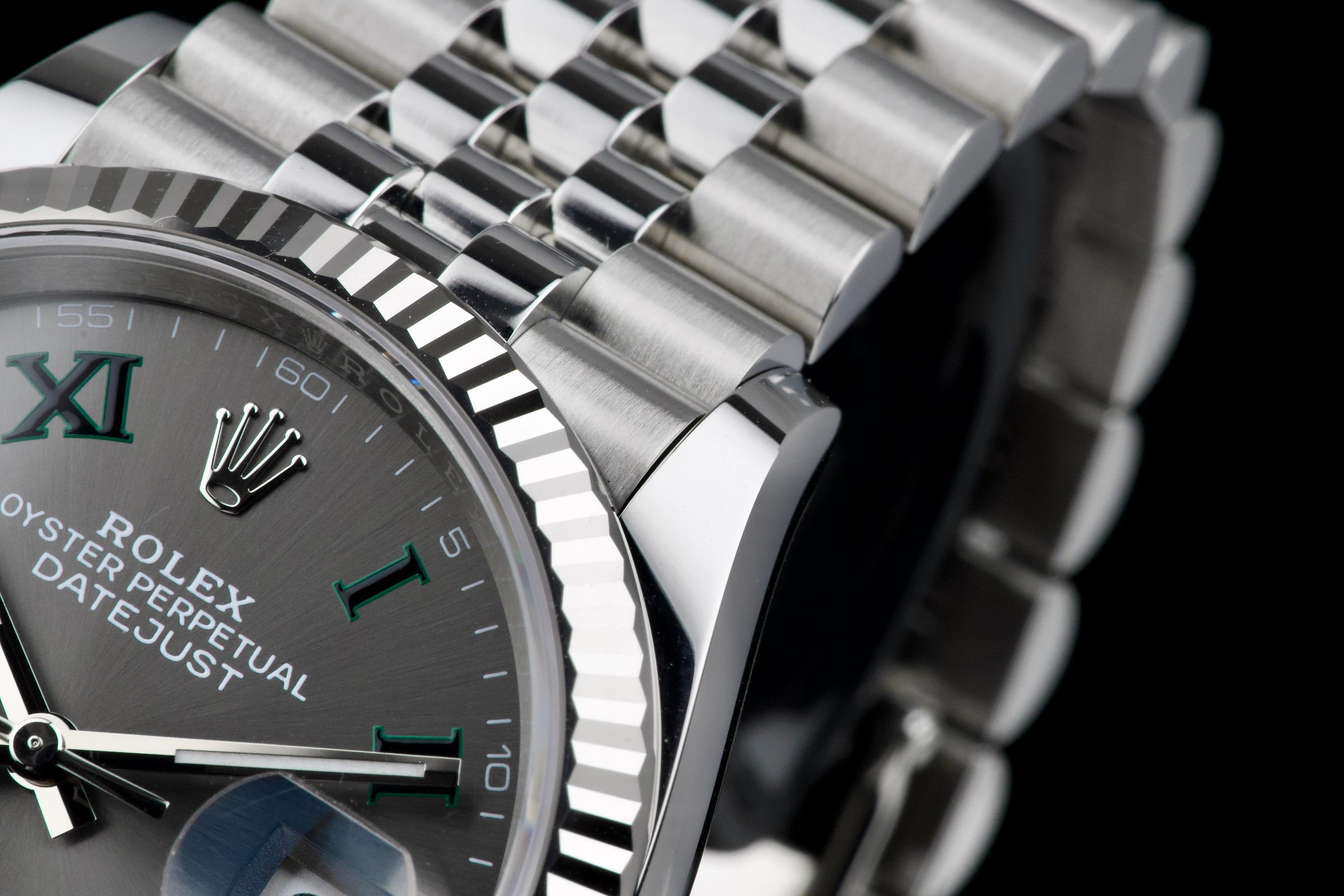 A stunning and mint example of the iconic Rolex Datejust 36 “Wimbledon,” featuring the distinctive slate grey dial with green Roman numerals — one of the most recognizable and sought-after configurations in the modern Datejust line. Crafted in stainless steel with an 18k white gold fluted bezel, and fitted on the Jubilee bracelet, this piece embodies timeless Rolex elegance. Powered by the automatic caliber 3235 with Chronergy escapement, 70-hour power reserve, and Superlative Chronometer precision. Complete with its original box, 2025 warranty card, booklets, and accessories. A perfect example of the modern Datejust 36 “Wimbledon,” combining sporty sophistication, luxury detailing, and flawless condition.