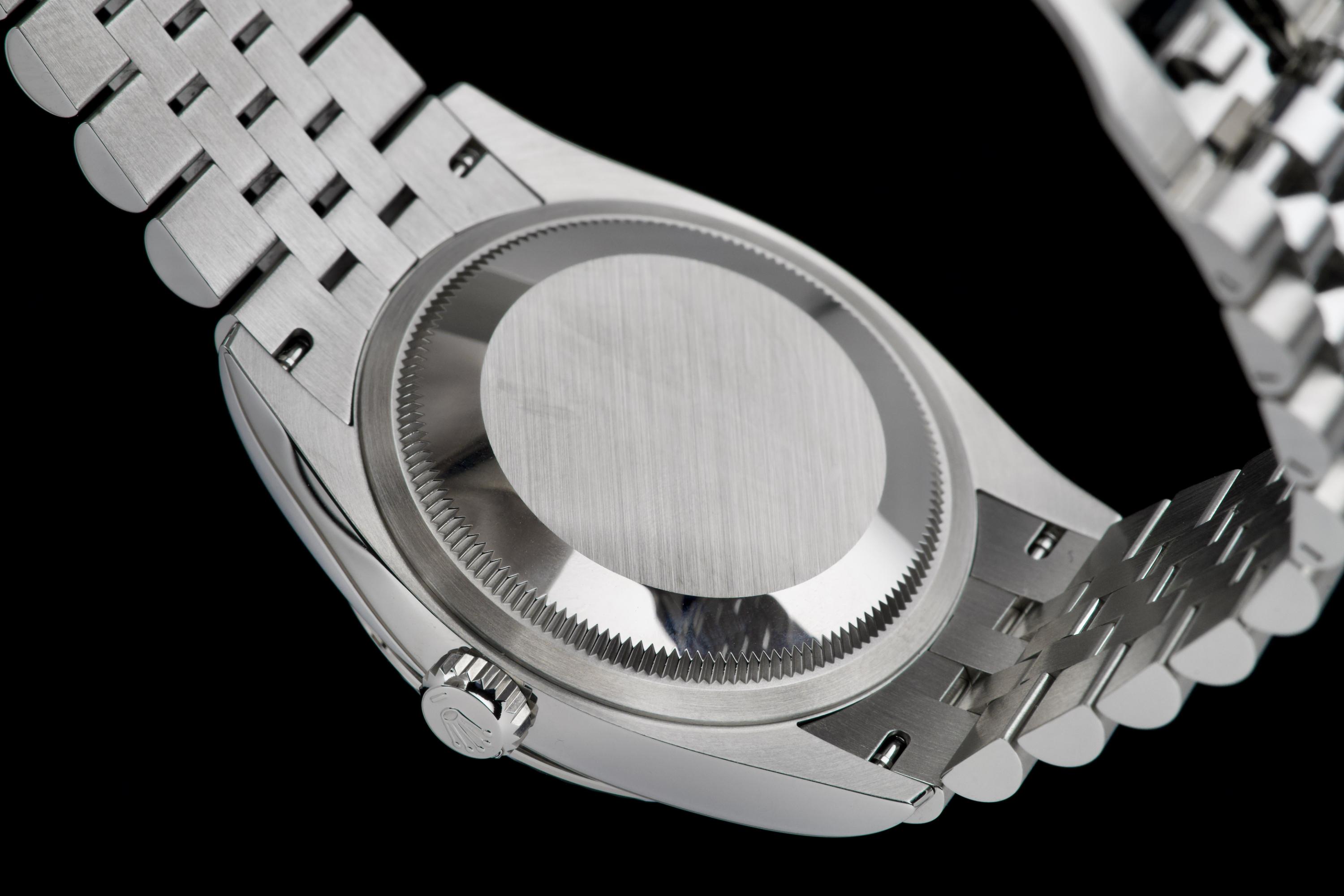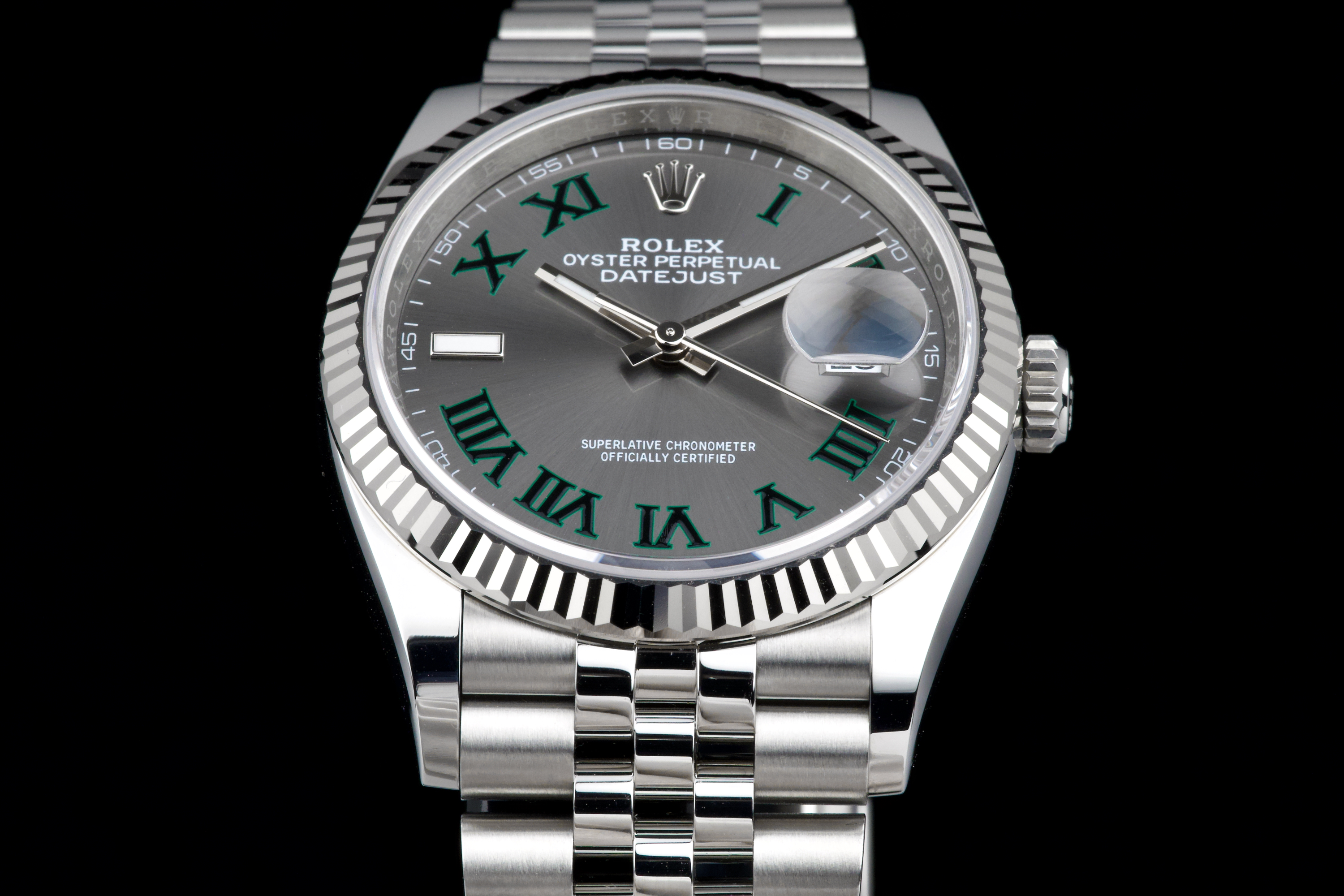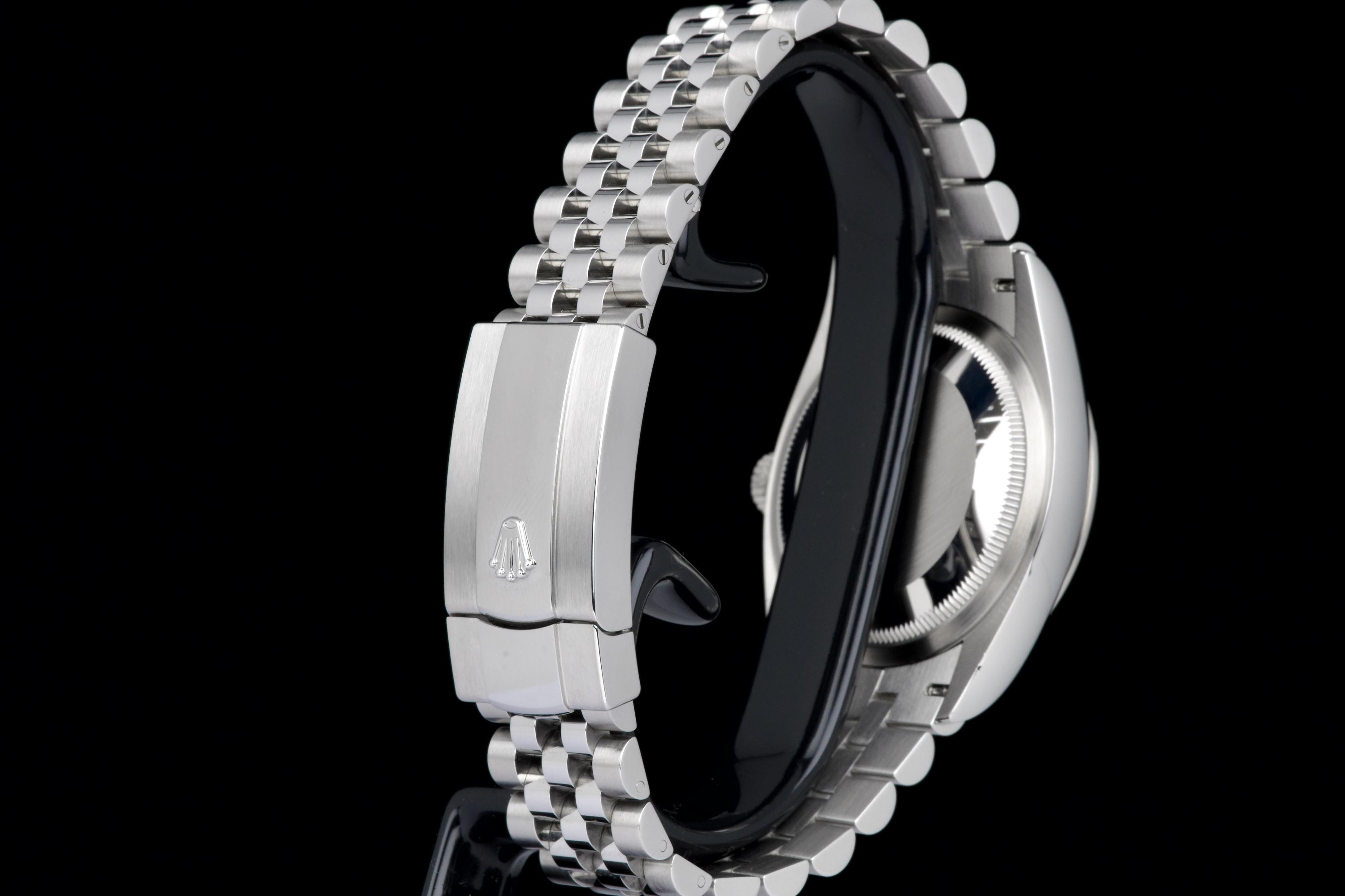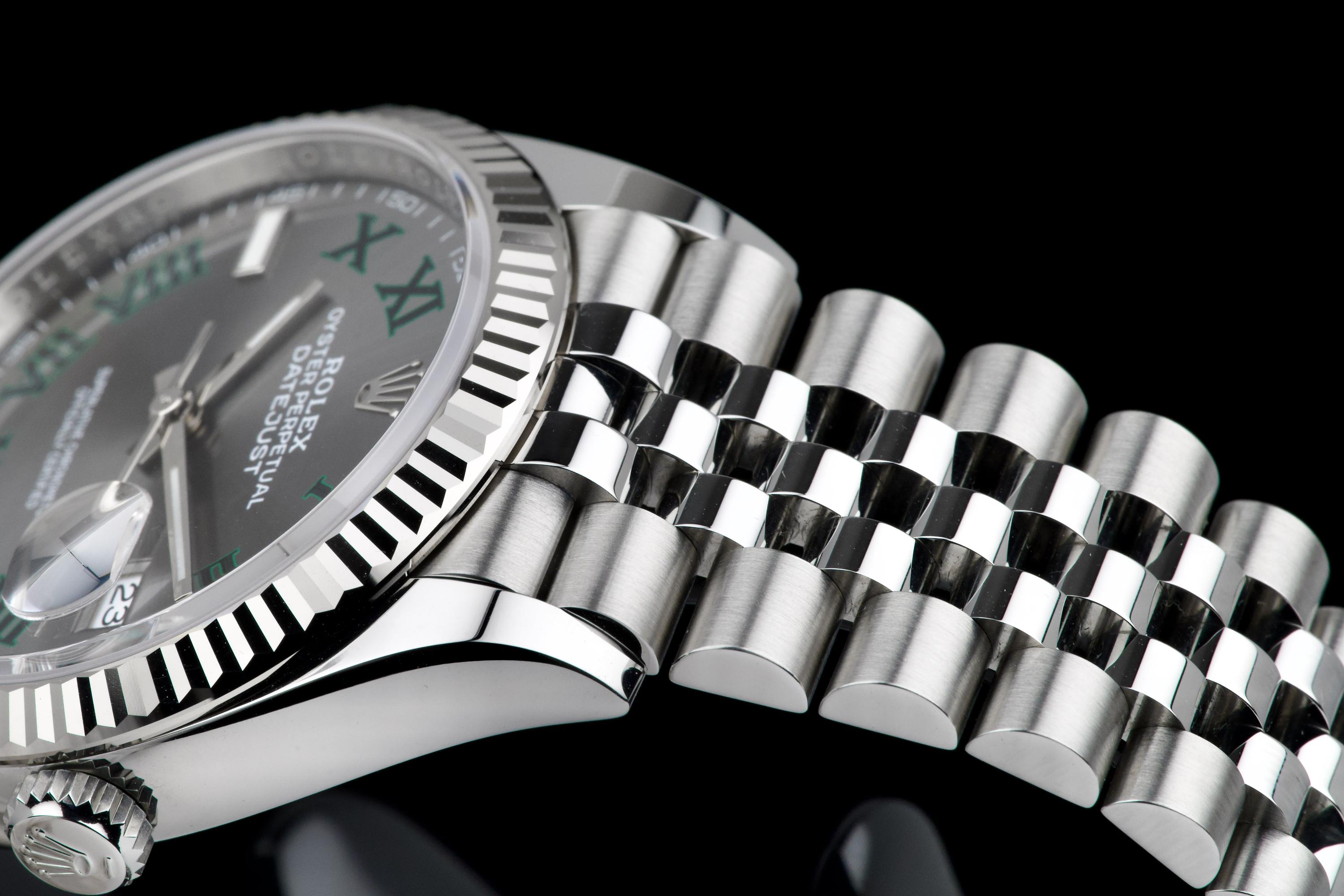 A stunning and mint example of the iconic Rolex Datejust 36 “Wimbledon,” featuring the distinctive slate grey dial with green Roman numerals — one of the most recognizable and sought-after configurations in the modern Datejust line. Crafted in stainless steel with an 18k white gold fluted bezel, and fitted on the Jubilee bracelet, this piece embodies timeless Rolex elegance. Powered by the automatic caliber 3235 with Chronergy escapement, 70-hour power reserve, and Superlative Chronometer precision. Complete with its original box, 2025 warranty card, booklets, and accessories. A perfect example of the modern Datejust 36 “Wimbledon,” combining sporty sophistication, luxury detailing, and flawless condition.