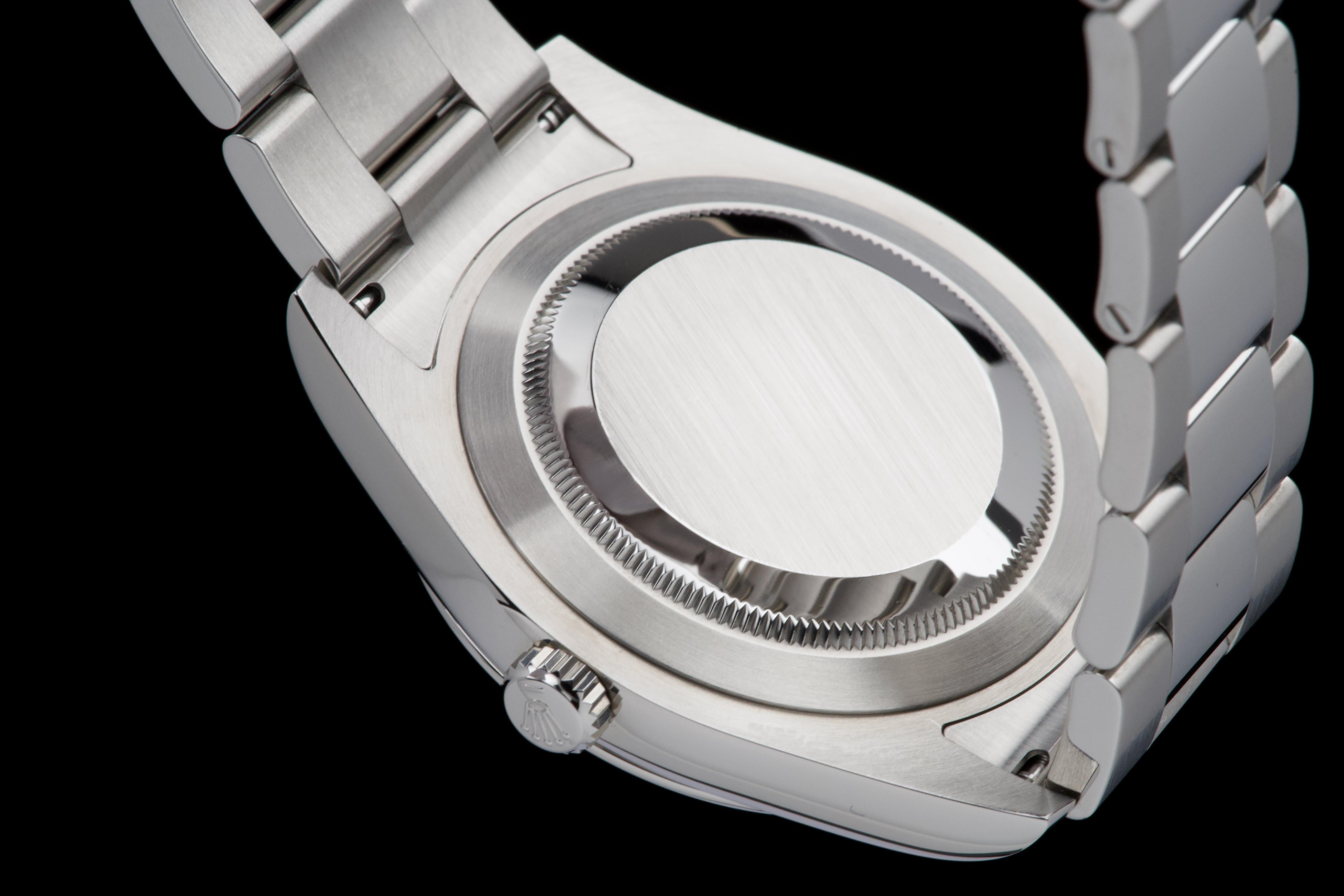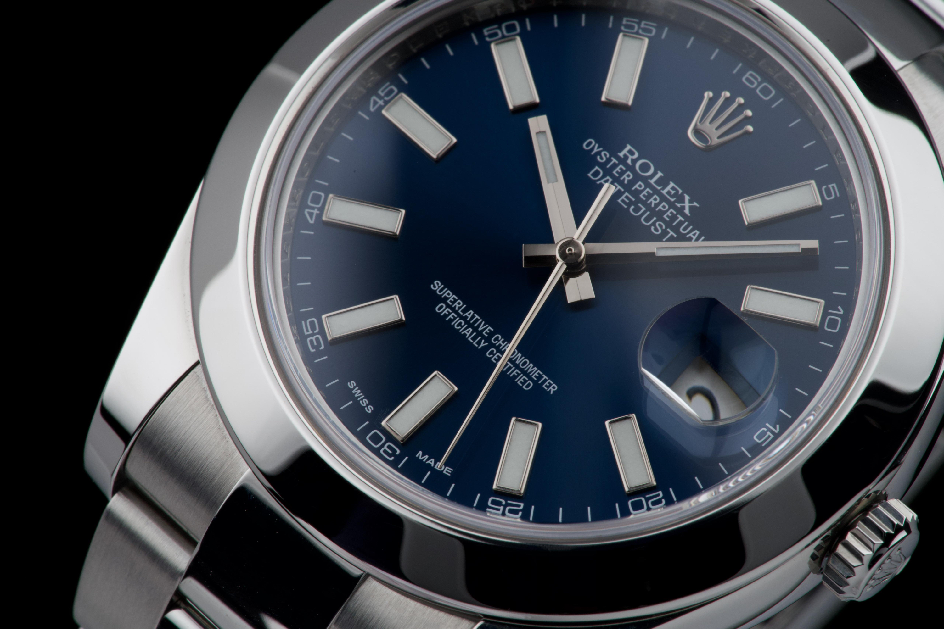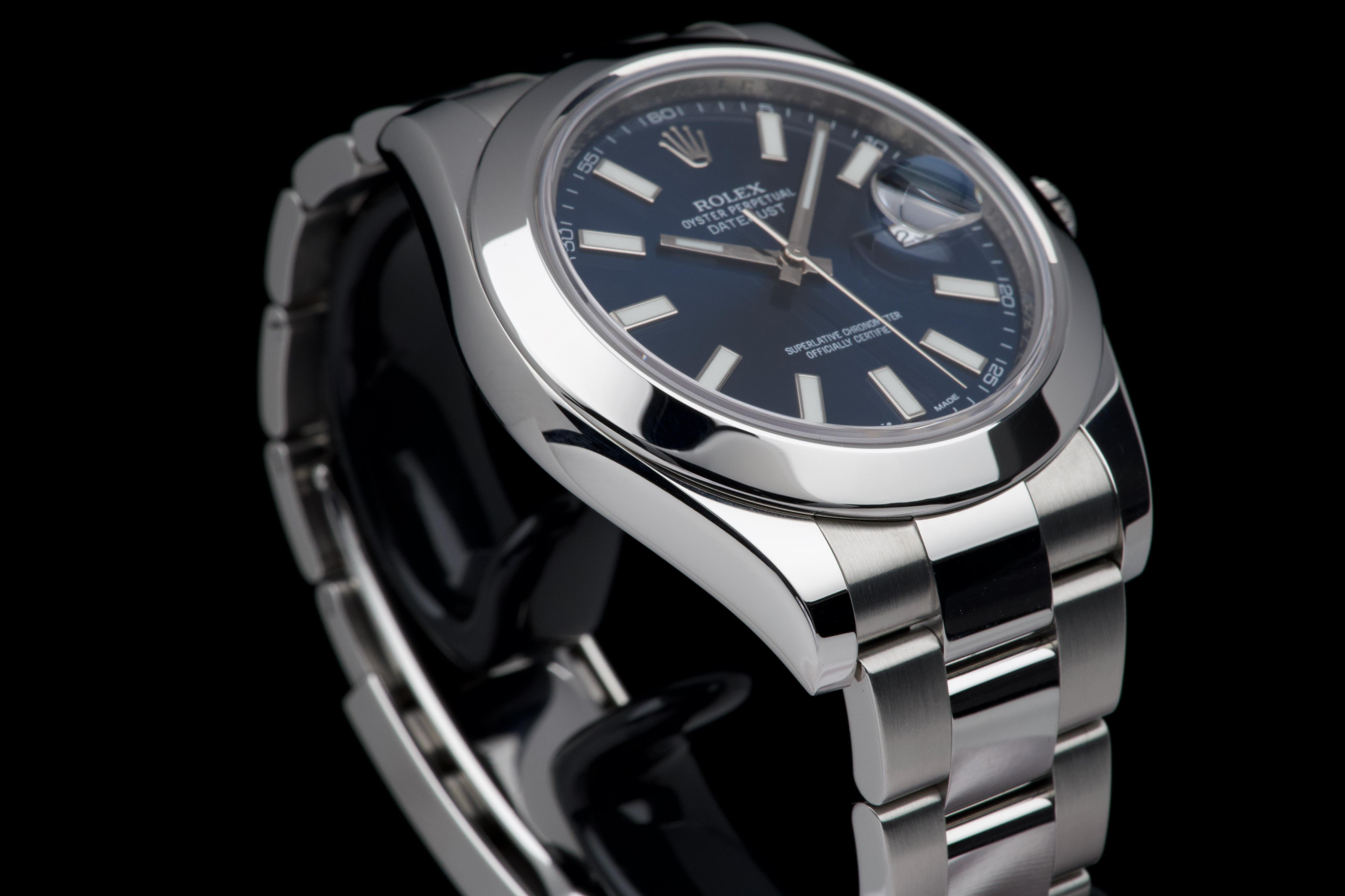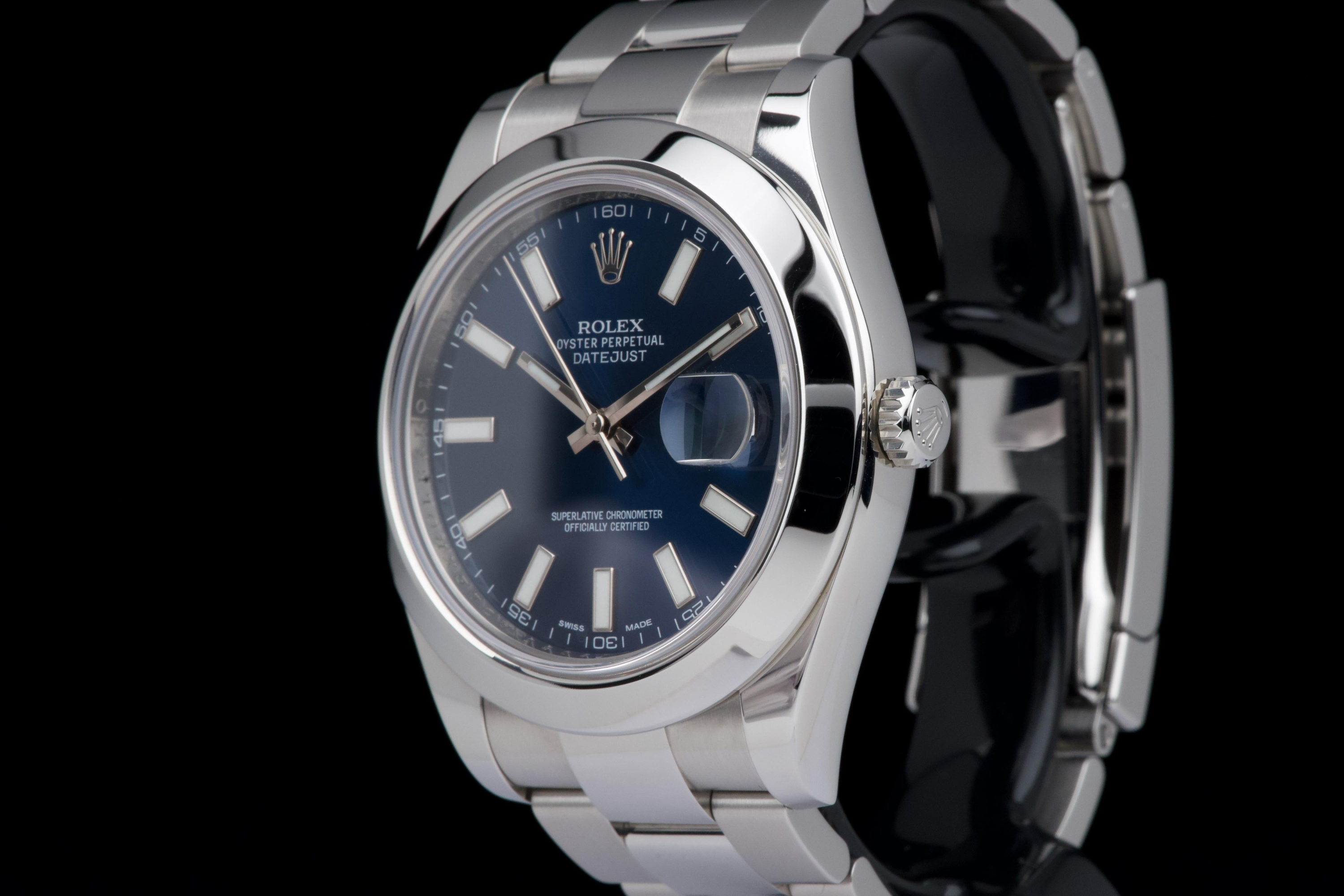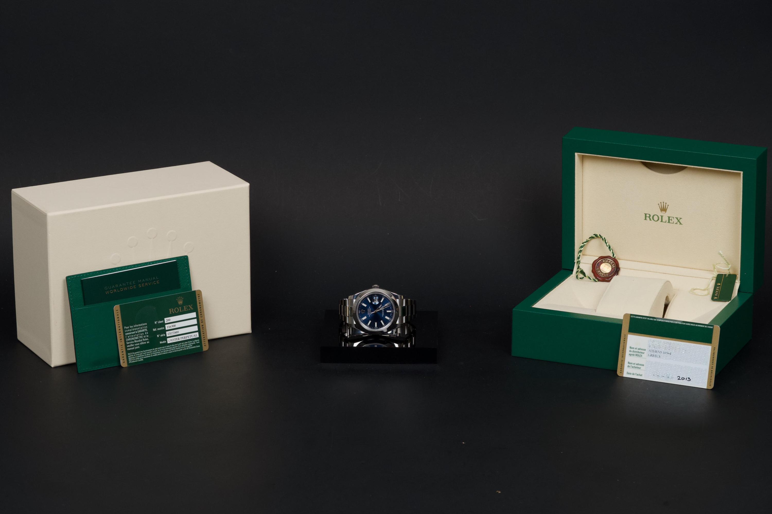 Rolex Datejust II, reference 116300, stainless steel wristwatch with blue dial, date and bracelet, full set, from. A refined example of Rolex’s modern classic, the present Datejust II reference 116300 is offered in excellent condition and accompanied by its complete set. Produced in 2013, this watch features a striking sunburst blue dial, whose rich tone subtly changes under different lighting conditions, lending the watch both depth and contemporary elegance. Housed in a robust 41 mm stainless steel Oyster case with smooth bezel, the watch is fitted with a sapphire crystal and the signature Cyclops magnifier over the date aperture at 3 o’clock. The dial is enhanced by applied baton hour markers and luminous hands, ensuring excellent legibility while maintaining the understated sophistication for which the Datejust line is celebrated. Powering the watch is a reliable automatic Rolex movement, renowned for its precision and durability. The watch is presented on its original stainless steel Oyster bracelet with Oysterclasp, combining comfort with the timeless sport-elegance that defines the model. According to the accompanying documentation, the watch was originally sold new in Athens and has remained in the hands of a single owner since its initial purchase. Recently serviced and carefully polished by our watchmaker, the timepiece is offered in excellent mechanical and aesthetic condition. Delivered as a full set with its original box, warranty card and accessories, this Datejust II represents an excellent opportunity to acquire a well-preserved example of a highly versatile modern Rolex reference.