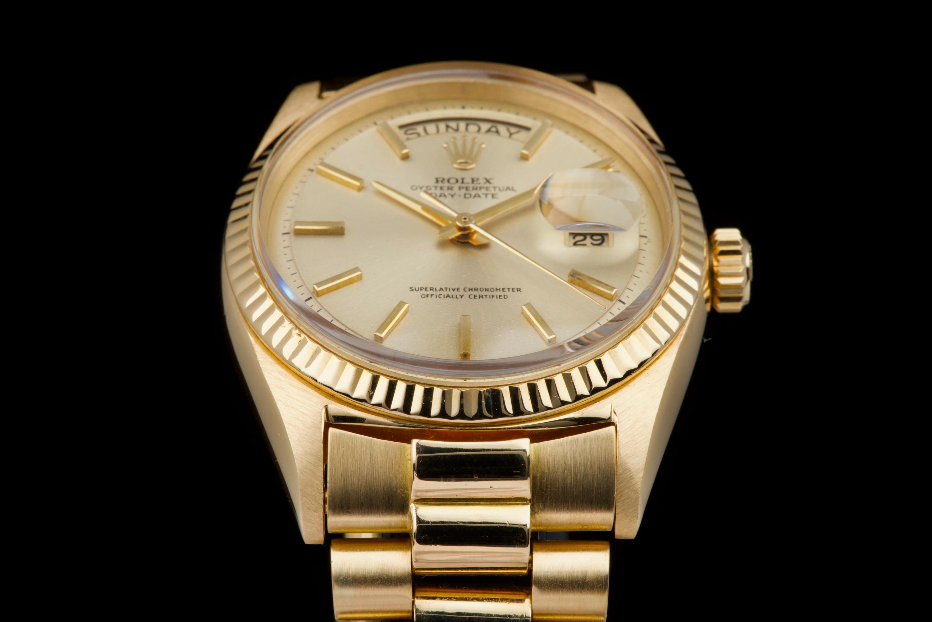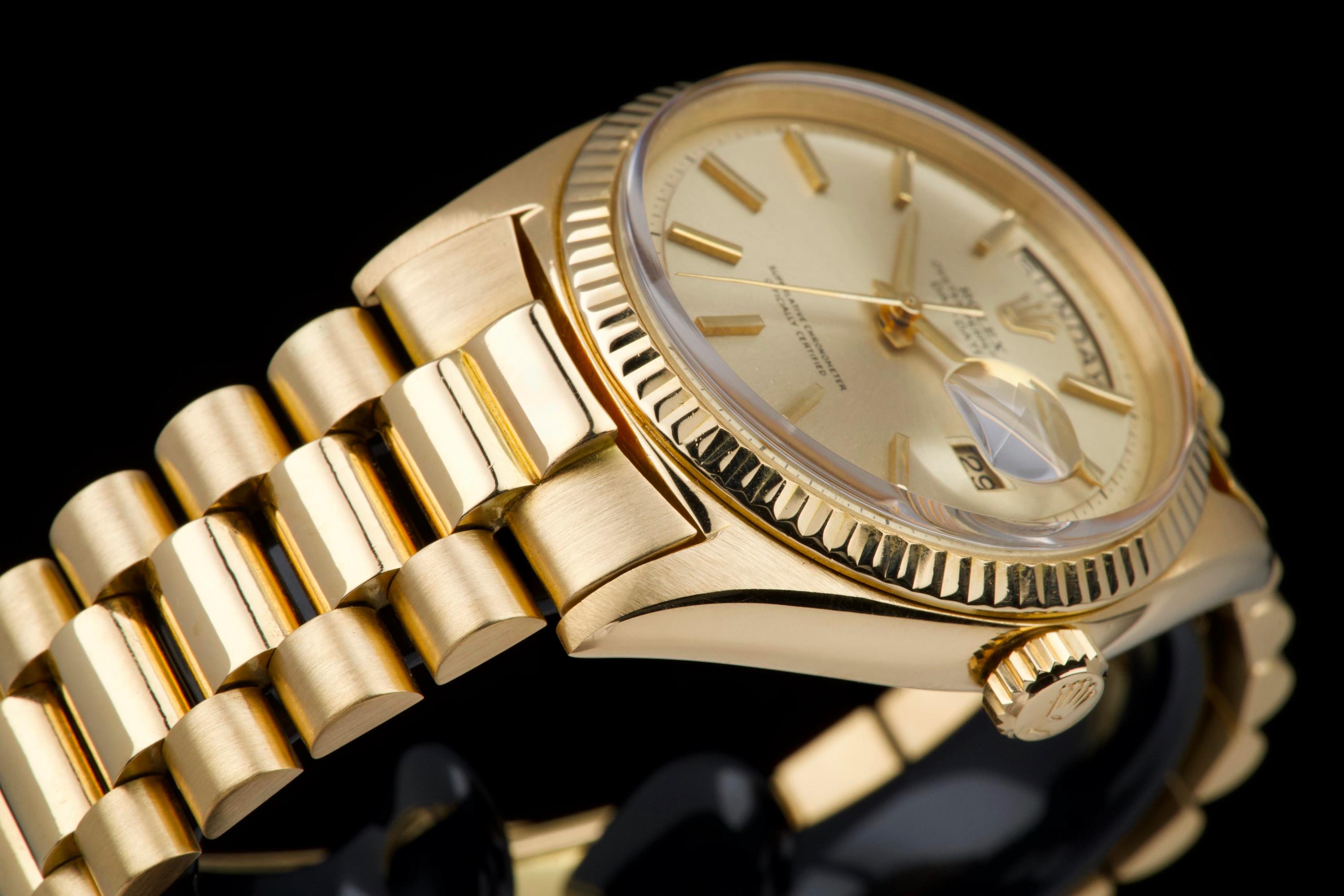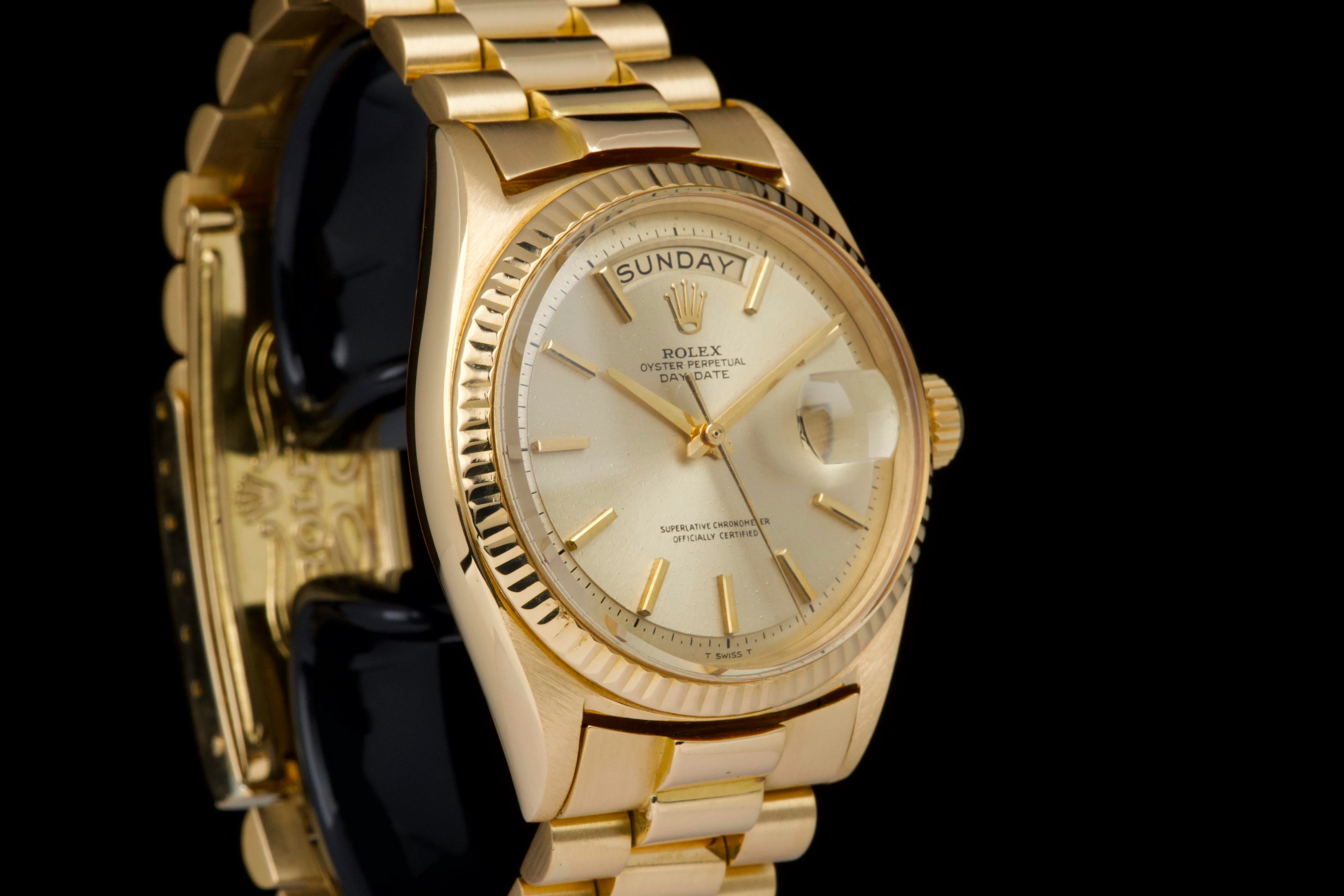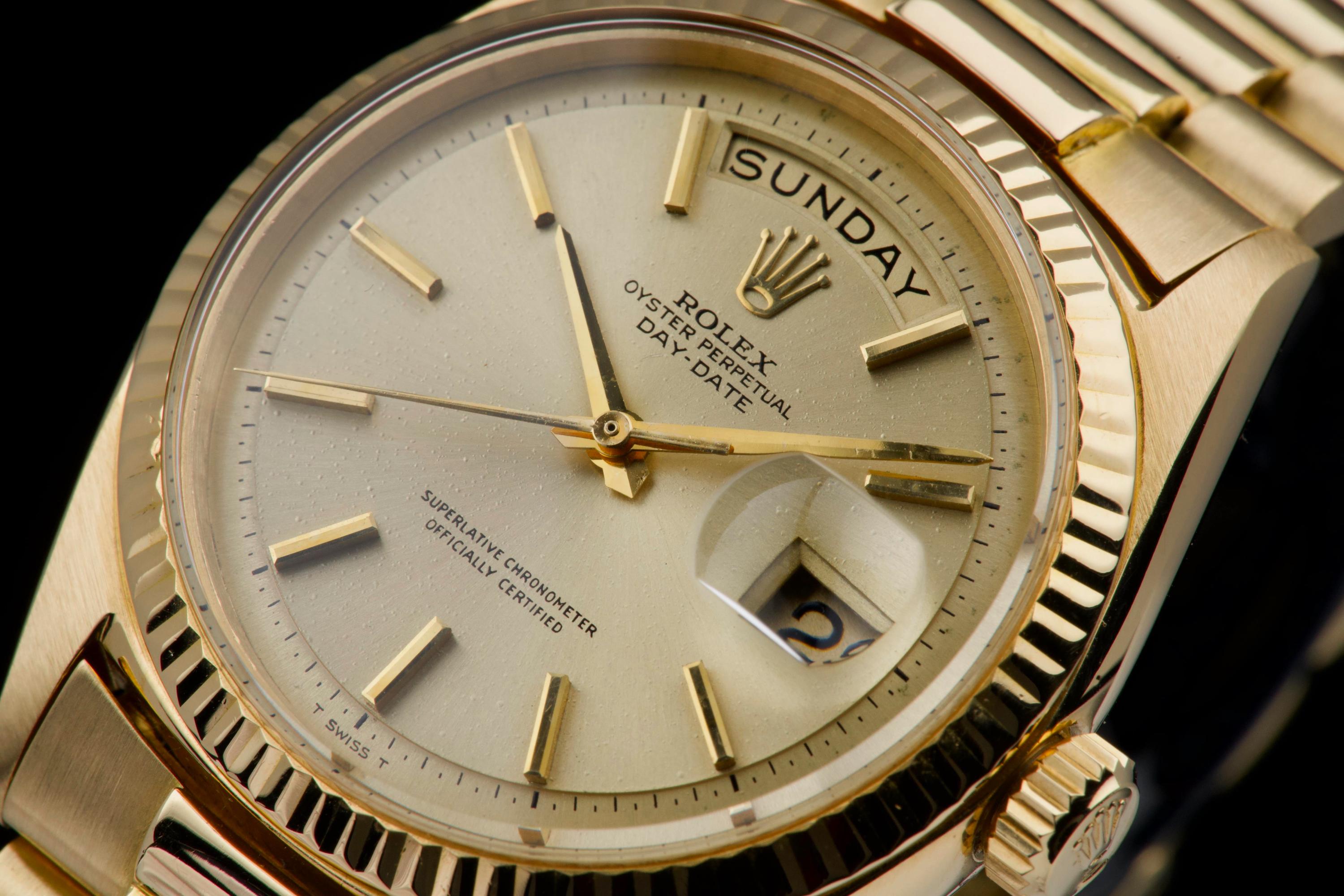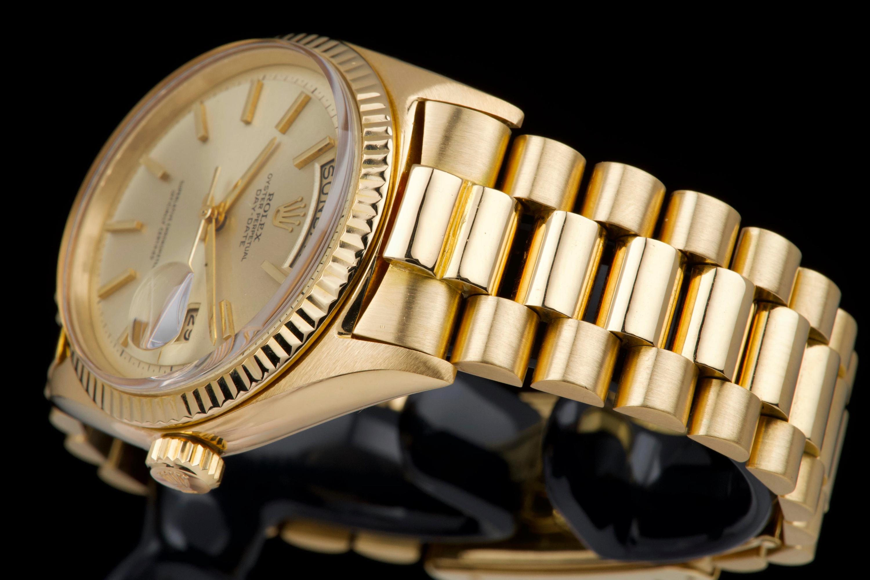A beautiful vintage Rolex Day-Date reference 1803 in 18k yellow gold, dating to 1964 (serial 1077XXX). This classic 36 mm “President” features an attractive champagne no-lume dial, a configuration appreciated by collectors for its clean and elegant appearance. The dial is in excellent condition, showing a very subtle speckled patina across the surface, consistent with its age. As expected for a no-lume configuration, the dial does not feature luminous plots, giving it a very pure aesthetic. It is fitted with applied yellow gold baton hour markers and matching sword hands, both in excellent condition and showing only light wear. The classic day aperture at 12 o’clock and date window at 3 o’clock with Cyclops magnification complete the iconic Day-Date layout. The 18k yellow gold case has been recently polished and remains in excellent condition, showing only light wear. The fluted bezel is sharp and well defined. The watch is fitted with its original 18k yellow gold President bracelet, composed of 19 links, showing light to moderate stretch consistent with age and fitting wrists up to approximately 7.5 inches. A timeless example of the early Rolex Day-Date, combining the iconic President design with the rare and elegant no-lume champagne dial configuration.