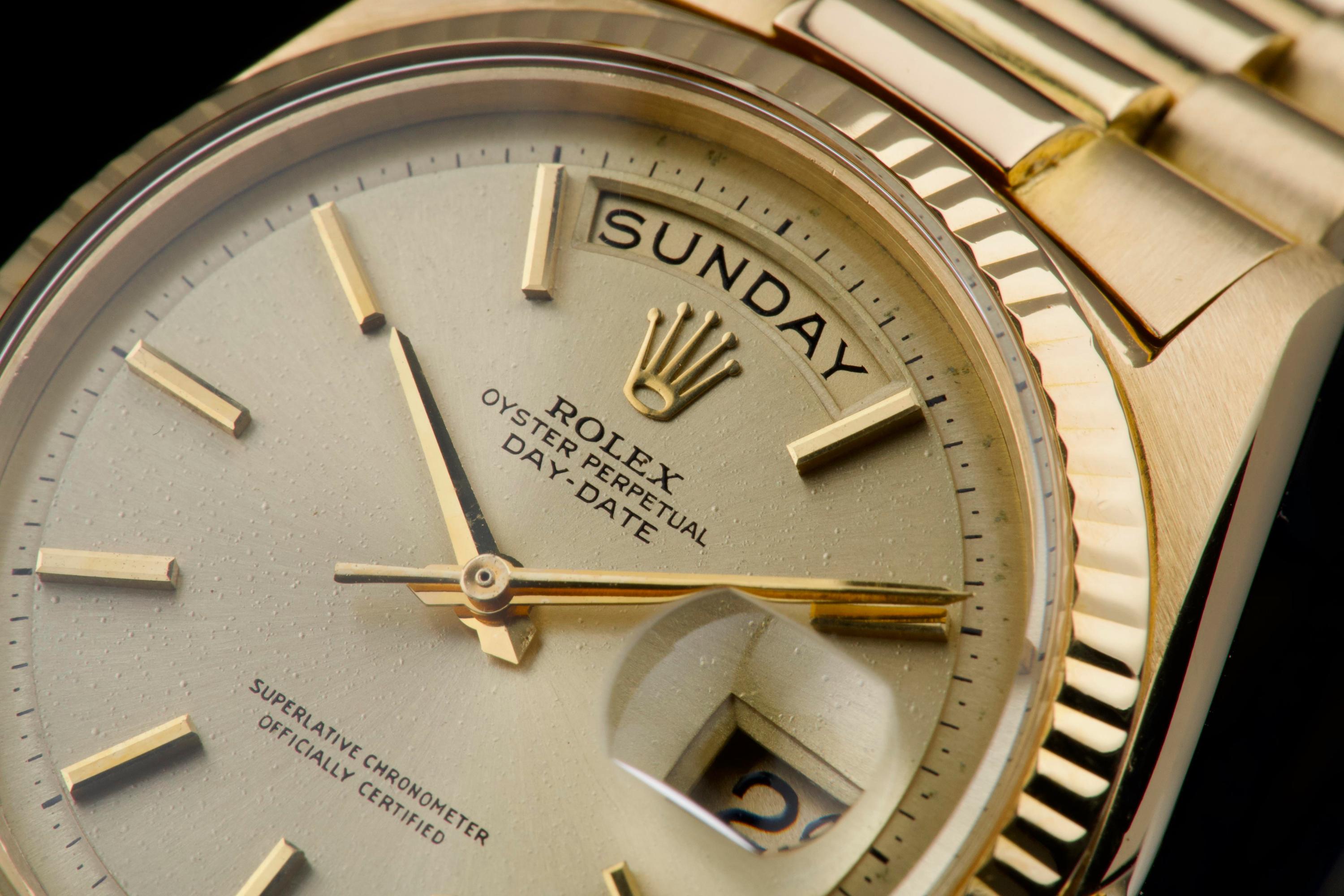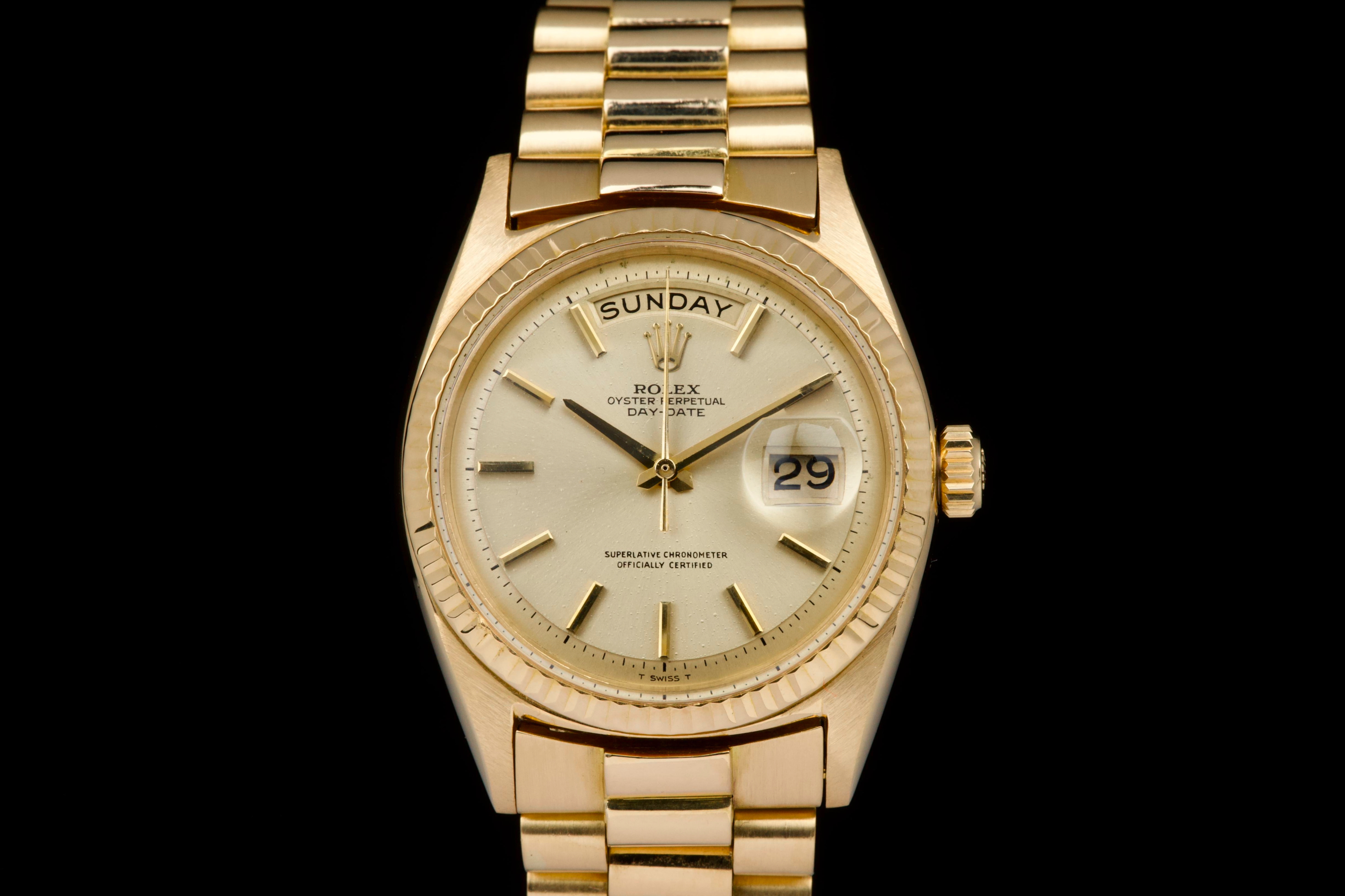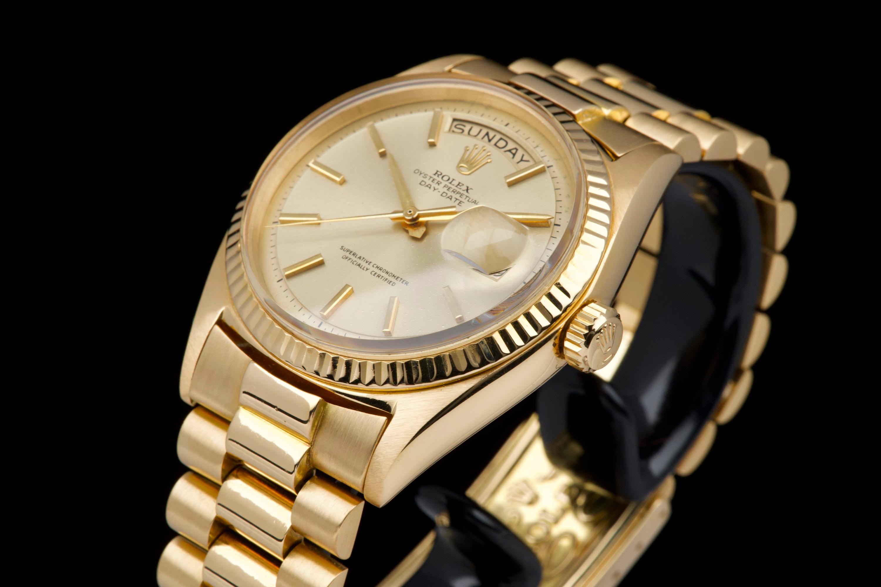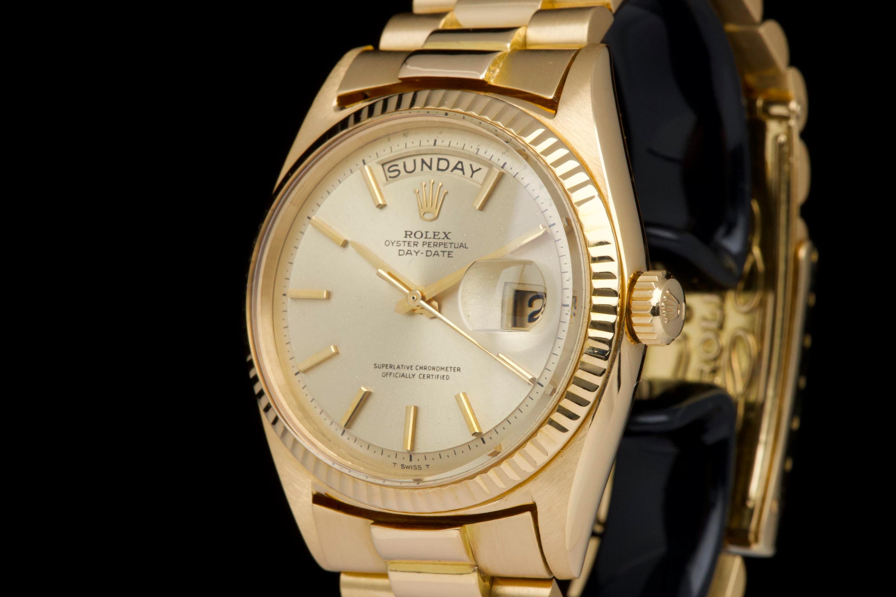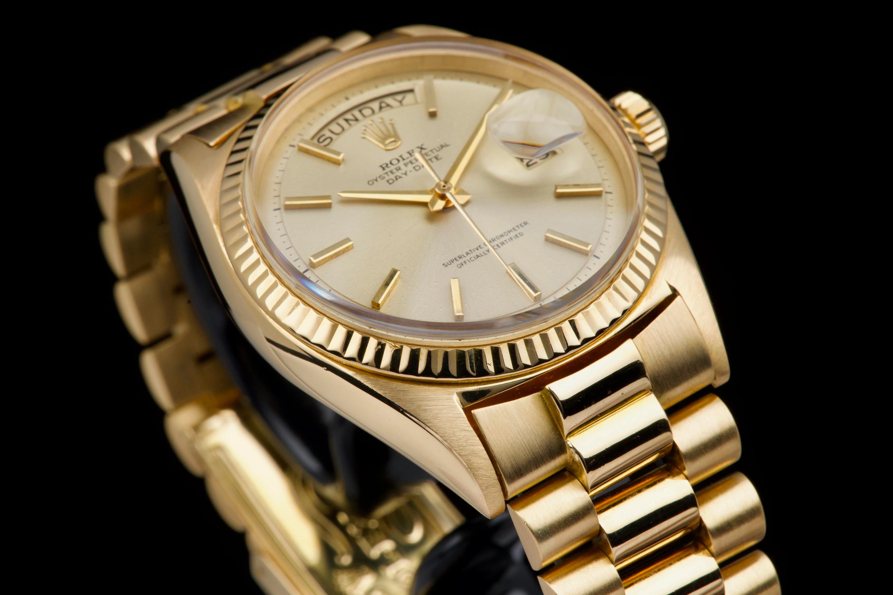A beautiful vintage Rolex Day-Date reference 1803 in 18k yellow gold, dating to 1964 (serial 1077XXX). This classic 36 mm “President” features an attractive champagne no-lume dial, a configuration appreciated by collectors for its clean and elegant appearance. The dial is in excellent condition, showing a very subtle speckled patina across the surface, consistent with its age. As expected for a no-lume configuration, the dial does not feature luminous plots, giving it a very pure aesthetic. It is fitted with applied yellow gold baton hour markers and matching sword hands, both in excellent condition and showing only light wear. The classic day aperture at 12 o’clock and date window at 3 o’clock with Cyclops magnification complete the iconic Day-Date layout. The 18k yellow gold case has been recently polished and remains in excellent condition, showing only light wear. The fluted bezel is sharp and well defined. The watch is fitted with its original 18k yellow gold President bracelet, composed of 19 links, showing light to moderate stretch consistent with age and fitting wrists up to approximately 7.5 inches. A timeless example of the early Rolex Day-Date, combining the iconic President design with the rare and elegant no-lume champagne dial configuration.