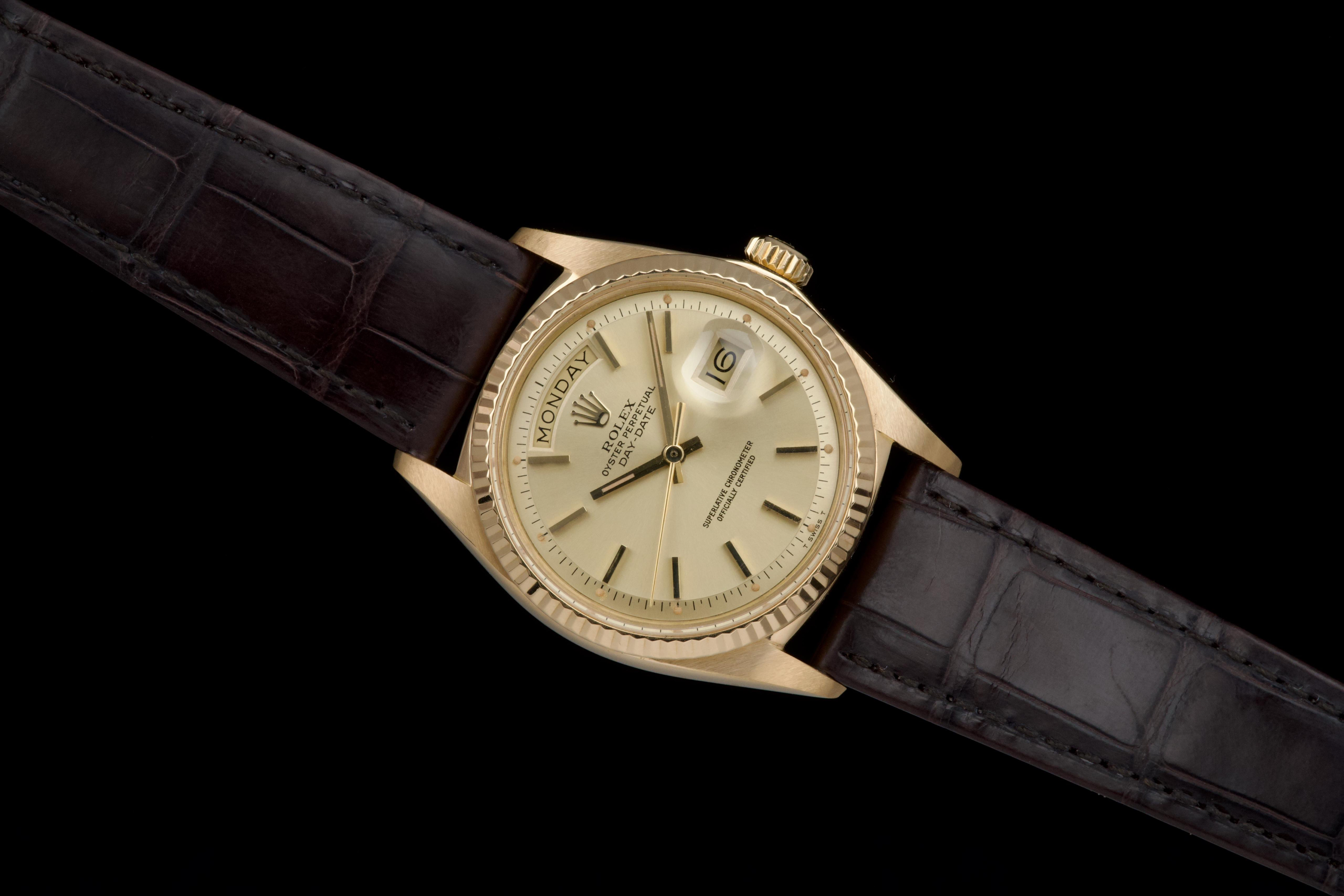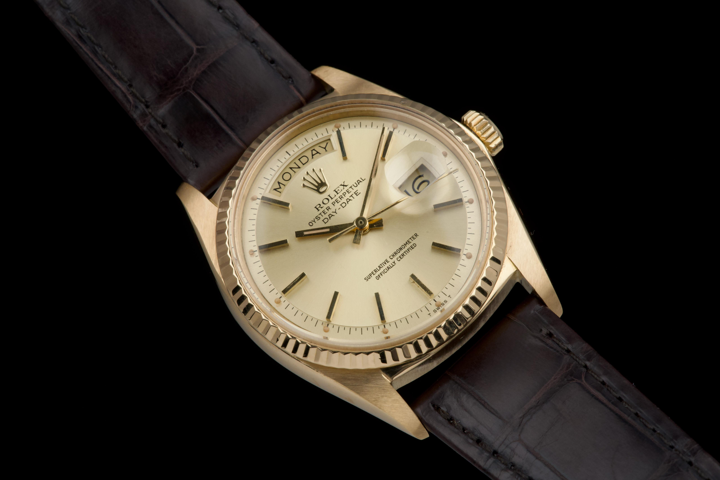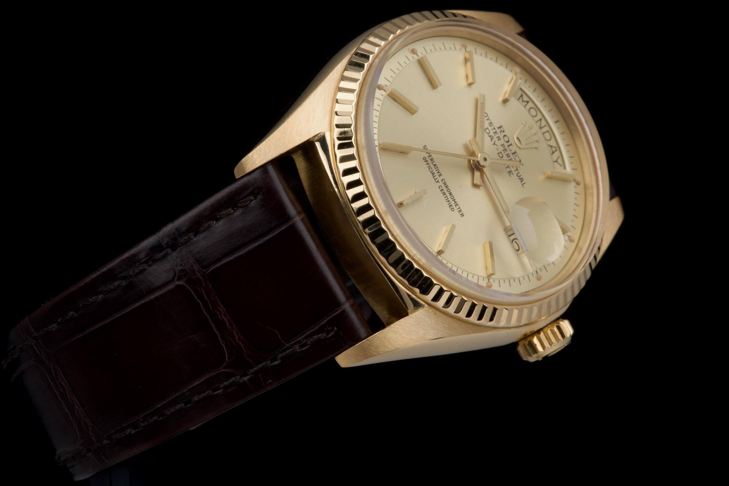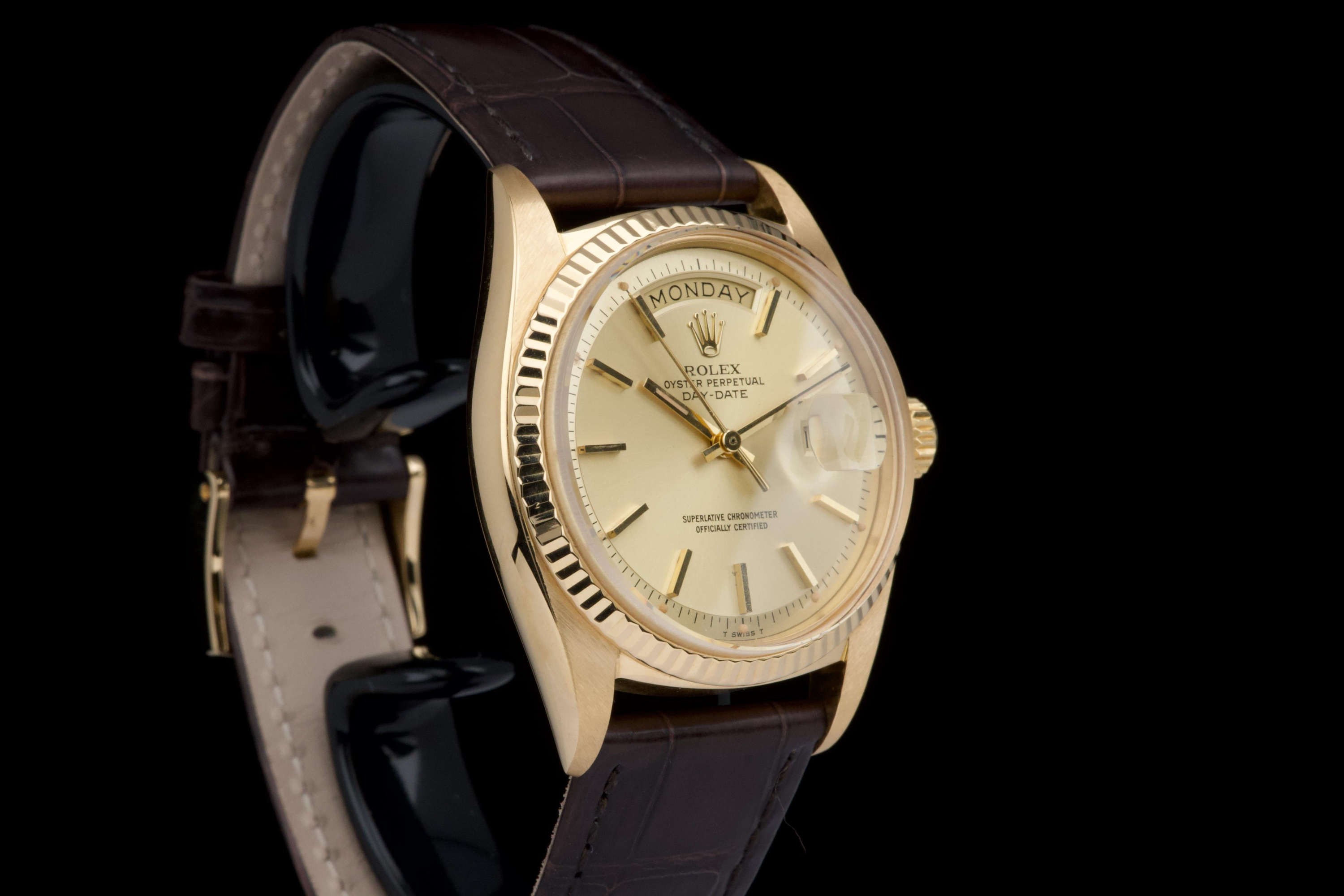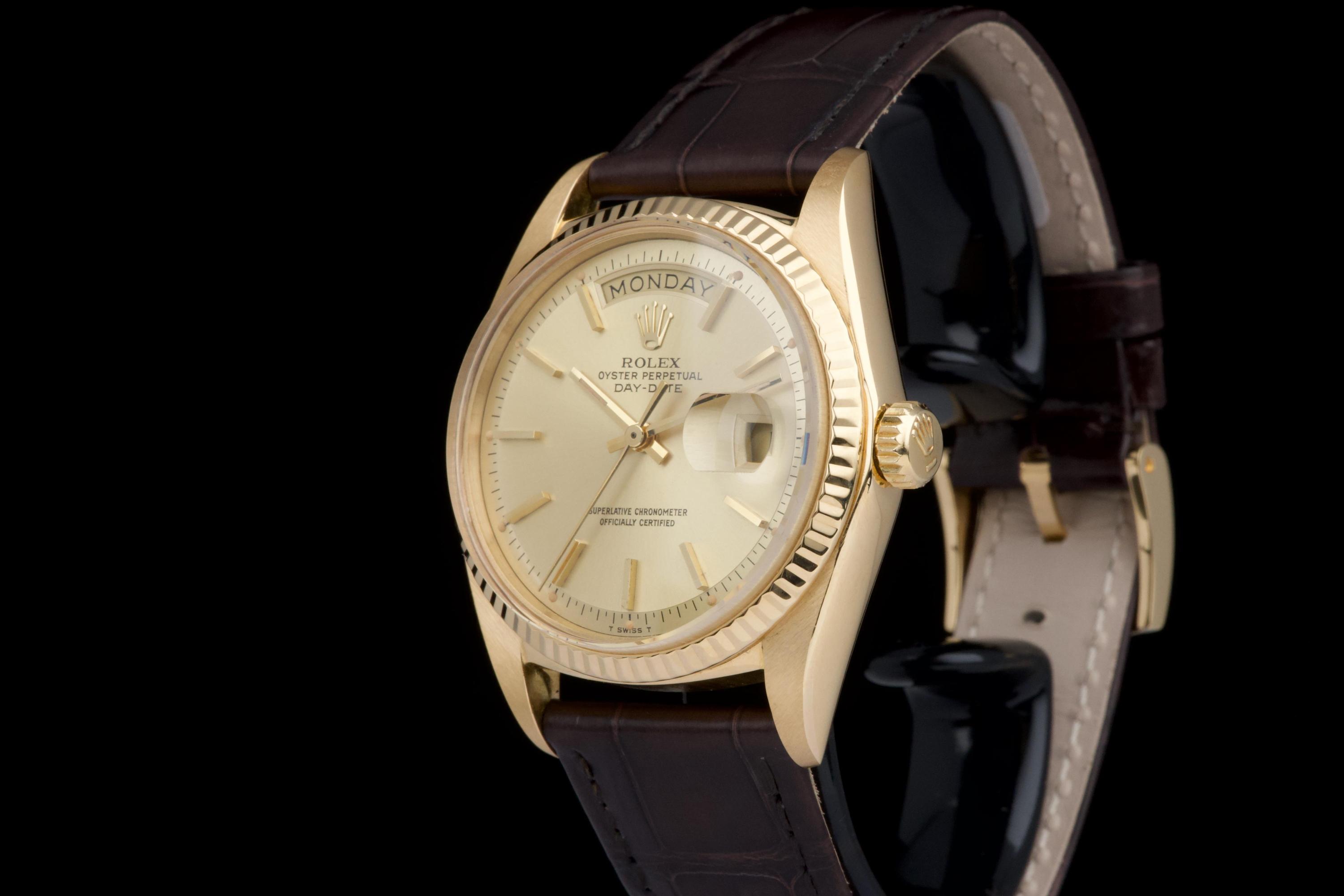 A classic Rolex Day-Date reference 1803/8 in 18k yellow gold, dating to 1970 (serial 2956XXX), presented on a brown crocodile leather strap. The case is in excellent condition, remaining sharp with well-defined edges, and the fluted bezel is equally well preserved, enhancing the overall presence of the watch. The champagne dial is in very good condition overall, with a light and honest vintage character. Some of the tritium plots show minor flaking, with the lume at 10 o’clock missing, which is not uncommon for a watch of this age. The hands are in excellent condition and fully matching, maintaining a cohesive look. The watch has benefited from a recent intervention at Rolex Geneva in 2026, including the replacement of the strap, 18k yellow gold buckle, and spring bars. The proper functioning of the movement was checked during this service. A clean and well-preserved example of the iconic Day-Date, combining sharp case proportions, a pleasing dial, and the timeless elegance of yellow gold.