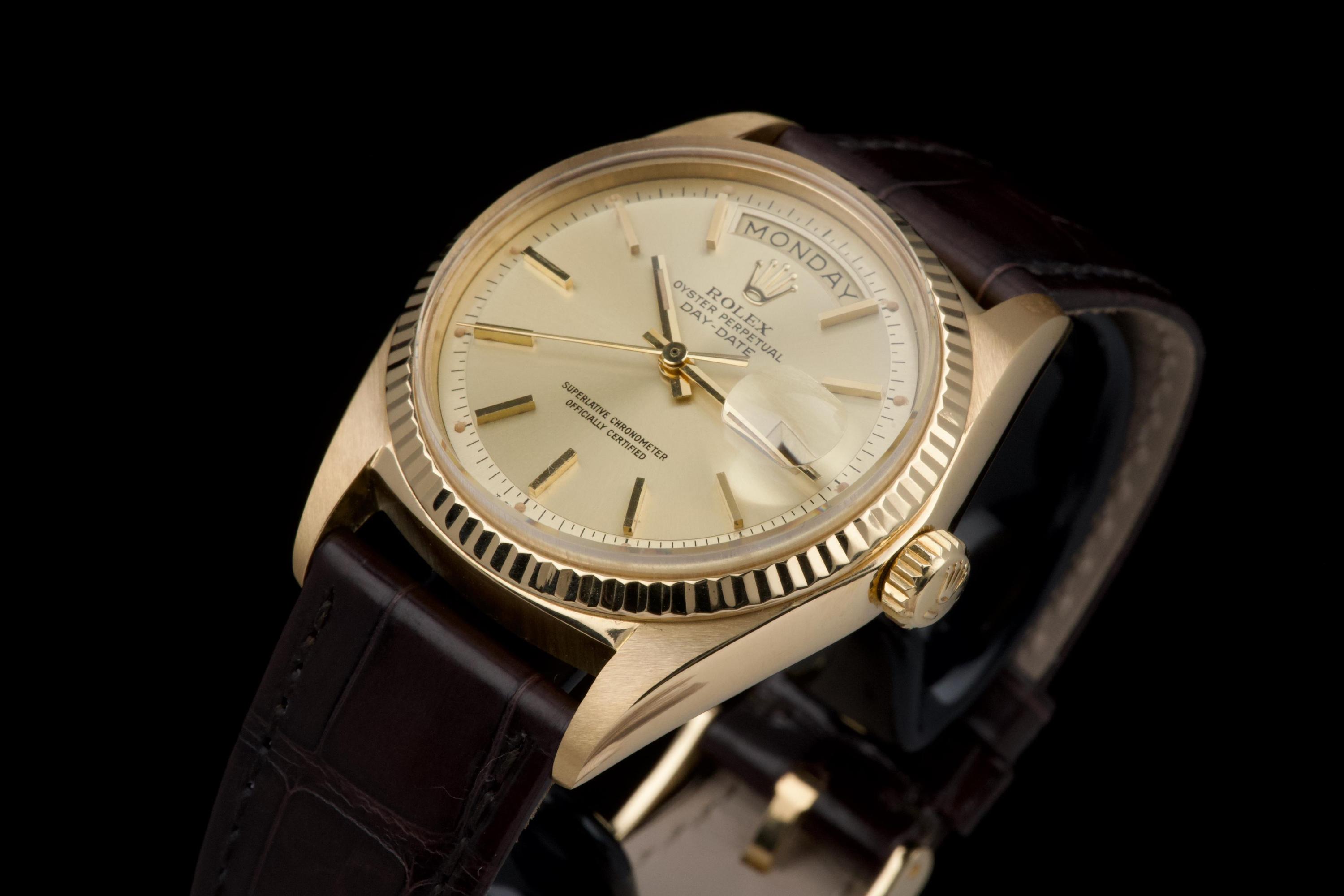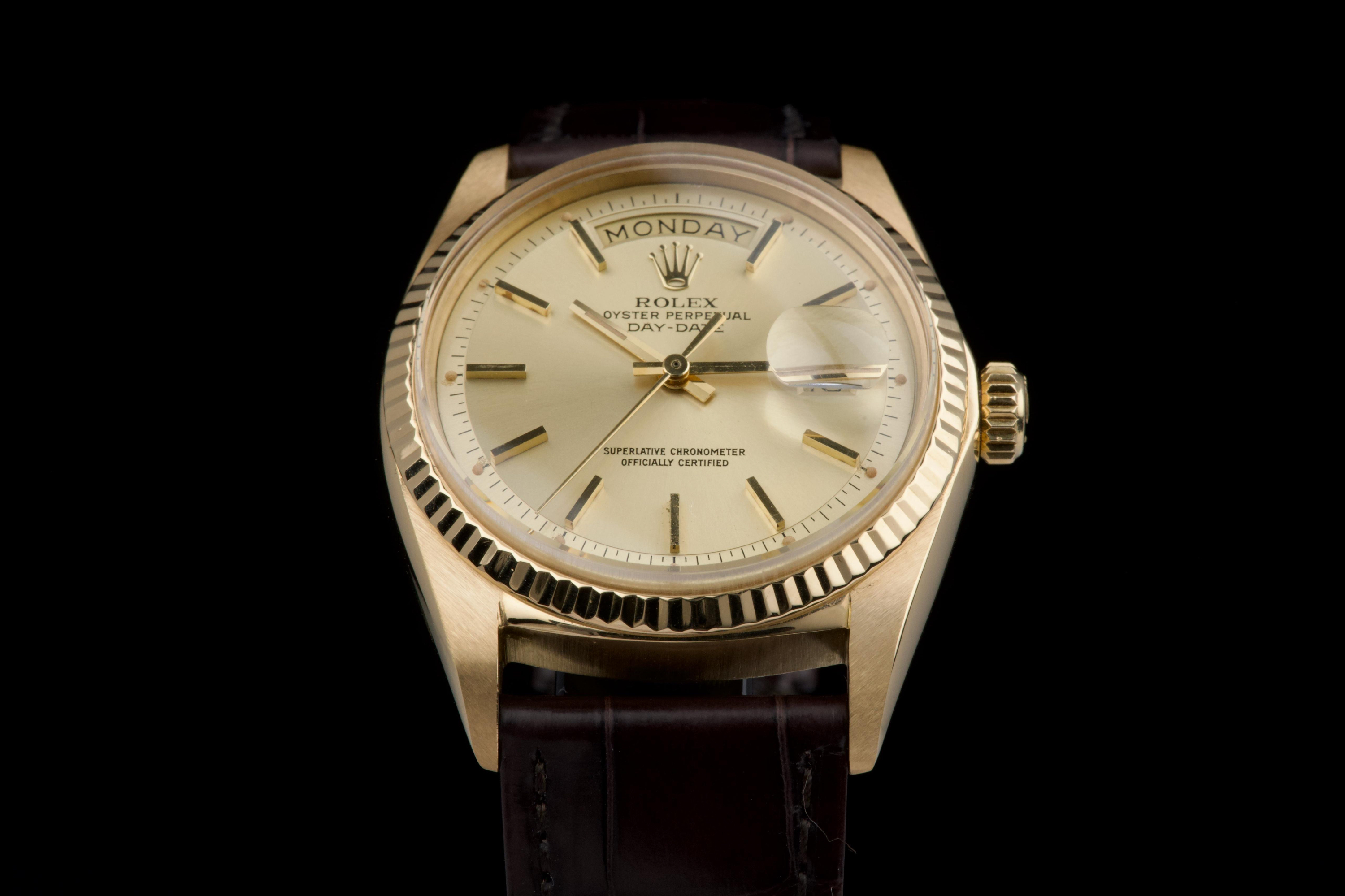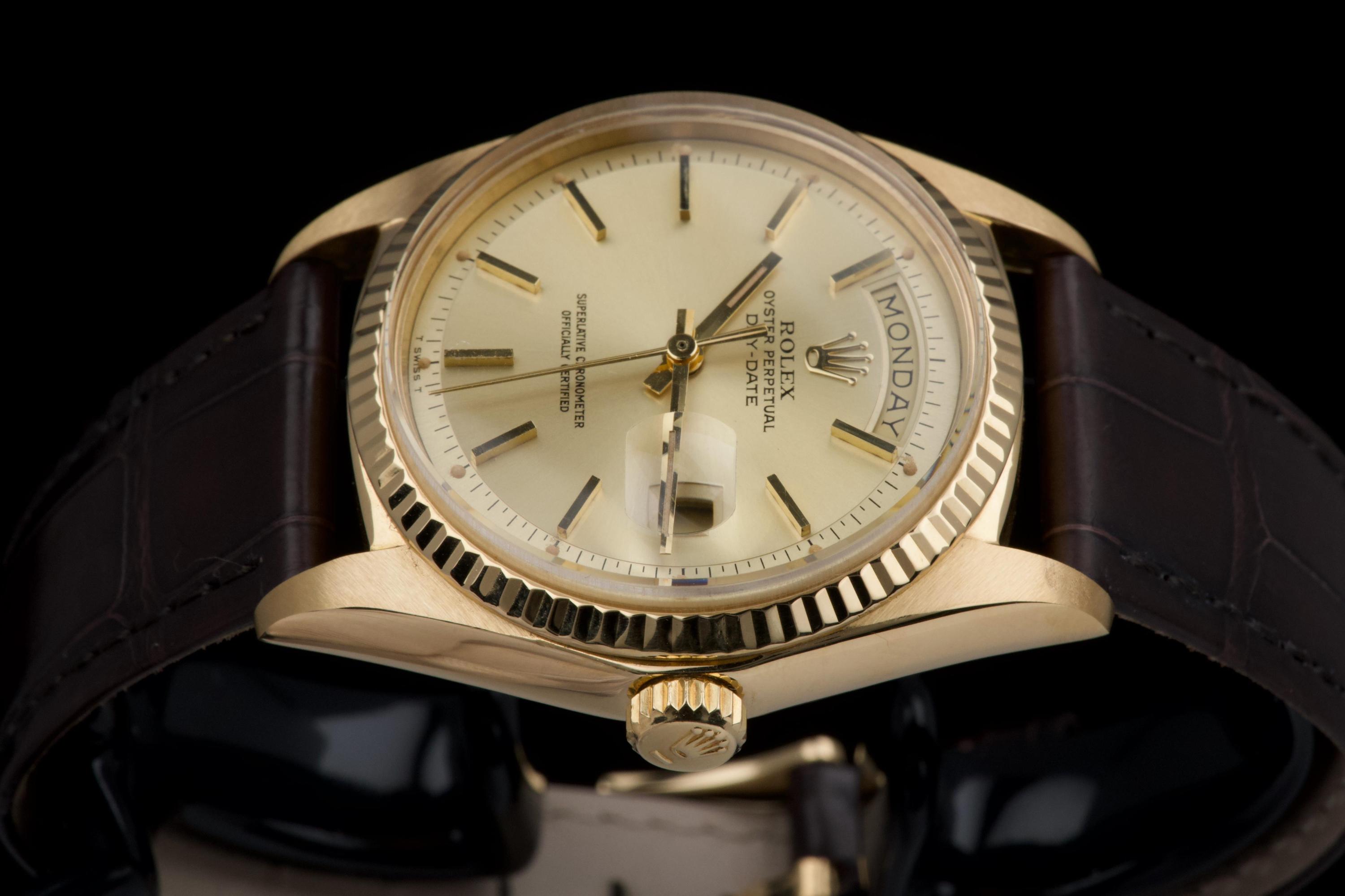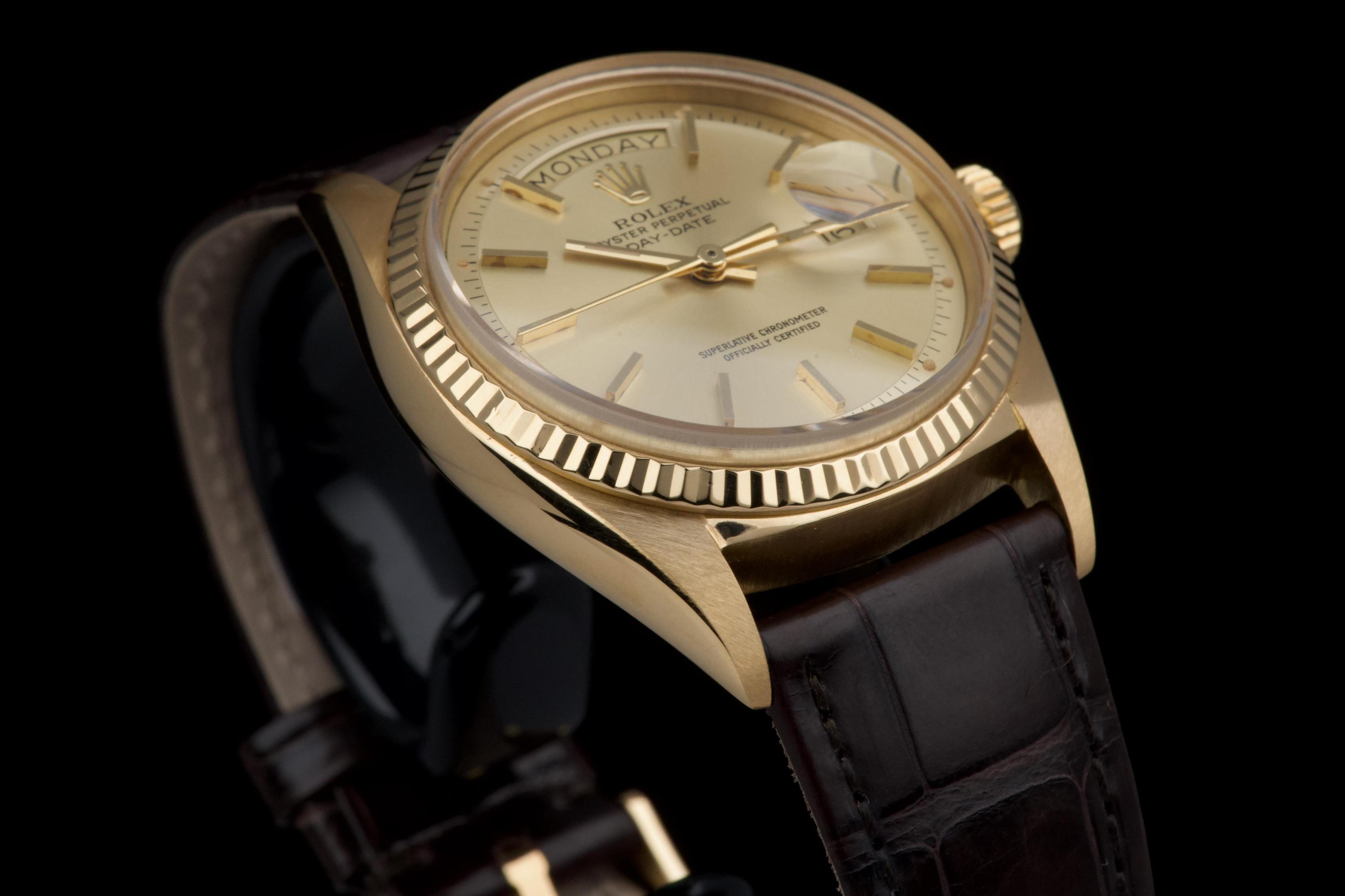 A classic Rolex Day-Date reference 1803/8 in 18k yellow gold, dating to 1970 (serial 2956XXX), presented on a brown crocodile leather strap. The case is in excellent condition, remaining sharp with well-defined edges, and the fluted bezel is equally well preserved, enhancing the overall presence of the watch. The champagne dial is in very good condition overall, with a light and honest vintage character. Some of the tritium plots show minor flaking, with the lume at 10 o’clock missing, which is not uncommon for a watch of this age. The hands are in excellent condition and fully matching, maintaining a cohesive look. The watch has benefited from a recent intervention at Rolex Geneva in 2026, including the replacement of the strap, 18k yellow gold buckle, and spring bars. The proper functioning of the movement was checked during this service. A clean and well-preserved example of the iconic Day-Date, combining sharp case proportions, a pleasing dial, and the timeless elegance of yellow gold.