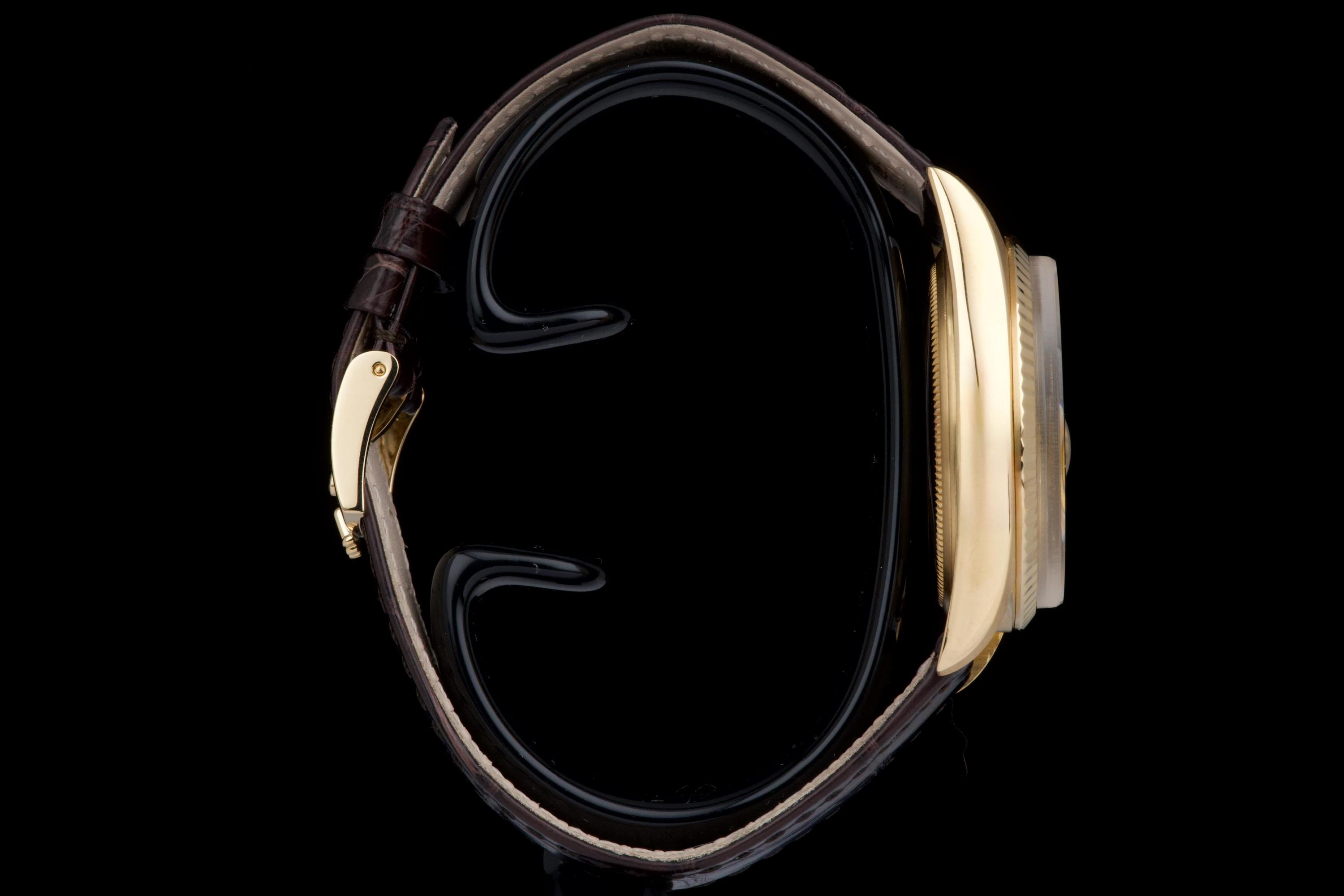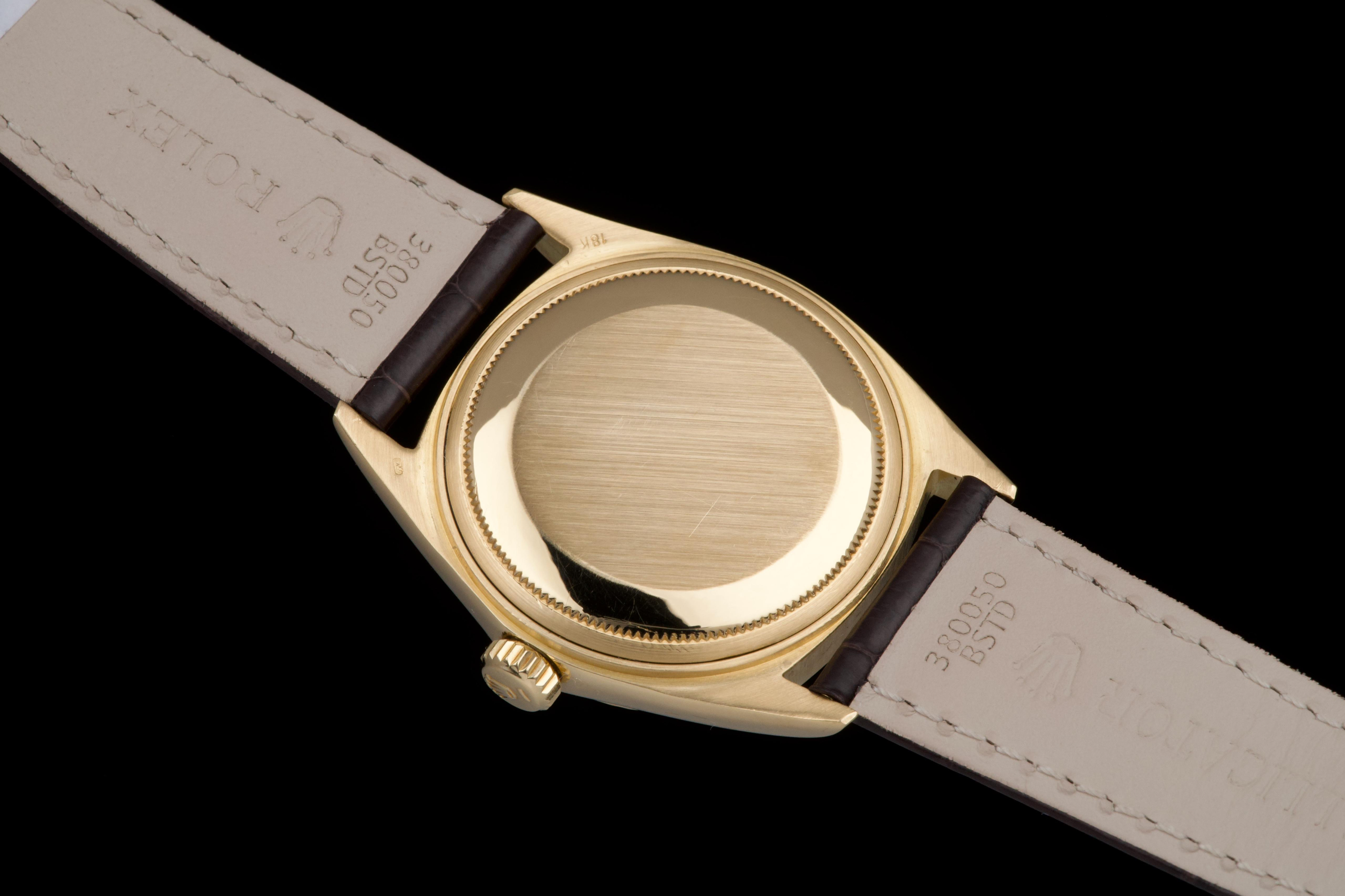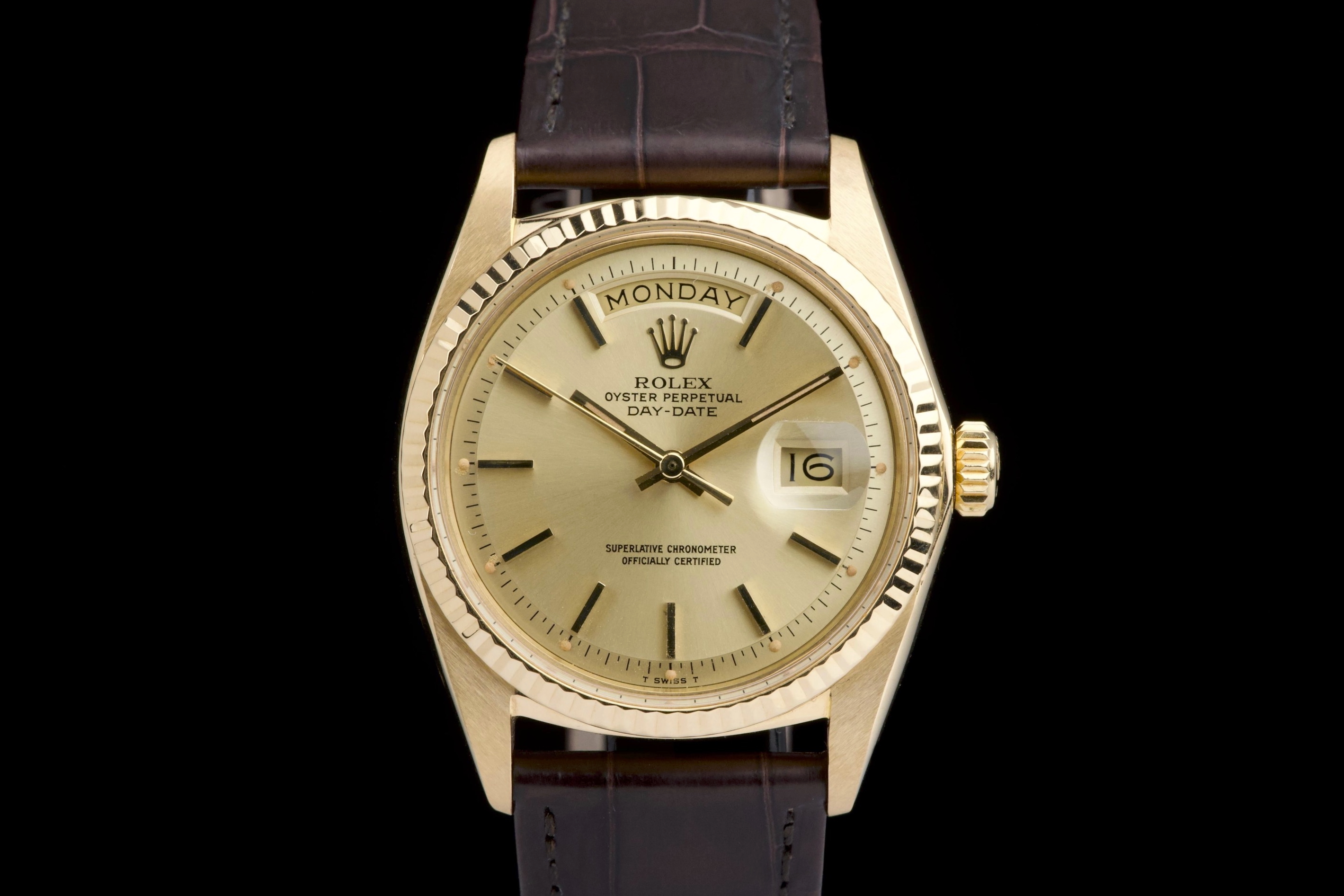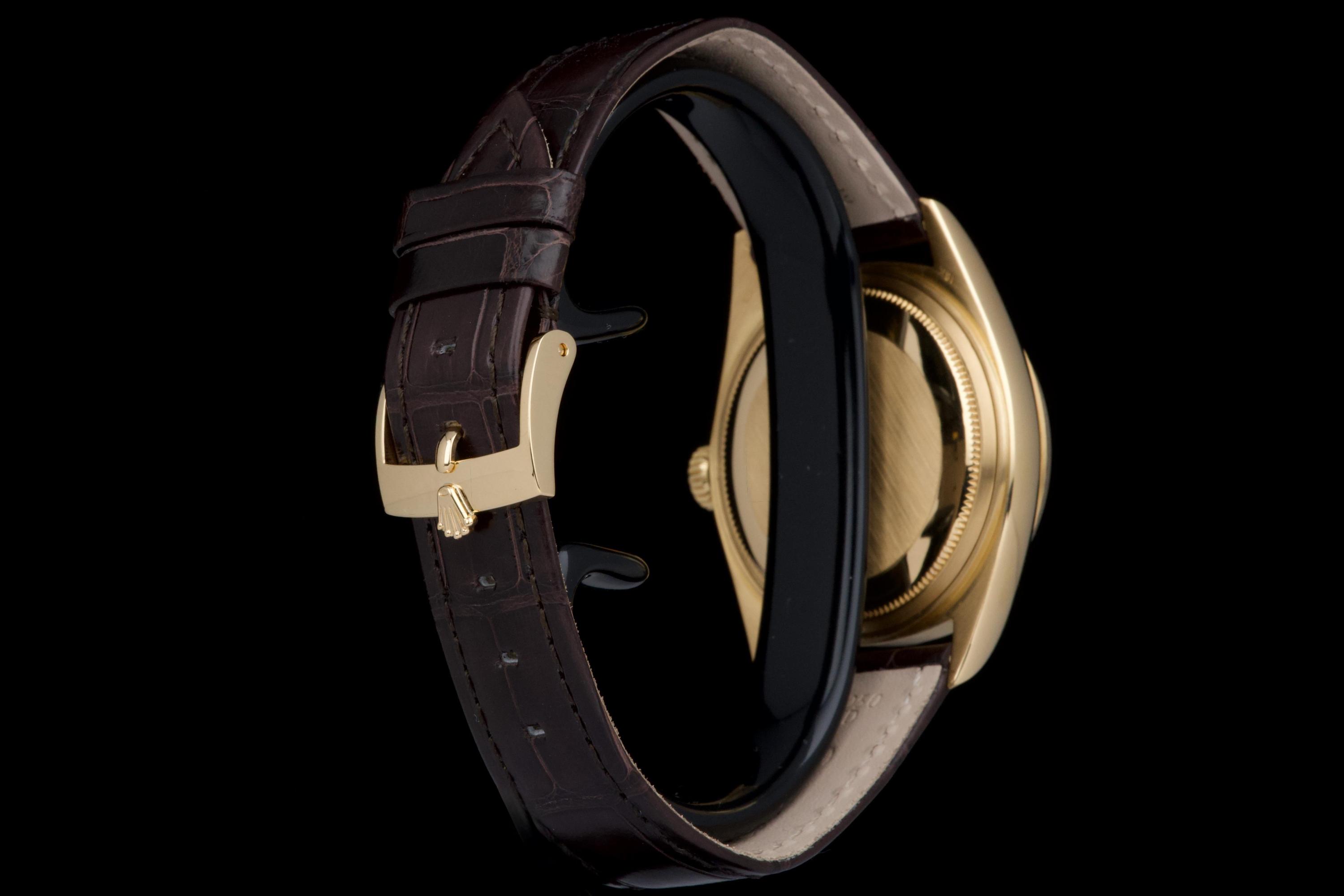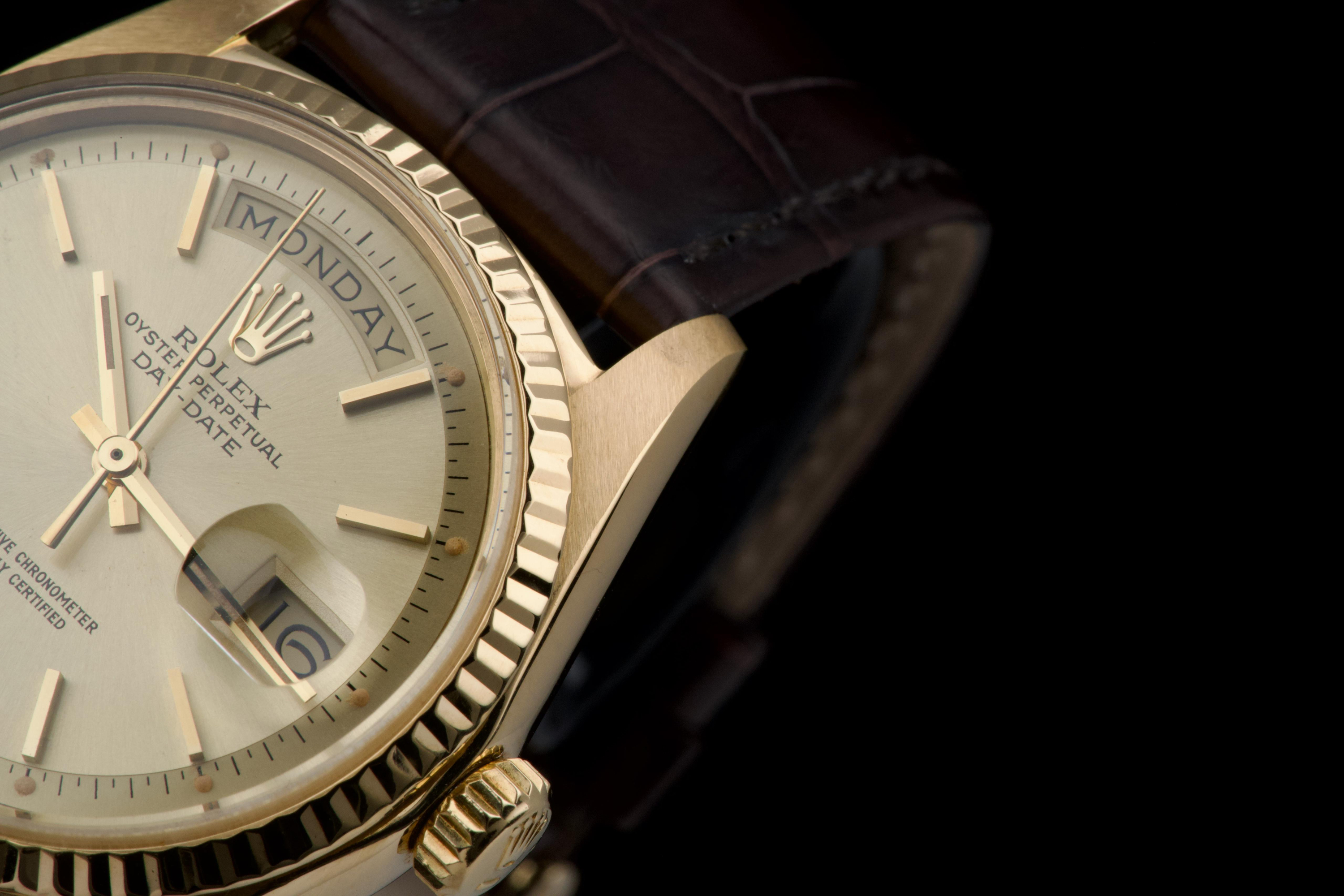A classic Rolex Day-Date reference 1803/8 in 18k yellow gold, dating to 1970 (serial 2956XXX), presented on a brown crocodile leather strap. The case is in excellent condition, remaining sharp with well-defined edges, and the fluted bezel is equally well preserved, enhancing the overall presence of the watch. The champagne dial is in very good condition overall, with a light and honest vintage character. Some of the tritium plots show minor flaking, with the lume at 10 o’clock missing, which is not uncommon for a watch of this age. The hands are in excellent condition and fully matching, maintaining a cohesive look. The watch has benefited from a recent intervention at Rolex Geneva in 2026, including the replacement of the strap, 18k yellow gold buckle, and spring bars. The proper functioning of the movement was checked during this service. A clean and well-preserved example of the iconic Day-Date, combining sharp case proportions, a pleasing dial, and the timeless elegance of yellow gold.