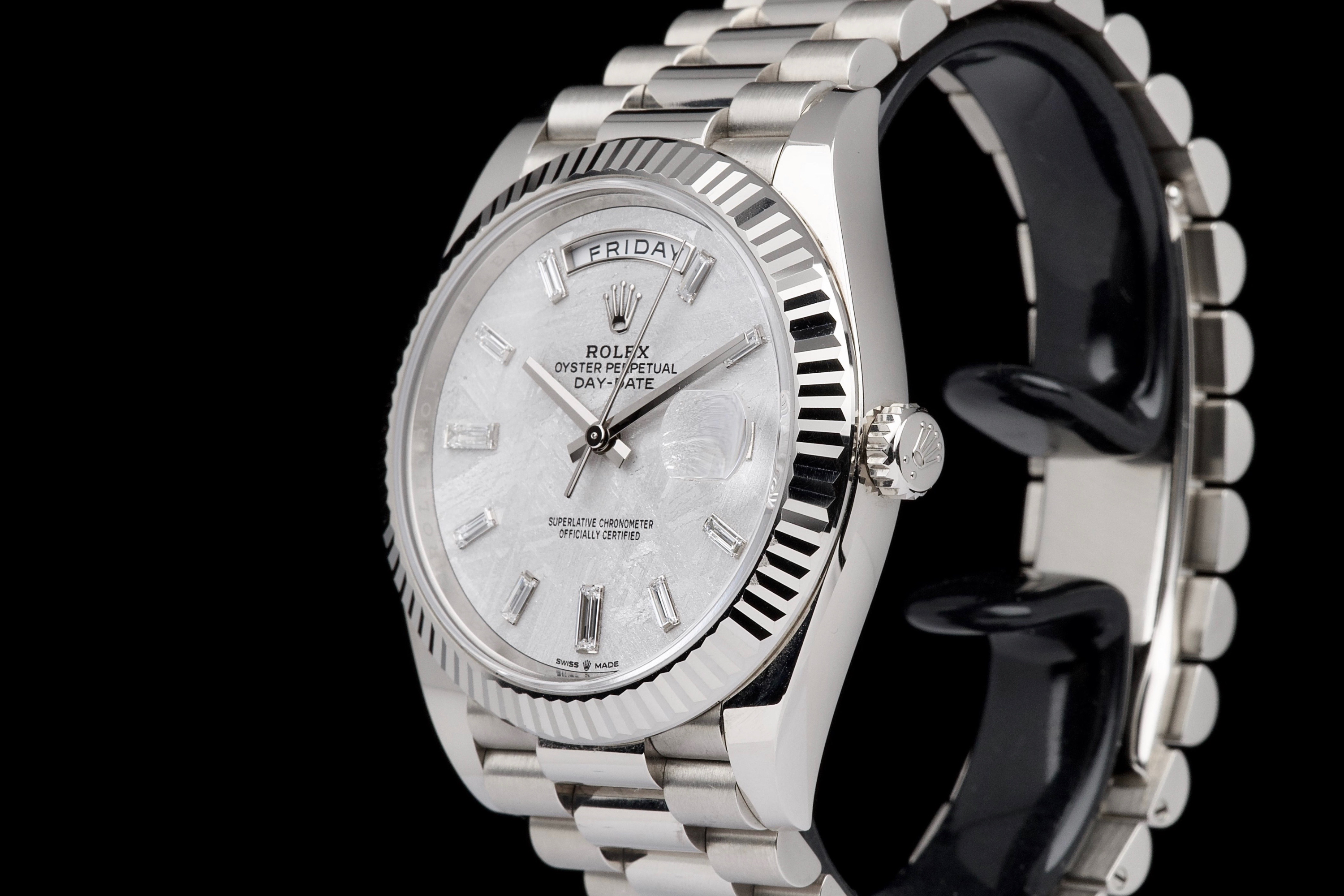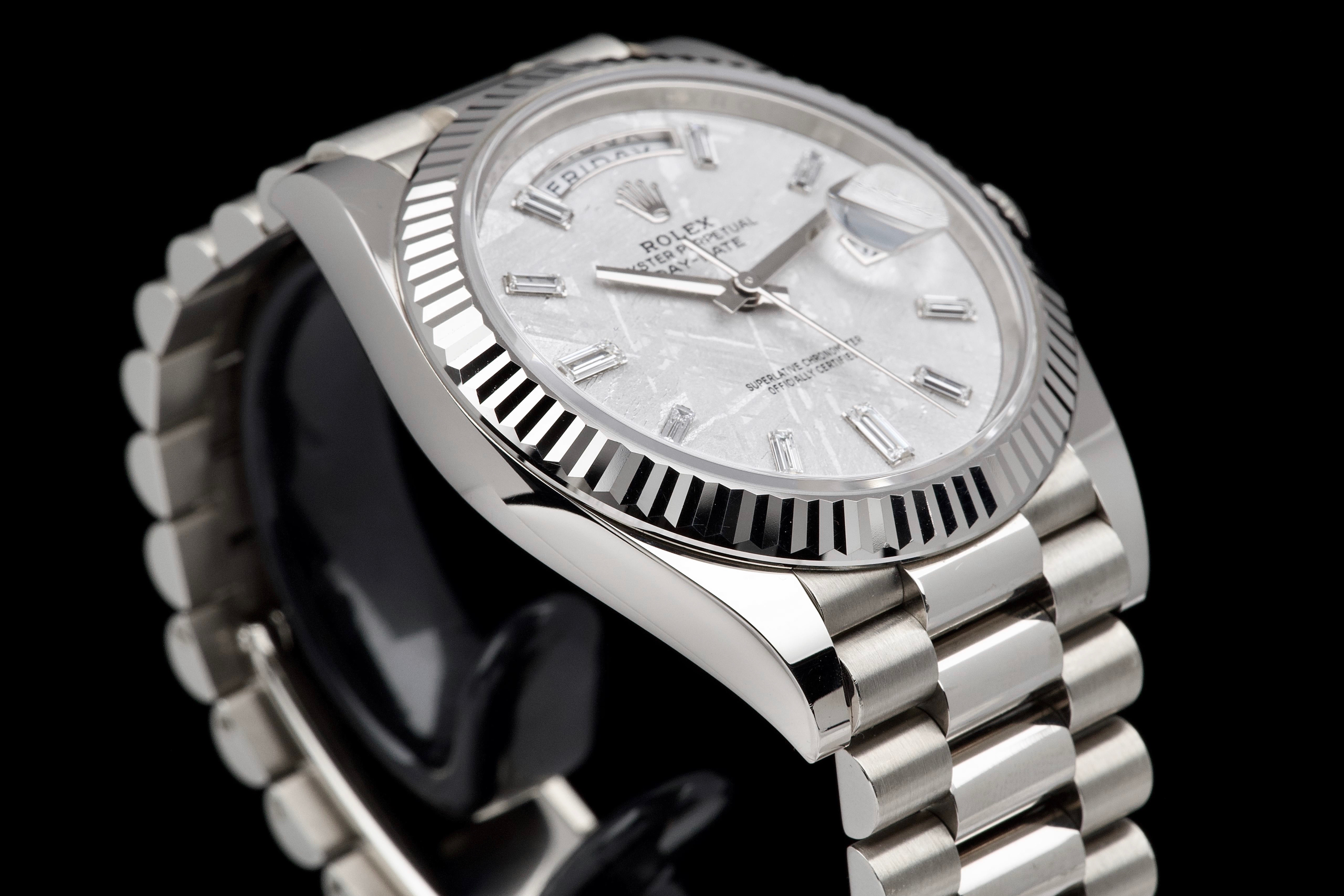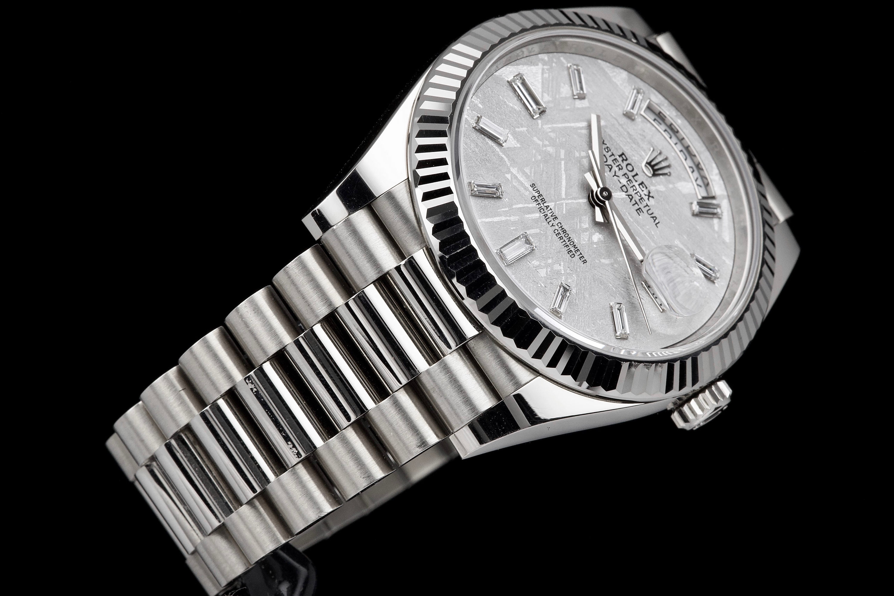 This Rolex Day-Date reference 228239 is presented in 18k white gold and measures 40 mm in diameter, fitted with the iconic President bracelet. The watch features a highly attractive meteorite dial adorned with baguette diamond hour markers, each meteorite pattern naturally unique and lending the piece a distinctive and rare character. Preserved in unpolished condition, the case and bracelet show only light signs of wear, consistent with careful use. Offered by its original owner and accompanied by Swiss provenance, the watch retains all original bracelet links and is delivered as a full set. Overall, the present watch is in very good condition and represents an appealing opportunity to acquire a modern Day-Date in noble metal with one of Rolex’s most striking dial configurations.
