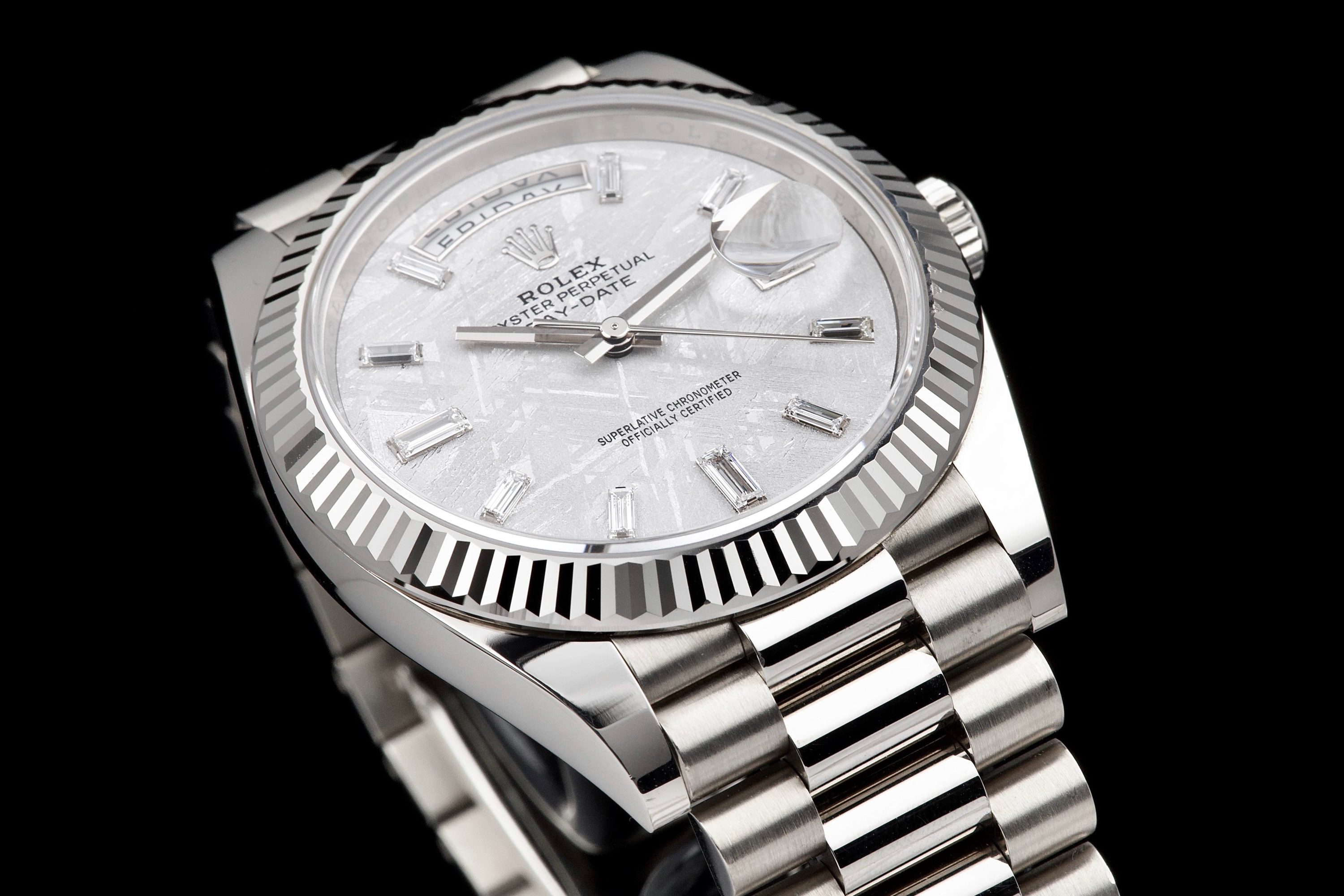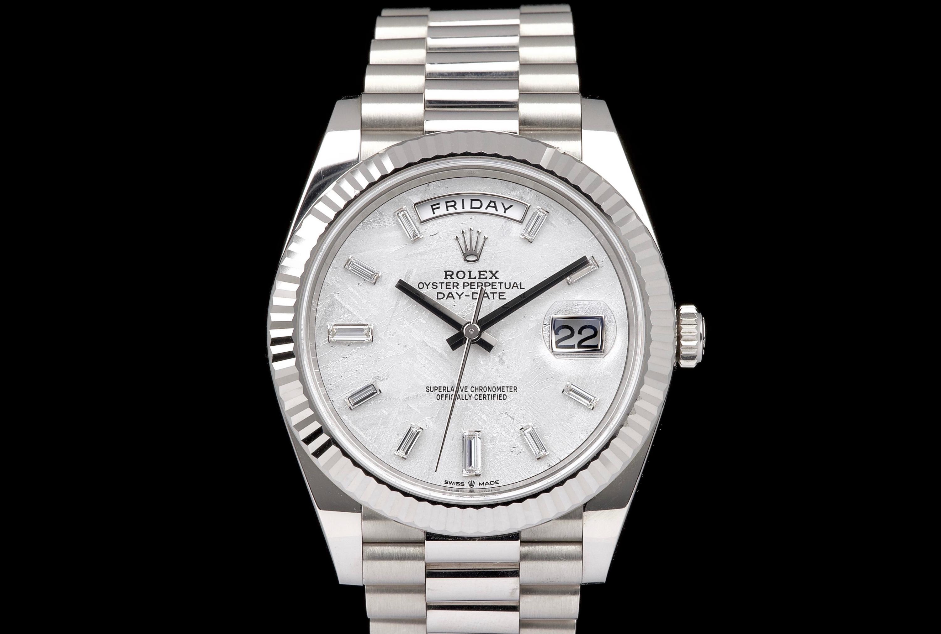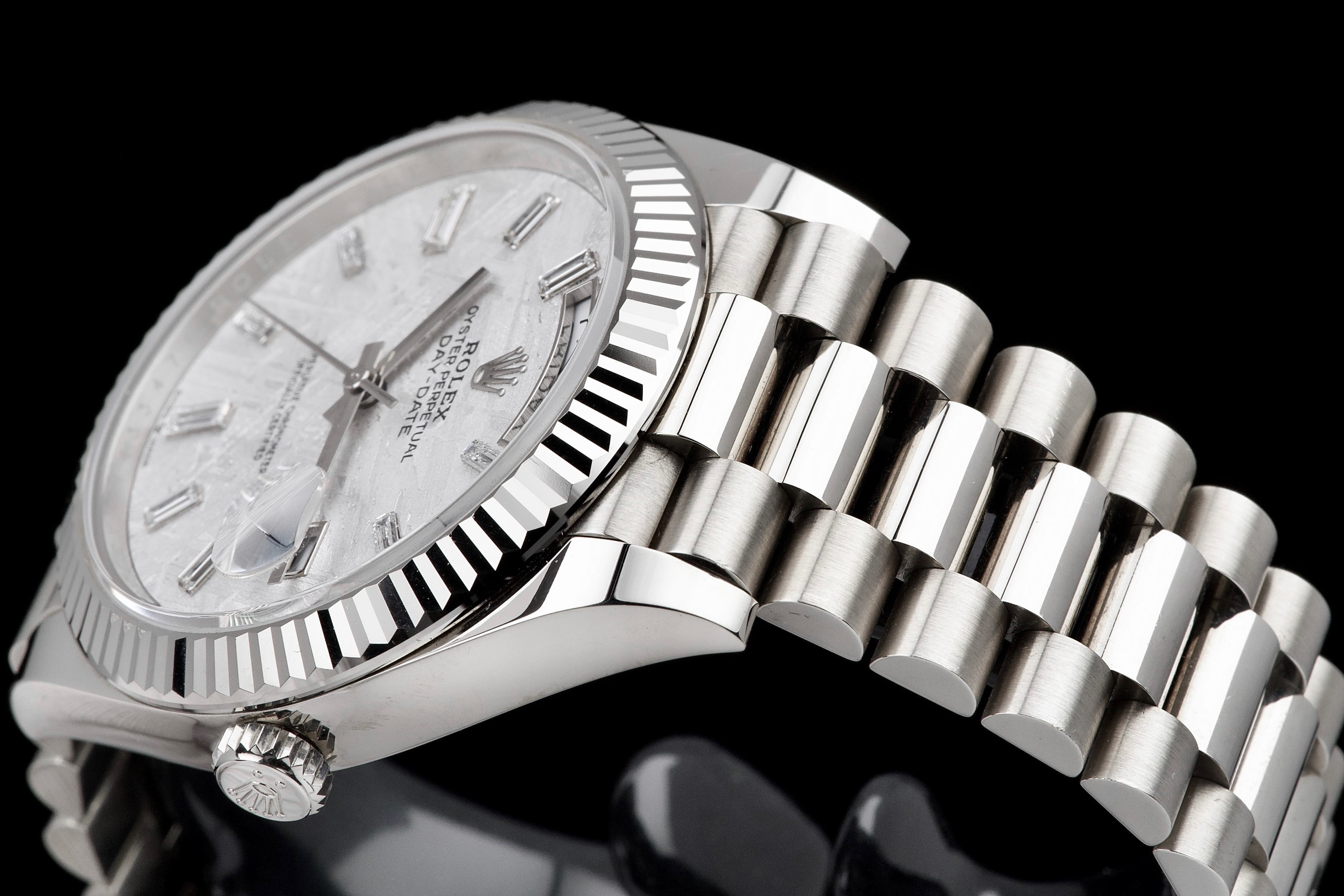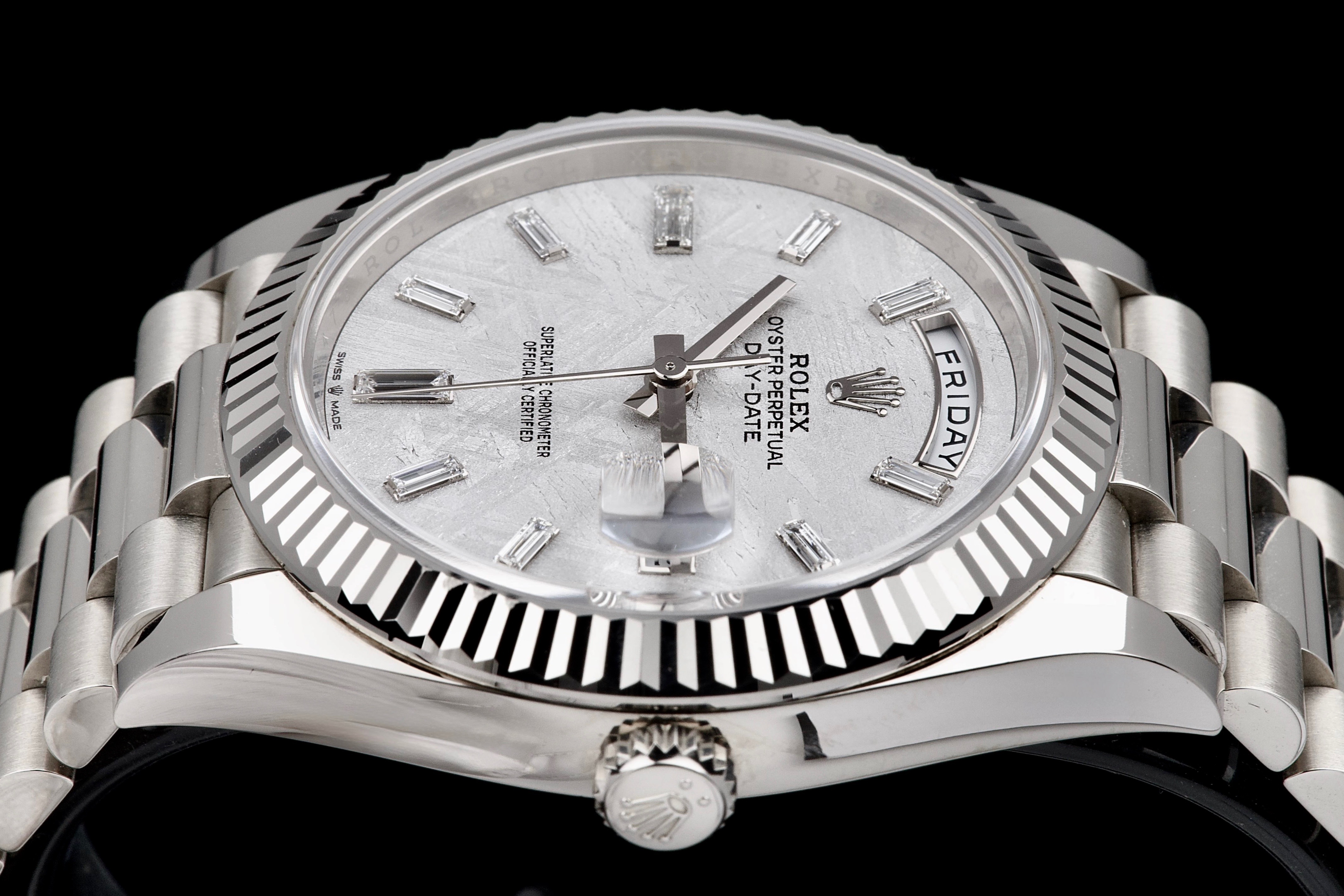 This Rolex Day-Date reference 228239 is presented in 18k white gold and measures 40 mm in diameter, fitted with the iconic President bracelet. The watch features a highly attractive meteorite dial adorned with baguette diamond hour markers, each meteorite pattern naturally unique and lending the piece a distinctive and rare character. Preserved in unpolished condition, the case and bracelet show only light signs of wear, consistent with careful use. Offered by its original owner and accompanied by Swiss provenance, the watch retains all original bracelet links and is delivered as a full set. Overall, the present watch is in very good condition and represents an appealing opportunity to acquire a modern Day-Date in noble metal with one of Rolex’s most striking dial configurations.