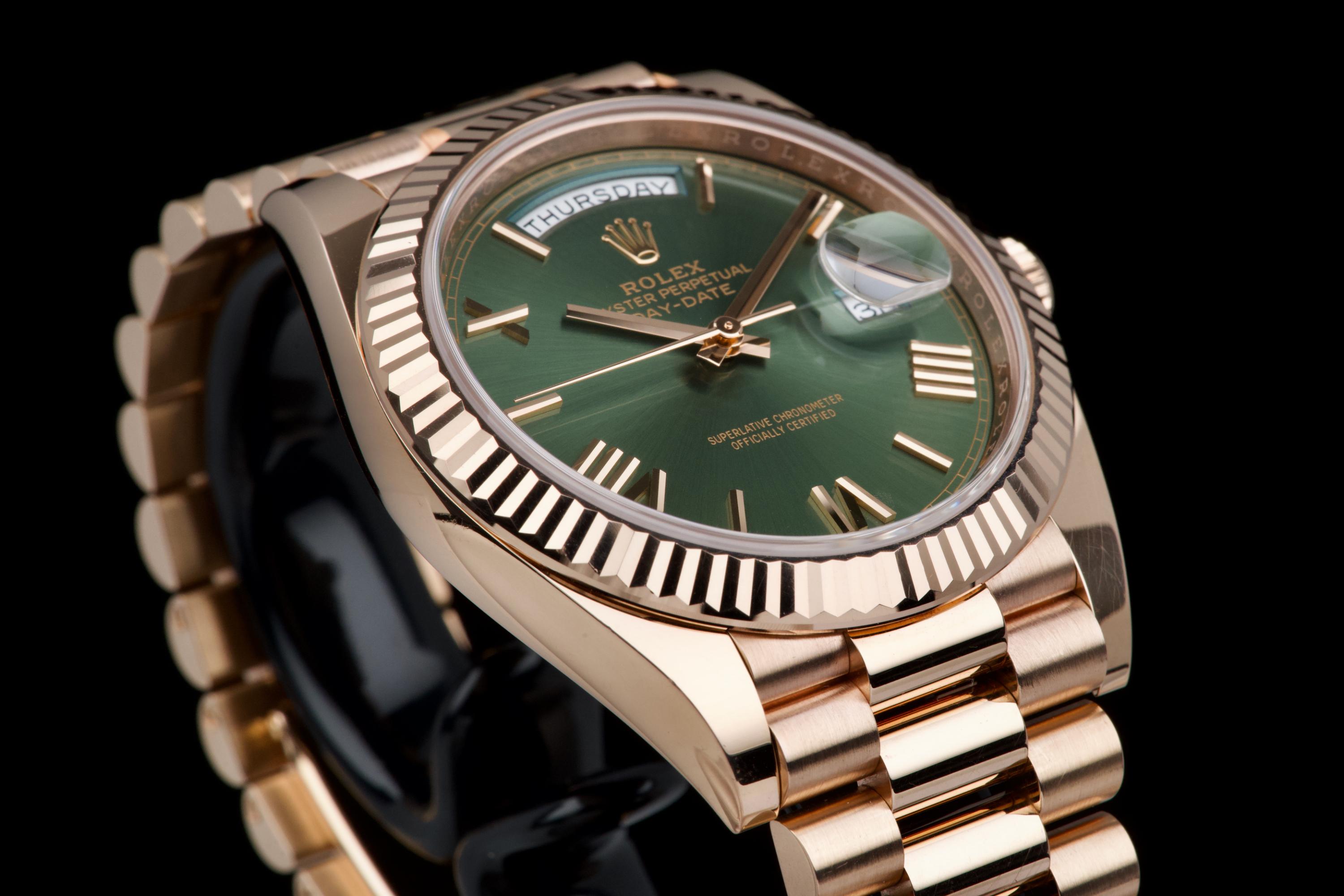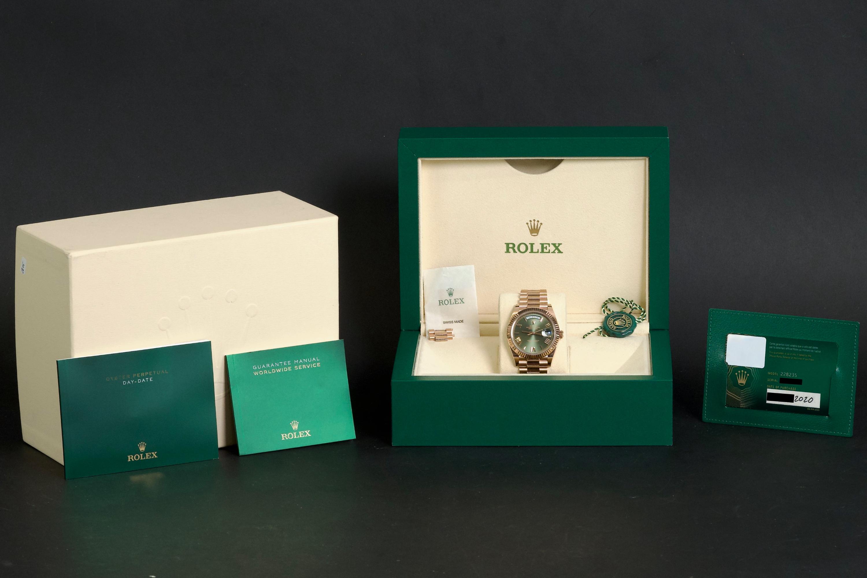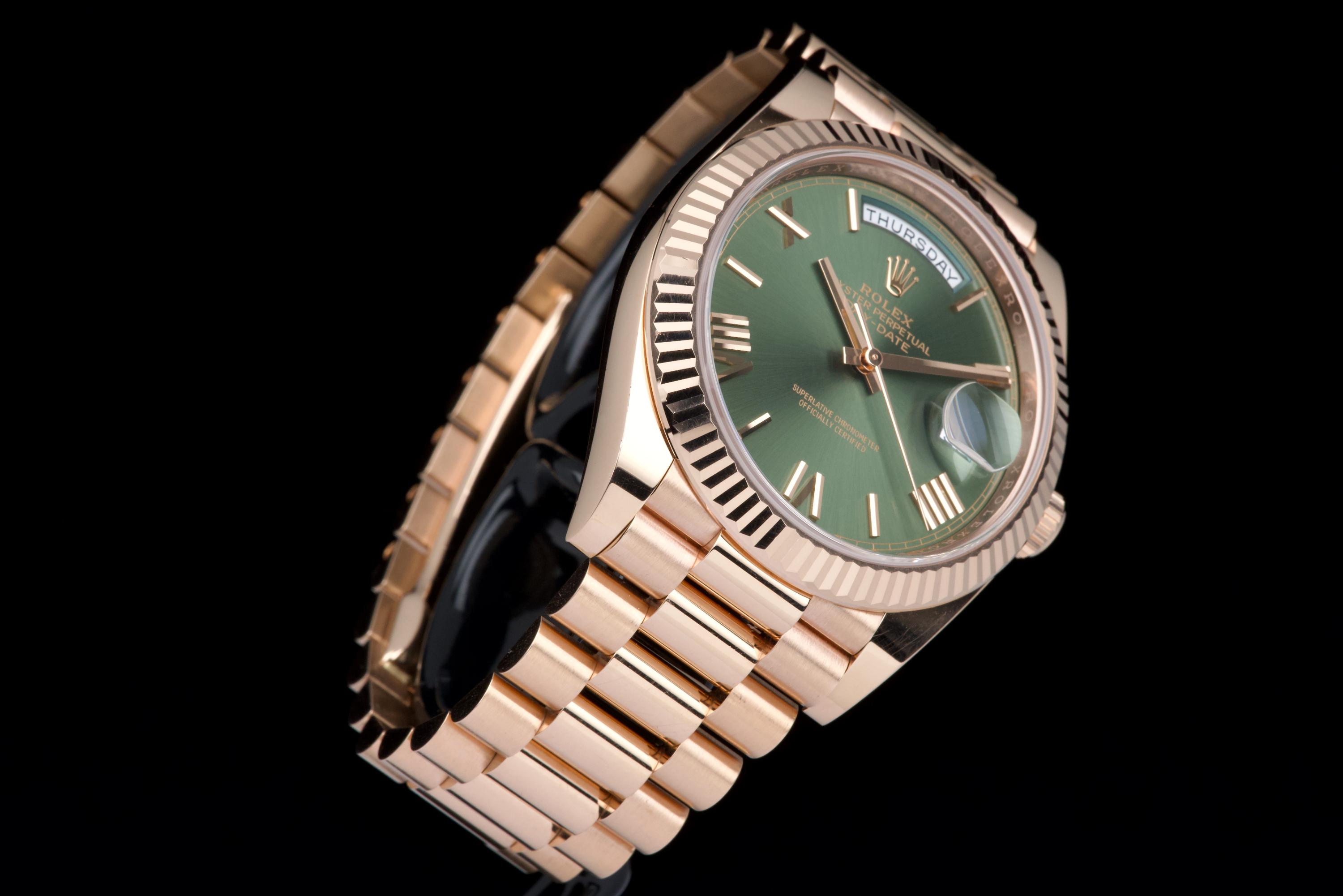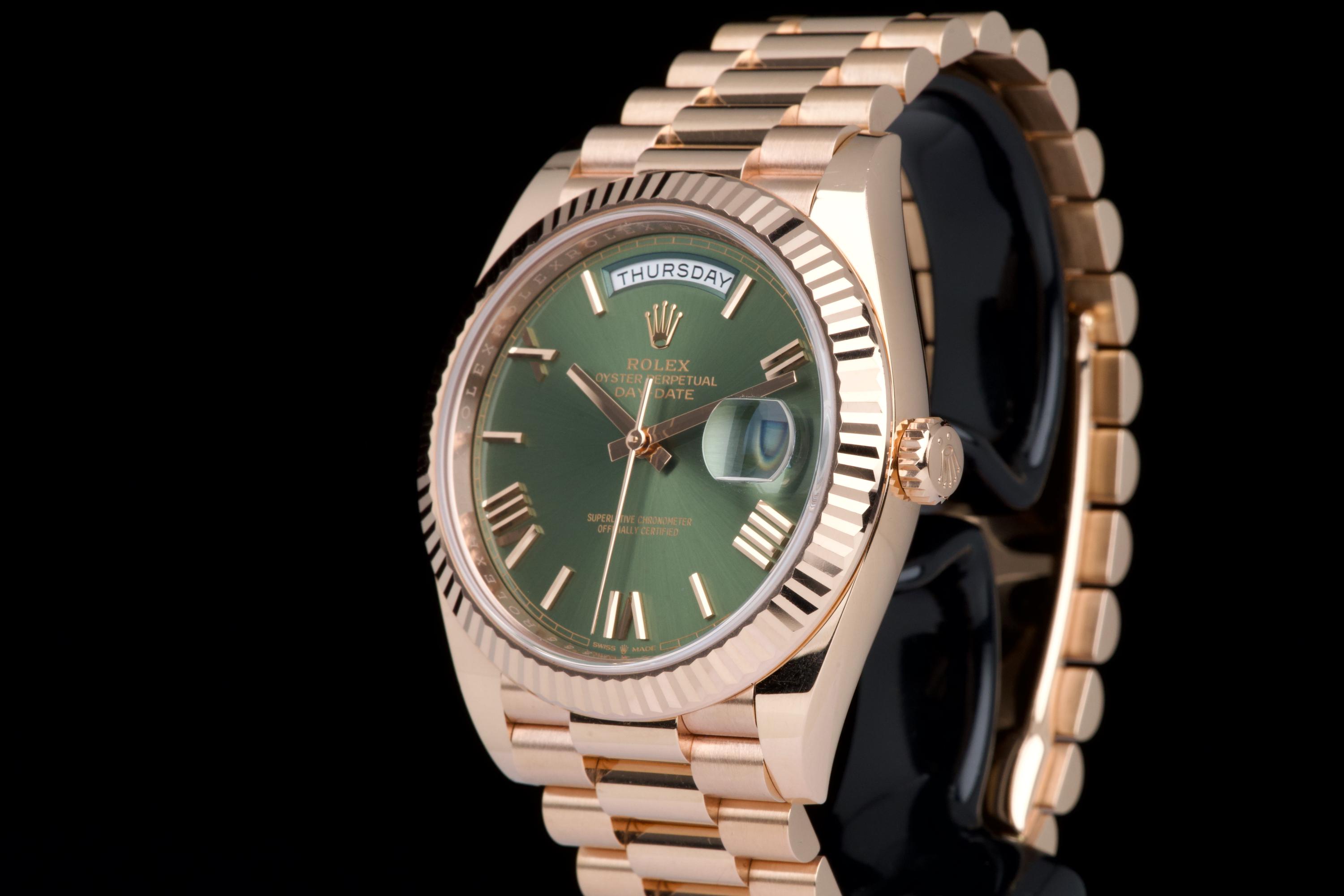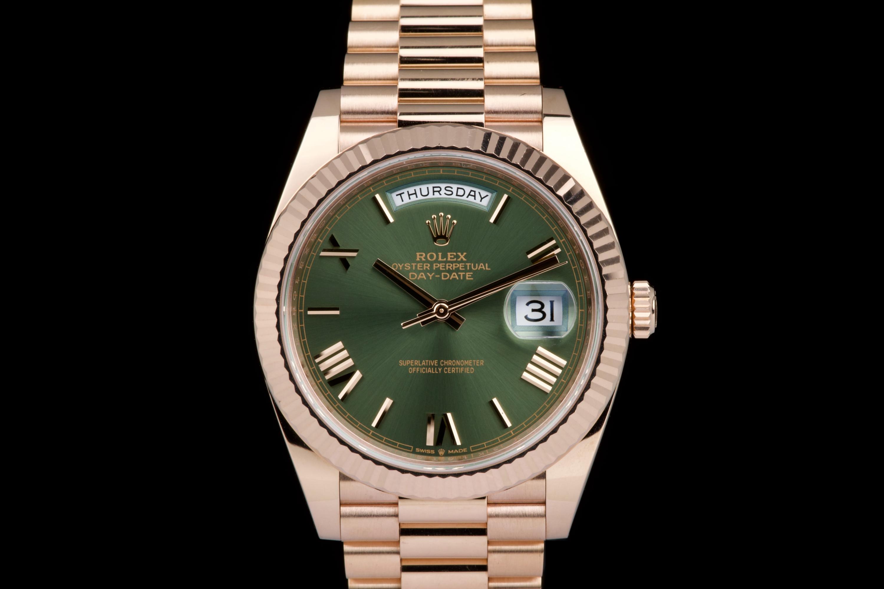 A superb example of the modern Rolex Day-Date 40 in 18k Everose gold, featuring the highly sought-after sunburst olive green dial — one of the most desirable and recognizable configurations of the reference. Purchased new in Switzerland in 2020, this example remains unpolished and in excellent overall condition, showing only light wear with minor surface marks from careful use. All bracelet links are present. The 40 mm Everose gold case houses the automatic Rolex caliber 3255, entirely developed and manufactured in-house, featuring the Chronergy escapement, 70-hour power reserve, and Rolex’s Superlative Chronometer certification ensuring -2/+2 seconds per day precision. The fluted bezel and President bracelet underscore the model’s timeless elegance, while the olive green dial — introduced to celebrate the 60th anniversary of the Day-Date — offers a unique play of light from deep green to golden tones. Complete with box, “new style” 2020 warranty card, and accessories. A stunning and collectible example of the Day-Date 40 in Everose gold with olive green dial — one of the most distinctive and coveted modern Rolex combinations.