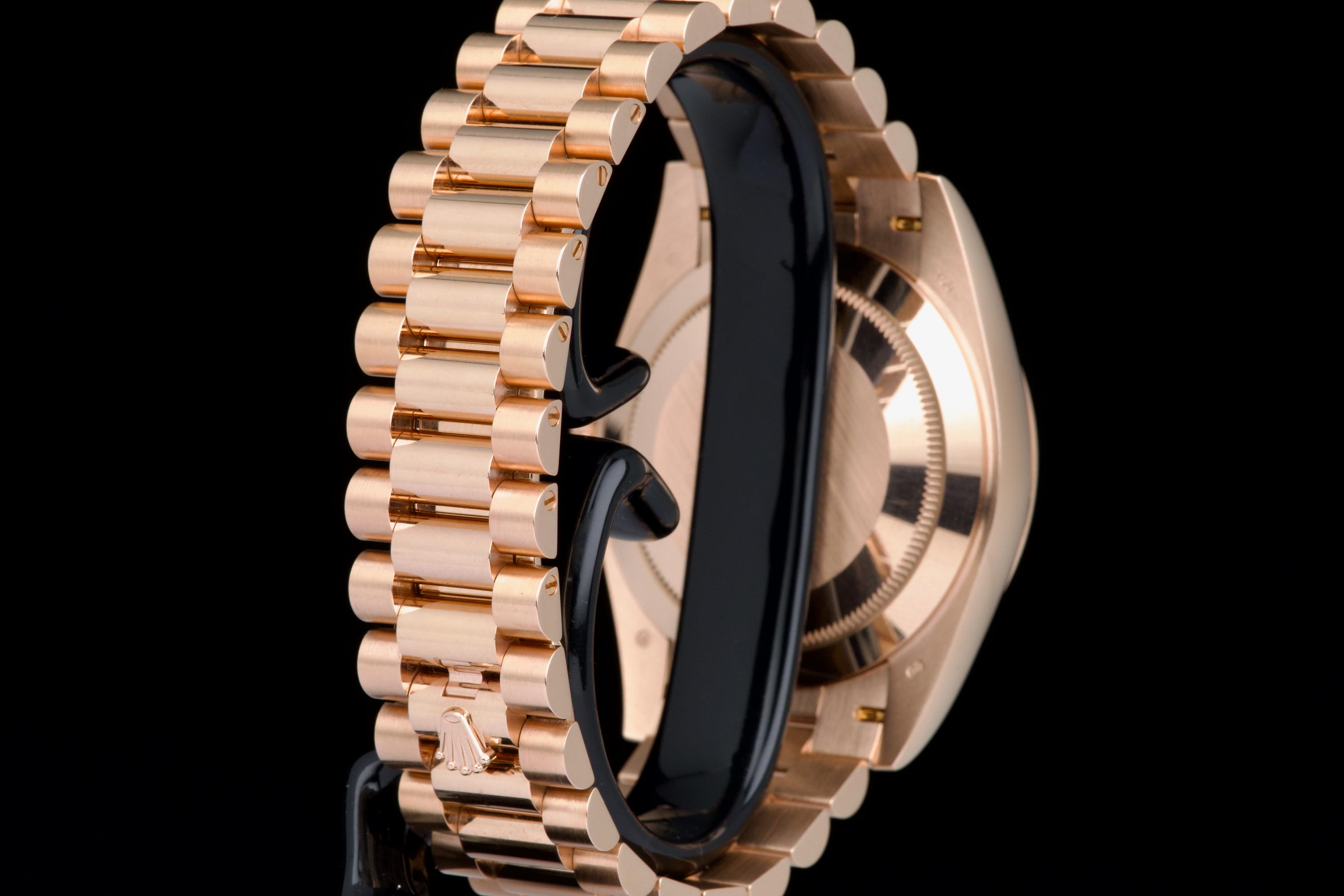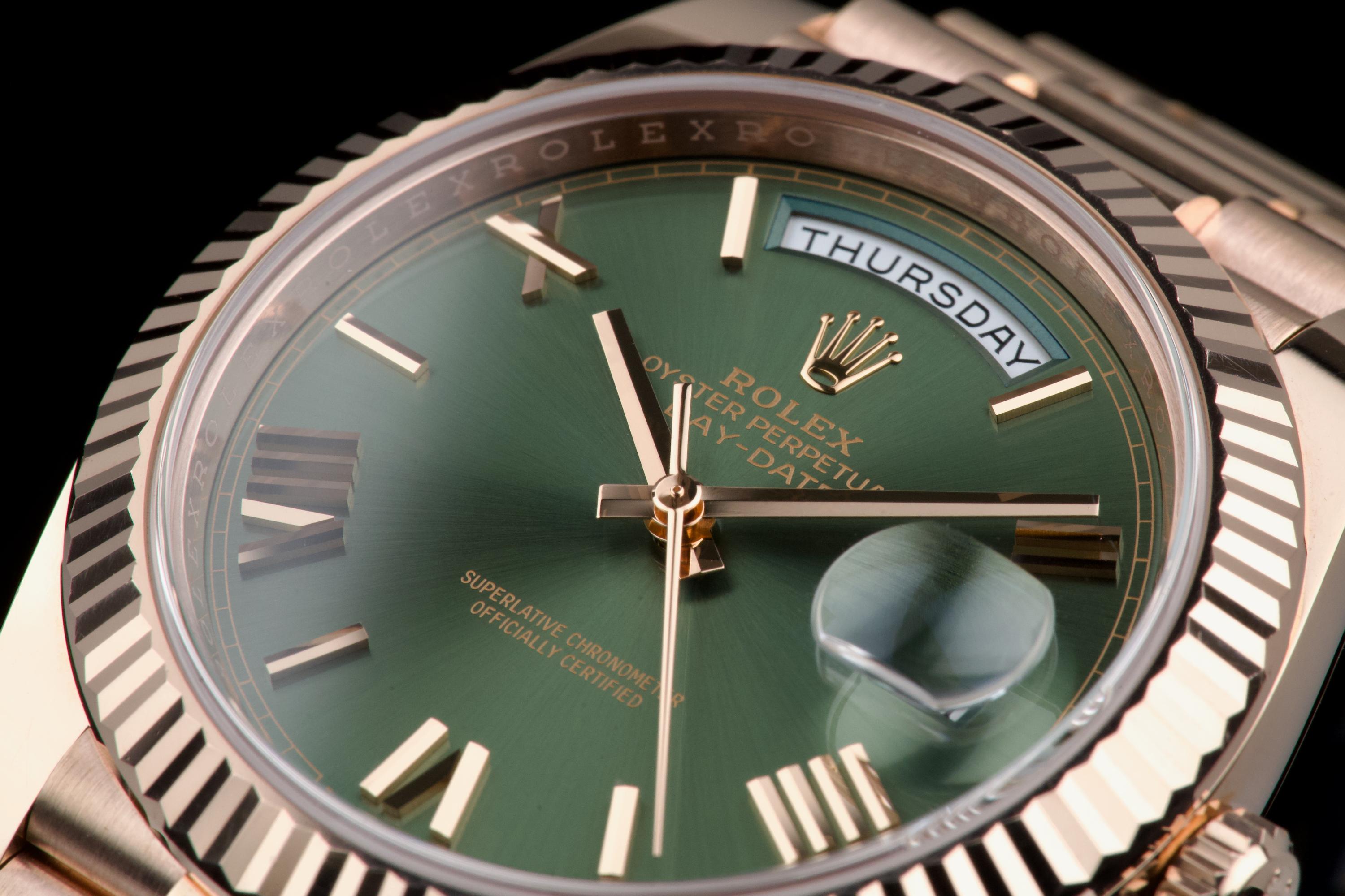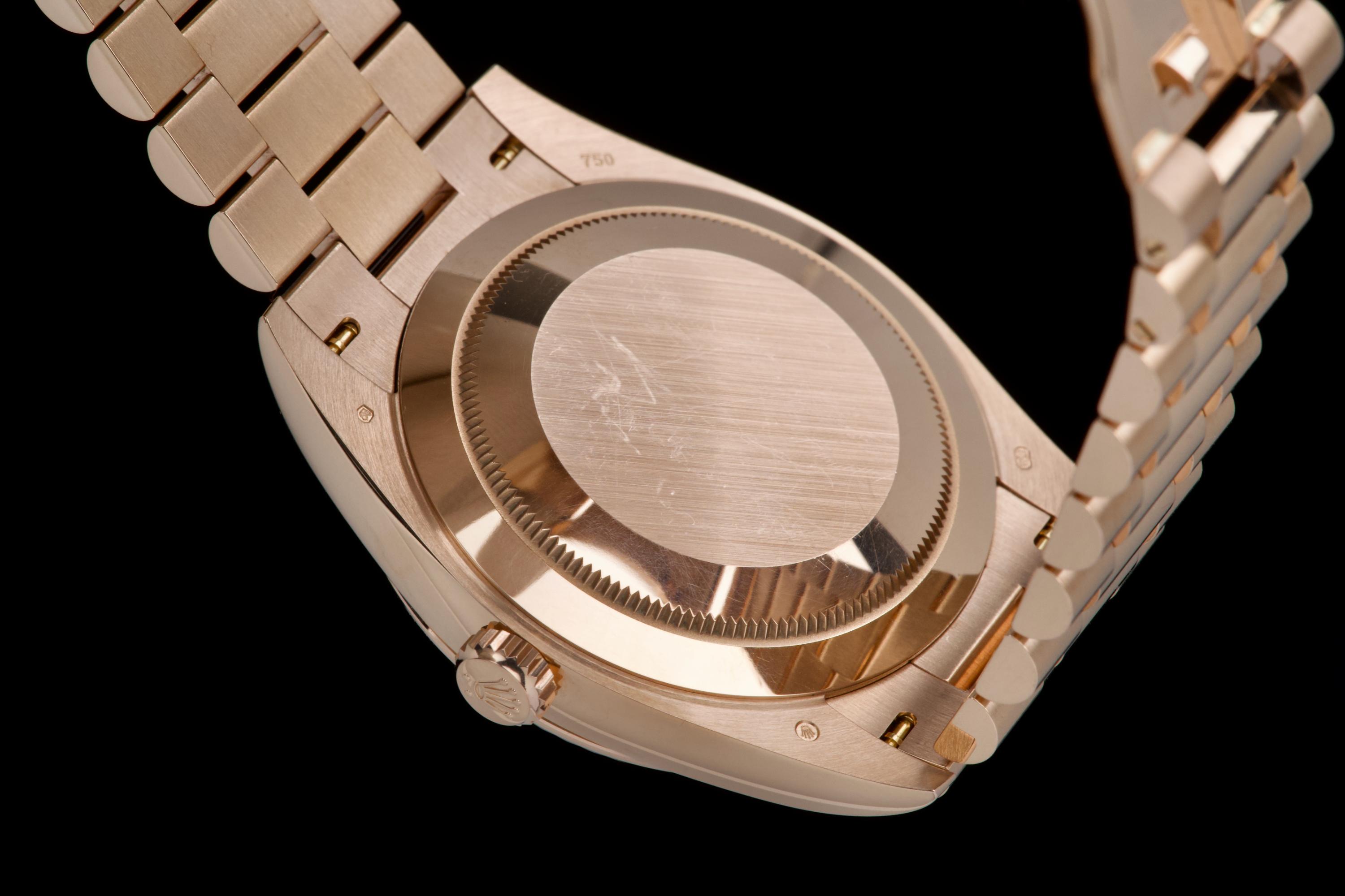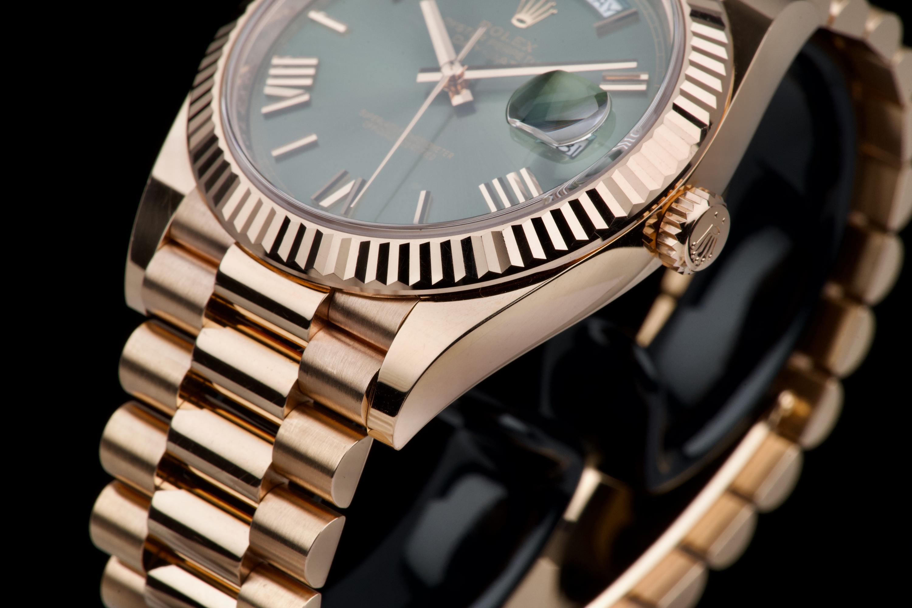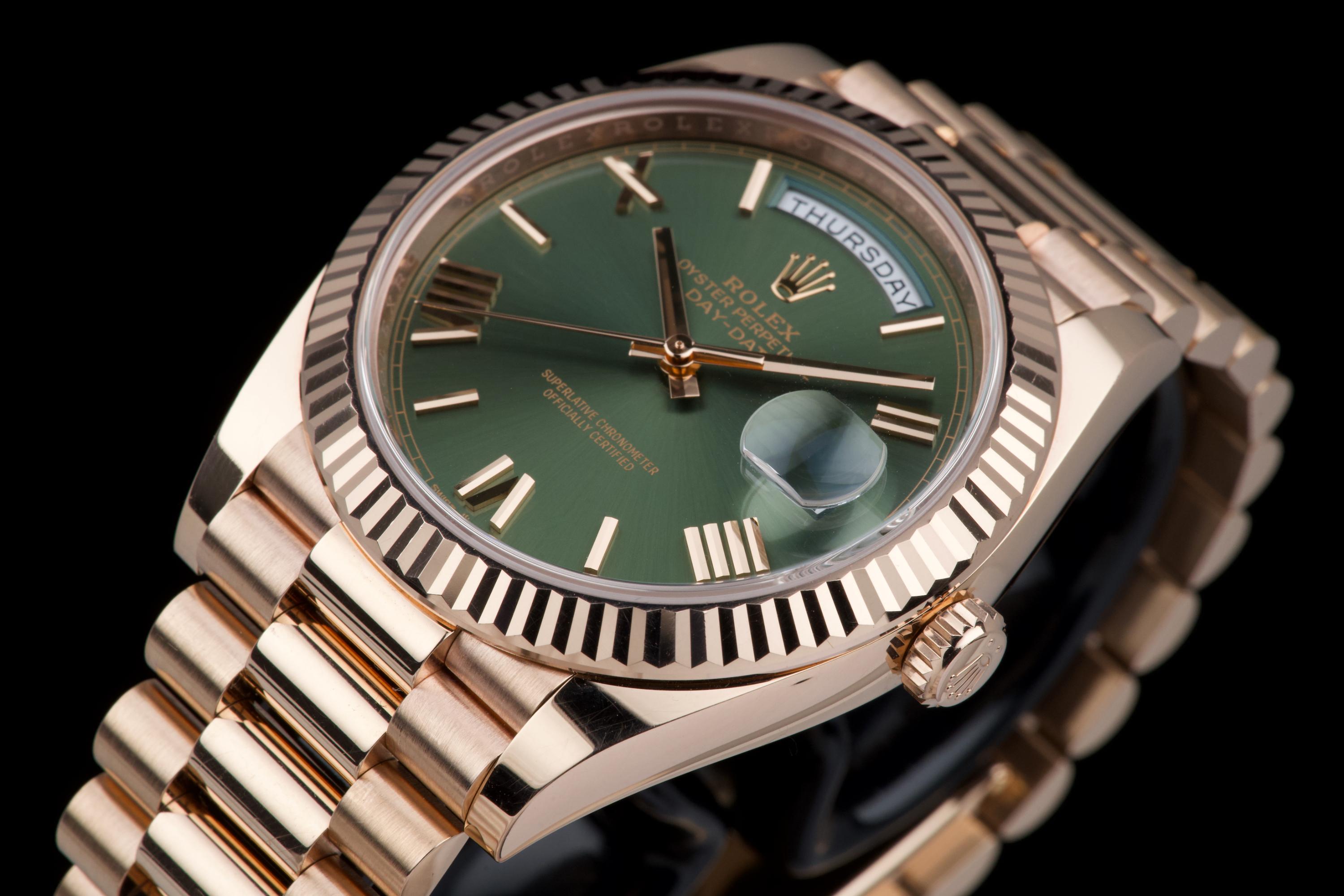 A superb example of the modern Rolex Day-Date 40 in 18k Everose gold, featuring the highly sought-after sunburst olive green dial — one of the most desirable and recognizable configurations of the reference. Purchased new in Switzerland in 2020, this example remains unpolished and in excellent overall condition, showing only light wear with minor surface marks from careful use. All bracelet links are present. The 40 mm Everose gold case houses the automatic Rolex caliber 3255, entirely developed and manufactured in-house, featuring the Chronergy escapement, 70-hour power reserve, and Rolex’s Superlative Chronometer certification ensuring -2/+2 seconds per day precision. The fluted bezel and President bracelet underscore the model’s timeless elegance, while the olive green dial — introduced to celebrate the 60th anniversary of the Day-Date — offers a unique play of light from deep green to golden tones. Complete with box, “new style” 2020 warranty card, and accessories. A stunning and collectible example of the Day-Date 40 in Everose gold with olive green dial — one of the most distinctive and coveted modern Rolex combinations.
