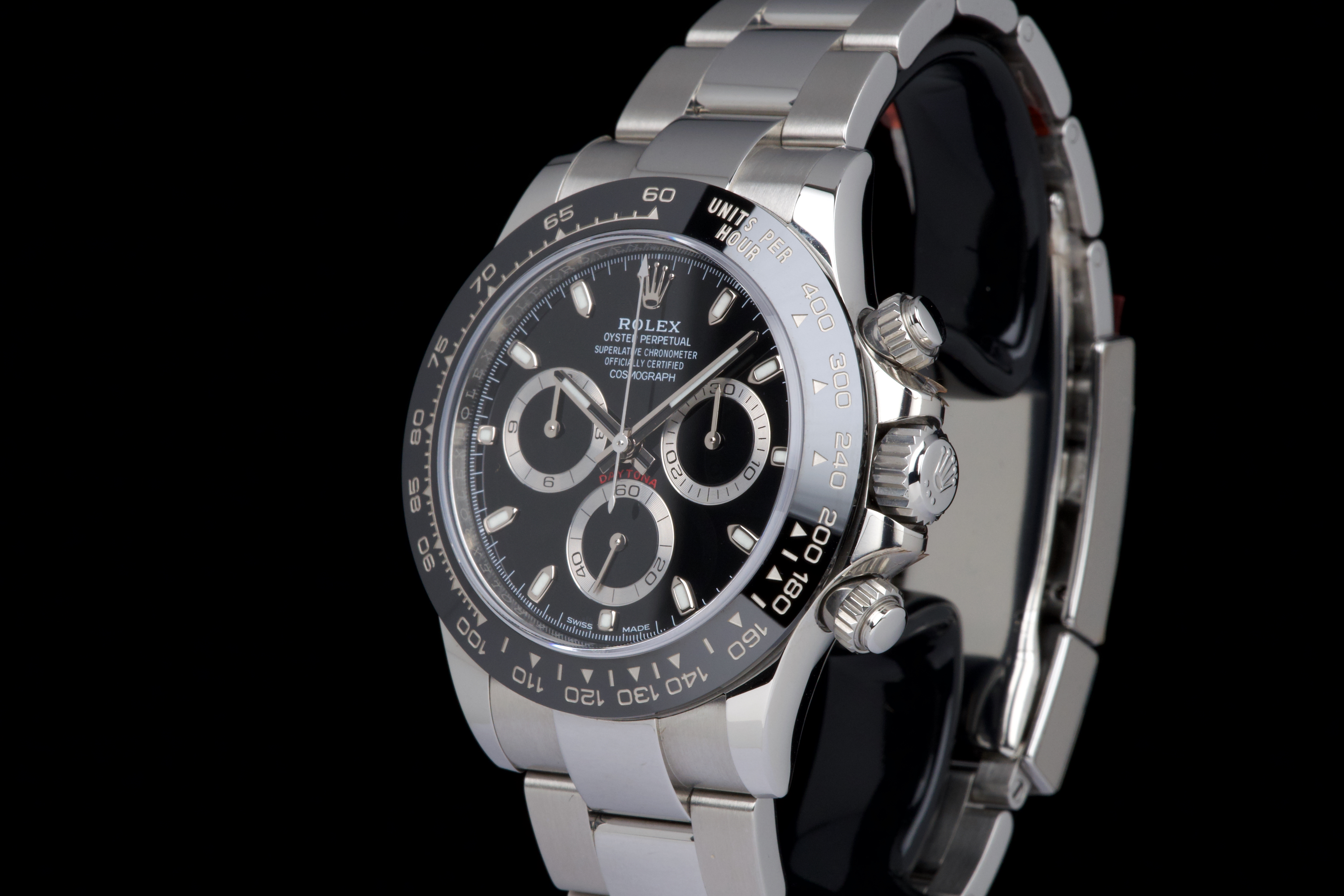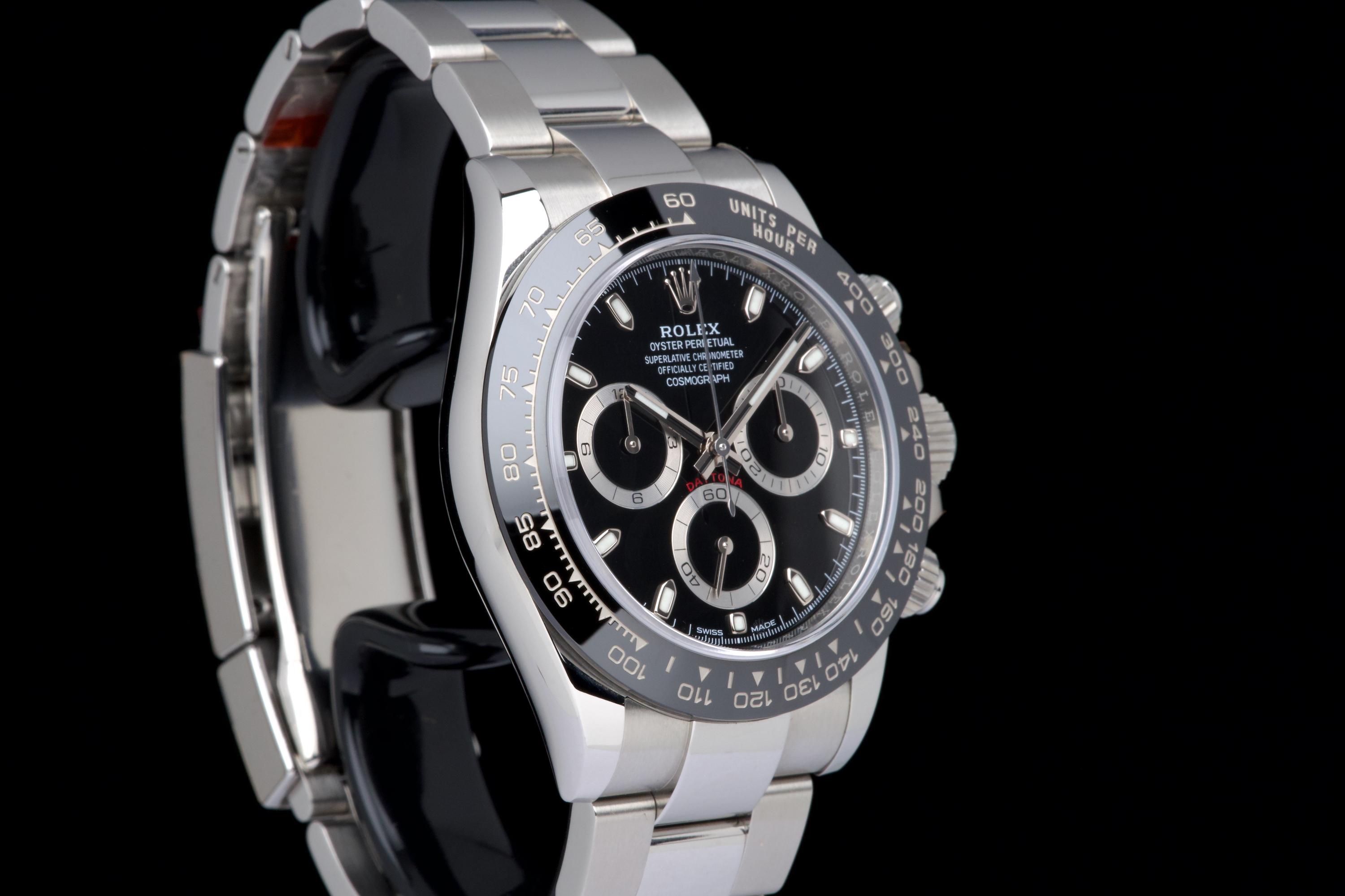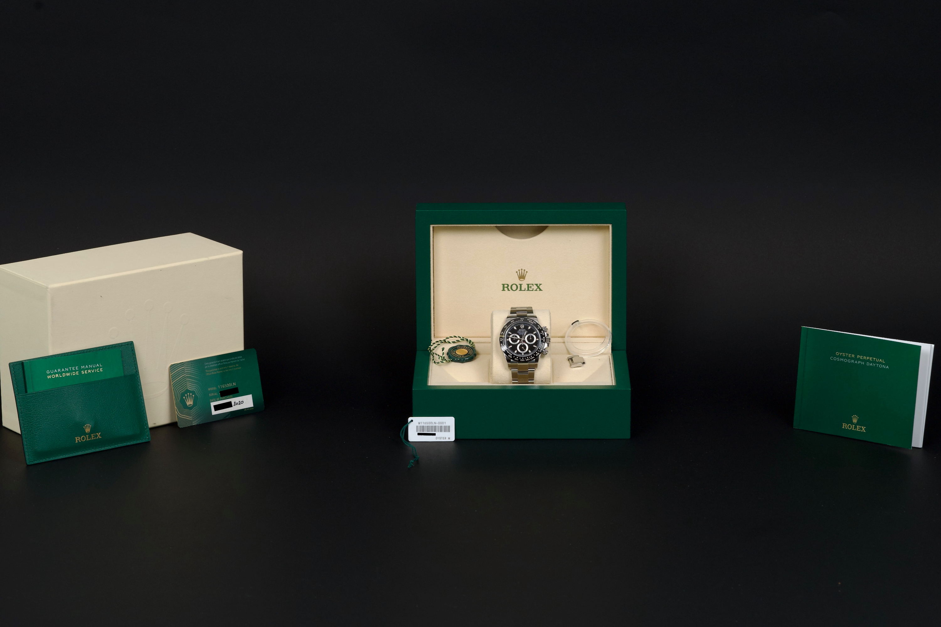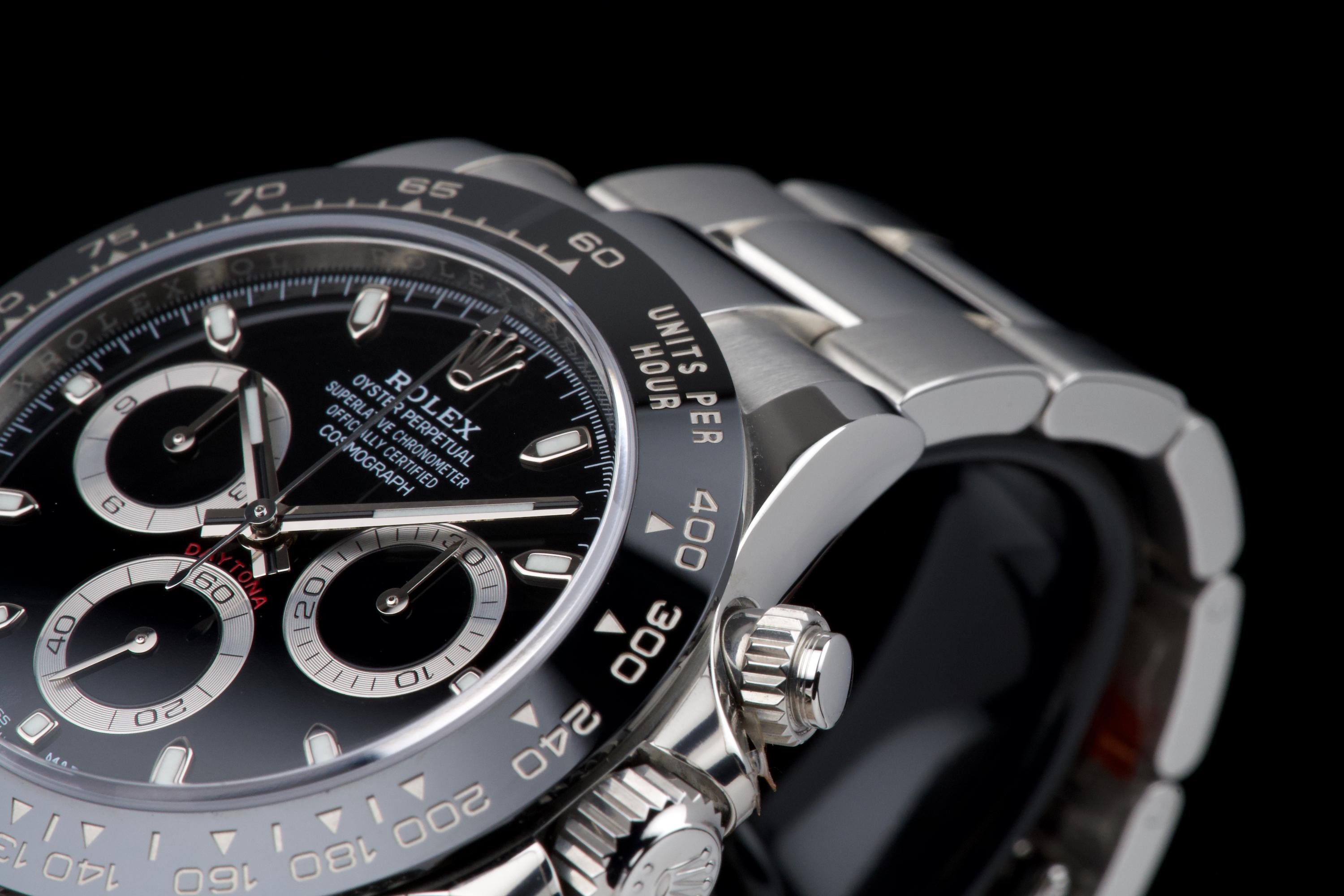 An exceptional and unworn example of the highly sought-after Rolex Cosmograph Daytona 116500LN with black dial. The watch retains several original factory stickers — on the clasp, the back of the case, and one on the lower crown guard — confirming its untouched condition. Featuring the iconic black ceramic Cerachrom bezel and the black lacquer dial with silver subdials, this 40 mm stainless steel Daytona is powered by the automatic Rolex caliber 4130, offering 72 hours of power reserve and chronograph precision certified as a Superlative Chronometer. Complete with its full 2020 set, including box, warranty card, booklets, and accessories. A truly collector-grade example of the modern Daytona — unworn, stickered, and in factory condition.