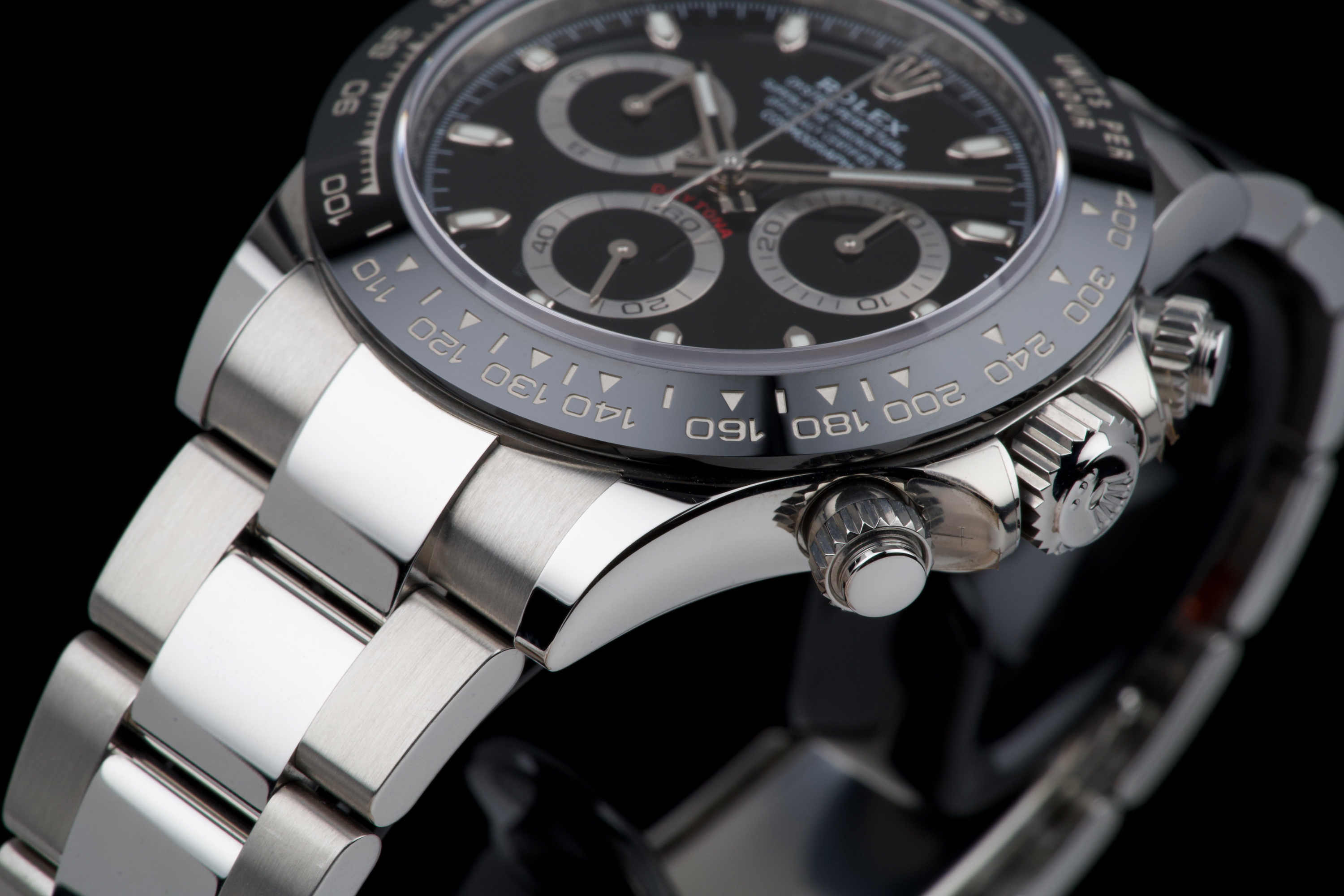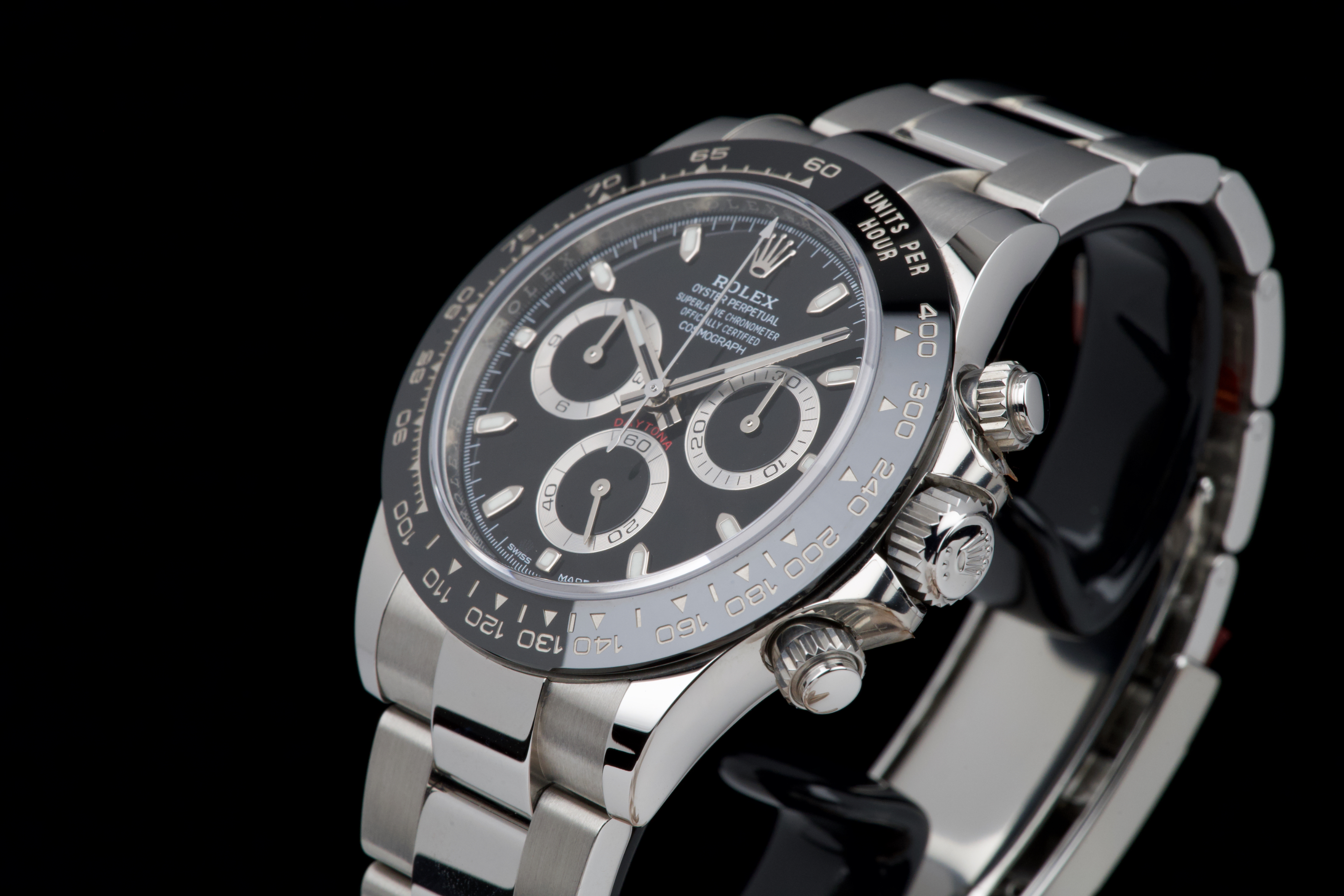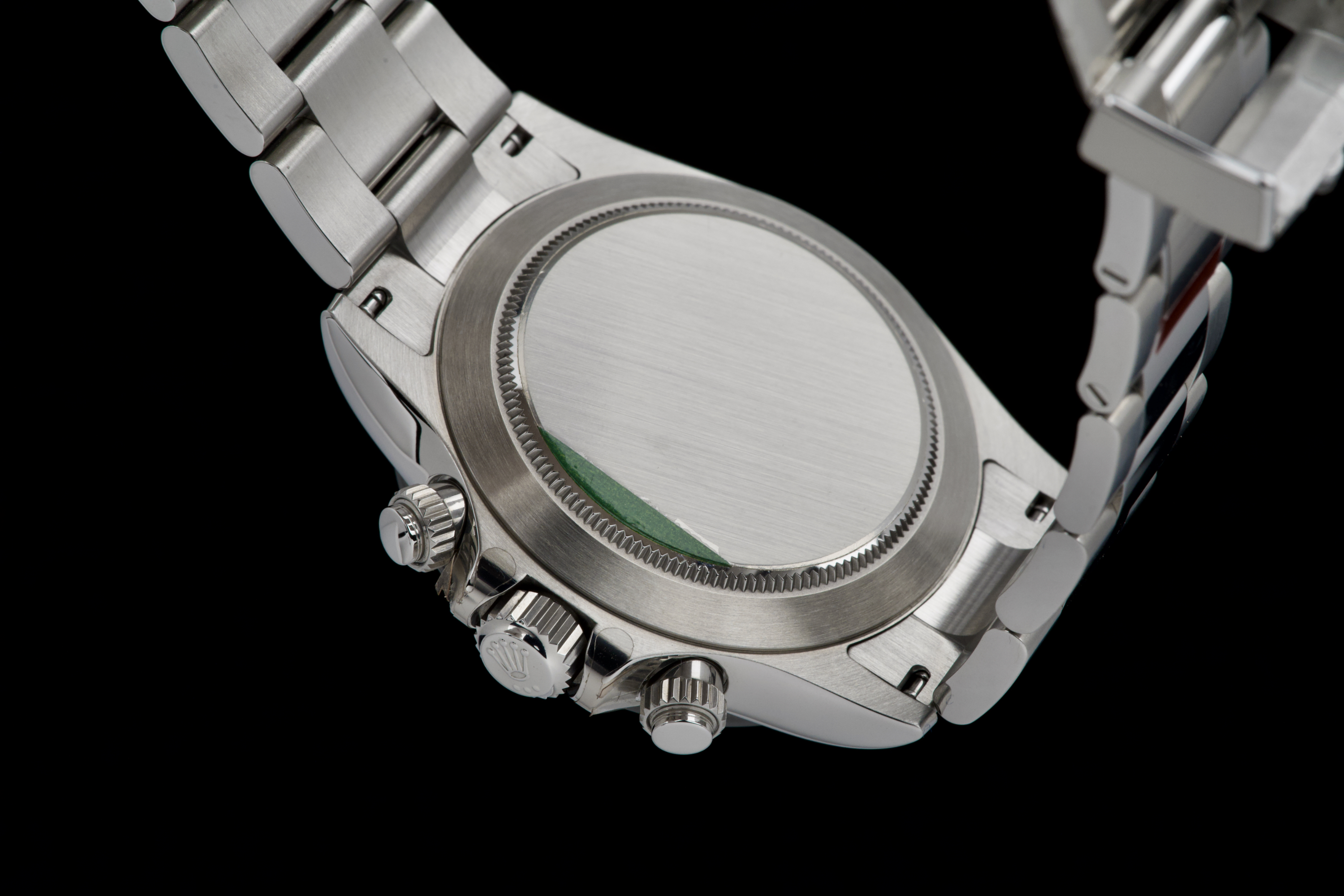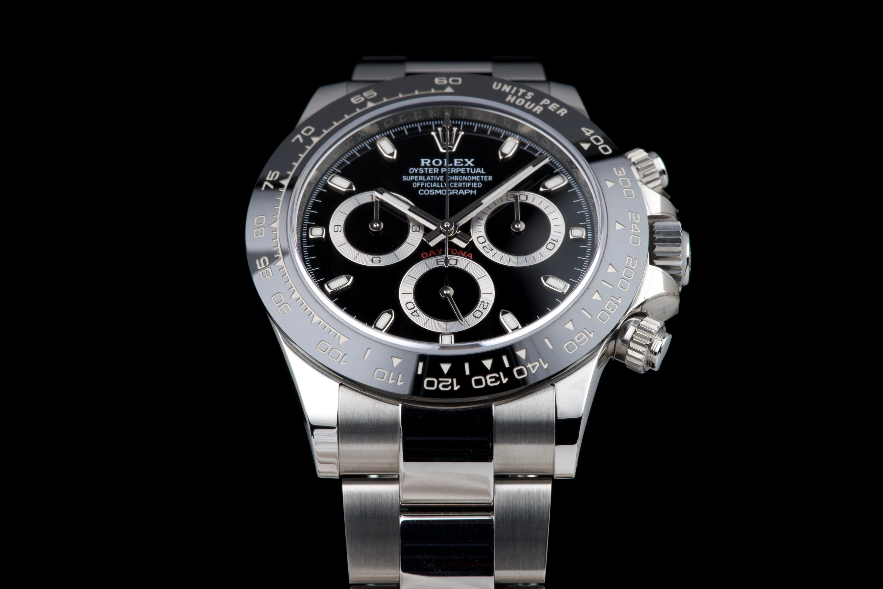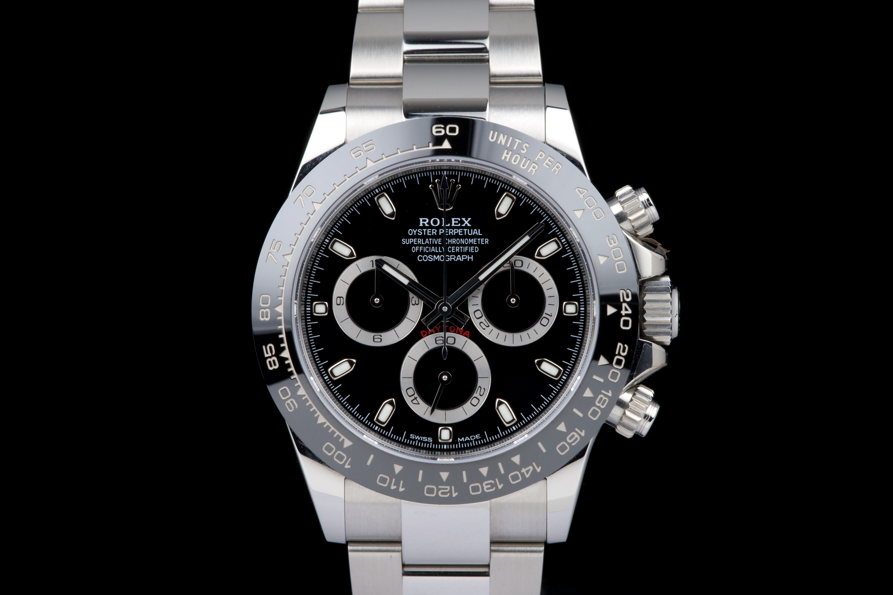 An exceptional and unworn example of the highly sought-after Rolex Cosmograph Daytona 116500LN with black dial. The watch retains several original factory stickers — on the clasp, the back of the case, and one on the lower crown guard — confirming its untouched condition. Featuring the iconic black ceramic Cerachrom bezel and the black lacquer dial with silver subdials, this 40 mm stainless steel Daytona is powered by the automatic Rolex caliber 4130, offering 72 hours of power reserve and chronograph precision certified as a Superlative Chronometer. Complete with its full 2020 set, including box, warranty card, booklets, and accessories. A truly collector-grade example of the modern Daytona — unworn, stickered, and in factory condition.
