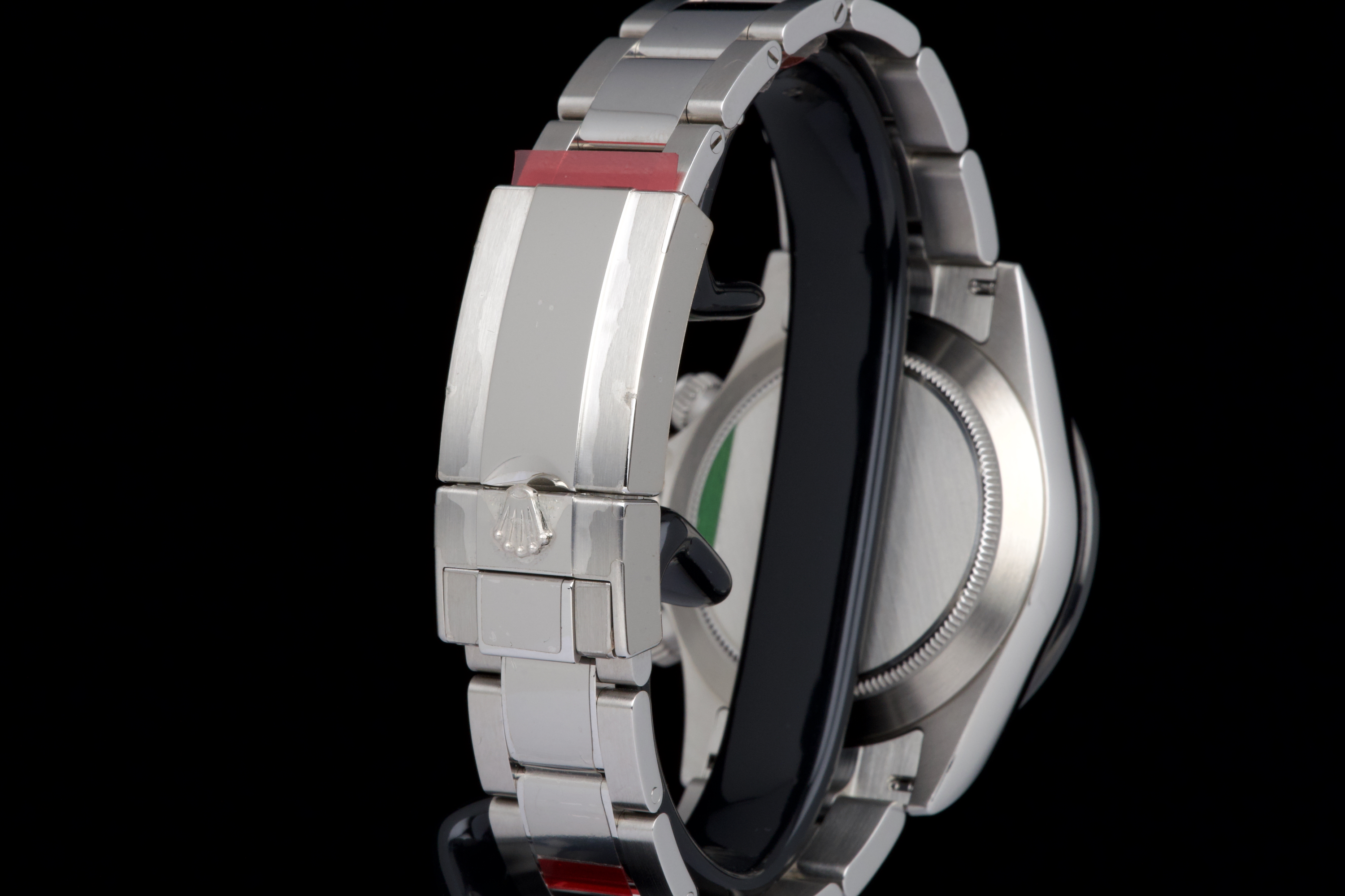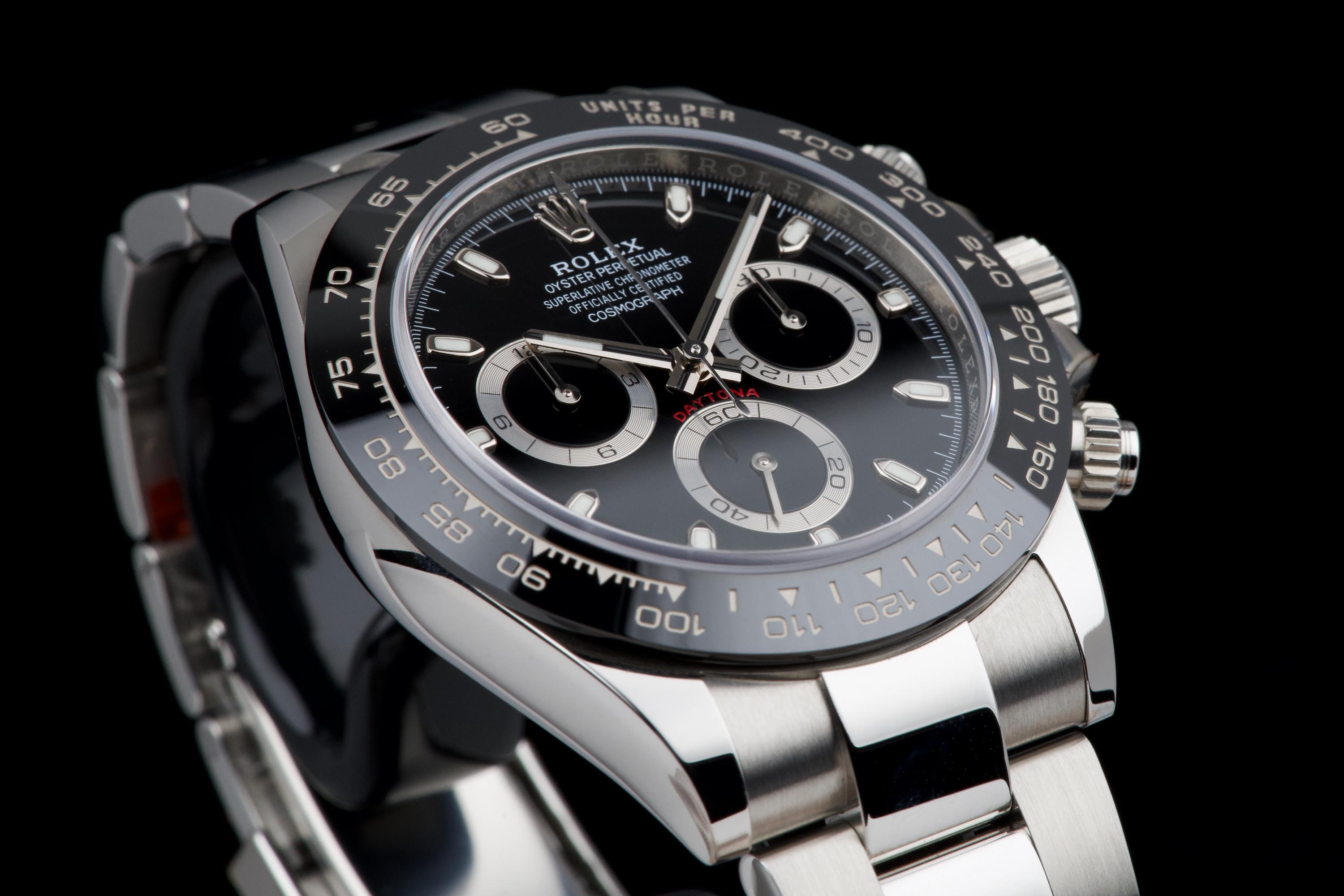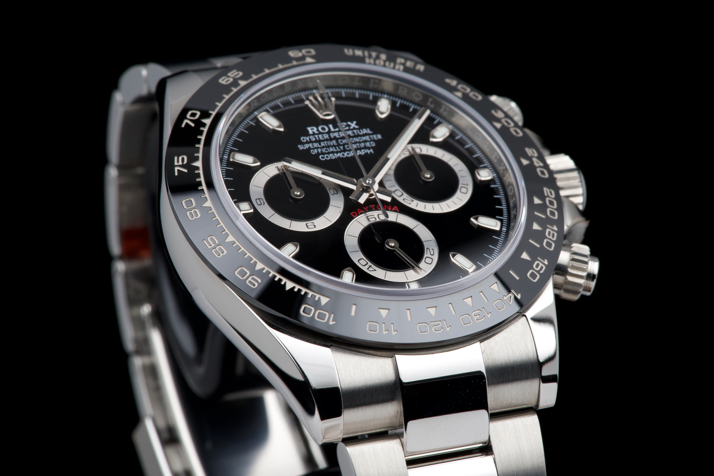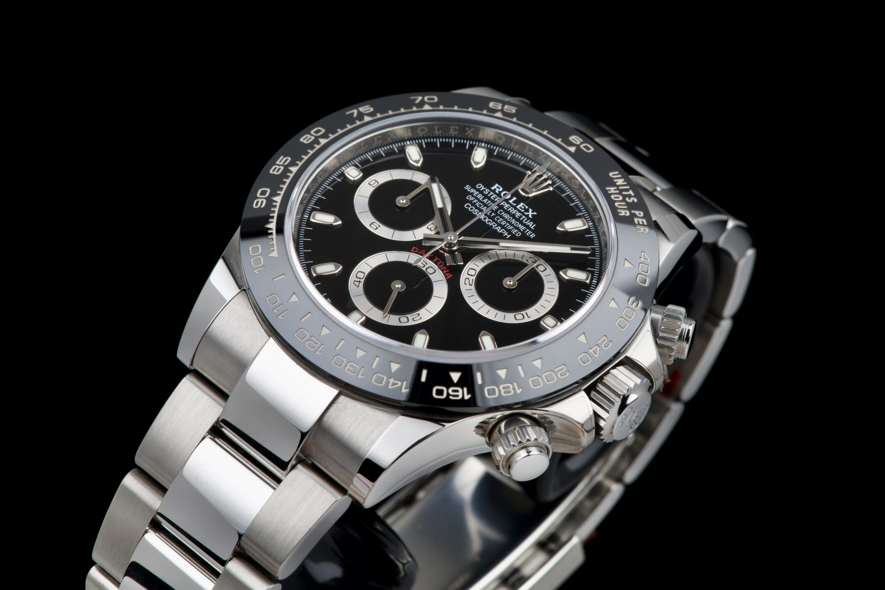 An exceptional and unworn example of the highly sought-after Rolex Cosmograph Daytona 116500LN with black dial. The watch retains several original factory stickers — on the clasp, the back of the case, and one on the lower crown guard — confirming its untouched condition. Featuring the iconic black ceramic Cerachrom bezel and the black lacquer dial with silver subdials, this 40 mm stainless steel Daytona is powered by the automatic Rolex caliber 4130, offering 72 hours of power reserve and chronograph precision certified as a Superlative Chronometer. Complete with its full 2020 set, including box, warranty card, booklets, and accessories. A truly collector-grade example of the modern Daytona — unworn, stickered, and in factory condition.