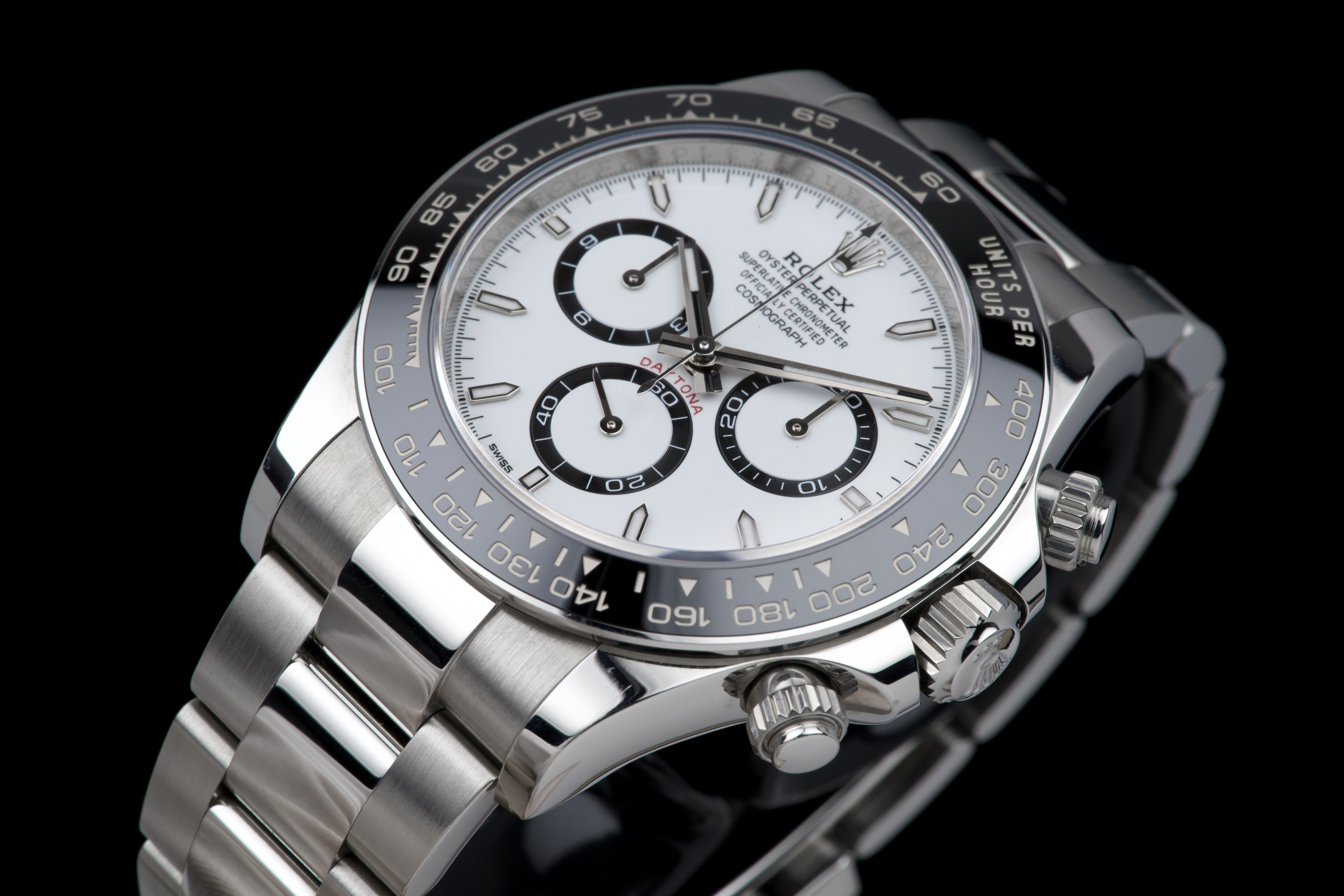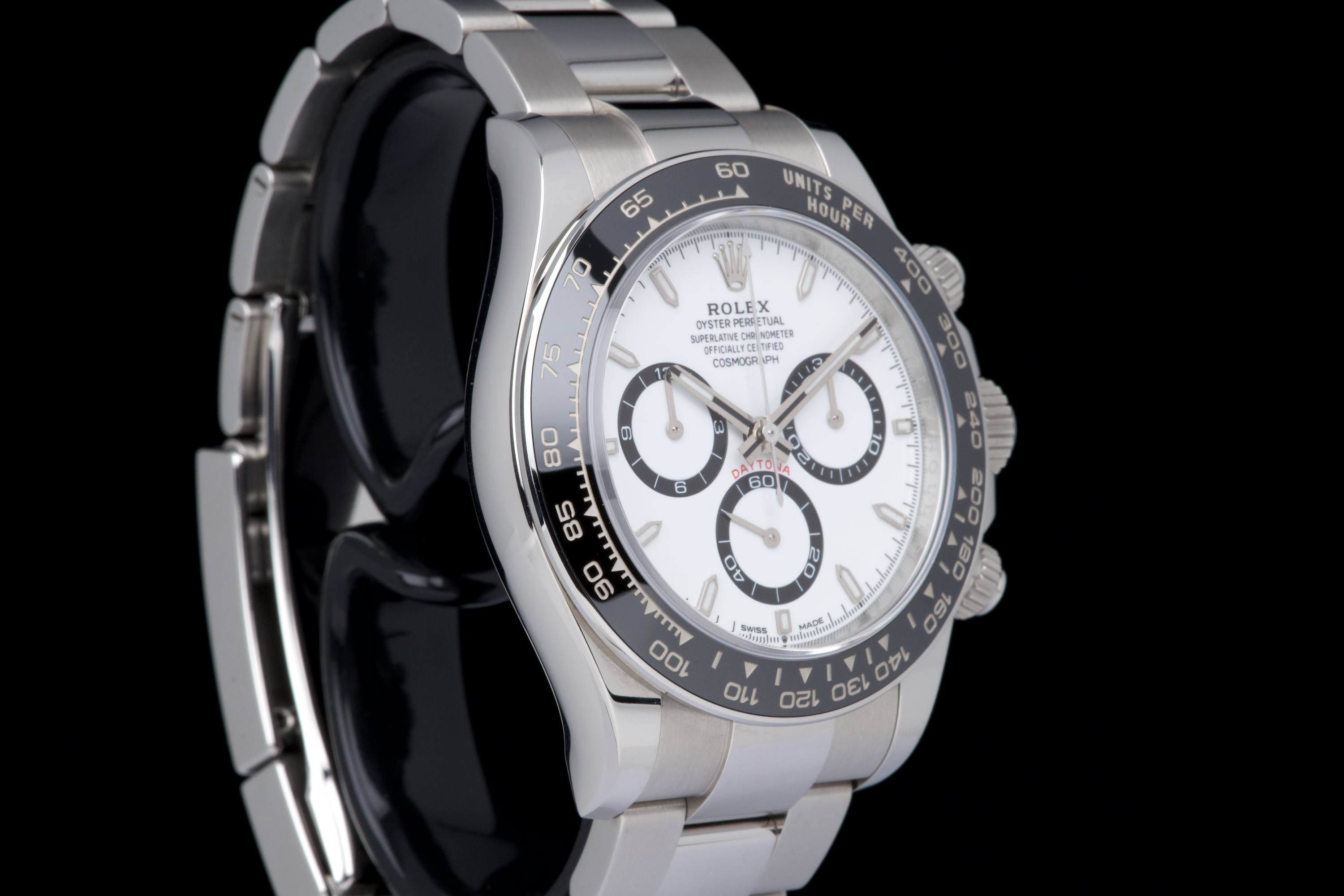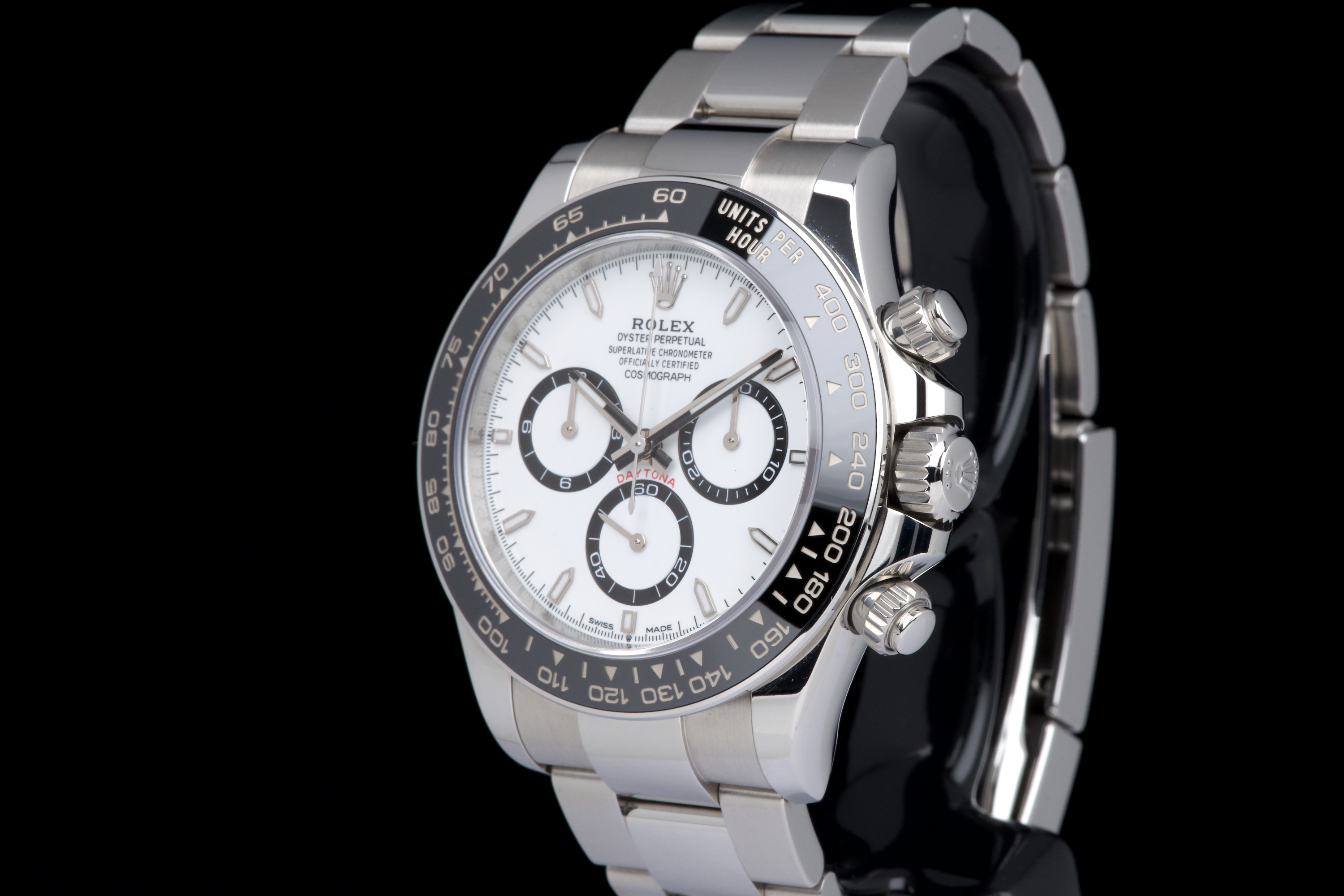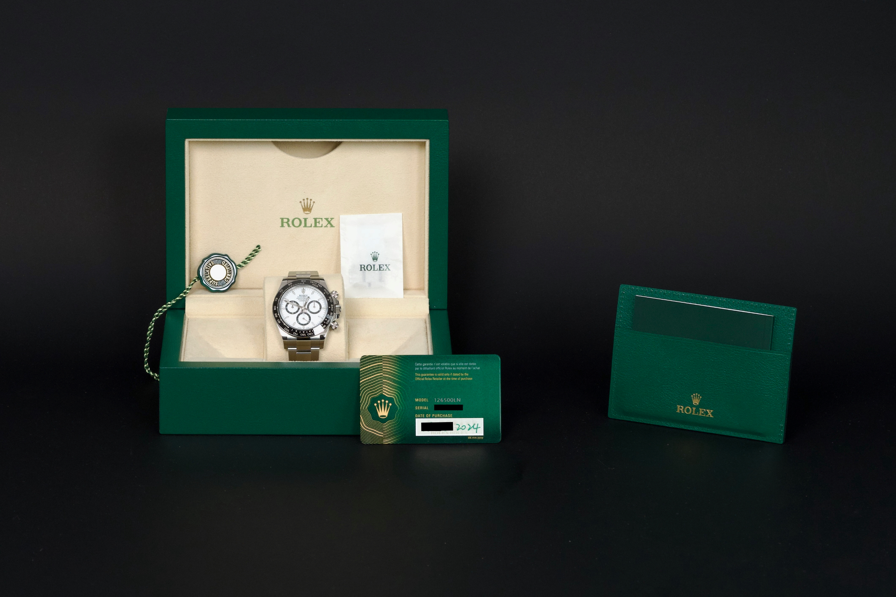 A beautiful example of the new-generation Rolex Cosmograph Daytona 126500LN, featuring the highly sought-after white “Panda” dial with black ceramic Cerachrom bezel. Purchased new in Switzerland by its original owner, this watch remains unpolished and shows only light wear from careful use. The stainless steel case and Oyster bracelet retain their crisp lines and superb proportions. Powered by the latest Rolex caliber 4131, offering a 72-hour power reserve and certified Superlative Chronometer precision. Comes with its original box, warranty card, and accessories, though the Daytona booklet and outer packaging are not included. A superb and honest example of the latest Daytona reference — elegant, precise, and instantly recognizable.