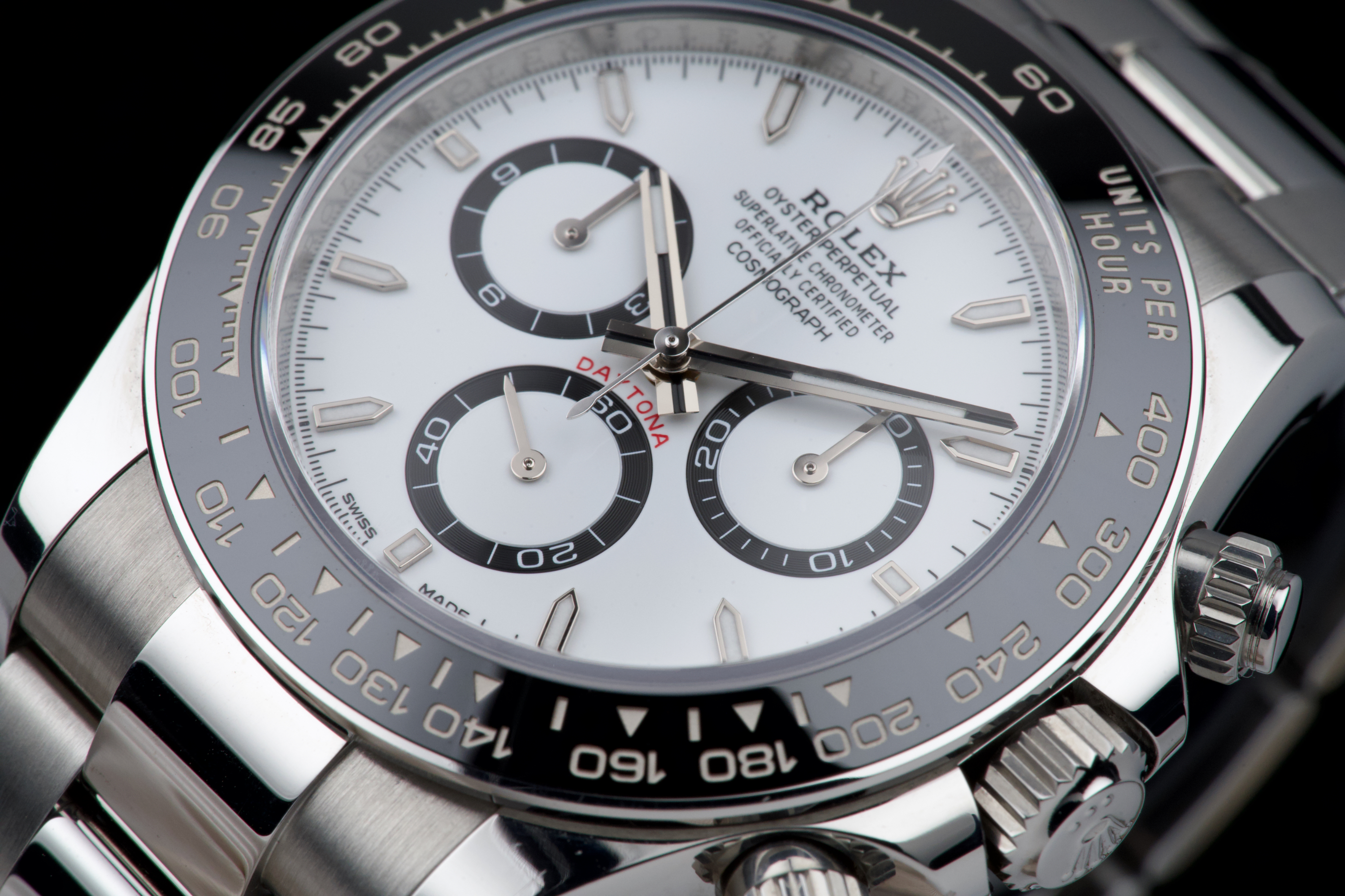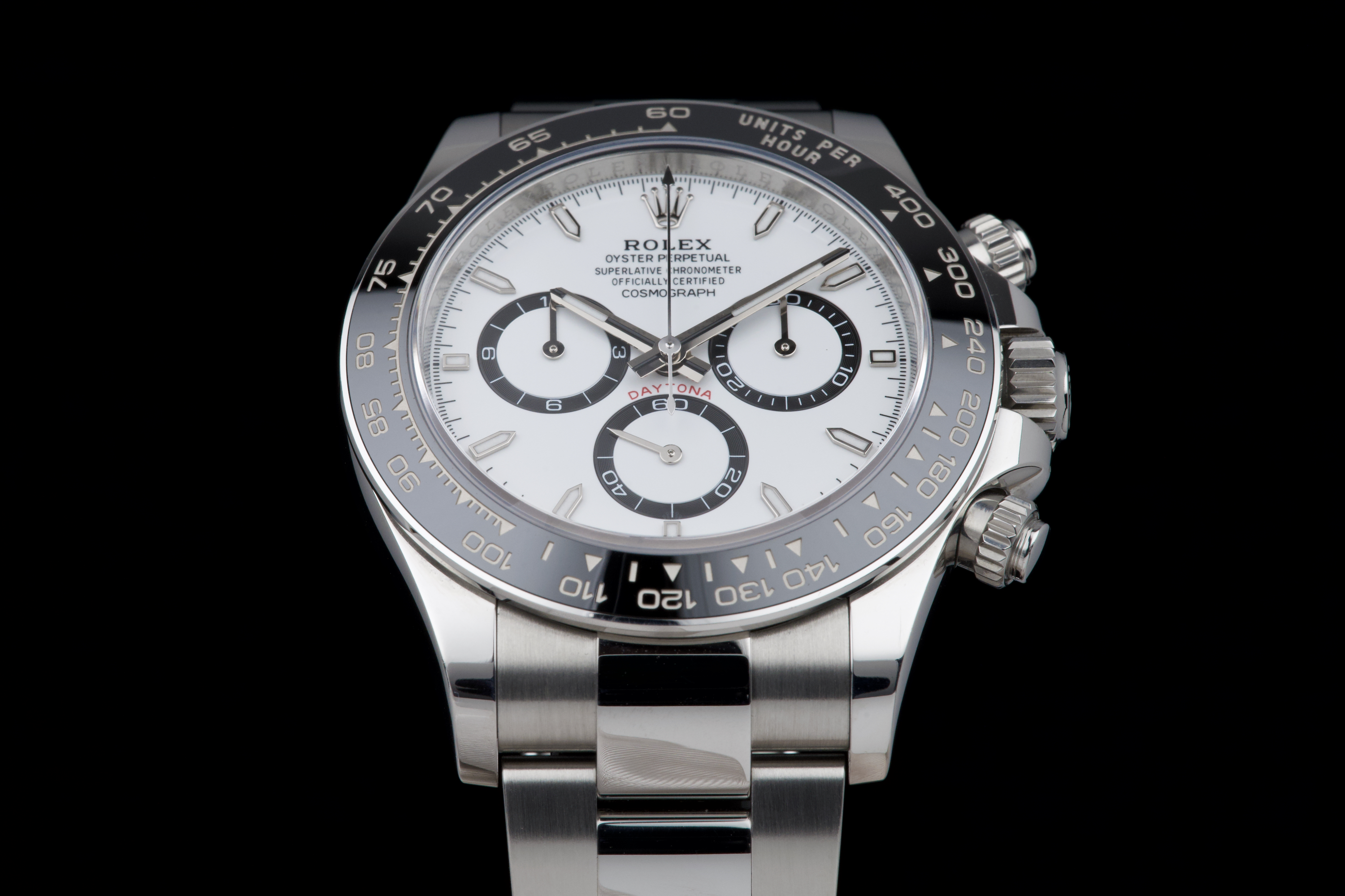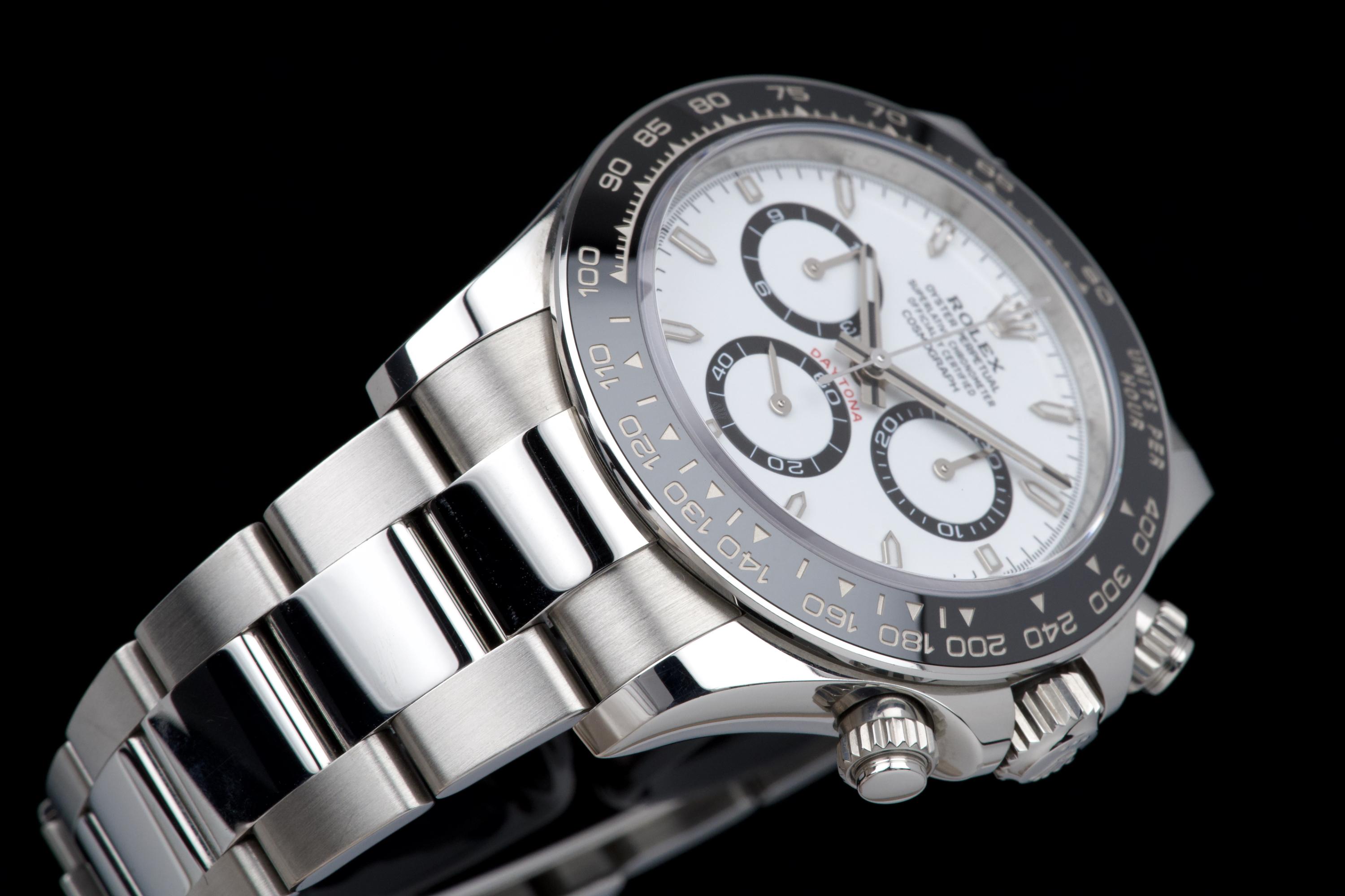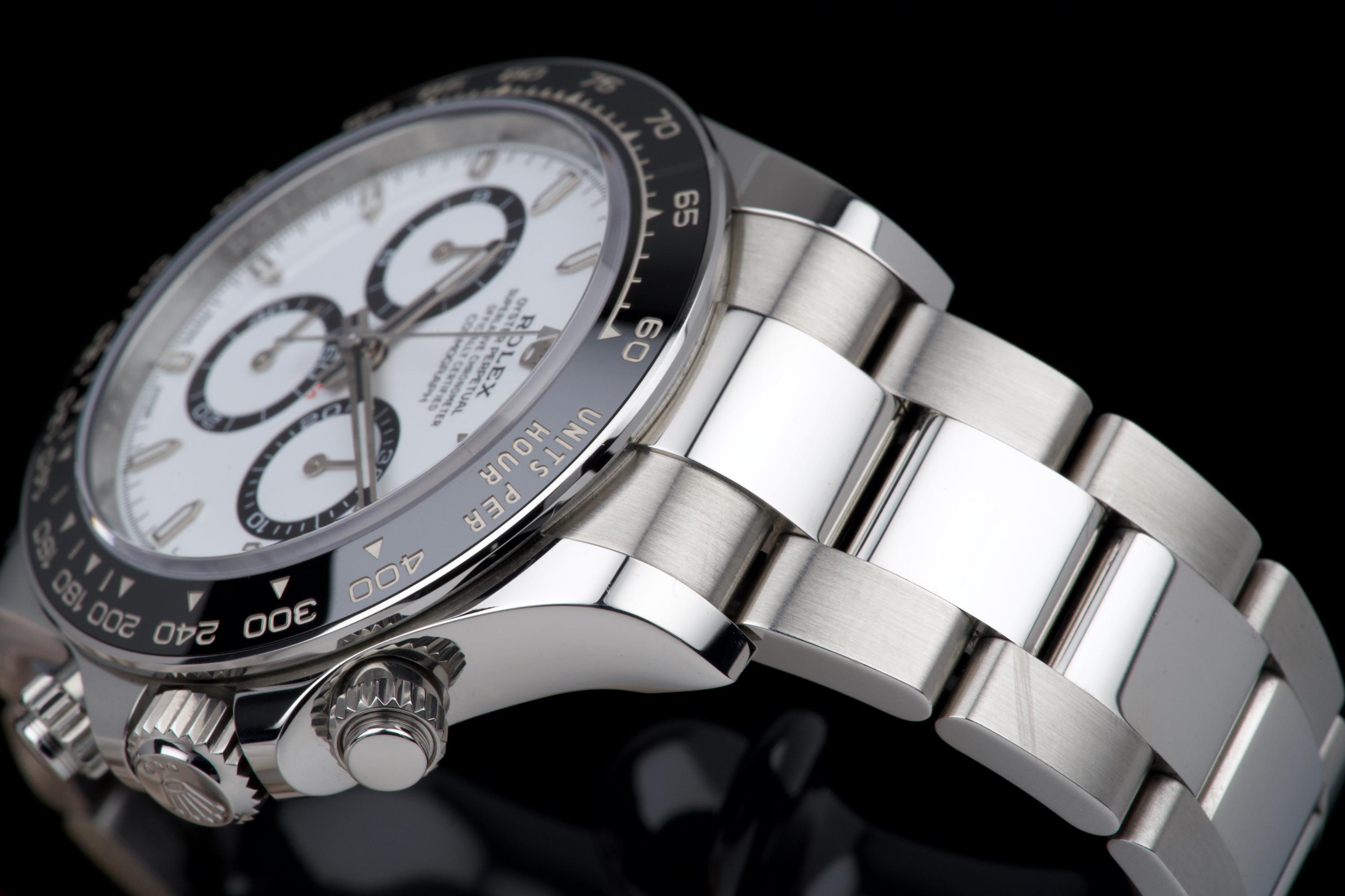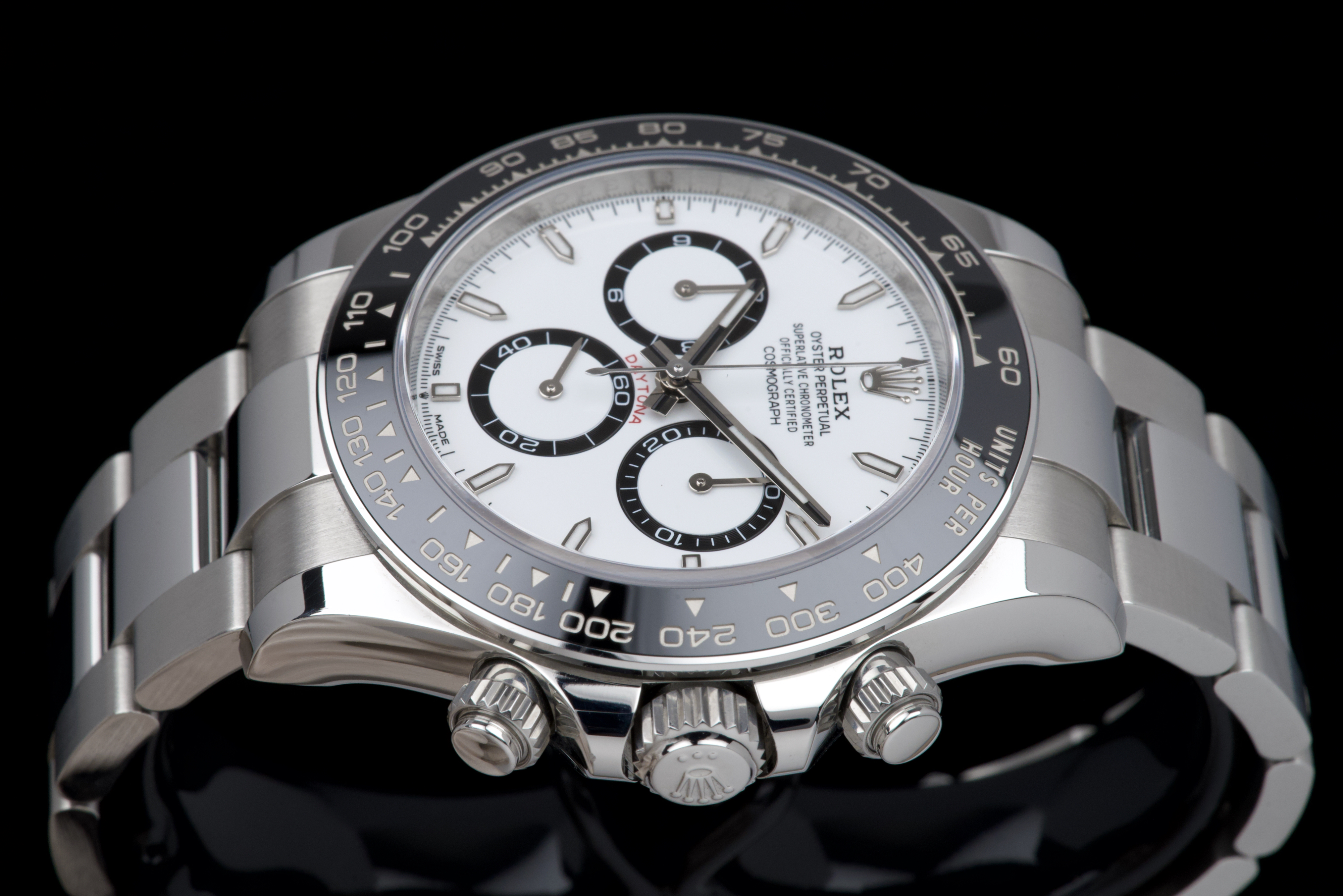 A beautiful example of the new-generation Rolex Cosmograph Daytona 126500LN, featuring the highly sought-after white “Panda” dial with black ceramic Cerachrom bezel. Purchased new in Switzerland by its original owner, this watch remains unpolished and shows only light wear from careful use. The stainless steel case and Oyster bracelet retain their crisp lines and superb proportions. Powered by the latest Rolex caliber 4131, offering a 72-hour power reserve and certified Superlative Chronometer precision. Comes with its original box, warranty card, and accessories, though the Daytona booklet and outer packaging are not included. A superb and honest example of the latest Daytona reference — elegant, precise, and instantly recognizable.