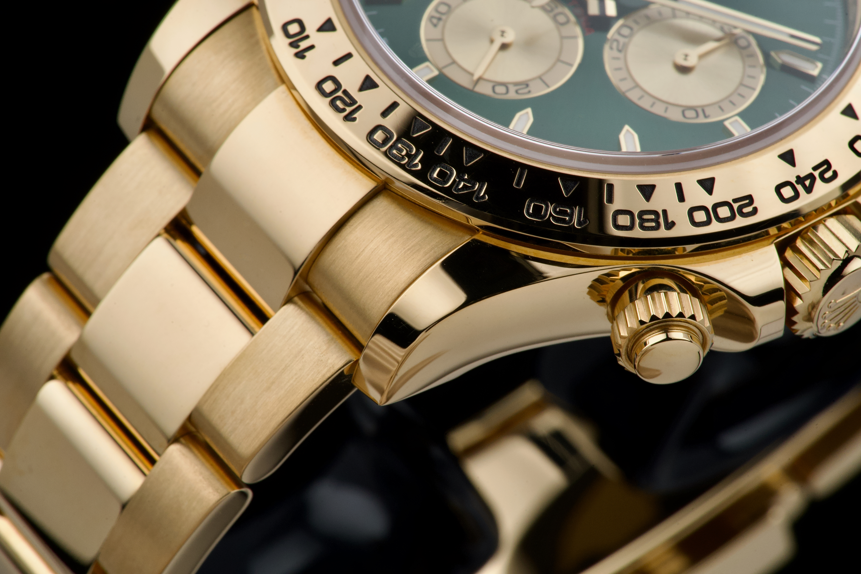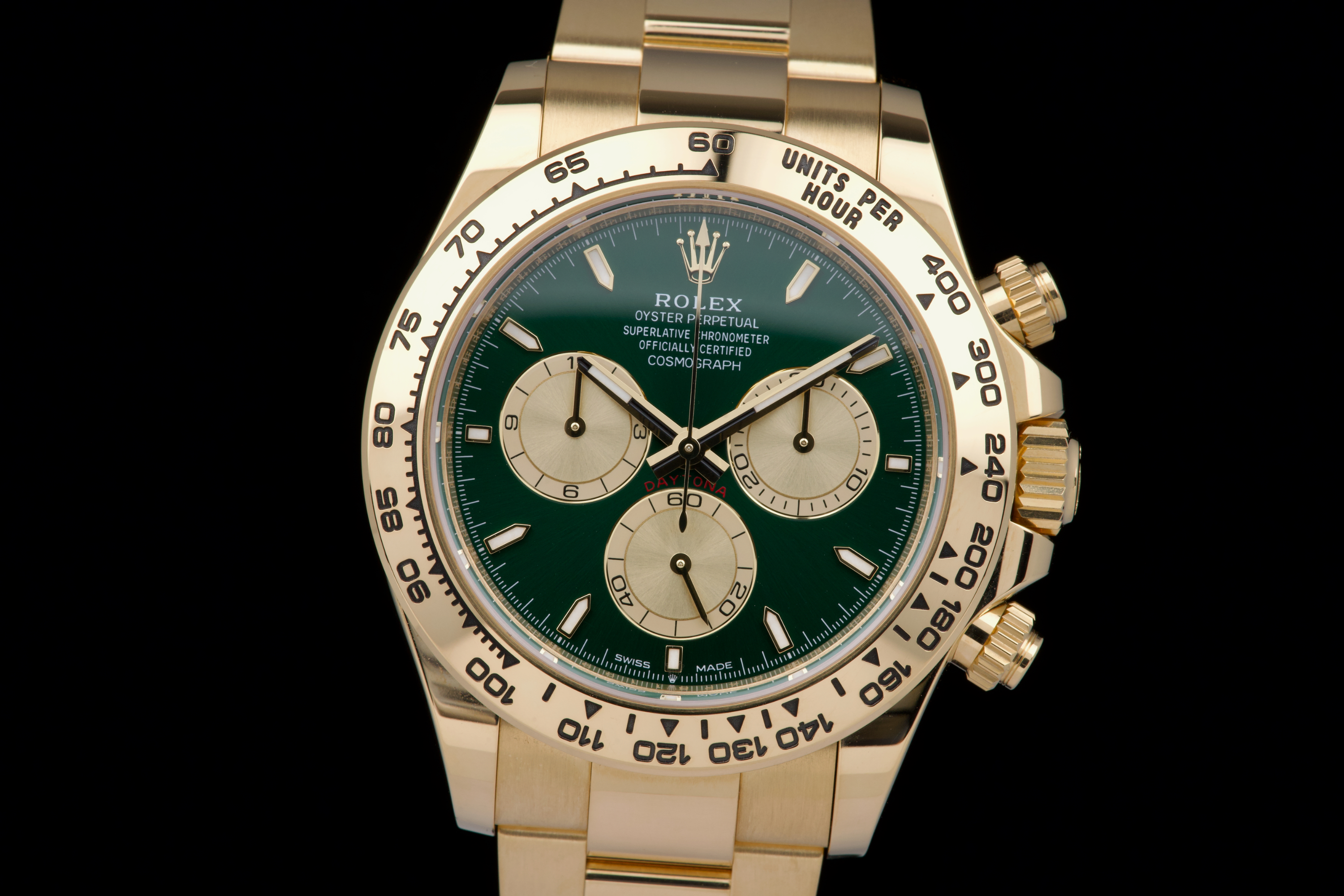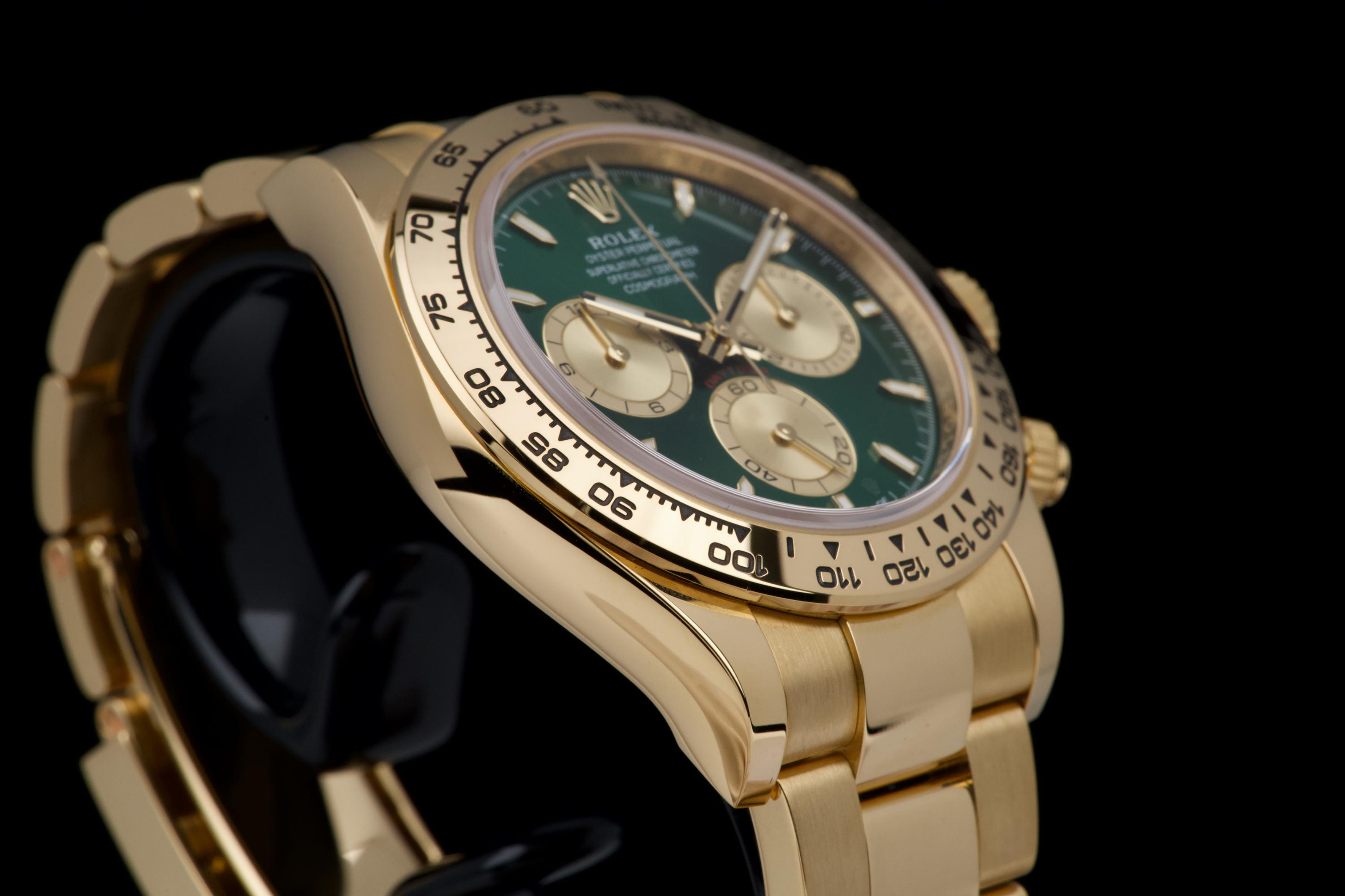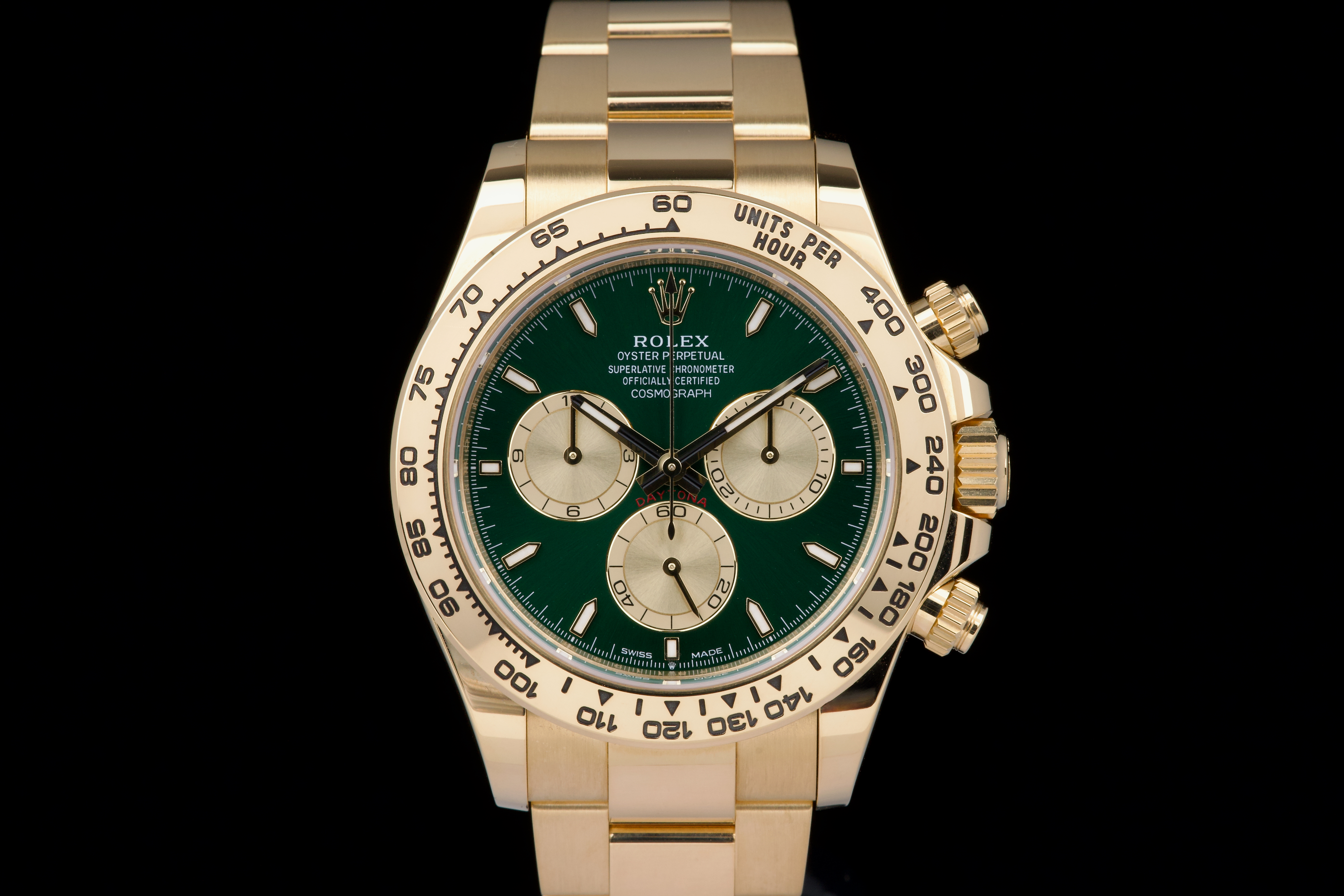 The present Rolex Cosmograph Daytona reference 126508 in 18K yellow gold, fitted with the highly desirable green dial, is offered here as a complete full set from its first owner. Dated 2025, this modern Daytona represents one of the most sought-after contemporary configurations of the model, combining the iconic Daytona design with a bold and instantly recognizable dial colour. The watch has been carefully refreshed by our watchmaker and is presented in excellent overall condition, retaining sharp lines and a superb finish throughout. The green dial is flawless, offering a striking contrast to the warmth of the yellow-gold case and bracelet, and reinforcing the strong visual identity that has made this reference so collectible. Delivered as a full set and preserved in outstanding condition, this Daytona 126508 offers an exceptional opportunity to acquire a current-production Rolex sports chronograph in one of its most desirable executions, with impeccable provenance and immediate wearability.