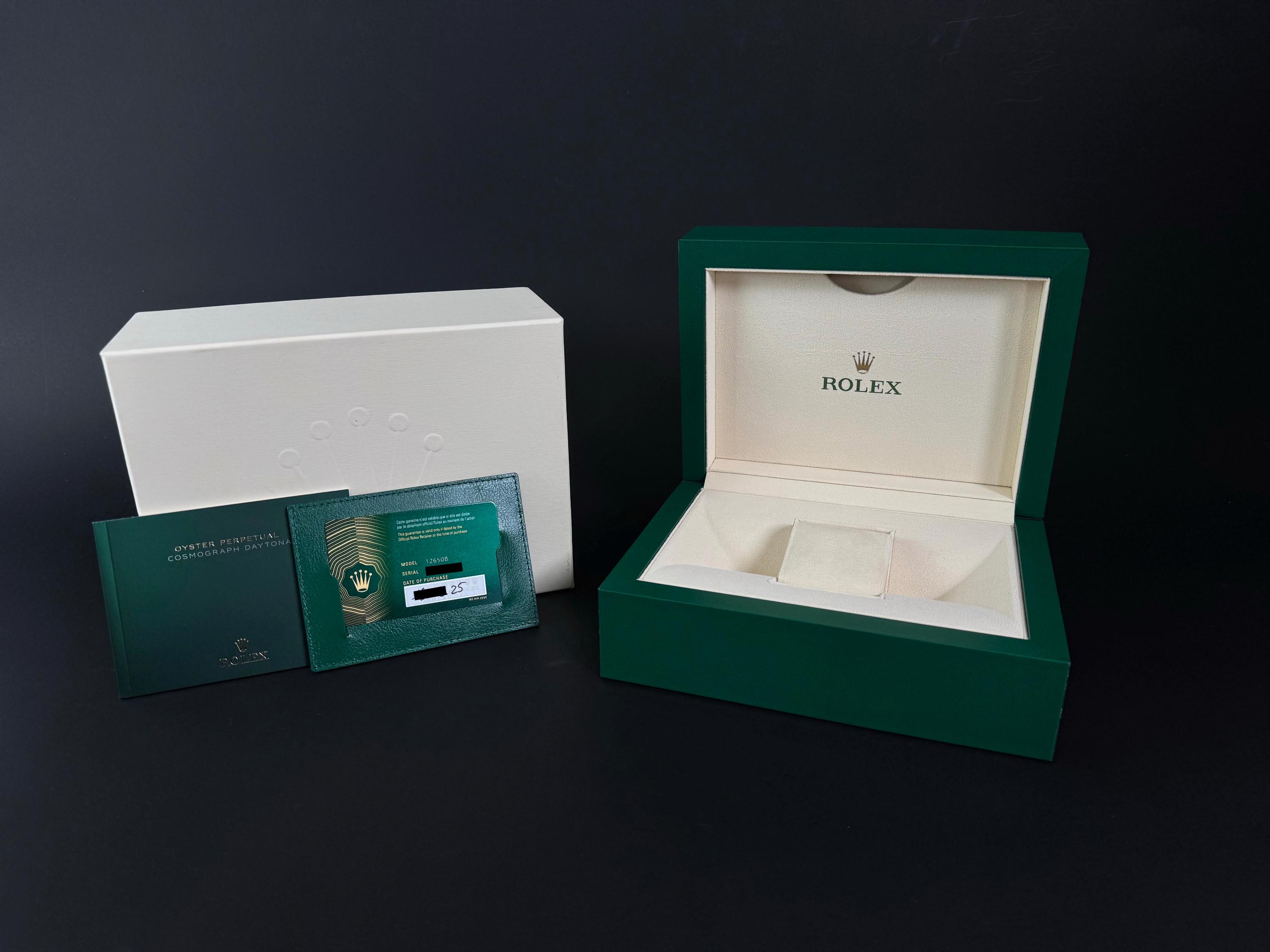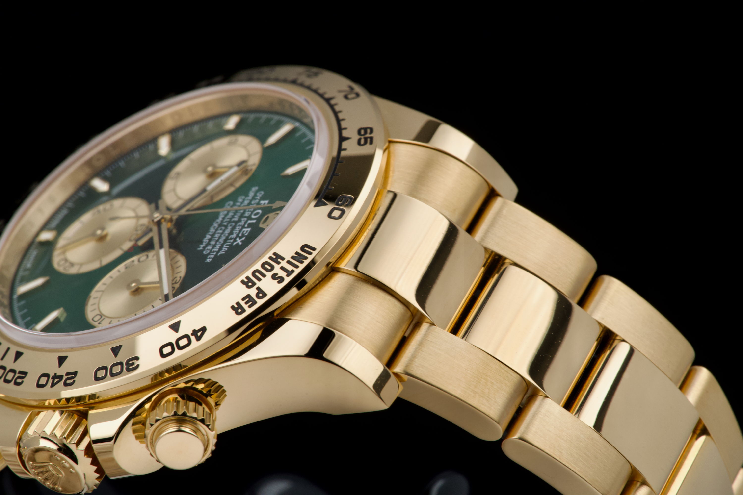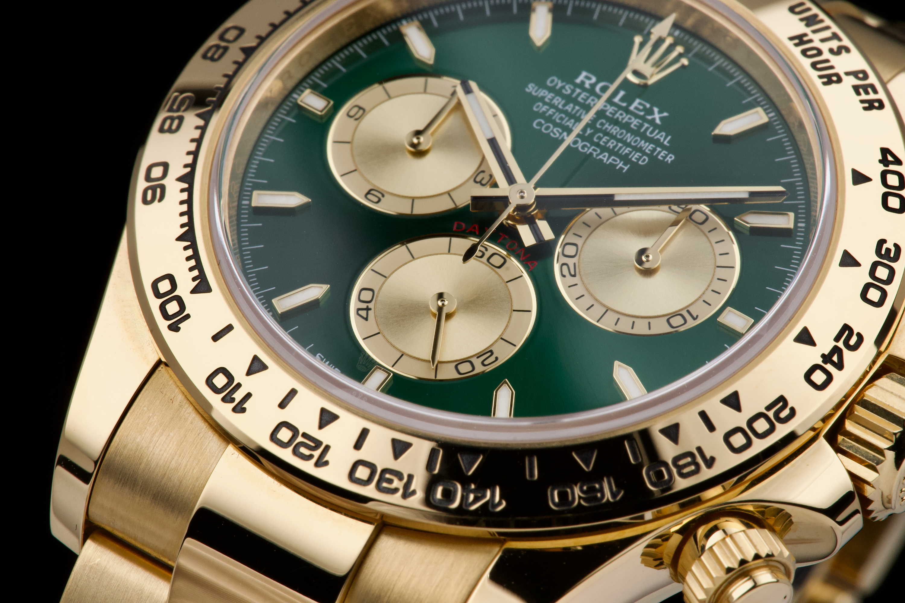 The present Rolex Cosmograph Daytona reference 126508 in 18K yellow gold, fitted with the highly desirable green dial, is offered here as a complete full set from its first owner. Dated 2025, this modern Daytona represents one of the most sought-after contemporary configurations of the model, combining the iconic Daytona design with a bold and instantly recognizable dial colour. The watch has been carefully refreshed by our watchmaker and is presented in excellent overall condition, retaining sharp lines and a superb finish throughout. The green dial is flawless, offering a striking contrast to the warmth of the yellow-gold case and bracelet, and reinforcing the strong visual identity that has made this reference so collectible. Delivered as a full set and preserved in outstanding condition, this Daytona 126508 offers an exceptional opportunity to acquire a current-production Rolex sports chronograph in one of its most desirable executions, with impeccable provenance and immediate wearability.