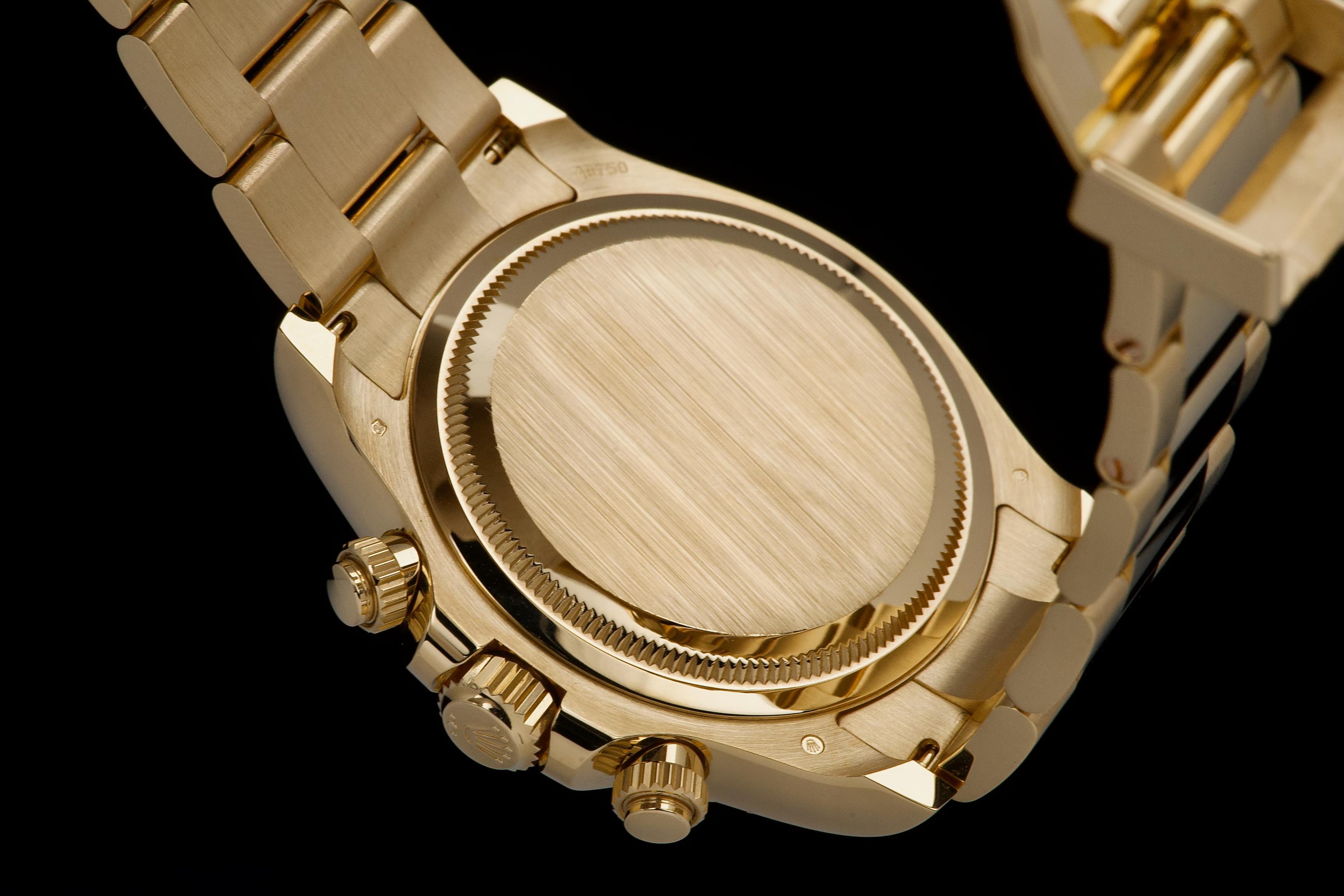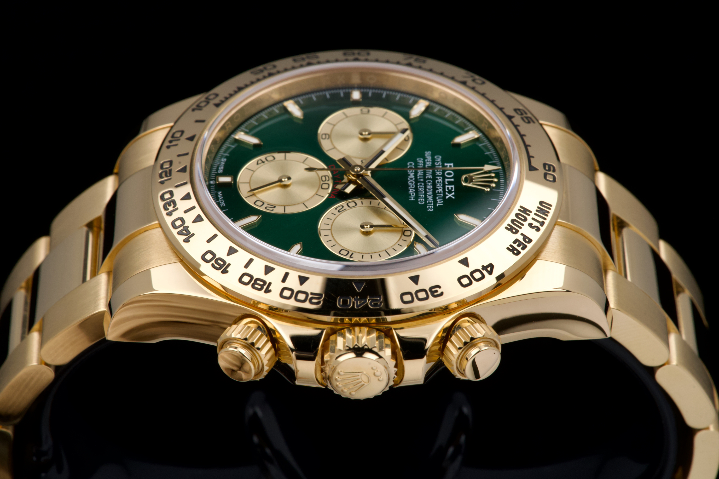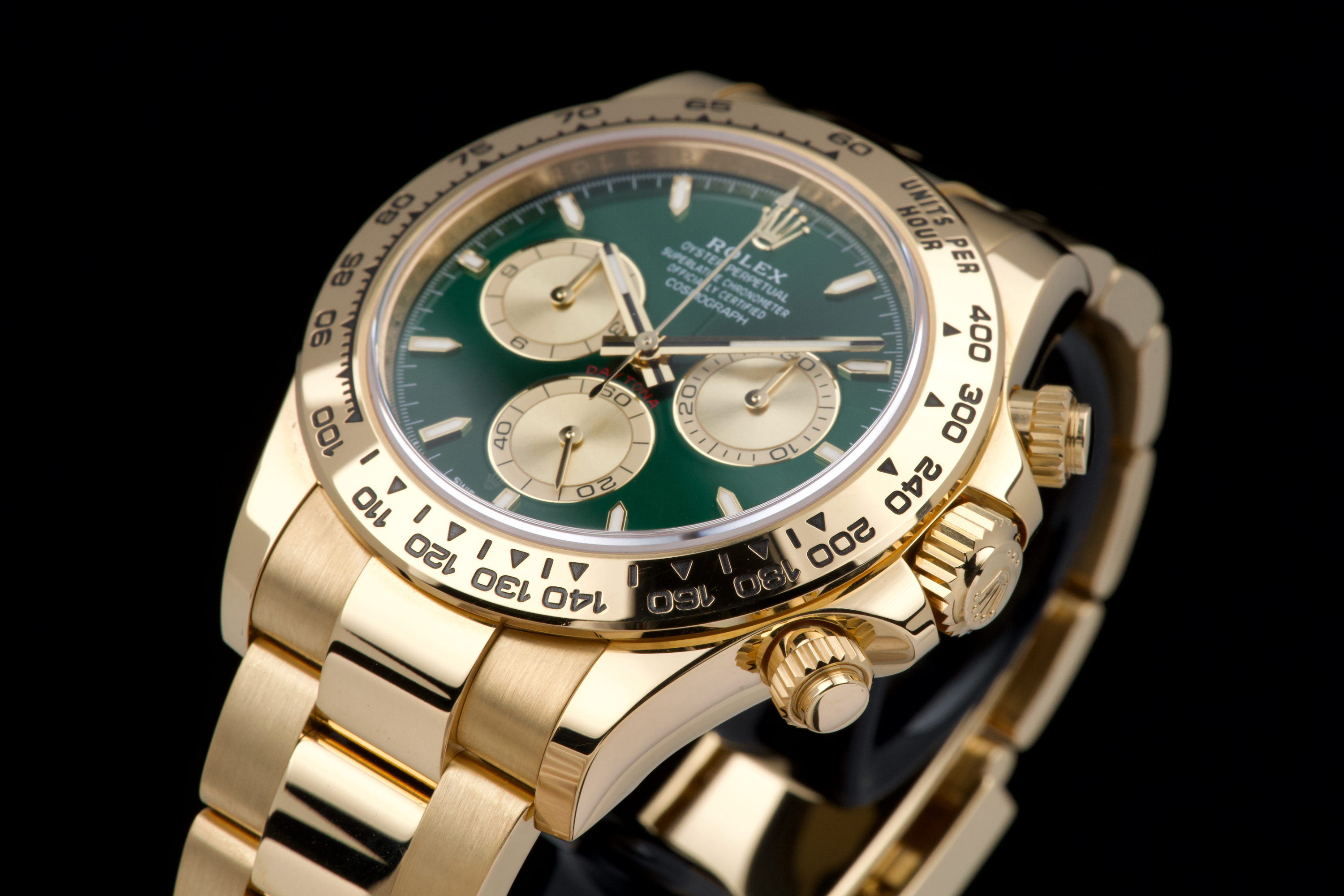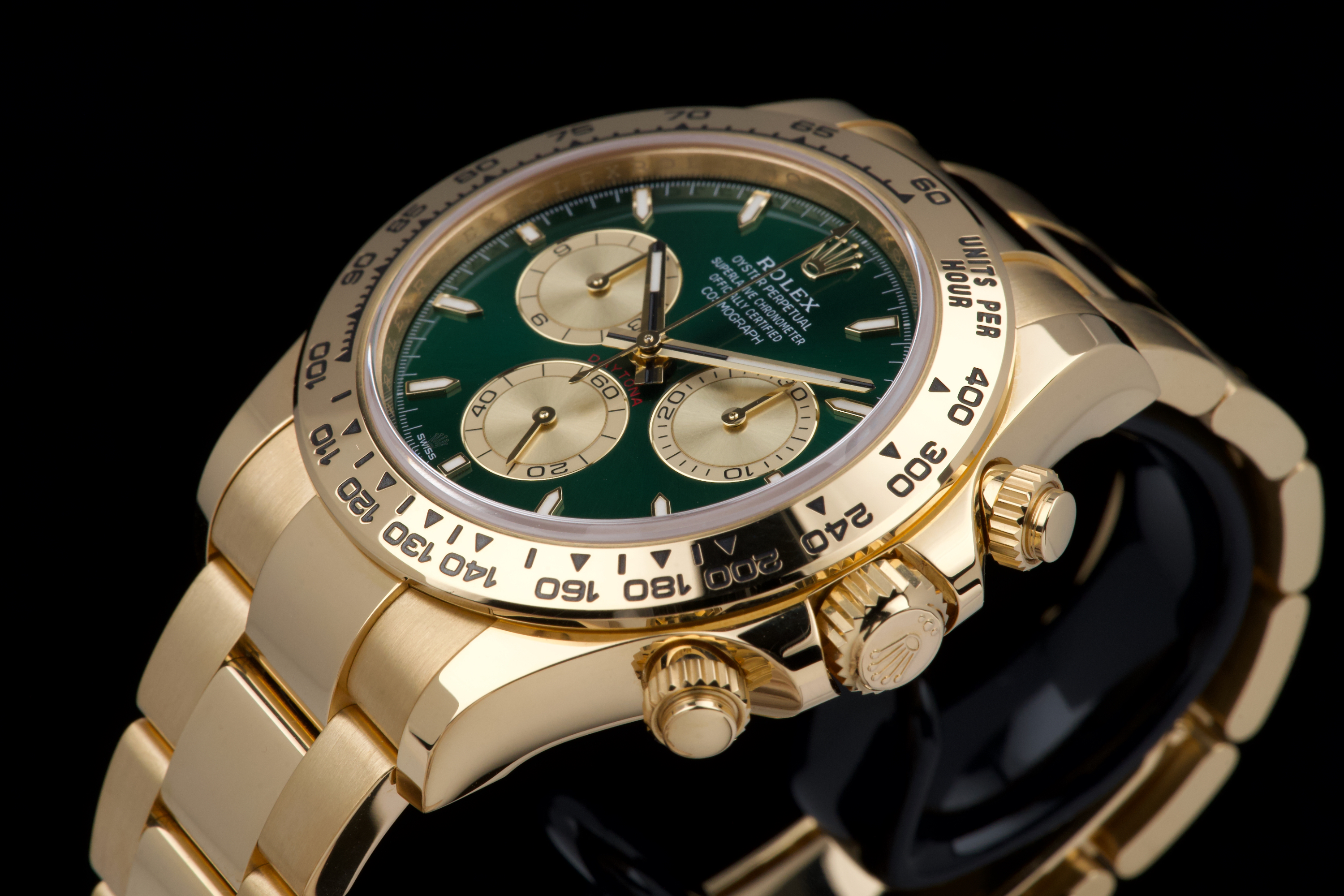 The present Rolex Cosmograph Daytona reference 126508 in 18K yellow gold, fitted with the highly desirable green dial, is offered here as a complete full set from its first owner. Dated 2025, this modern Daytona represents one of the most sought-after contemporary configurations of the model, combining the iconic Daytona design with a bold and instantly recognizable dial colour. The watch has been carefully refreshed by our watchmaker and is presented in excellent overall condition, retaining sharp lines and a superb finish throughout. The green dial is flawless, offering a striking contrast to the warmth of the yellow-gold case and bracelet, and reinforcing the strong visual identity that has made this reference so collectible. Delivered as a full set and preserved in outstanding condition, this Daytona 126508 offers an exceptional opportunity to acquire a current-production Rolex sports chronograph in one of its most desirable executions, with impeccable provenance and immediate wearability.