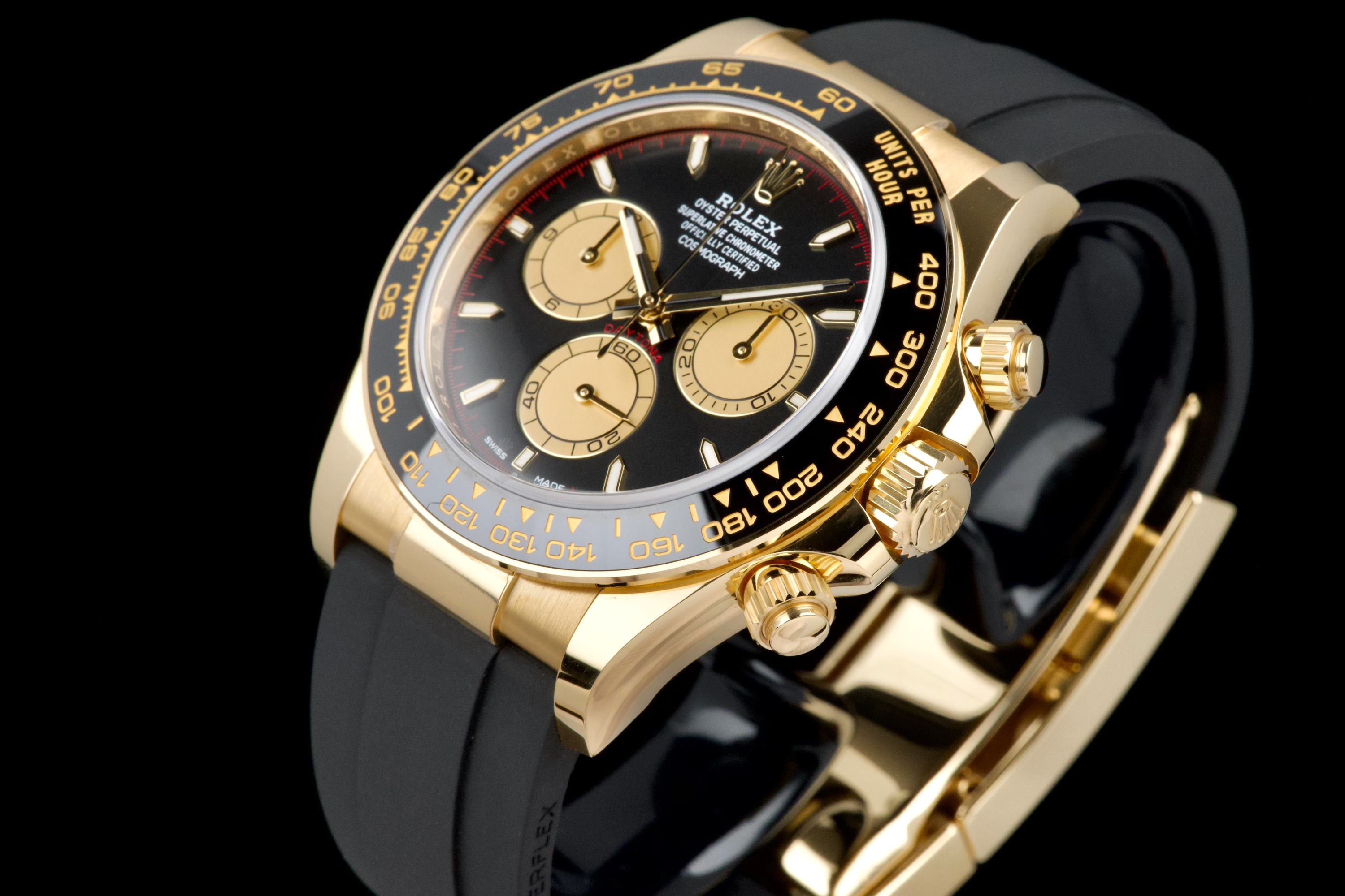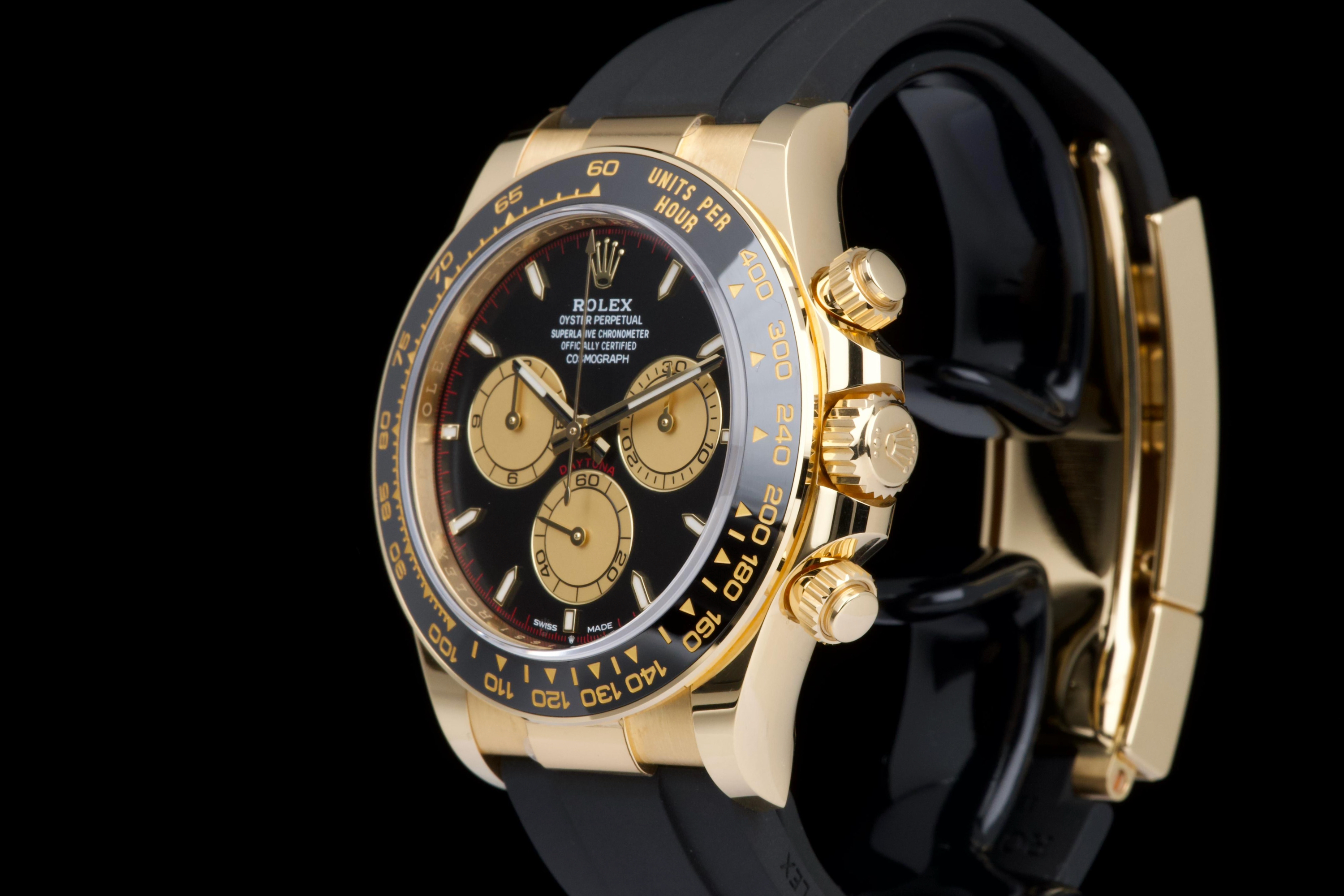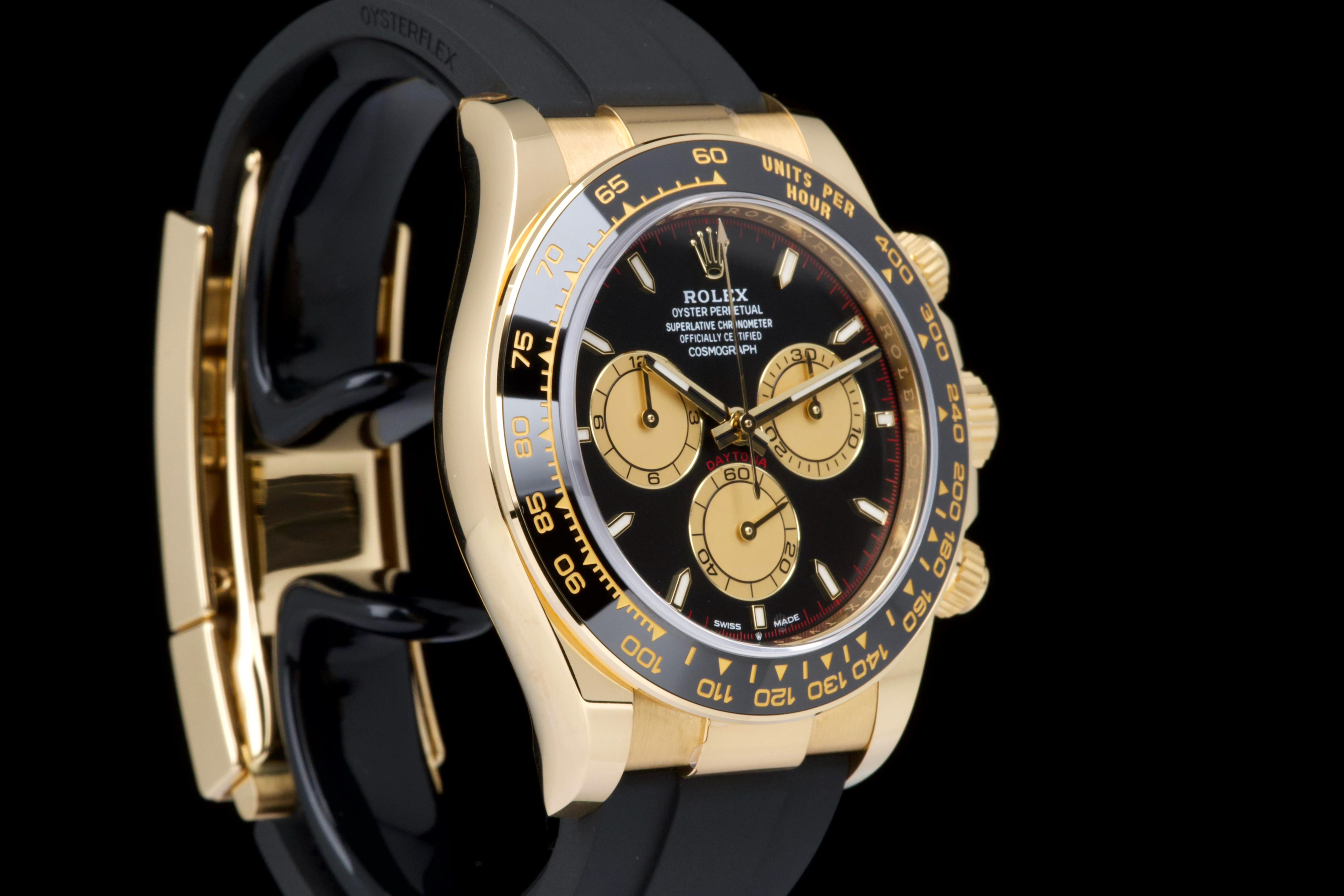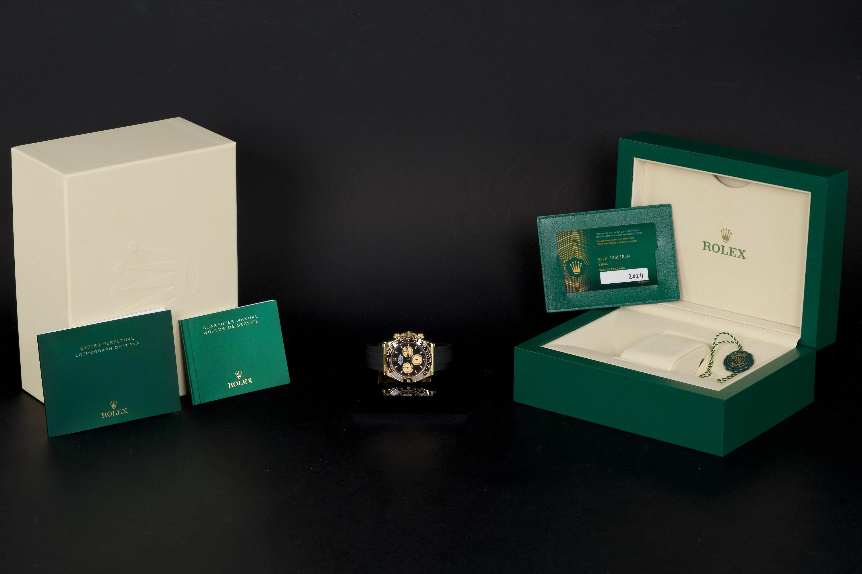 The present Rolex Cosmograph Daytona reference 126518LN, fitted with the highly desirable black “Paul Newman” style dial, is offered here as a complete full set and dates to 2024. Executed in 18K yellow gold and paired with the Oysterflex bracelet, this modern Daytona combines contemporary performance with a dial configuration that pays homage to the brand’s most iconic vintage aesthetics. This example has been worn only once and remains in virtually new condition, with several factory protective stickers still in place. The case, bezel, and clasp present flawlessly, reflecting minimal handling and careful ownership. The striking black dial features contrasting sub-dials inspired by the legendary “Paul Newman” Daytonas, offering exceptional legibility and a bold, motorsport-inspired character. The watch is fitted with Rolex’s innovative Oysterflex rubber bracelet, providing both comfort and durability while maintaining the refined presence of a precious-metal Daytona. Powered by Rolex’s latest-generation automatic chronograph calibre 4131, the watch benefits from modern technical improvements, including enhanced finishing and optimized performance. Delivered as a full set from 2024 and preserved in near-new condition, this Daytona 126518LN represents a compelling opportunity to acquire one of Rolex’s most sought-after current-production models with immediate wearability and strong collector appeal.