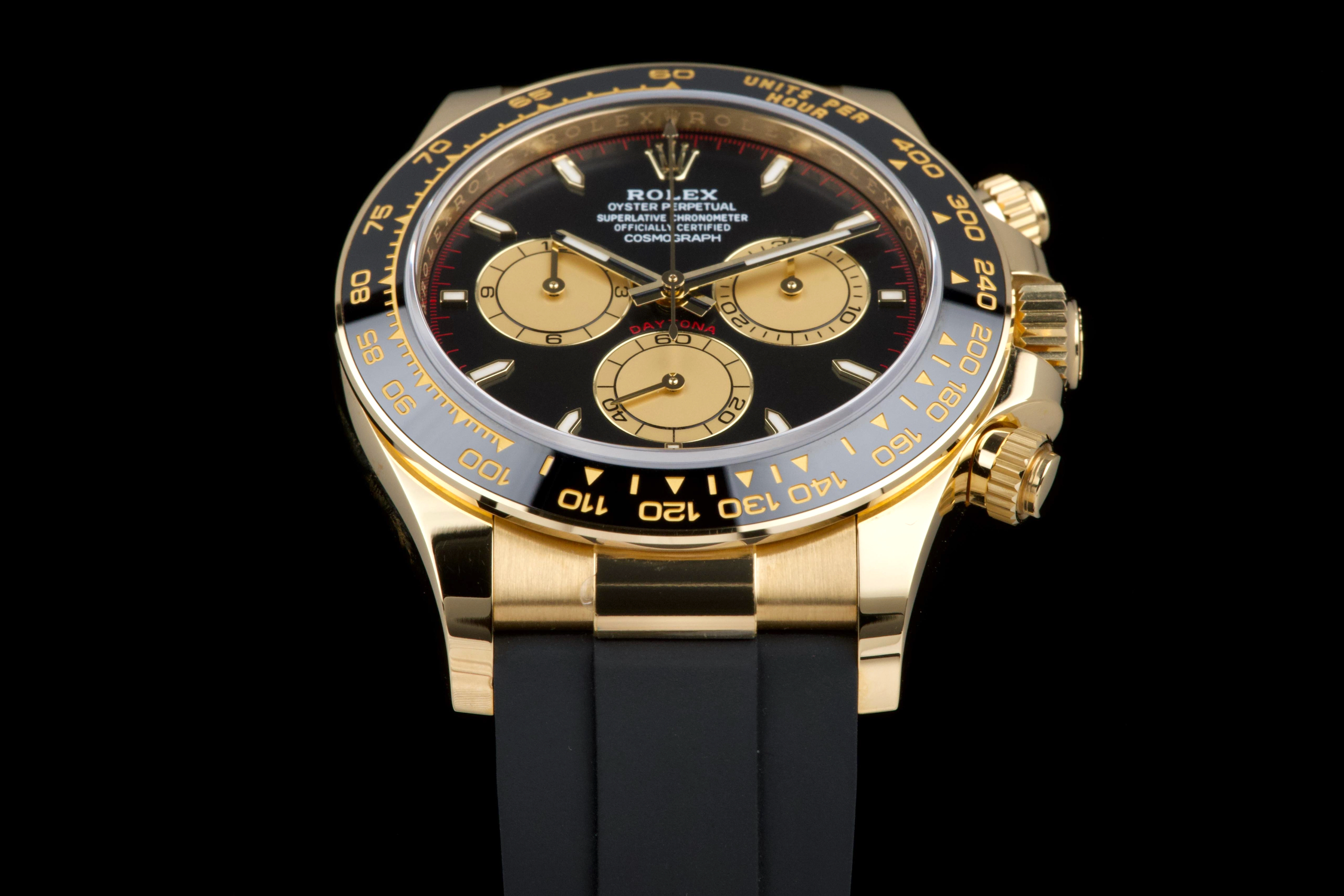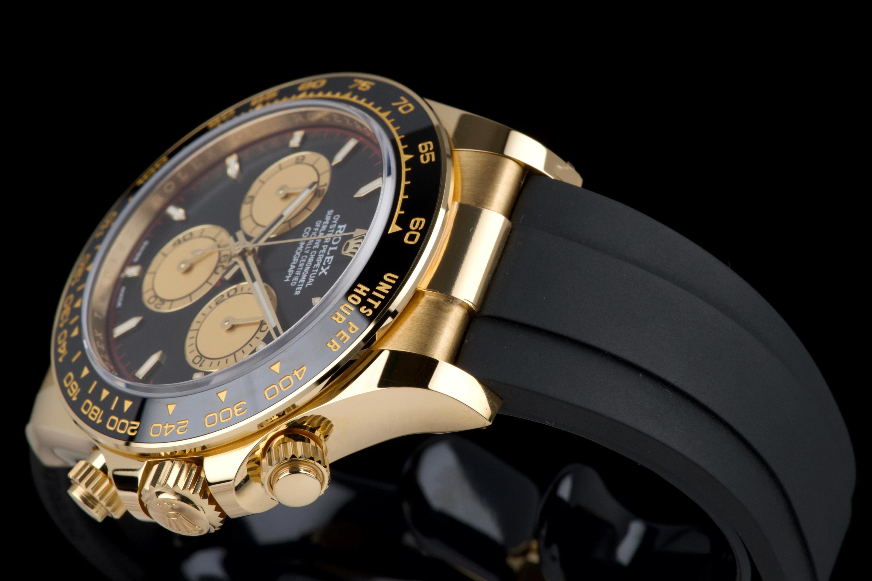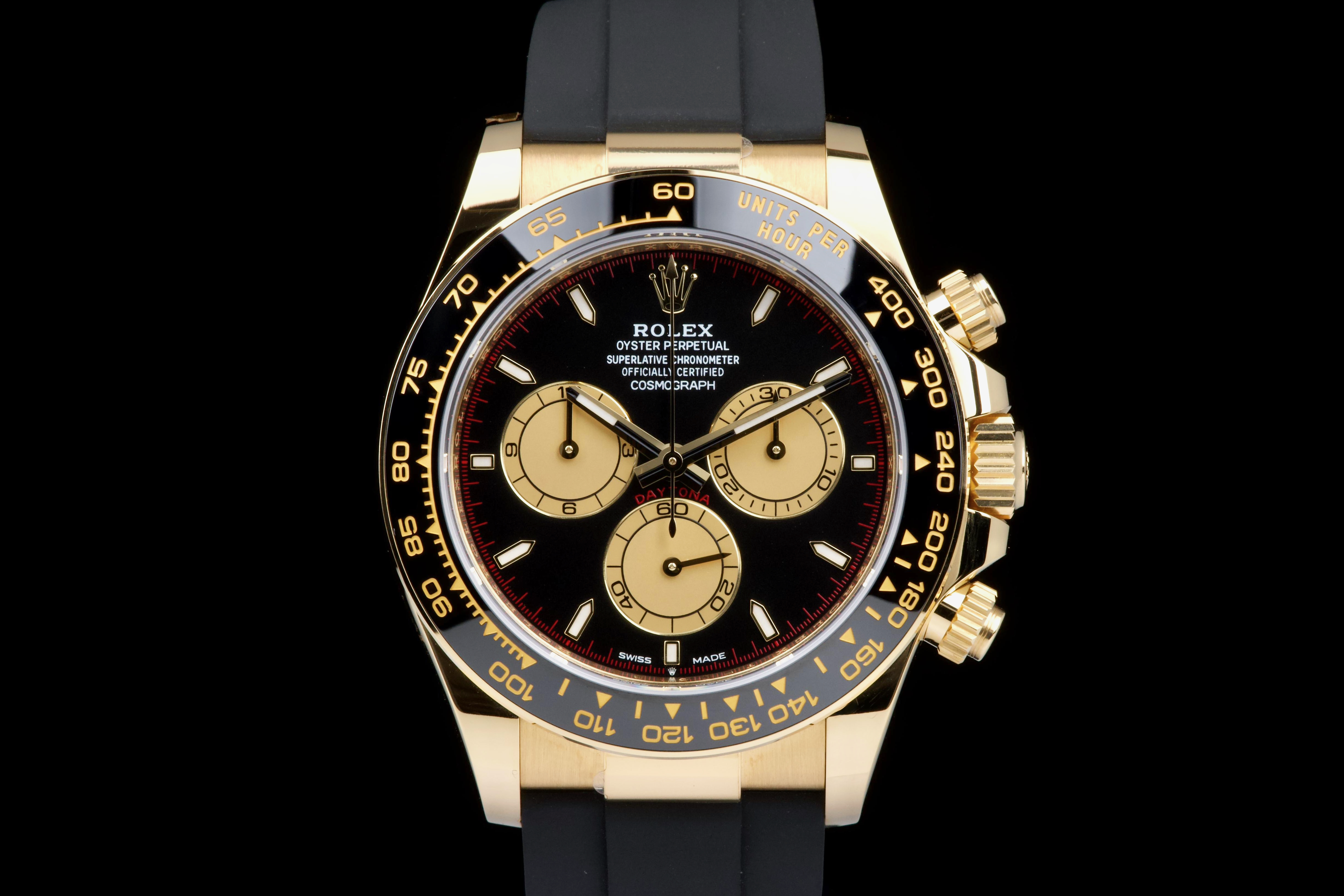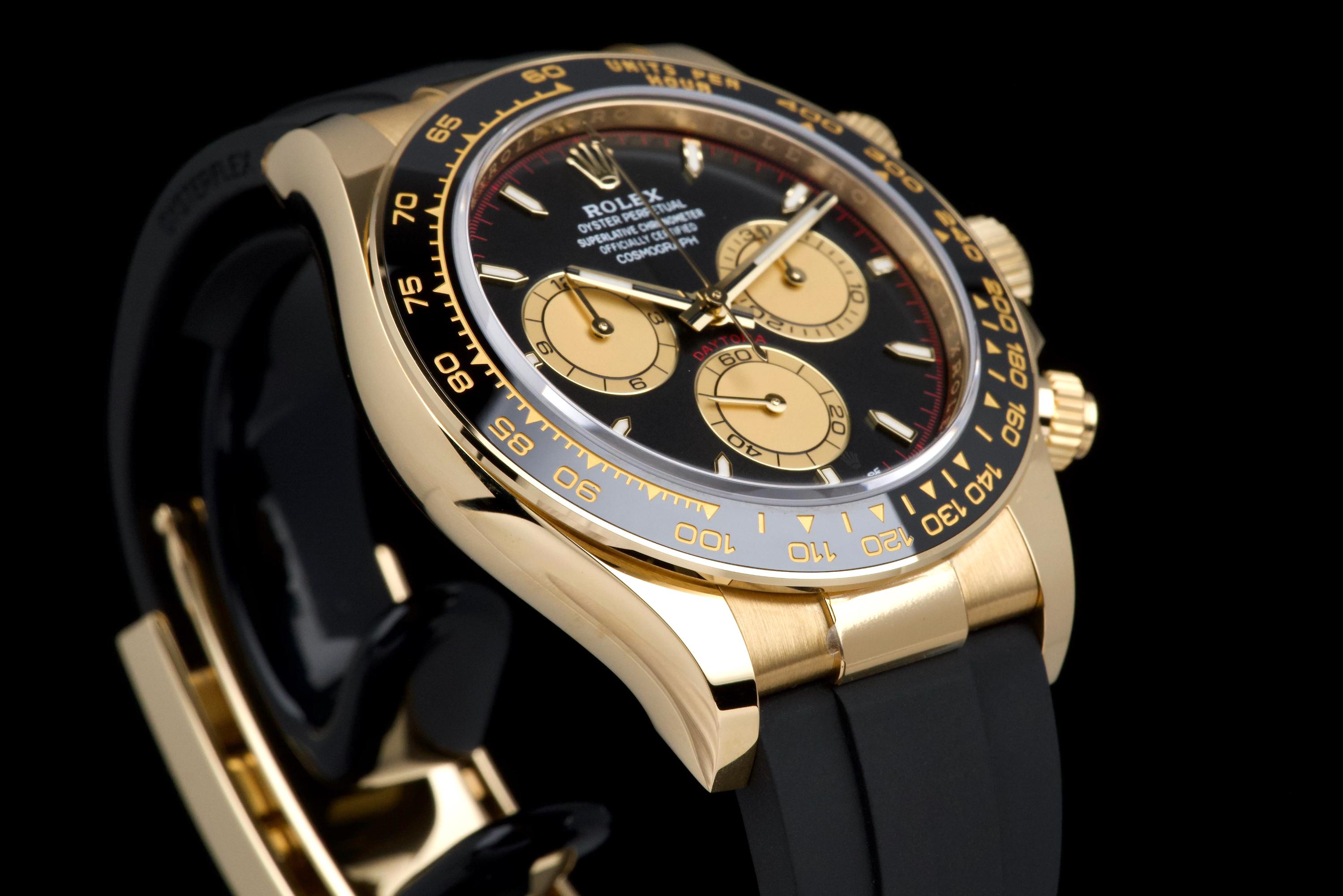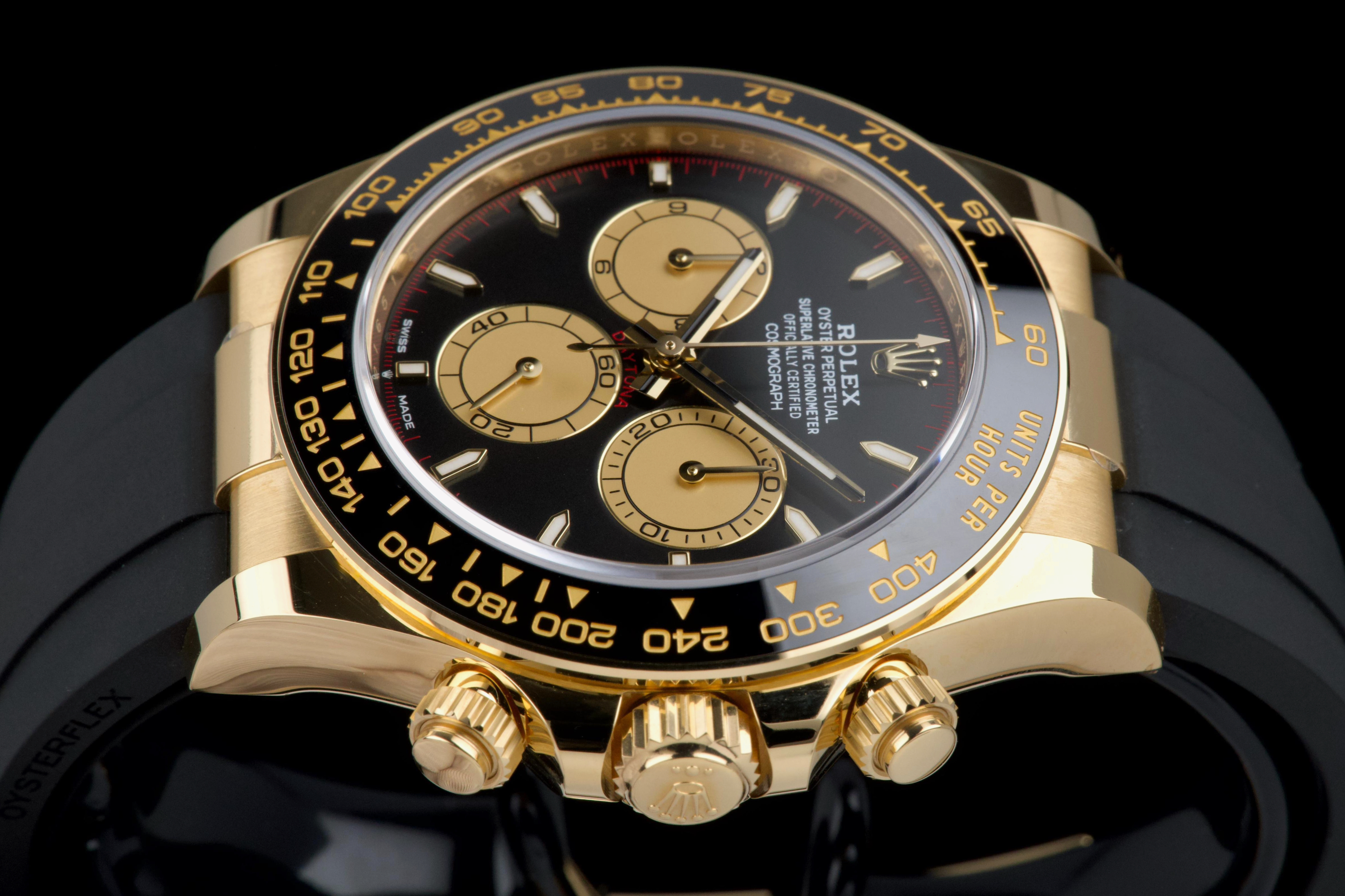 The present Rolex Cosmograph Daytona reference 126518LN, fitted with the highly desirable black “Paul Newman” style dial, is offered here as a complete full set and dates to 2024. Executed in 18K yellow gold and paired with the Oysterflex bracelet, this modern Daytona combines contemporary performance with a dial configuration that pays homage to the brand’s most iconic vintage aesthetics. This example has been worn only once and remains in virtually new condition, with several factory protective stickers still in place. The case, bezel, and clasp present flawlessly, reflecting minimal handling and careful ownership. The striking black dial features contrasting sub-dials inspired by the legendary “Paul Newman” Daytonas, offering exceptional legibility and a bold, motorsport-inspired character. The watch is fitted with Rolex’s innovative Oysterflex rubber bracelet, providing both comfort and durability while maintaining the refined presence of a precious-metal Daytona. Powered by Rolex’s latest-generation automatic chronograph calibre 4131, the watch benefits from modern technical improvements, including enhanced finishing and optimized performance. Delivered as a full set from 2024 and preserved in near-new condition, this Daytona 126518LN represents a compelling opportunity to acquire one of Rolex’s most sought-after current-production models with immediate wearability and strong collector appeal.