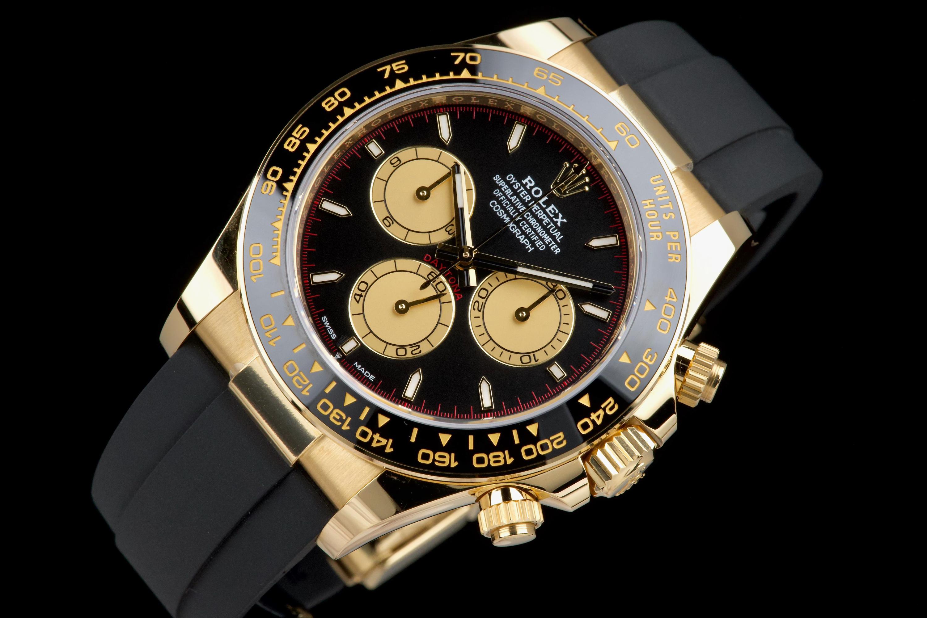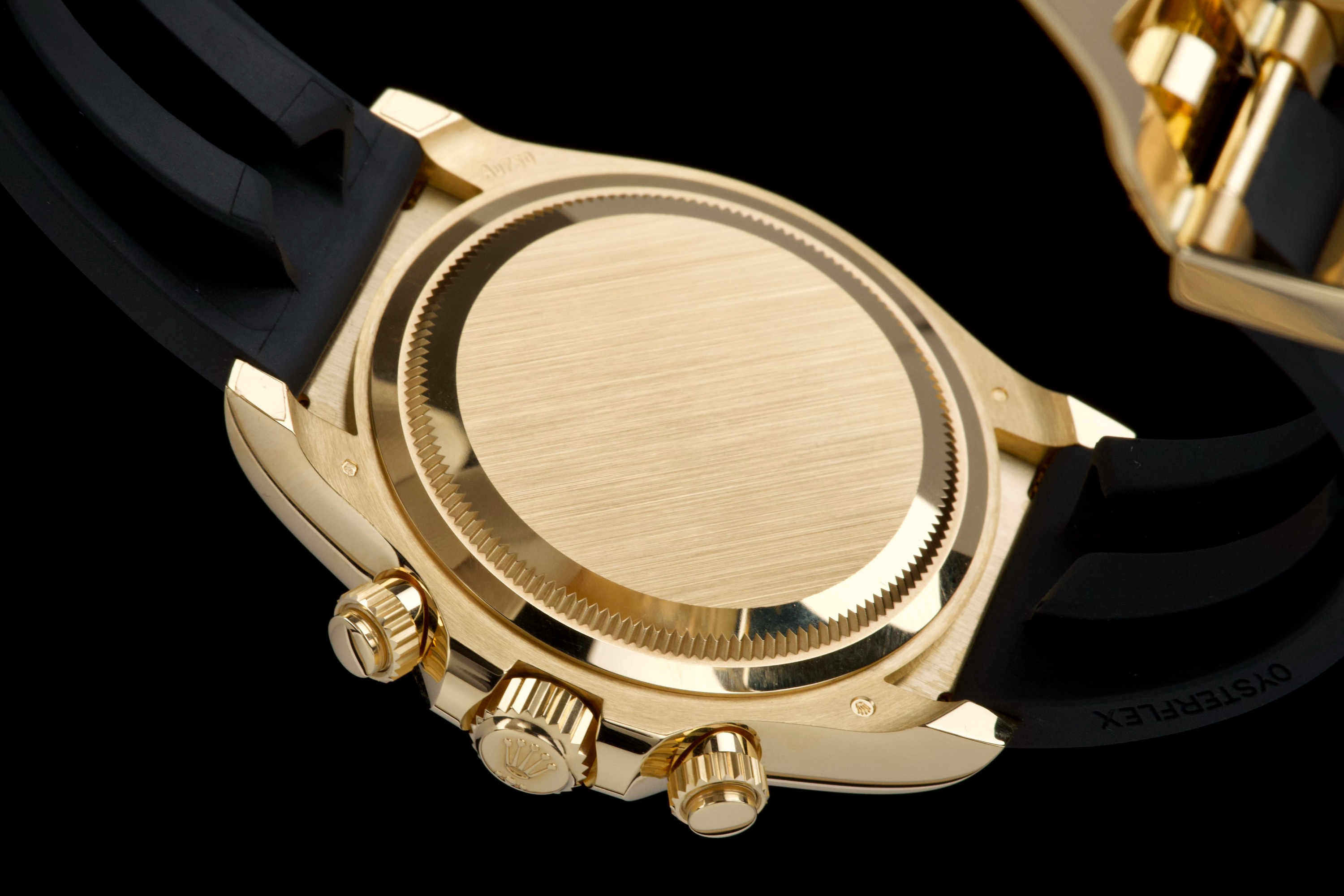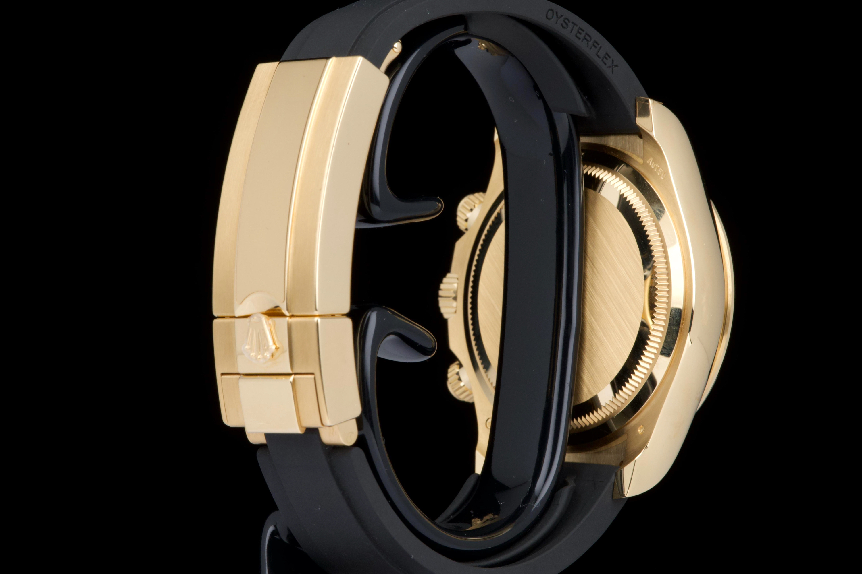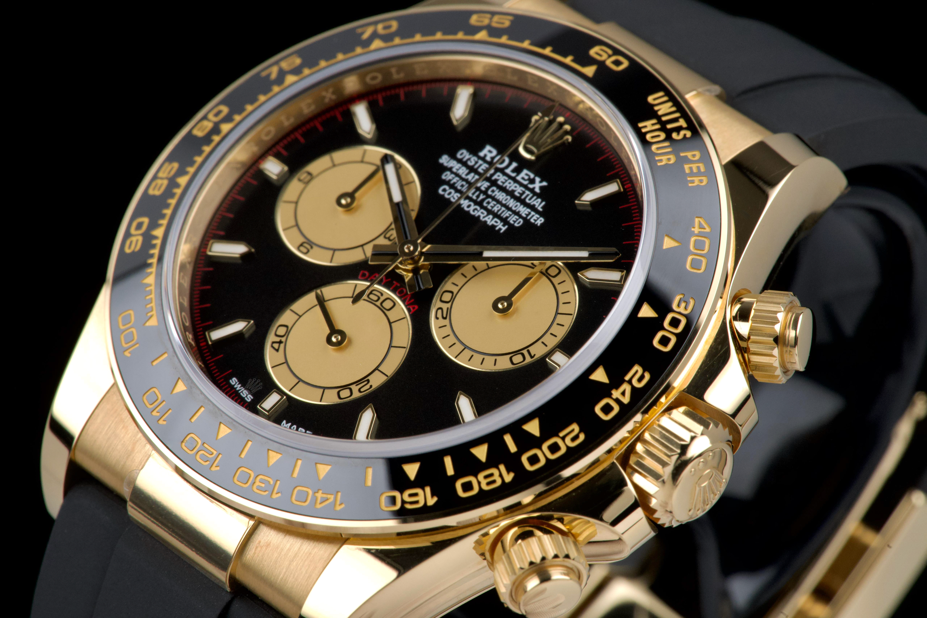 The present Rolex Cosmograph Daytona reference 126518LN, fitted with the highly desirable black “Paul Newman” style dial, is offered here as a complete full set and dates to 2024. Executed in 18K yellow gold and paired with the Oysterflex bracelet, this modern Daytona combines contemporary performance with a dial configuration that pays homage to the brand’s most iconic vintage aesthetics. This example has been worn only once and remains in virtually new condition, with several factory protective stickers still in place. The case, bezel, and clasp present flawlessly, reflecting minimal handling and careful ownership. The striking black dial features contrasting sub-dials inspired by the legendary “Paul Newman” Daytonas, offering exceptional legibility and a bold, motorsport-inspired character. The watch is fitted with Rolex’s innovative Oysterflex rubber bracelet, providing both comfort and durability while maintaining the refined presence of a precious-metal Daytona. Powered by Rolex’s latest-generation automatic chronograph calibre 4131, the watch benefits from modern technical improvements, including enhanced finishing and optimized performance. Delivered as a full set from 2024 and preserved in near-new condition, this Daytona 126518LN represents a compelling opportunity to acquire one of Rolex’s most sought-after current-production models with immediate wearability and strong collector appeal.