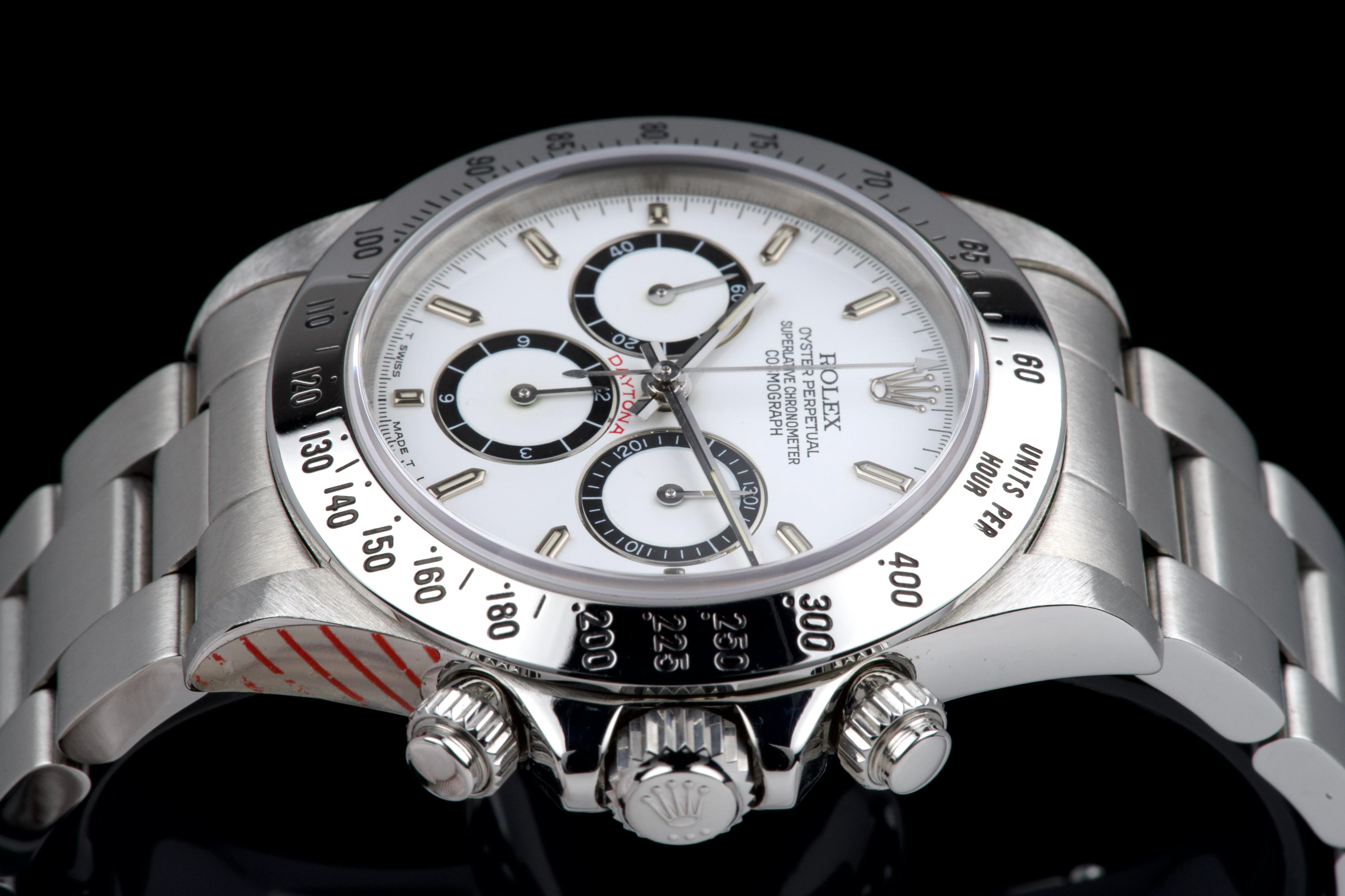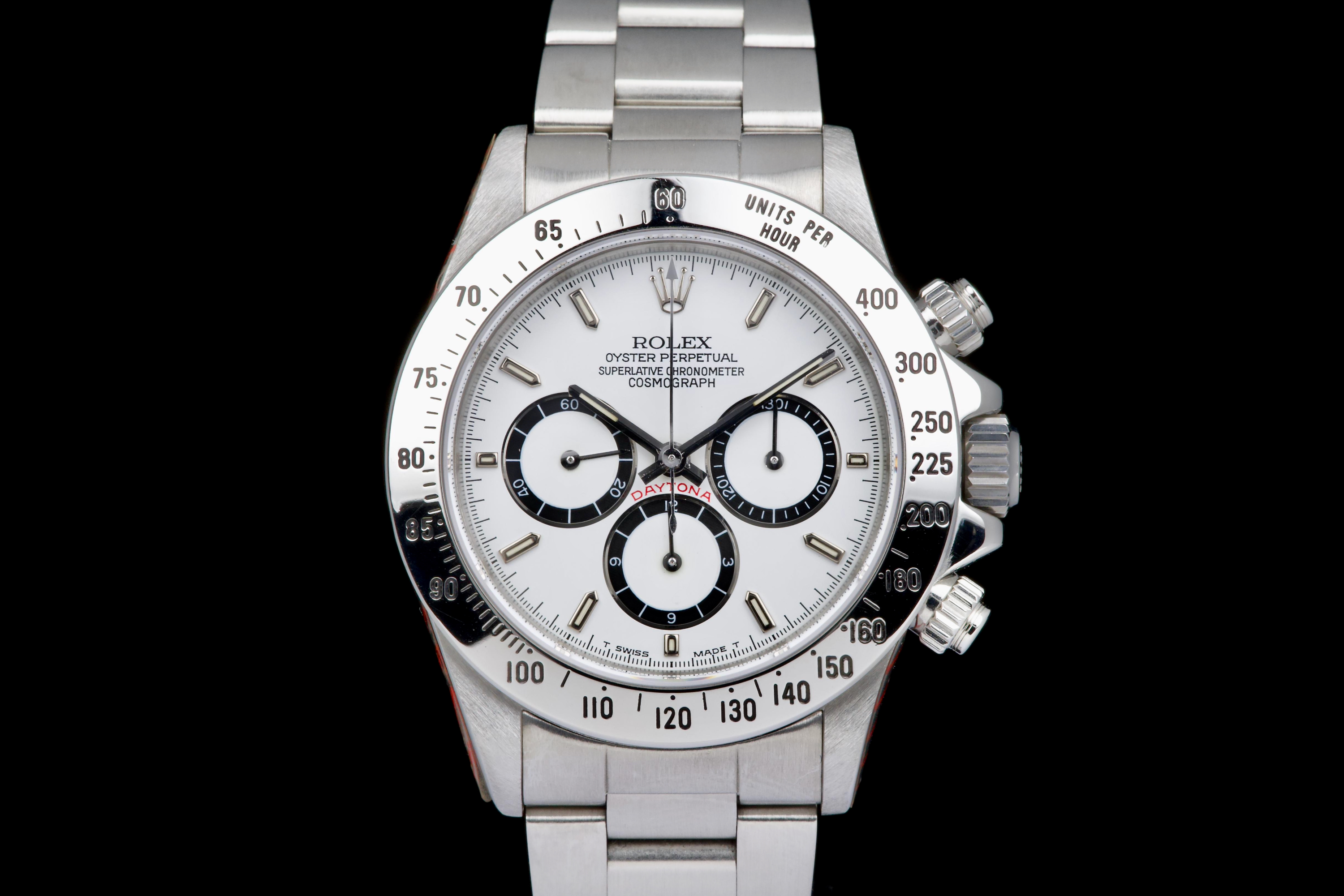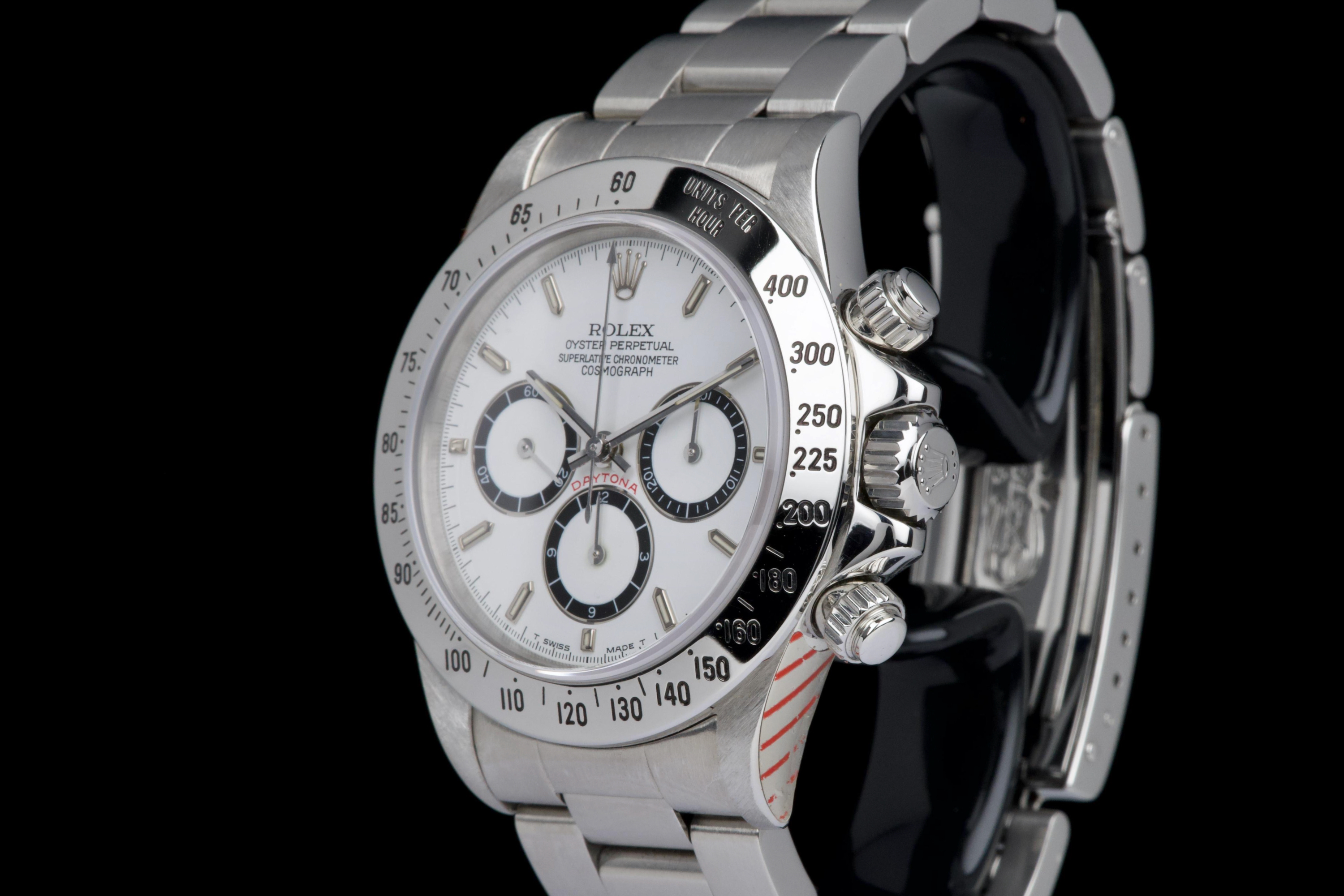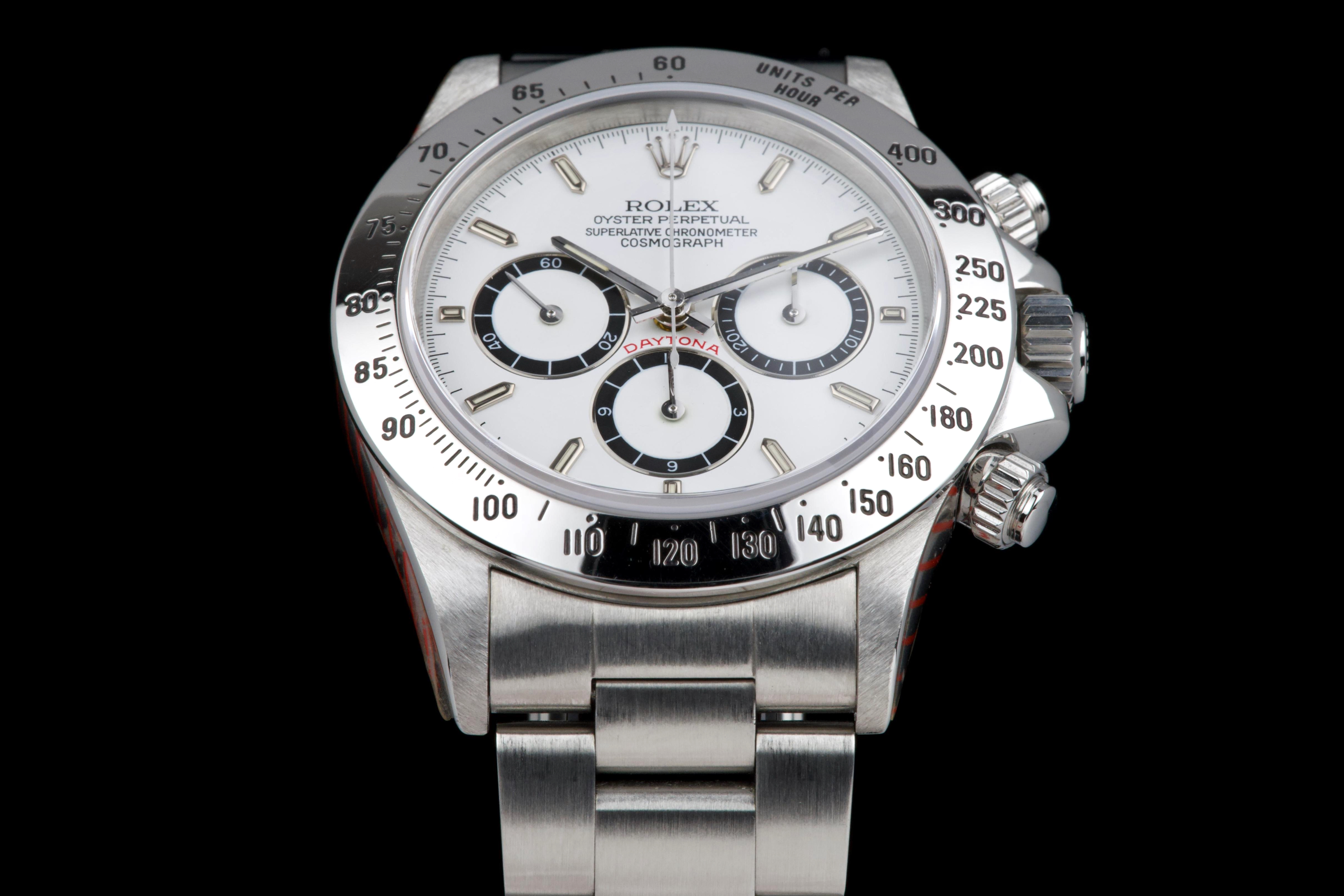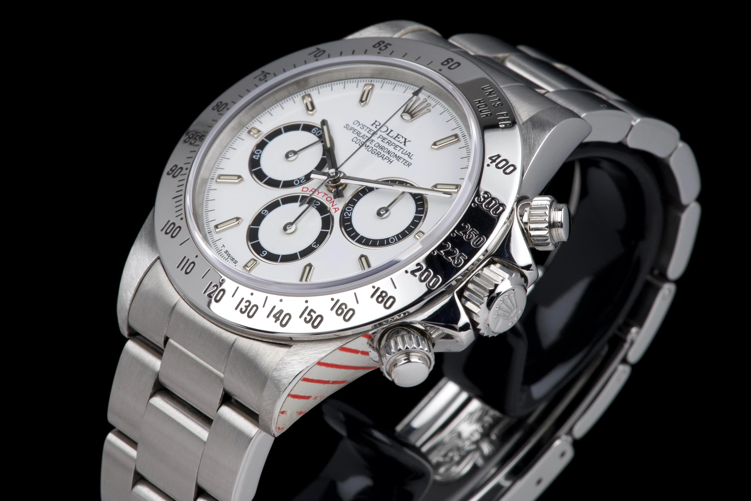 The present Rolex Cosmograph Daytona reference 16520, dating to 1990, is an exceptional early example of the celebrated Zenith-powered generation, offered as a complete full set and preserved in outstanding overall condition. Originally sold in Italy in 1990, this watch combines early-production characteristics, desirable dial configuration, and documented factory servicing. This example was fully serviced and polished by Rolex in 2018 and is accompanied by its Rolex service card, confirming the intervention. Since that service, the watch has reportedly remained unworn, and it still retains service stickers, underscoring its excellent preservation. The watch features a rare and highly sought-after “4 lines” white tritium dial, a configuration prized by collectors for its early production status and balanced typography. The dial is preserved in excellent condition, and the original tritium hands match perfectly, creating a harmonious and fully period-correct appearance. The original steel bezel engraved with “225” is present and remains in superb condition, consistent with the overall quality of the watch. The case, professionally refinished by Rolex during the 2018 service, remains sharp and well defined, with strong proportions and crisp edges. It is fitted with its original Oyster bracelet reference 78360 with 503 endlinks, preserved in excellent condition and showing extremely light stretch. The clasp bears the code O11, consistent with the period. Inside beats the automatic Rolex calibre 4030, based on the legendary Zenith El Primero chronograph movement, extensively modified by Rolex to meet its own stringent standards of precision and reliability. Combining early “4 lines” dial rarity, full-set completeness, documented Rolex service, and exceptional condition throughout, this Daytona 16520 represents a particularly compelling opportunity to acquire a highly collectible and investment-grade example of one of the most important automatic Daytonas ever produced.