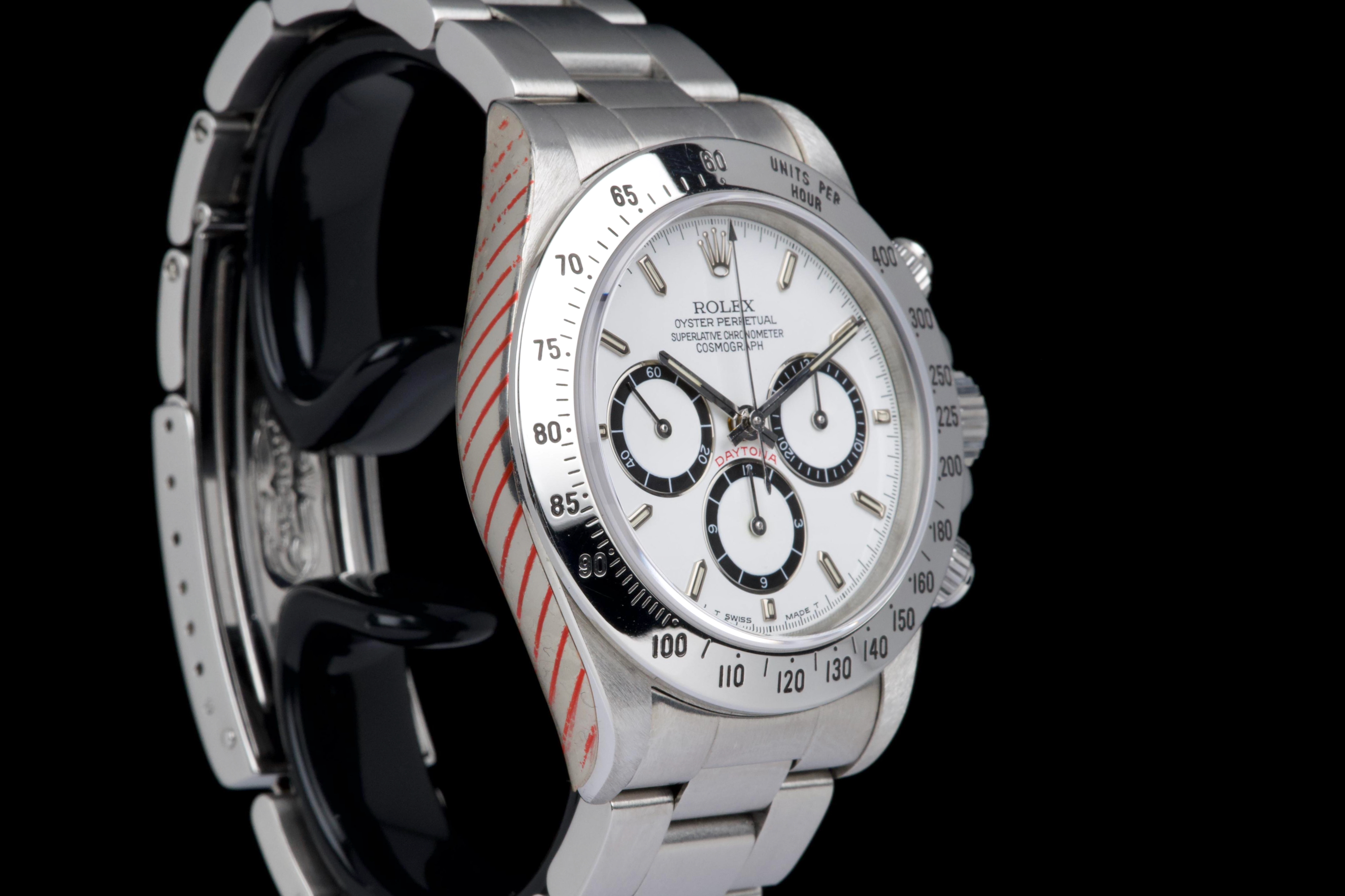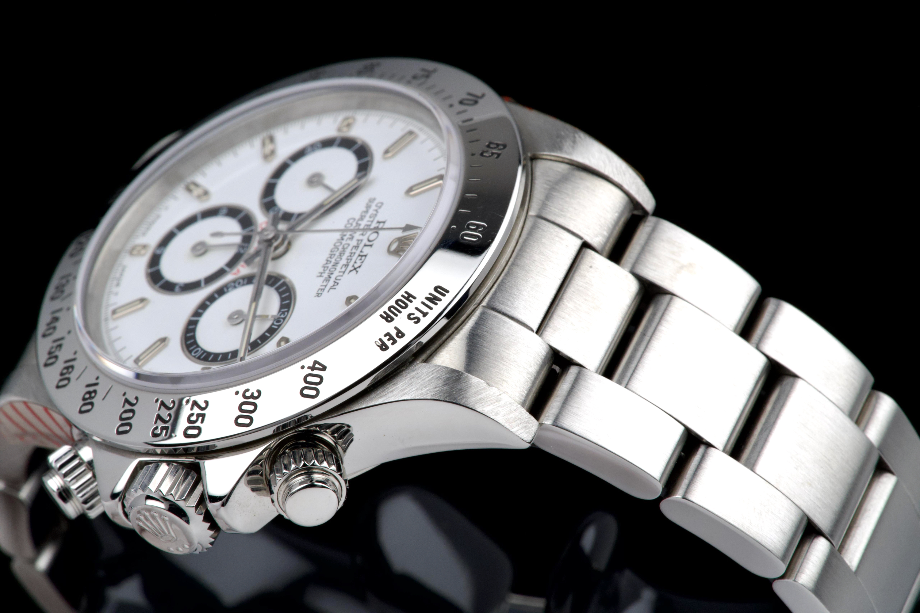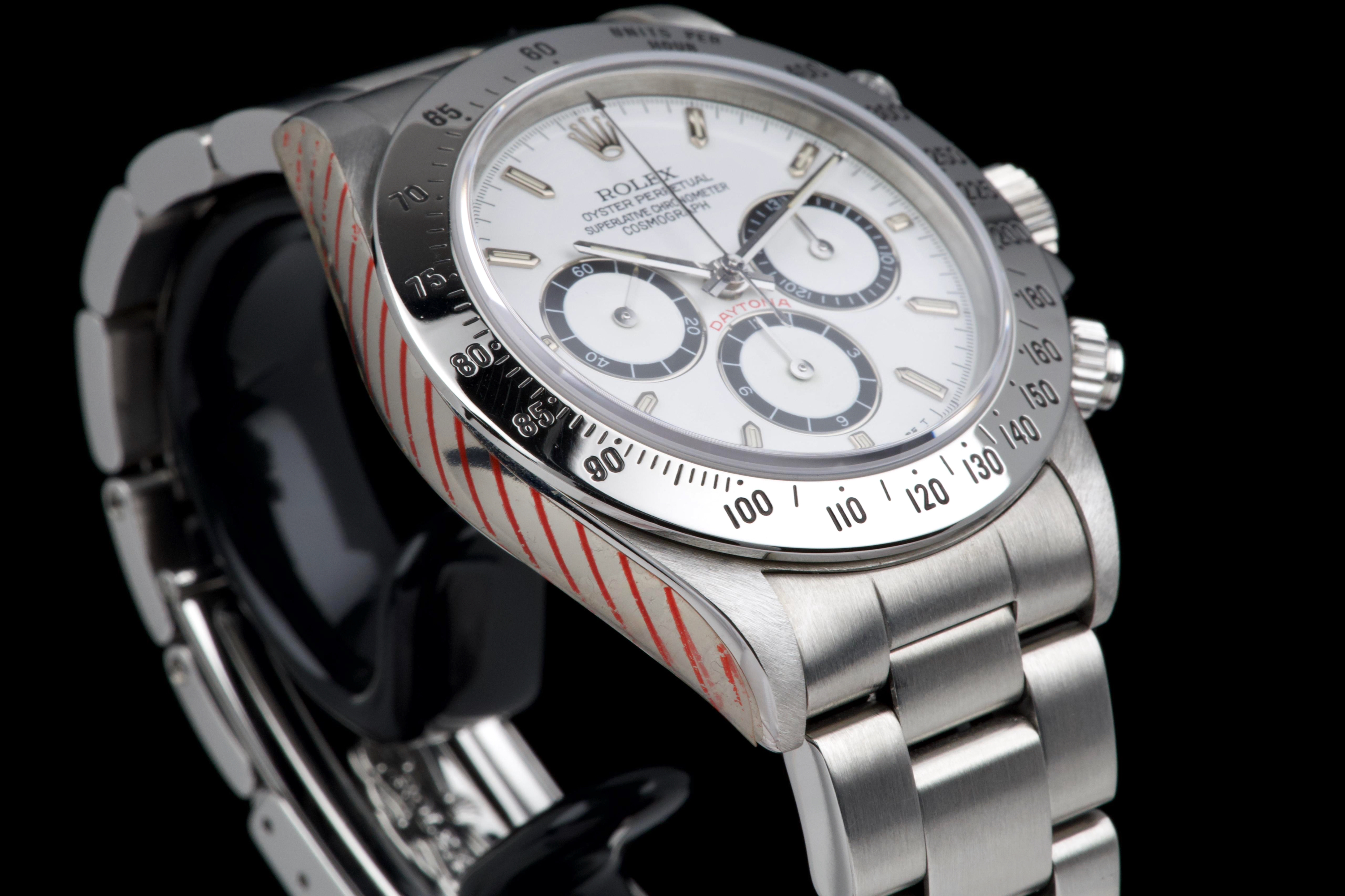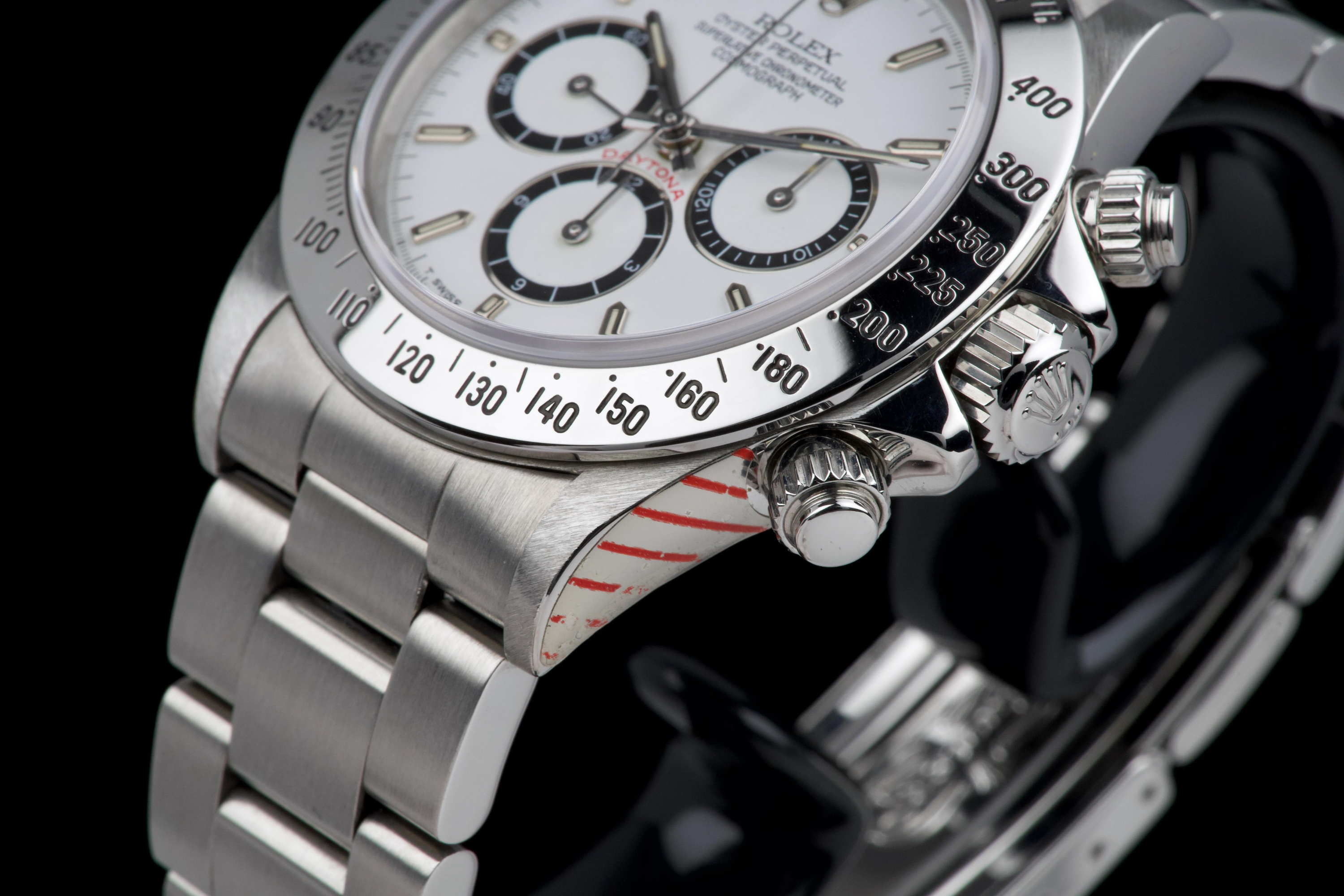 The present Rolex Cosmograph Daytona reference 16520, dating to 1990, is an exceptional early example of the celebrated Zenith-powered generation, offered as a complete full set and preserved in outstanding overall condition. Originally sold in Italy in 1990, this watch combines early-production characteristics, desirable dial configuration, and documented factory servicing. This example was fully serviced and polished by Rolex in 2018 and is accompanied by its Rolex service card, confirming the intervention. Since that service, the watch has reportedly remained unworn, and it still retains service stickers, underscoring its excellent preservation. The watch features a rare and highly sought-after “4 lines” white tritium dial, a configuration prized by collectors for its early production status and balanced typography. The dial is preserved in excellent condition, and the original tritium hands match perfectly, creating a harmonious and fully period-correct appearance. The original steel bezel engraved with “225” is present and remains in superb condition, consistent with the overall quality of the watch. The case, professionally refinished by Rolex during the 2018 service, remains sharp and well defined, with strong proportions and crisp edges. It is fitted with its original Oyster bracelet reference 78360 with 503 endlinks, preserved in excellent condition and showing extremely light stretch. The clasp bears the code O11, consistent with the period. Inside beats the automatic Rolex calibre 4030, based on the legendary Zenith El Primero chronograph movement, extensively modified by Rolex to meet its own stringent standards of precision and reliability. Combining early “4 lines” dial rarity, full-set completeness, documented Rolex service, and exceptional condition throughout, this Daytona 16520 represents a particularly compelling opportunity to acquire a highly collectible and investment-grade example of one of the most important automatic Daytonas ever produced.