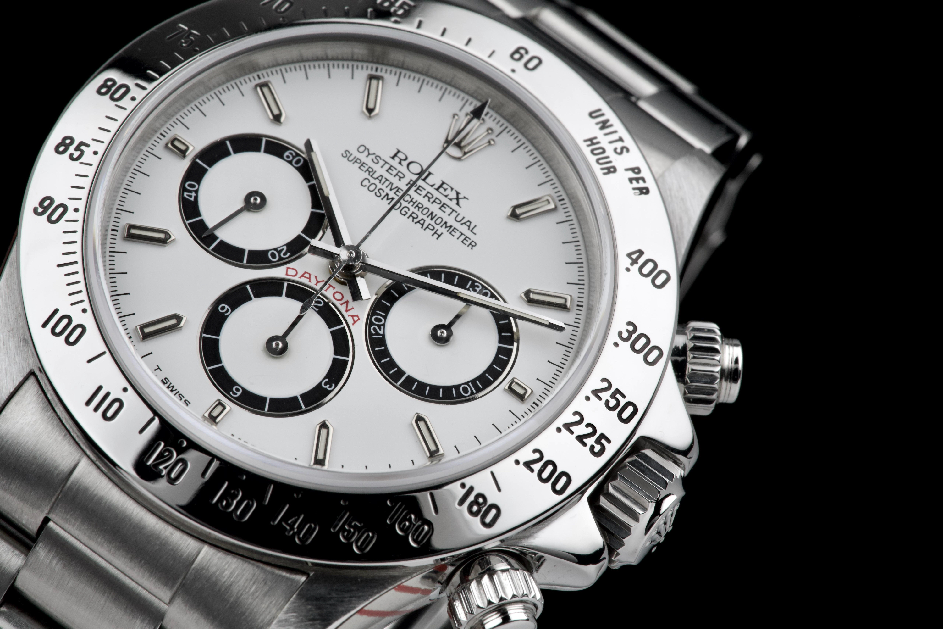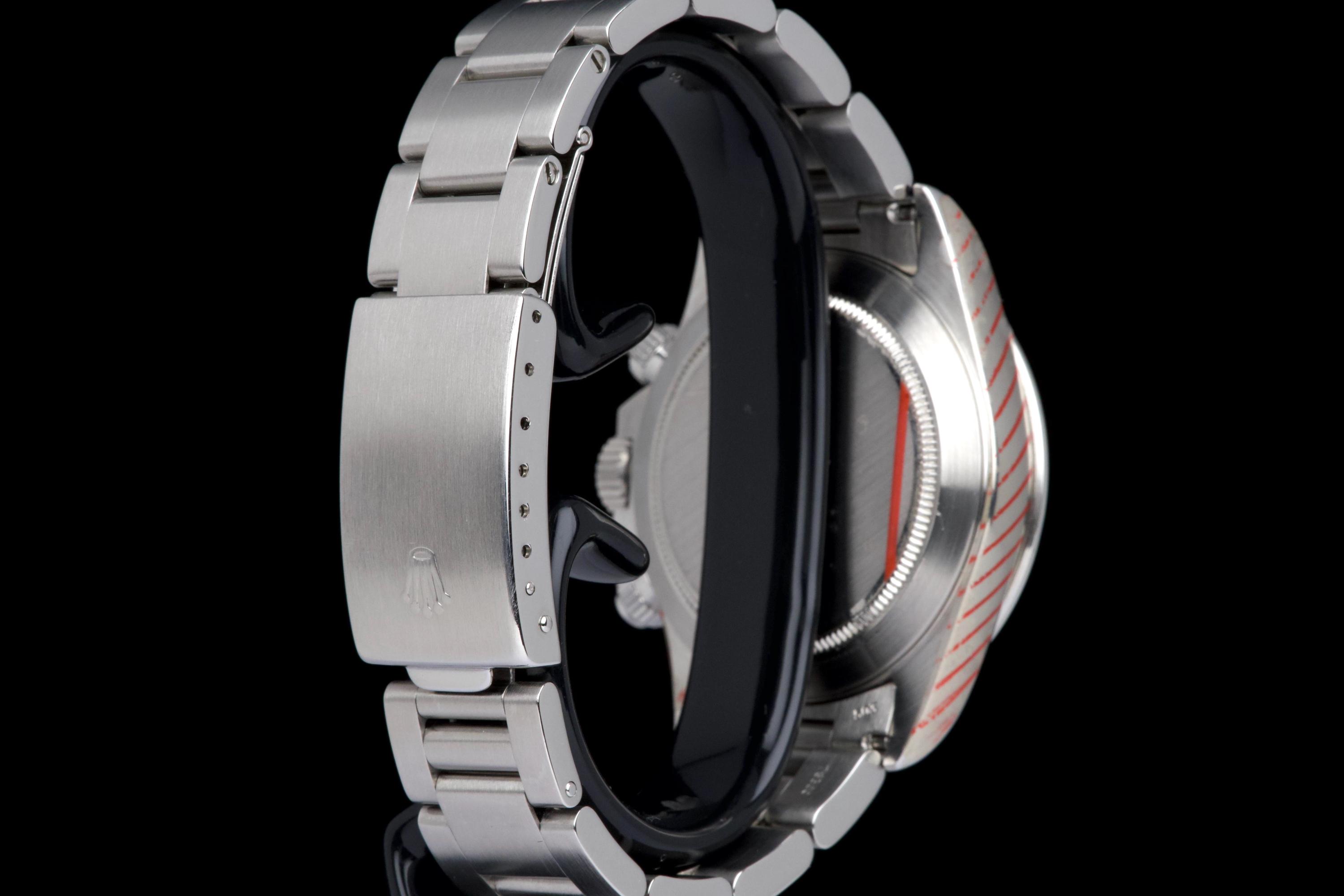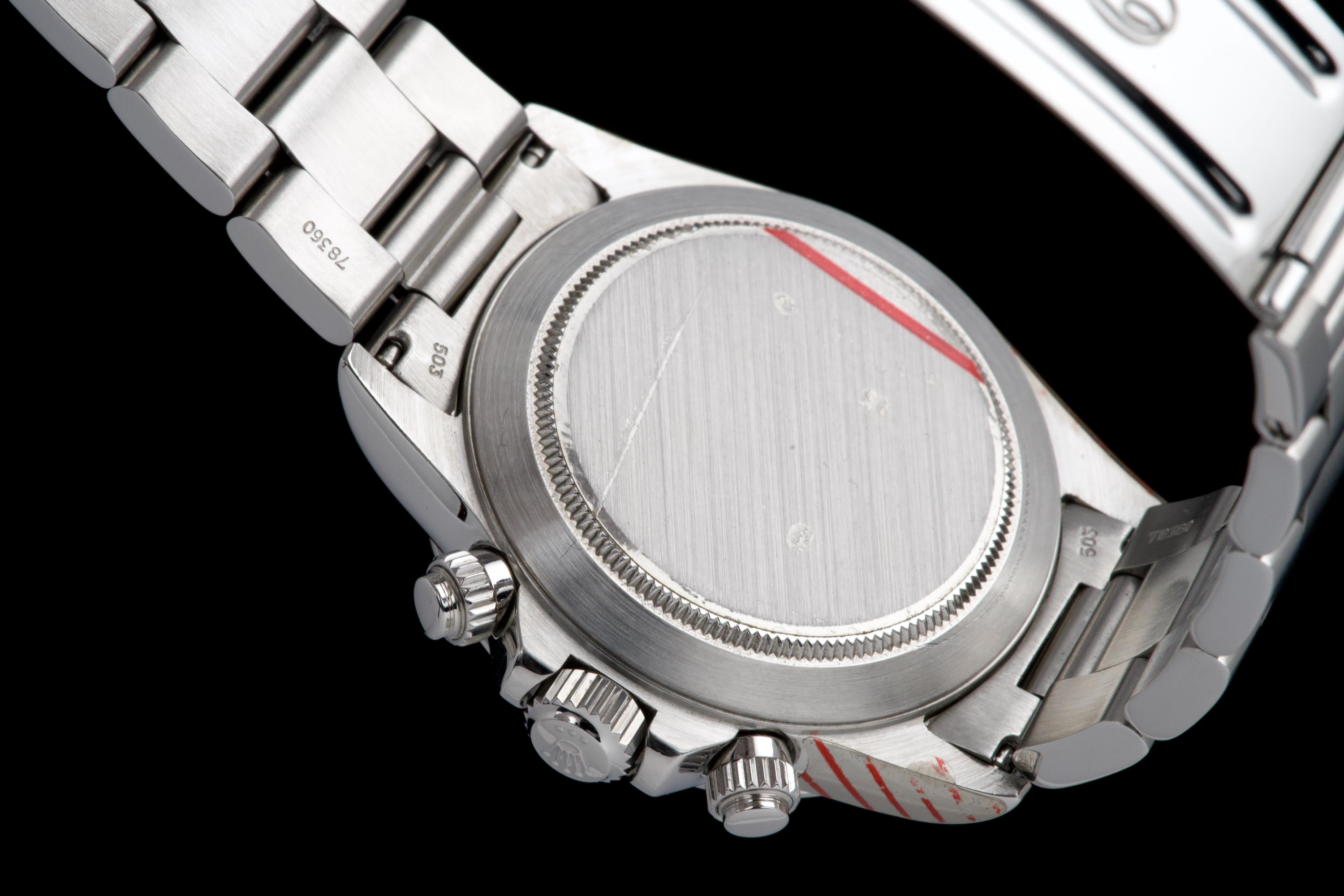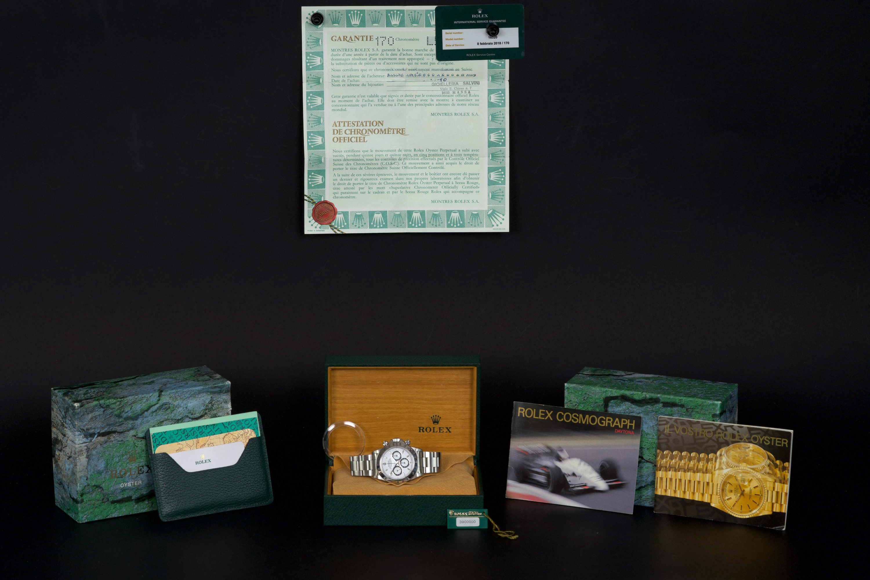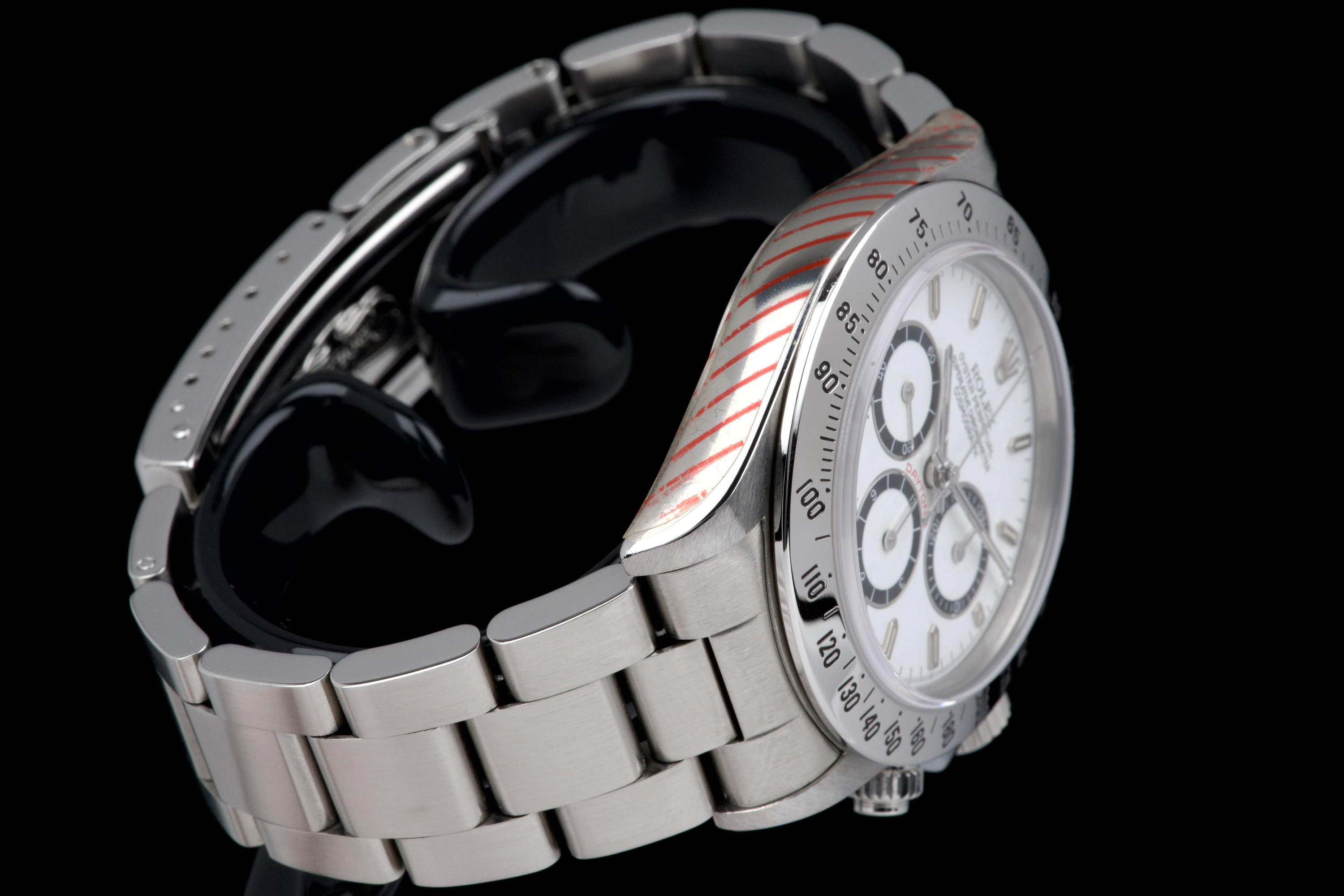 The present Rolex Cosmograph Daytona reference 16520, dating to 1990, is an exceptional early example of the celebrated Zenith-powered generation, offered as a complete full set and preserved in outstanding overall condition. Originally sold in Italy in 1990, this watch combines early-production characteristics, desirable dial configuration, and documented factory servicing. This example was fully serviced and polished by Rolex in 2018 and is accompanied by its Rolex service card, confirming the intervention. Since that service, the watch has reportedly remained unworn, and it still retains service stickers, underscoring its excellent preservation. The watch features a rare and highly sought-after “4 lines” white tritium dial, a configuration prized by collectors for its early production status and balanced typography. The dial is preserved in excellent condition, and the original tritium hands match perfectly, creating a harmonious and fully period-correct appearance. The original steel bezel engraved with “225” is present and remains in superb condition, consistent with the overall quality of the watch. The case, professionally refinished by Rolex during the 2018 service, remains sharp and well defined, with strong proportions and crisp edges. It is fitted with its original Oyster bracelet reference 78360 with 503 endlinks, preserved in excellent condition and showing extremely light stretch. The clasp bears the code O11, consistent with the period. Inside beats the automatic Rolex calibre 4030, based on the legendary Zenith El Primero chronograph movement, extensively modified by Rolex to meet its own stringent standards of precision and reliability. Combining early “4 lines” dial rarity, full-set completeness, documented Rolex service, and exceptional condition throughout, this Daytona 16520 represents a particularly compelling opportunity to acquire a highly collectible and investment-grade example of one of the most important automatic Daytonas ever produced.