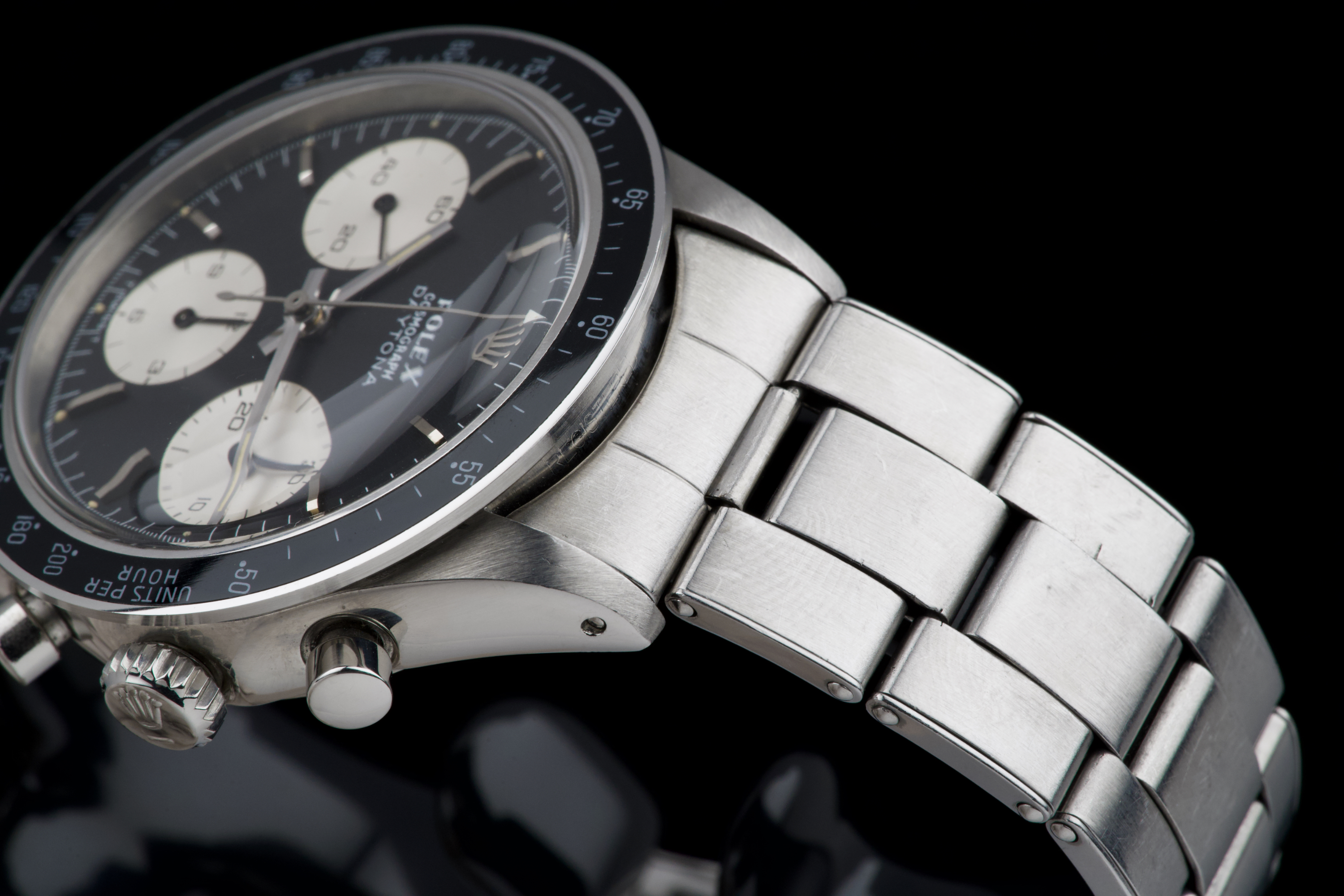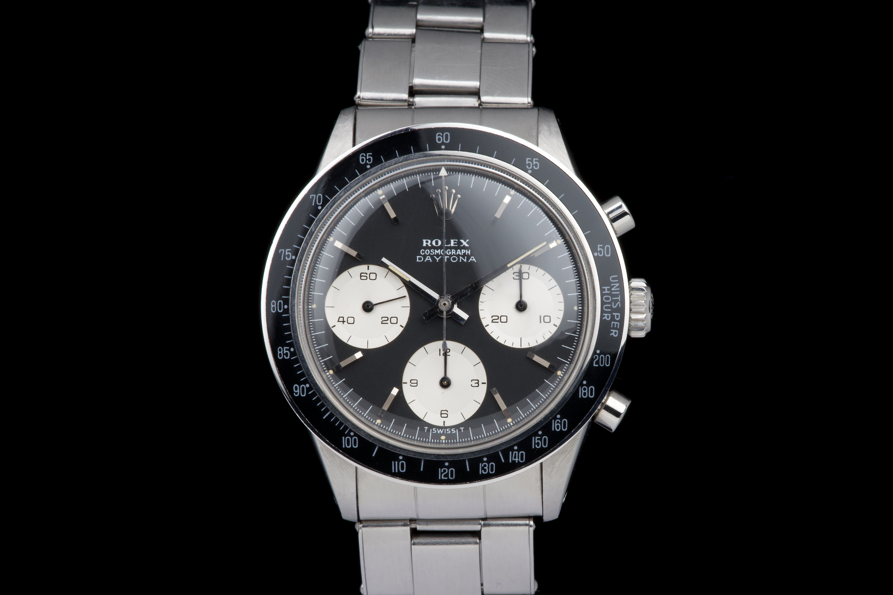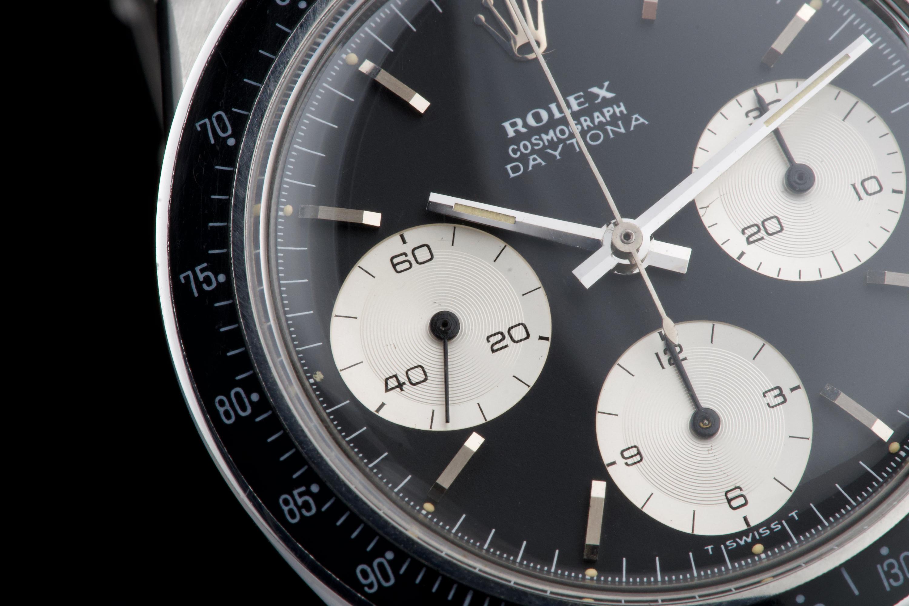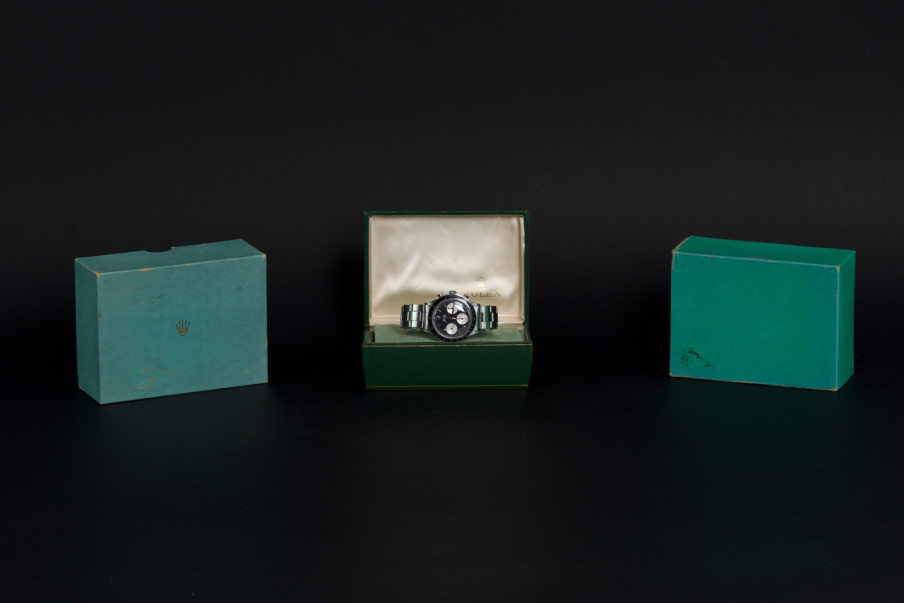 An exceptionally well-preserved and extremely rare example of the Rolex Cosmograph Daytona reference 6241, produced in 1968 and fitted with the coveted black “Big Logo” dial. The dial is in remarkable condition, with only a microscopic mark inside the 3 o’clock subdial, visible under magnification but not to the naked eye. The luminous plots at 3 and 9 o’clock are partially missing — a common and reassuring trait for untouched Daytona dials of this era, confirming that the lume has never been redone. The hands are perfectly matching and in superb condition; under UV light, all luminous material (dial and hands) glows briefly and fades uniformly, exactly as correct vintage tritium should. The original Mark 1 bakelite bezel is outstanding — free of cracks, chips, or notable wear, which is extraordinarily rare for a 1960s Daytona. The stainless-steel case is in extraordinary condition, appearing unpolished; if it was ever polished, it was done with extreme restraint. The serial and reference numbers between the lugs are deep, crisp, and perfectly legible, confirming a beautifully preserved case. The caseback is correctly stamped 6241 and displays two Rolex Geneva service engravings, a very positive sign of proper historical maintenance. Inside, the Valjoux-based Rolex caliber 722 is clean, functioning perfectly, and has been checked by our watchmaker. The watch is fitted with a riveted 7205 bracelet with 60 endlinks, showing very minimal stretch for its age. The clasp is stamped 1.67, consistent with the period. We handle many vintage Daytonas, but this example stands out dramatically. Its combination of pump pushers, black non–Paul Newman Big Logo dial, and mint MK1 bakelite bezel makes it one of the most elegant and desirable vintage chronographs ever produced — a reference 6241 in truly remarkable collector condition.