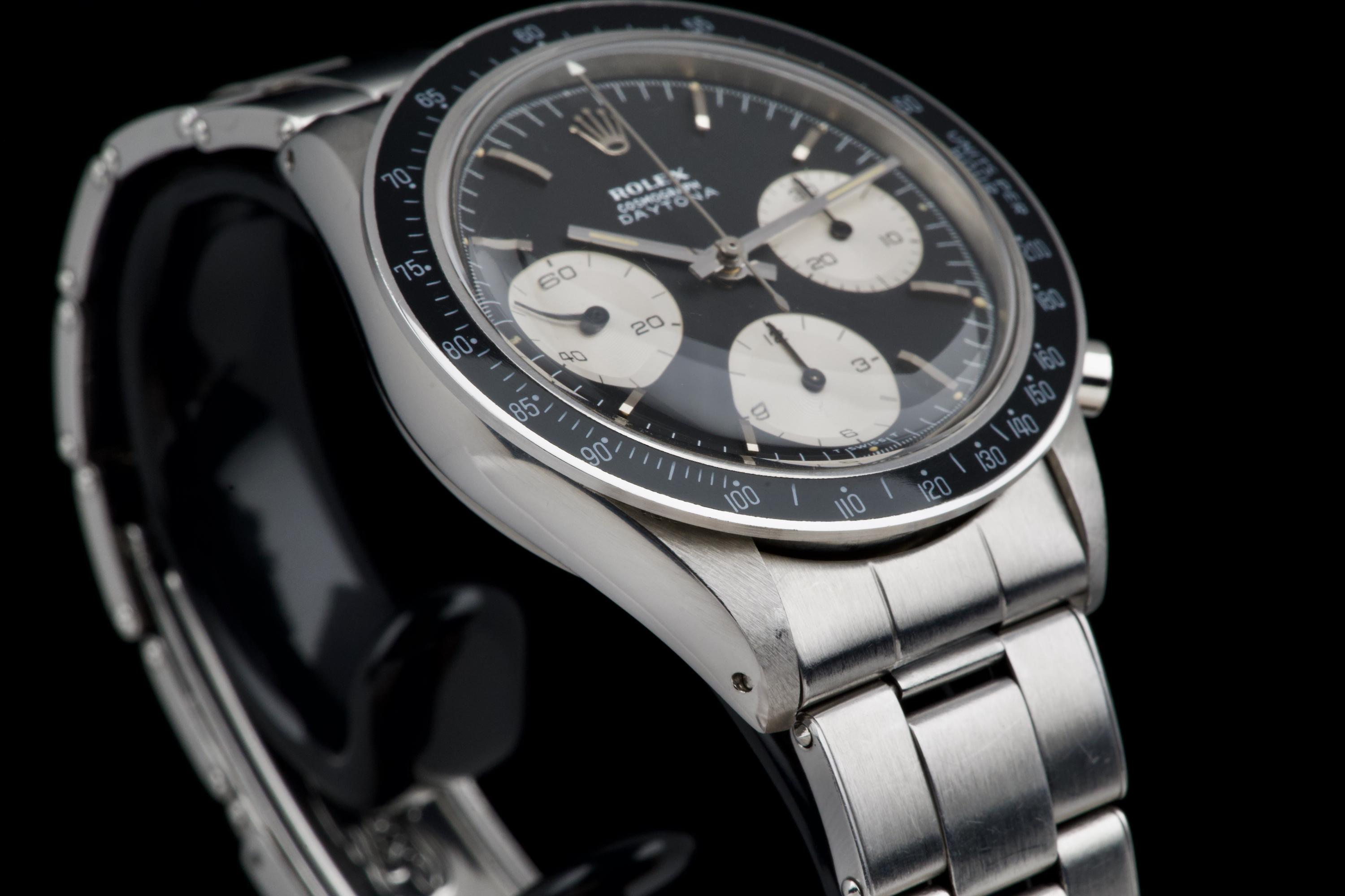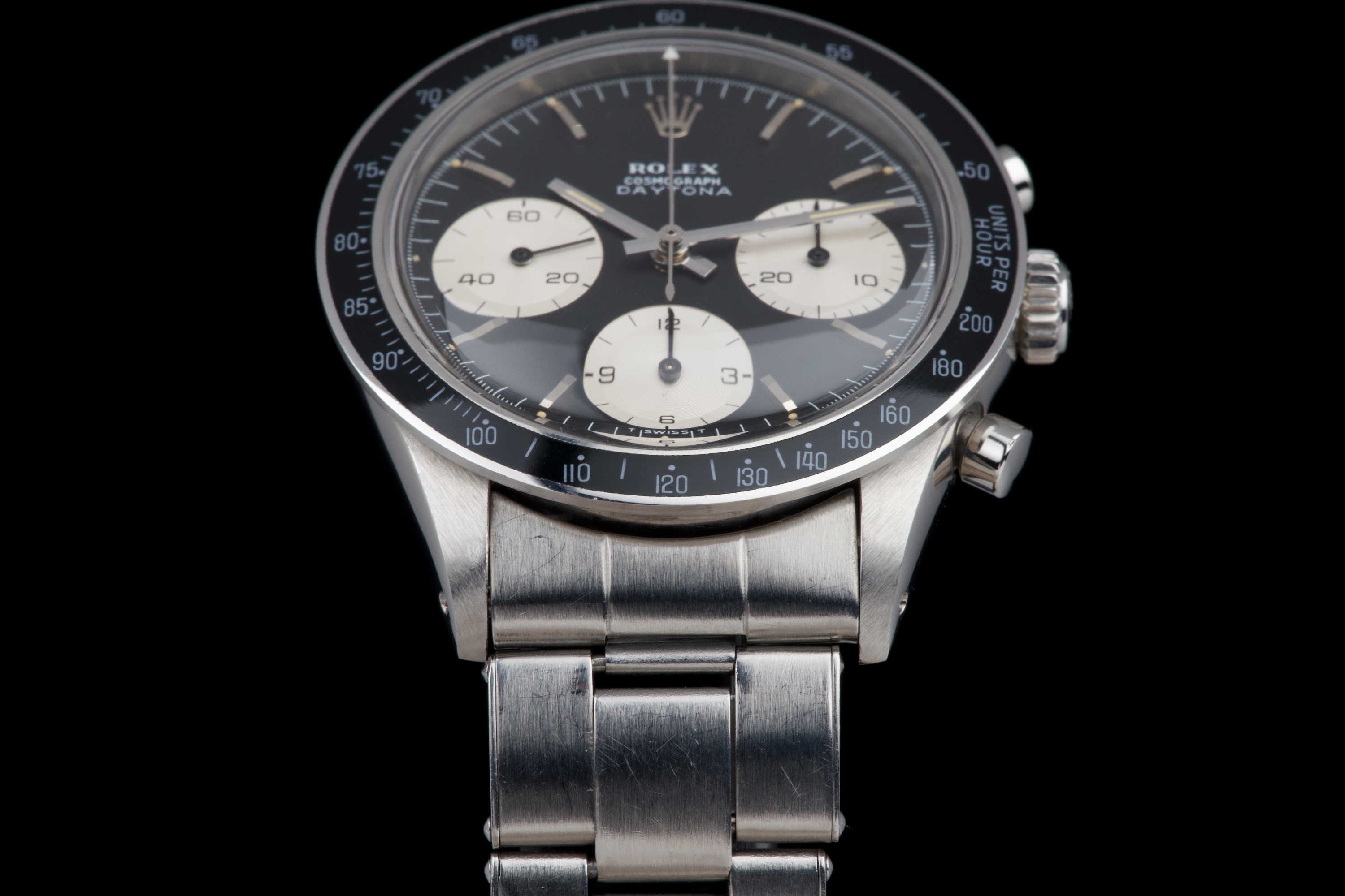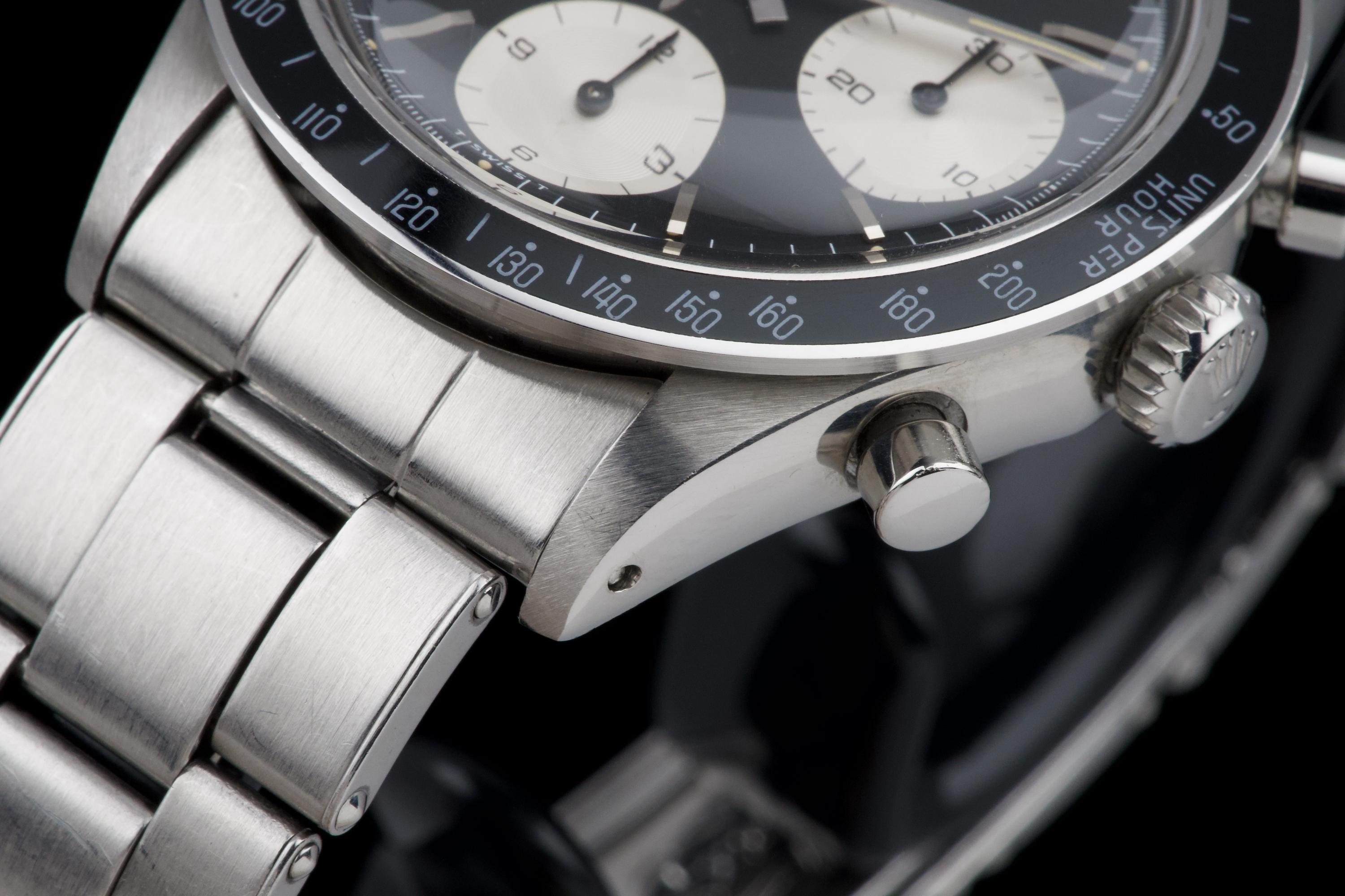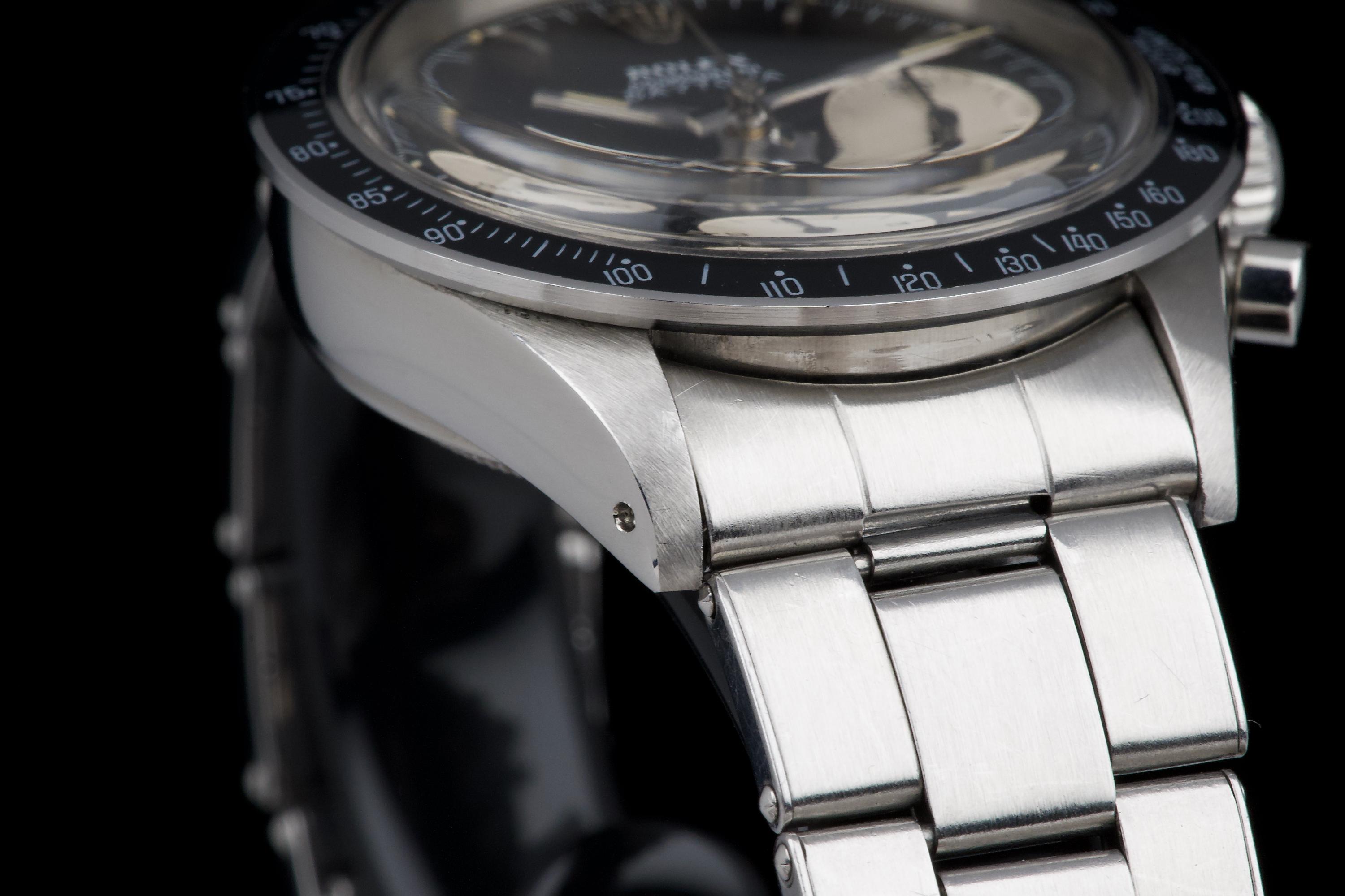 An exceptionally well-preserved and extremely rare example of the Rolex Cosmograph Daytona reference 6241, produced in 1968 and fitted with the coveted black “Big Logo” dial. The dial is in remarkable condition, with only a microscopic mark inside the 3 o’clock subdial, visible under magnification but not to the naked eye. The luminous plots at 3 and 9 o’clock are partially missing — a common and reassuring trait for untouched Daytona dials of this era, confirming that the lume has never been redone. The hands are perfectly matching and in superb condition; under UV light, all luminous material (dial and hands) glows briefly and fades uniformly, exactly as correct vintage tritium should. The original Mark 1 bakelite bezel is outstanding — free of cracks, chips, or notable wear, which is extraordinarily rare for a 1960s Daytona. The stainless-steel case is in extraordinary condition, appearing unpolished; if it was ever polished, it was done with extreme restraint. The serial and reference numbers between the lugs are deep, crisp, and perfectly legible, confirming a beautifully preserved case. The caseback is correctly stamped 6241 and displays two Rolex Geneva service engravings, a very positive sign of proper historical maintenance. Inside, the Valjoux-based Rolex caliber 722 is clean, functioning perfectly, and has been checked by our watchmaker. The watch is fitted with a riveted 7205 bracelet with 60 endlinks, showing very minimal stretch for its age. The clasp is stamped 1.67, consistent with the period. We handle many vintage Daytonas, but this example stands out dramatically. Its combination of pump pushers, black non–Paul Newman Big Logo dial, and mint MK1 bakelite bezel makes it one of the most elegant and desirable vintage chronographs ever produced — a reference 6241 in truly remarkable collector condition.