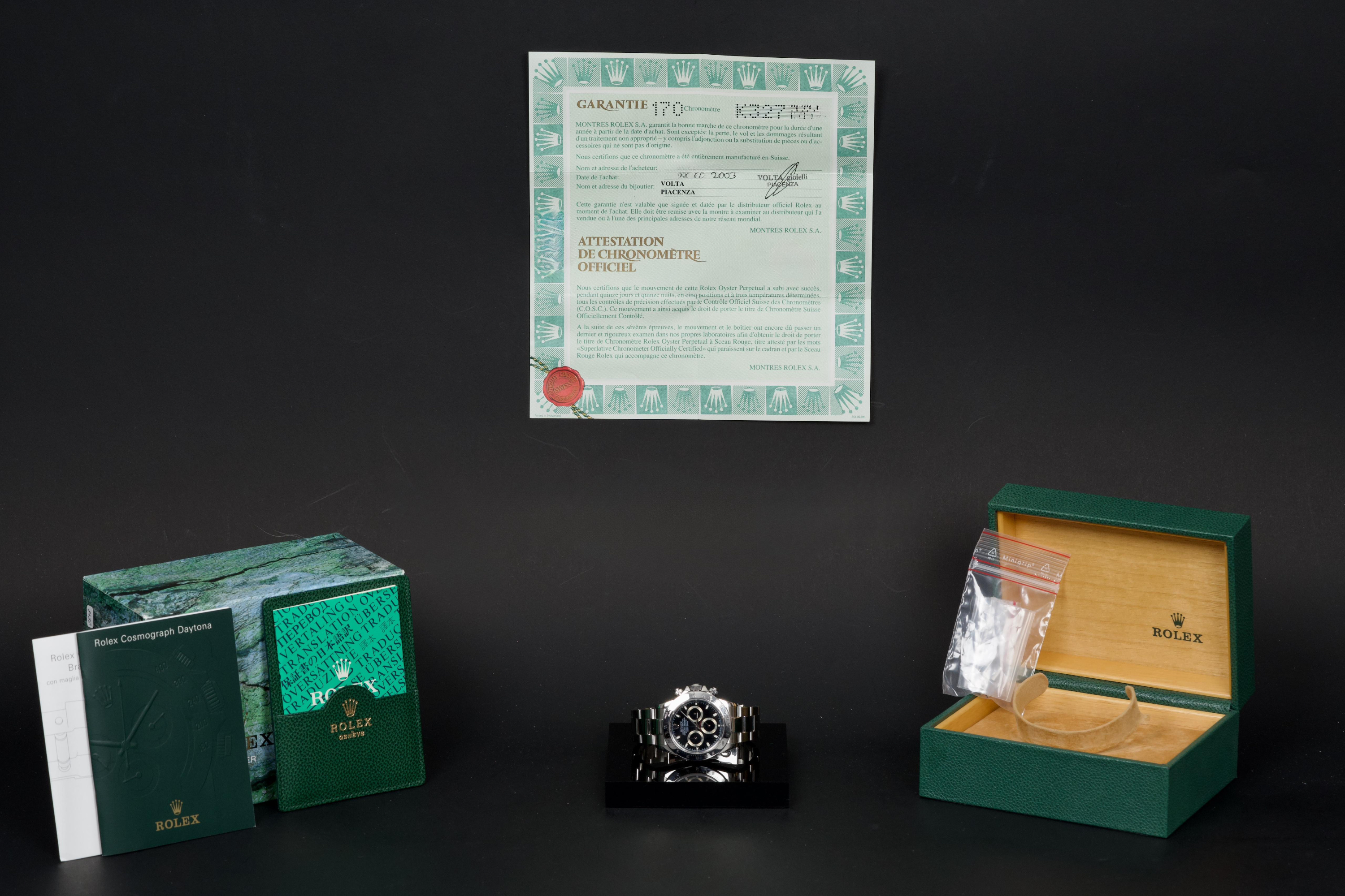 The present Rolex Cosmograph Daytona reference 116520, one of the most emblematic modern chronographs by Rolex, dates to circa 2003 and is offered here as a complete full set. The watch features a 40 mm stainless steel Oyster case with a balanced and sporty profile, combining robustness with timeless design. Its engraved tachymeter bezel and screw-down pushers reinforce the model’s strong racing heritage while ensuring durability and functionality. It is fitted with a black dial featuring contrasting chronograph subdials, offering excellent legibility and a clean, highly recognizable aesthetic. The applied hour markers and luminous hands further enhance visibility in all conditions. Powered by the in-house automatic calibre 4130, the watch delivers outstanding chronometric performance, known for its reliability, robustness, and efficient architecture, with an approximate power reserve of 72 hours. The watch has recently been serviced and polished by our watchmaker and is presented in very good overall condition, showing a clean and refreshed appearance. Offered with its full original set including box, warranty papers, and accessories, this Daytona 116520 represents an excellent opportunity to acquire a highly sought-after Rolex chronograph, combining iconic design, everyday usability, and strong collector appeal.