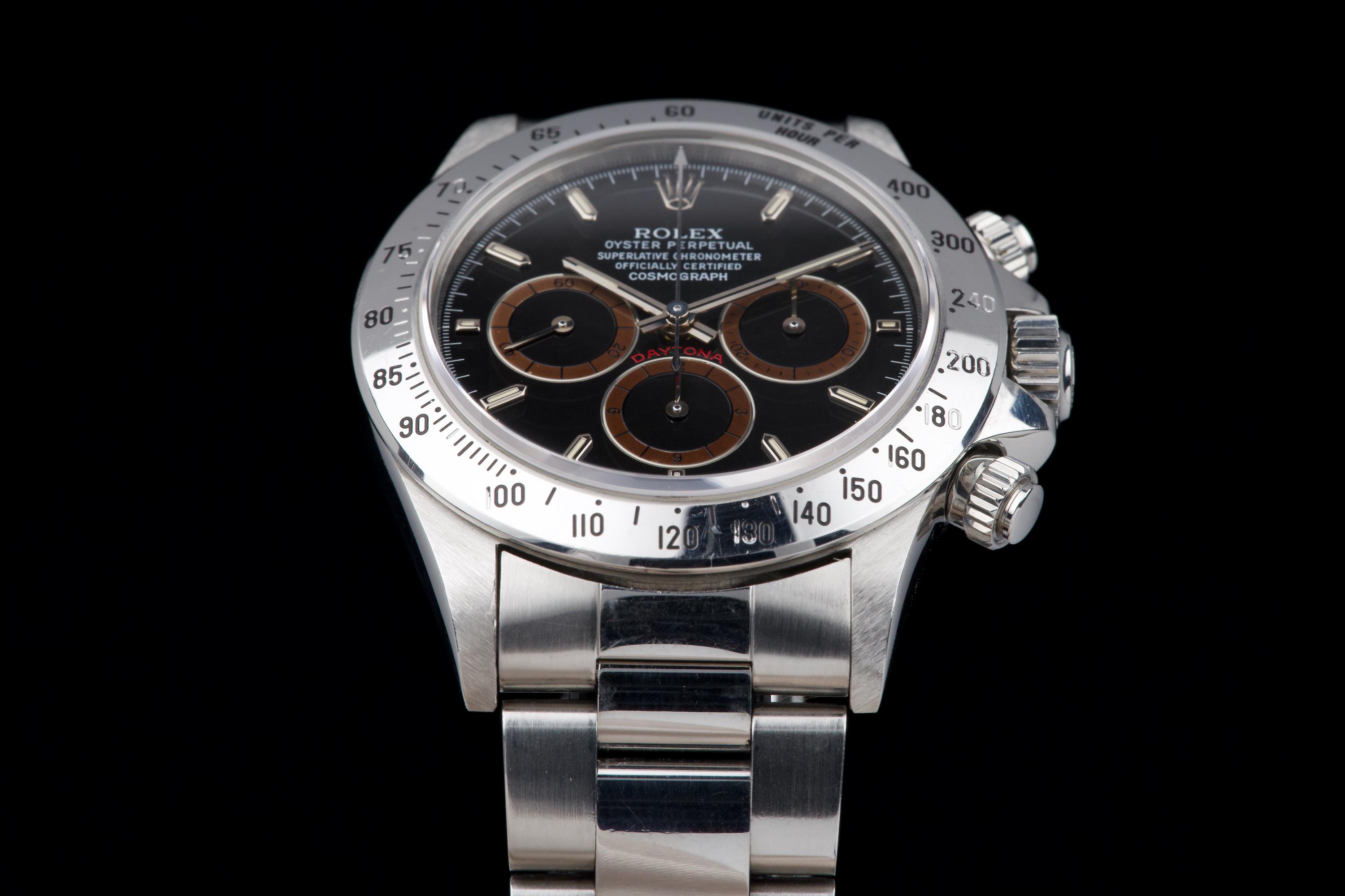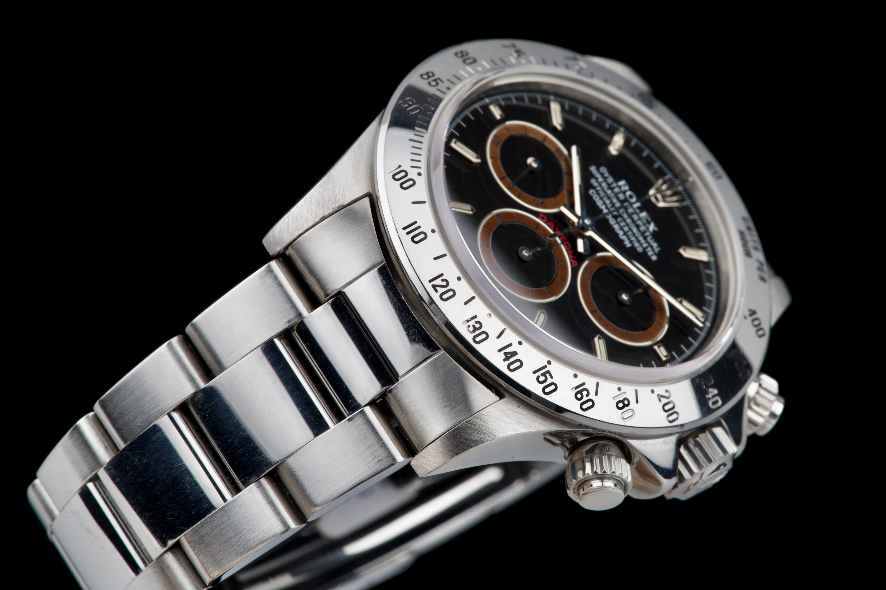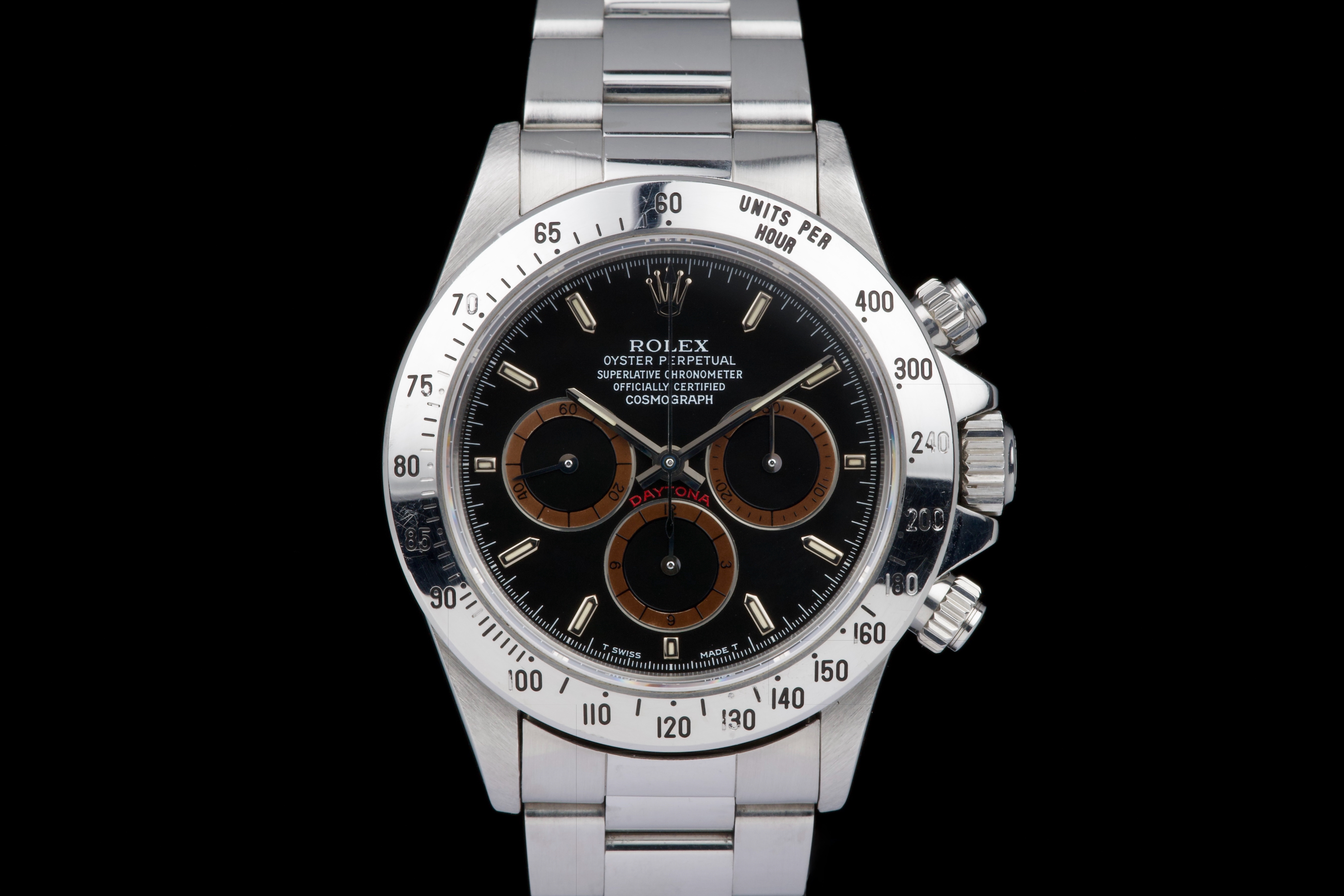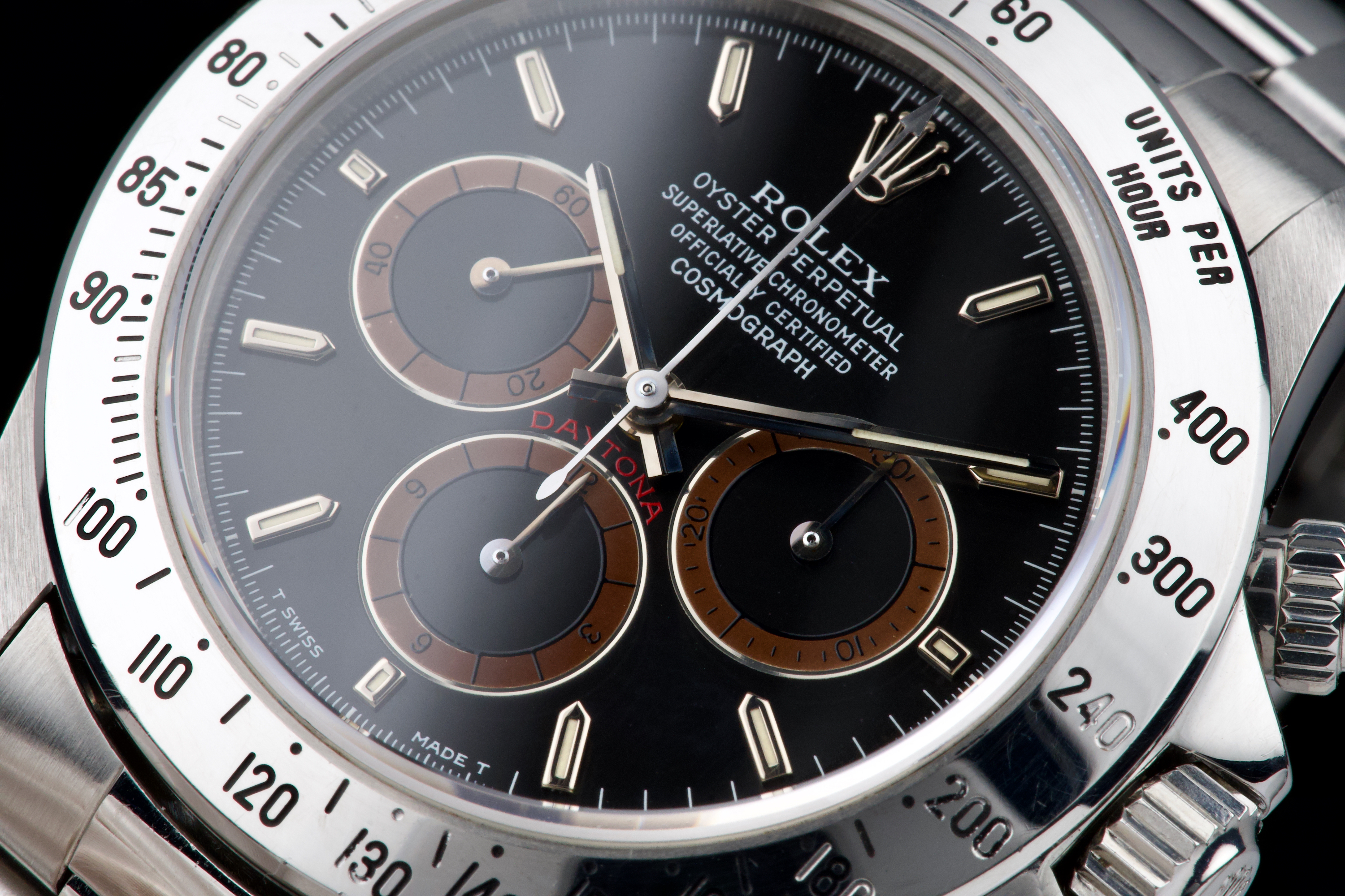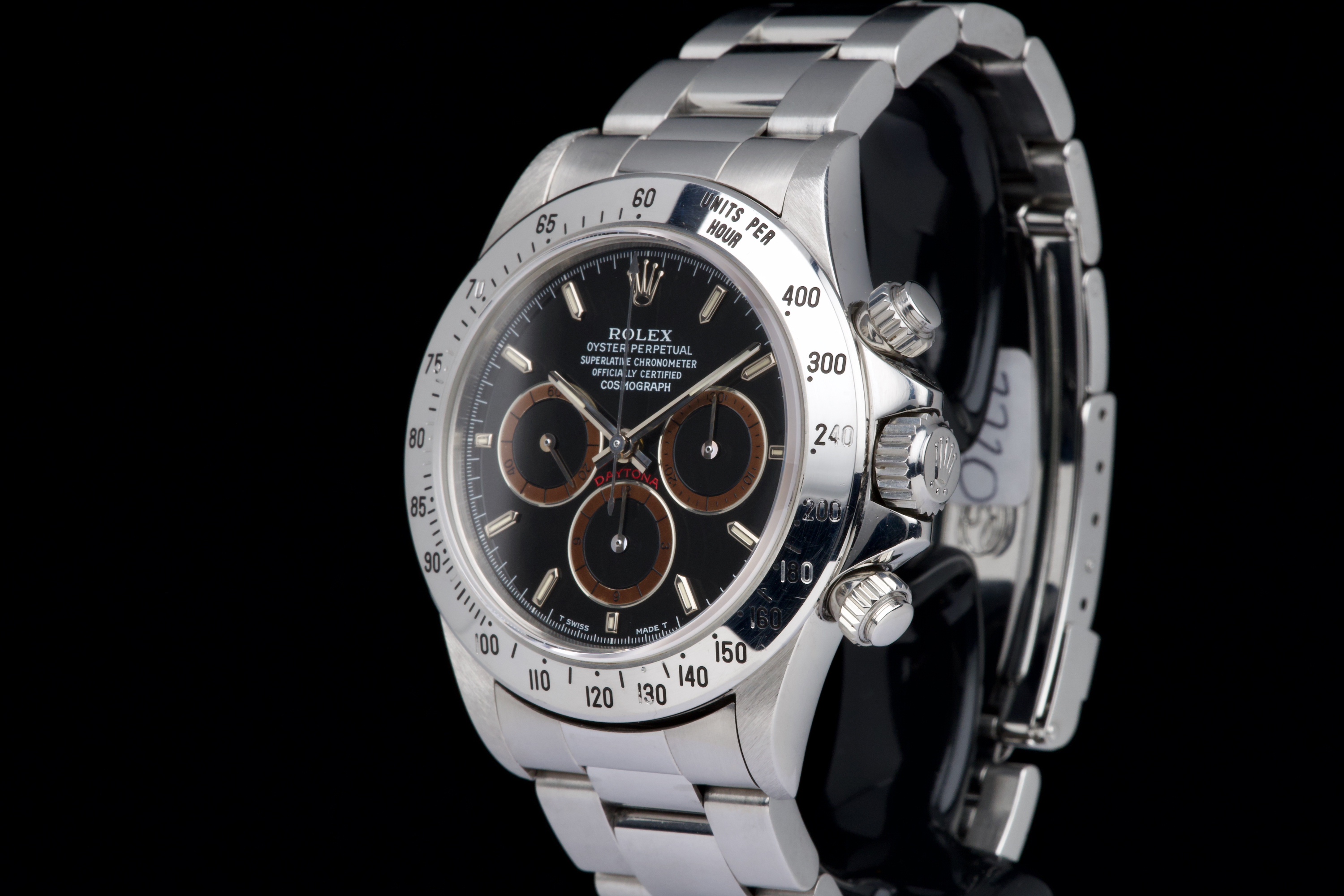 Rolex Daytona El Primero 16520 Patrizzi Box/Papers 1994 (S serial), landcode 430 malaysia, excellent and unpolished case that shows some wear consistent with age, green sticker still in place on the caseback, fantastic "patrizzi" inverted 6 tritium black dial avec des magbifiques compteur bruns foncés, le cadran est en super état général et montre extrêmement peu usure, les index sont légèrement vanille et les aiguilles matchent parfaitement, la lunette acier d'origine est aussi jamais polie, un peu d'écriture noir est parti mais usure normale, serial and ref number between the lugs are crips and well defined, bracelet 78390 oyster avec 503B endlinks qui a très peu de stretch, clascpode V6, comes with the set shown in the pictures, no service history, perfect working condition