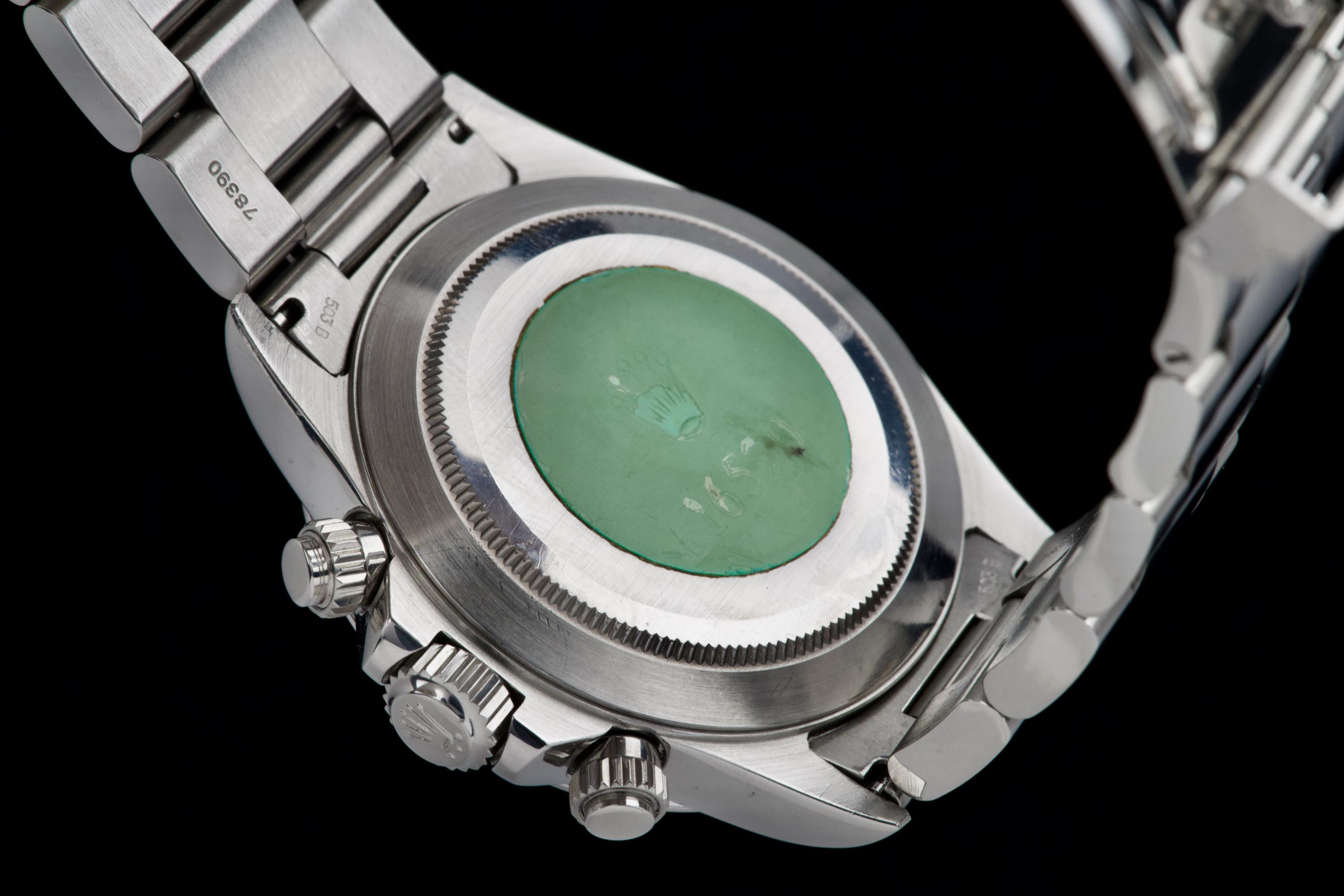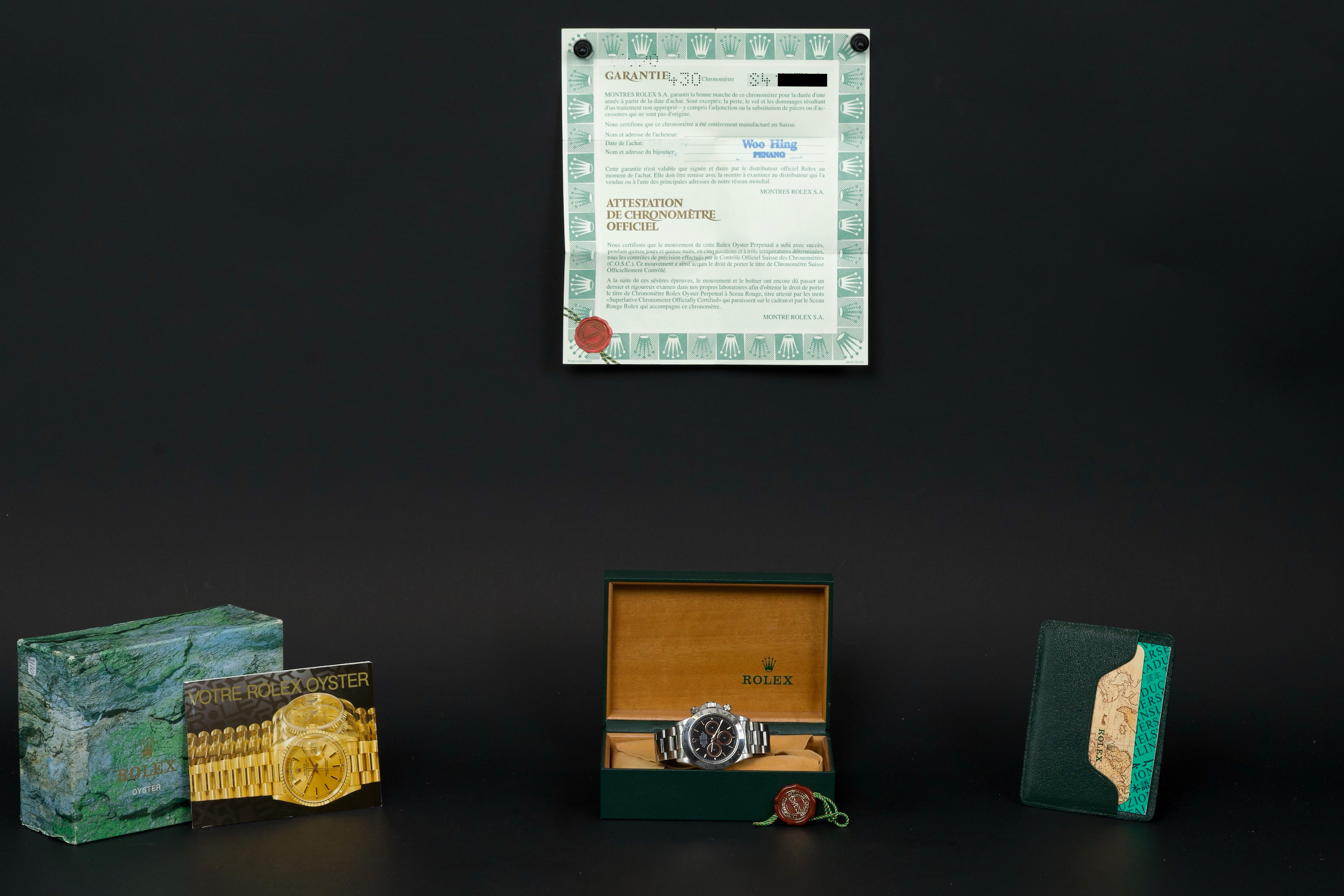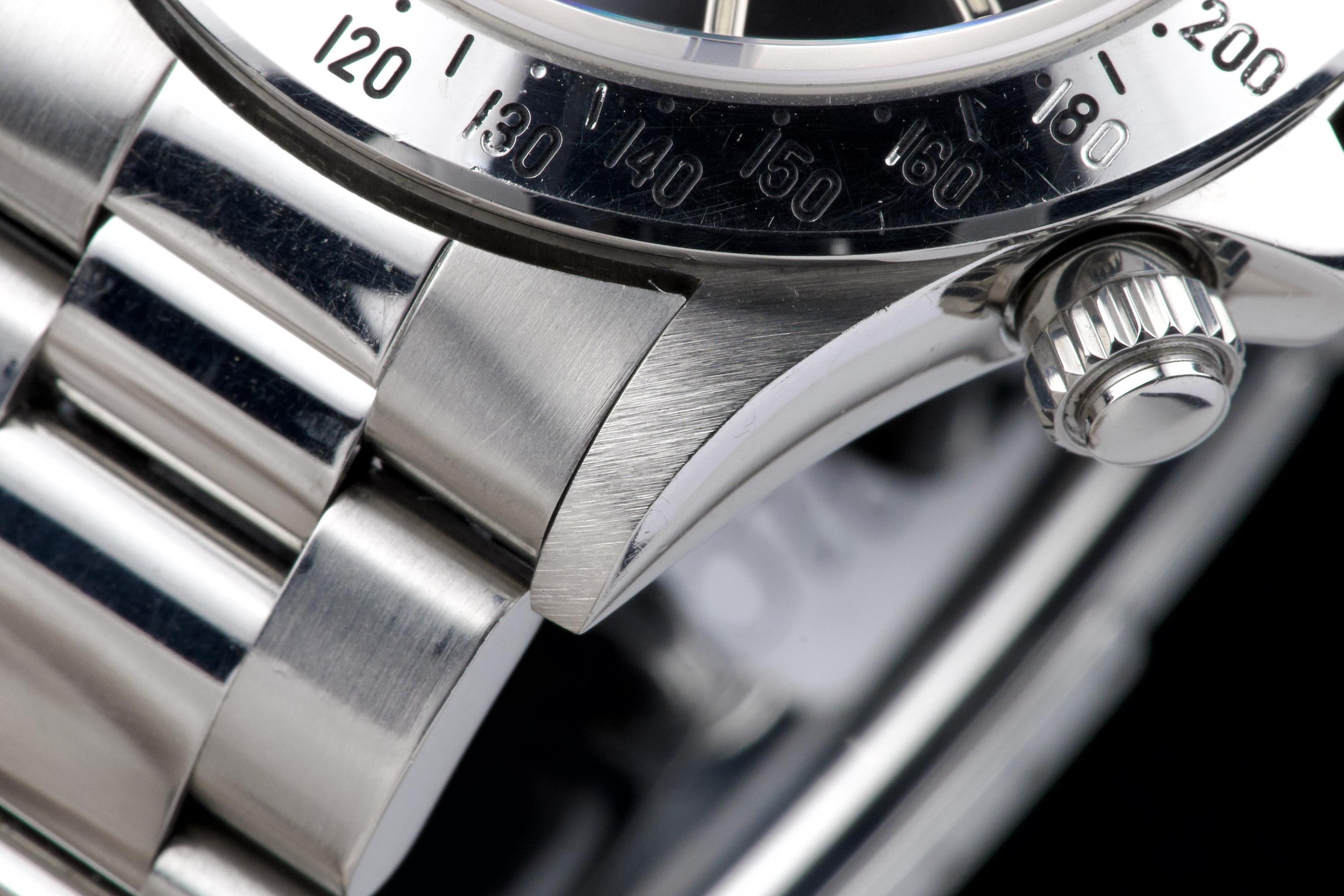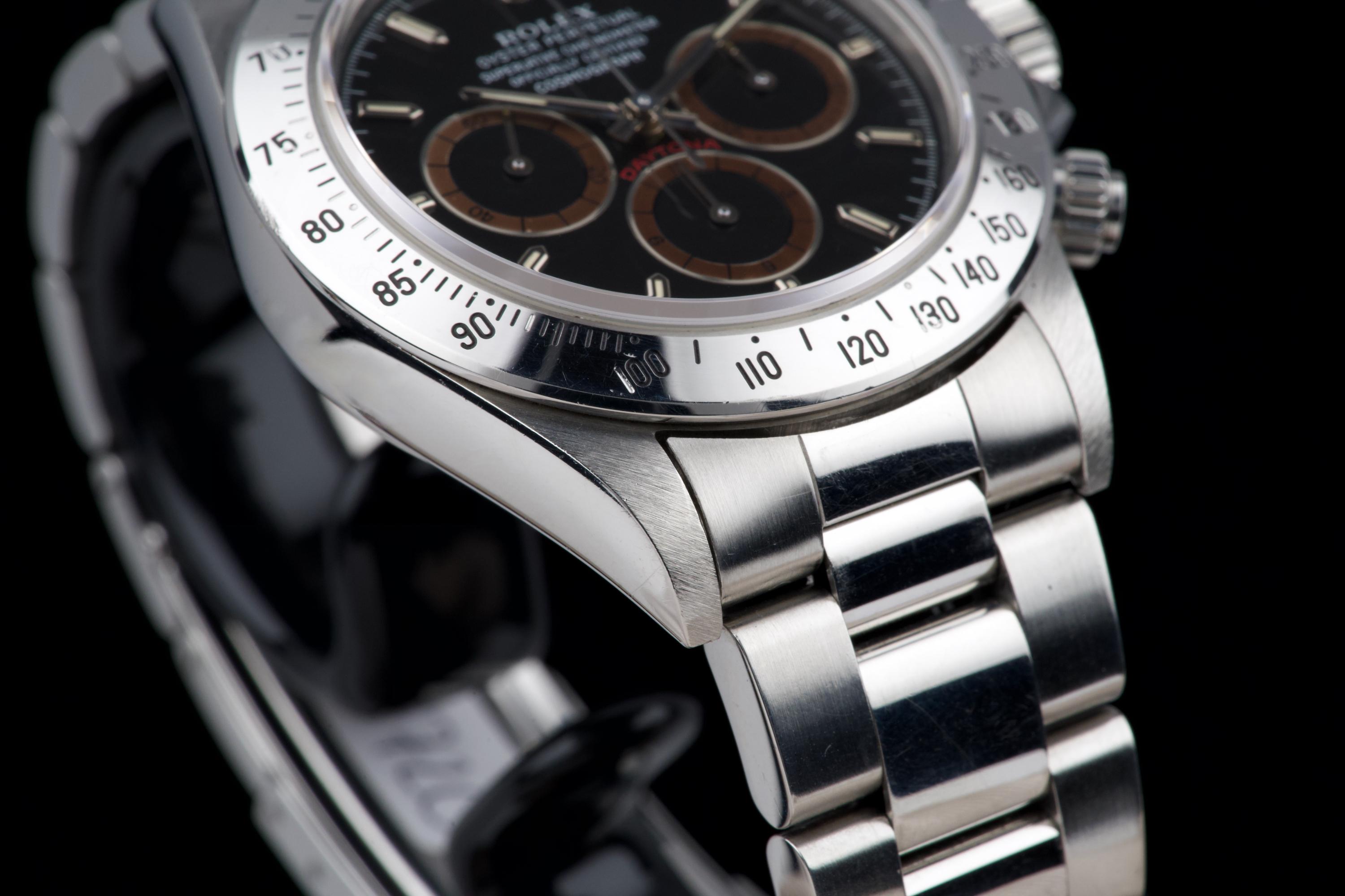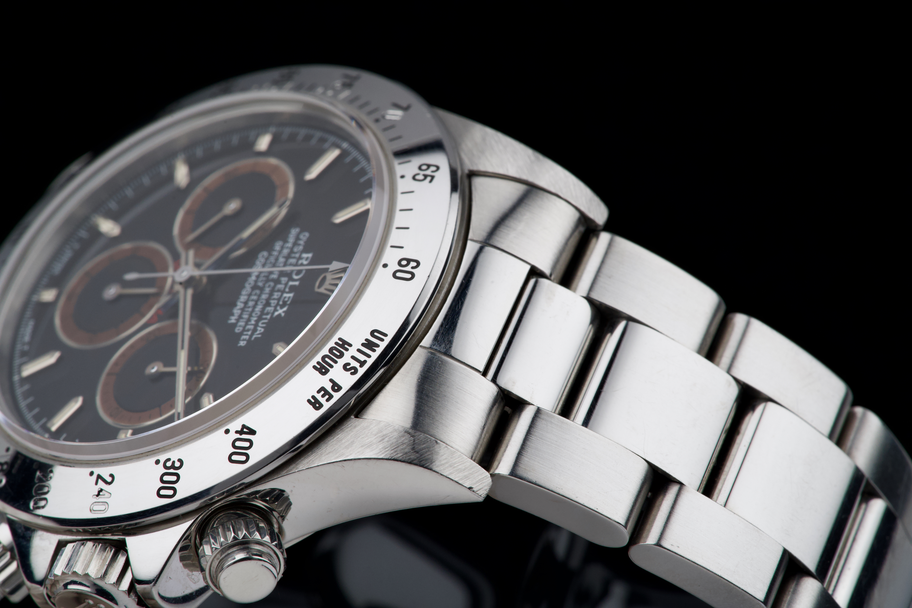 Rolex Daytona El Primero 16520 Patrizzi Box/Papers 1994 (S serial), landcode 430 malaysia, excellent and unpolished case that shows some wear consistent with age, green sticker still in place on the caseback, fantastic "patrizzi" inverted 6 tritium black dial avec des magbifiques compteur bruns foncés, le cadran est en super état général et montre extrêmement peu usure, les index sont légèrement vanille et les aiguilles matchent parfaitement, la lunette acier d'origine est aussi jamais polie, un peu d'écriture noir est parti mais usure normale, serial and ref number between the lugs are crips and well defined, bracelet 78390 oyster avec 503B endlinks qui a très peu de stretch, clascpode V6, comes with the set shown in the pictures, no service history, perfect working condition
