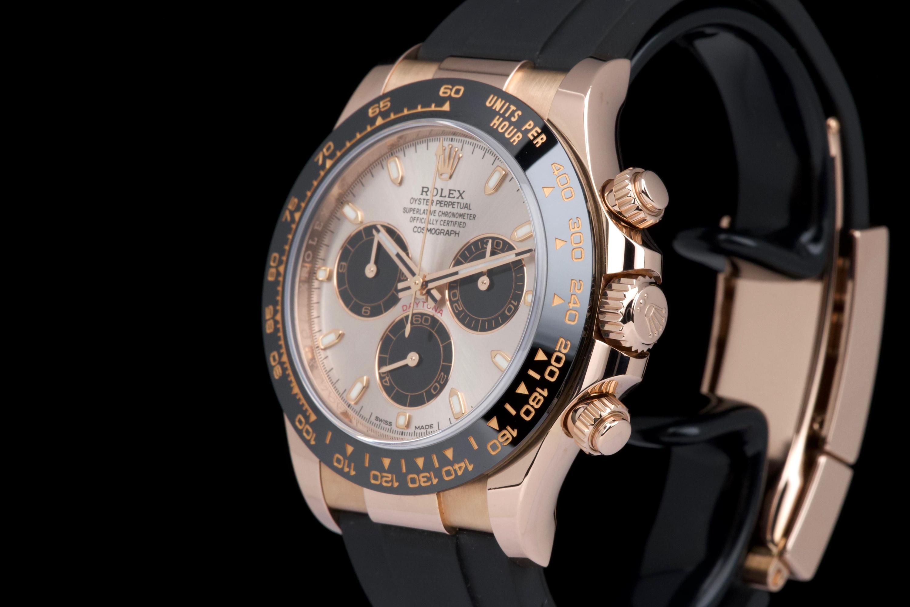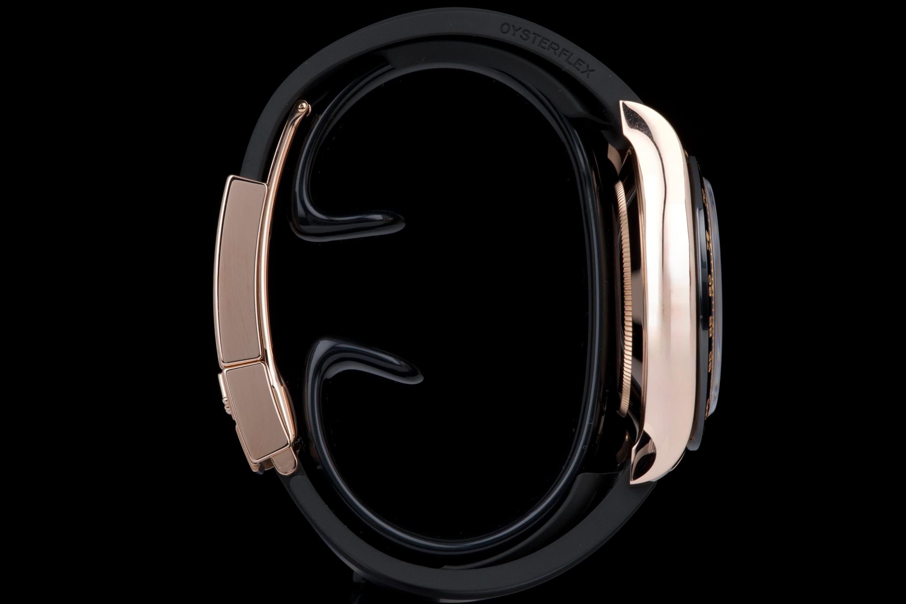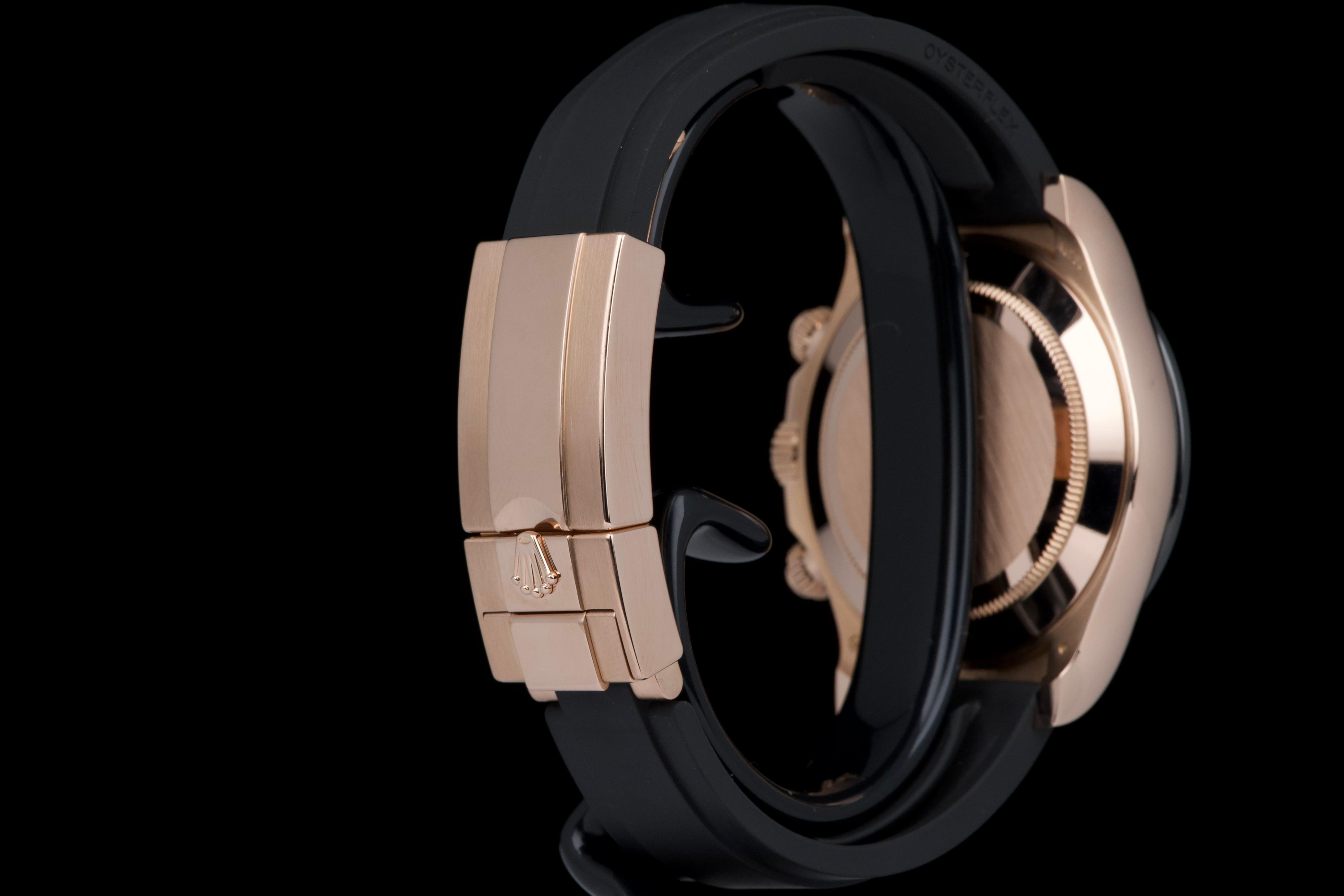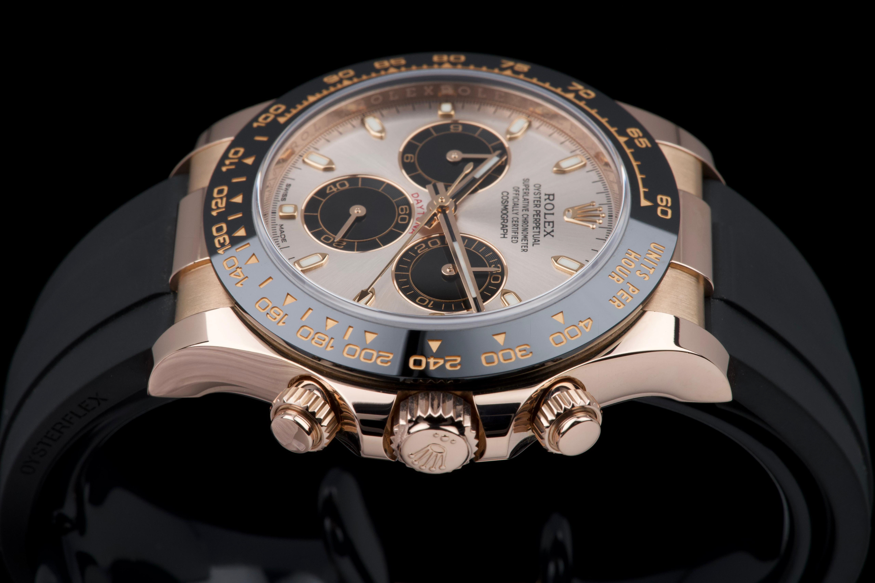 The present Rolex Cosmograph Daytona reference 116515LN, executed in Everose gold and fitted with the Oysterflex bracelet, dates to 2022 and is offered as a complete full set from its original owner. The case has just been professionally polished by our watchmaker and presents in excellent overall condition with crisp lines and a fresh appearance. The black Cerachrom bezel and warm Everose gold case create the distinctive modern aesthetic that has made this reference one of the most desirable contemporary Daytona configurations. The watch is fitted with Rolex’s innovative Oysterflex rubber bracelet, combining the durability of an elastomer strap with the structural integrity of a metal blade core, ensuring both comfort and robustness for everyday wear. Powered by Rolex’s in-house calibre 4130, the watch offers outstanding chronograph performance, reliability, and a power reserve of approximately 72 hours. Delivered as a full set from 2022 and benefiting from single-owner provenance, this Daytona 116515LN represents an excellent opportunity to acquire a modern Rolex chronograph in superb condition, combining precious-metal elegance with sporty versatility.