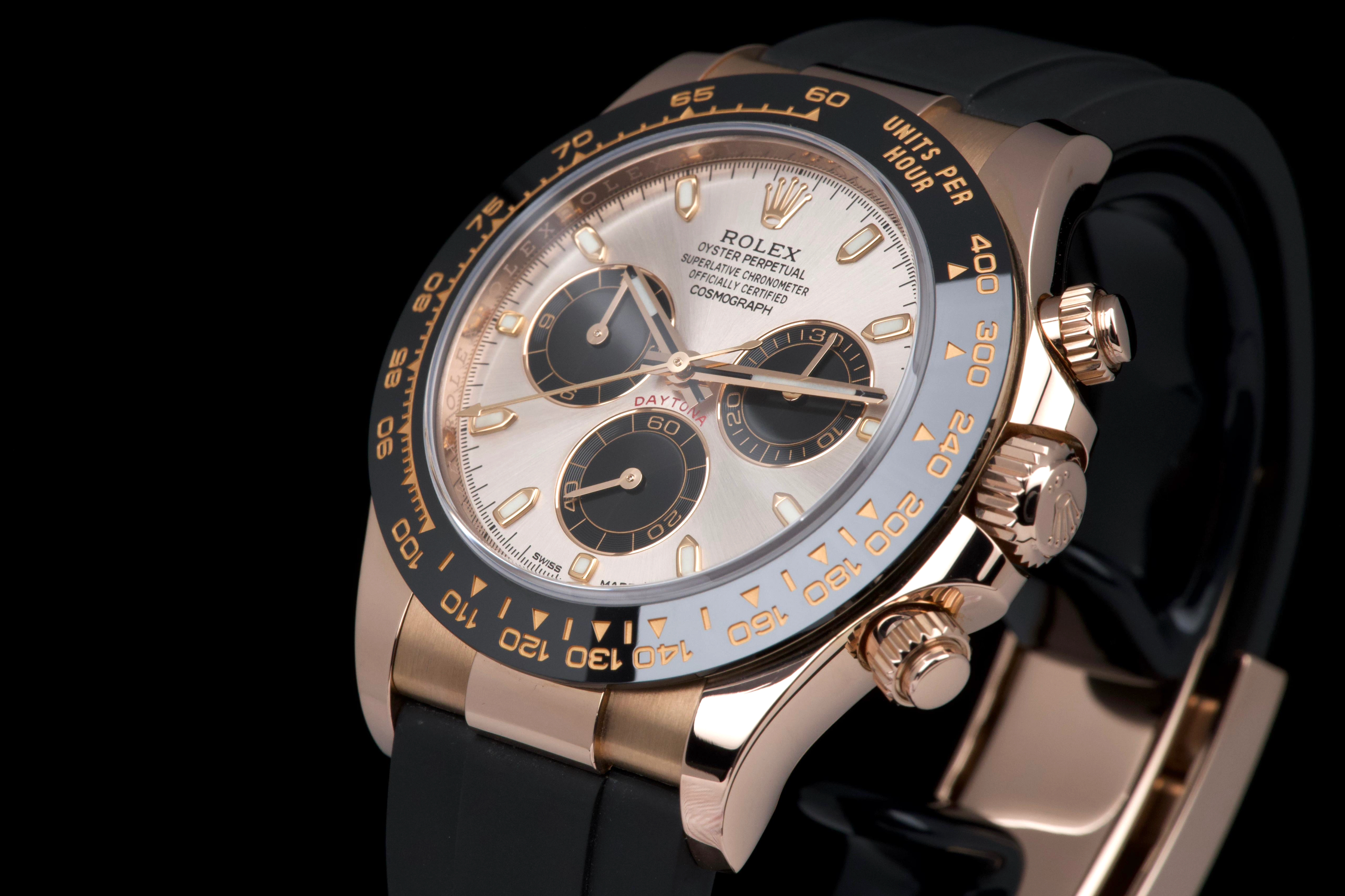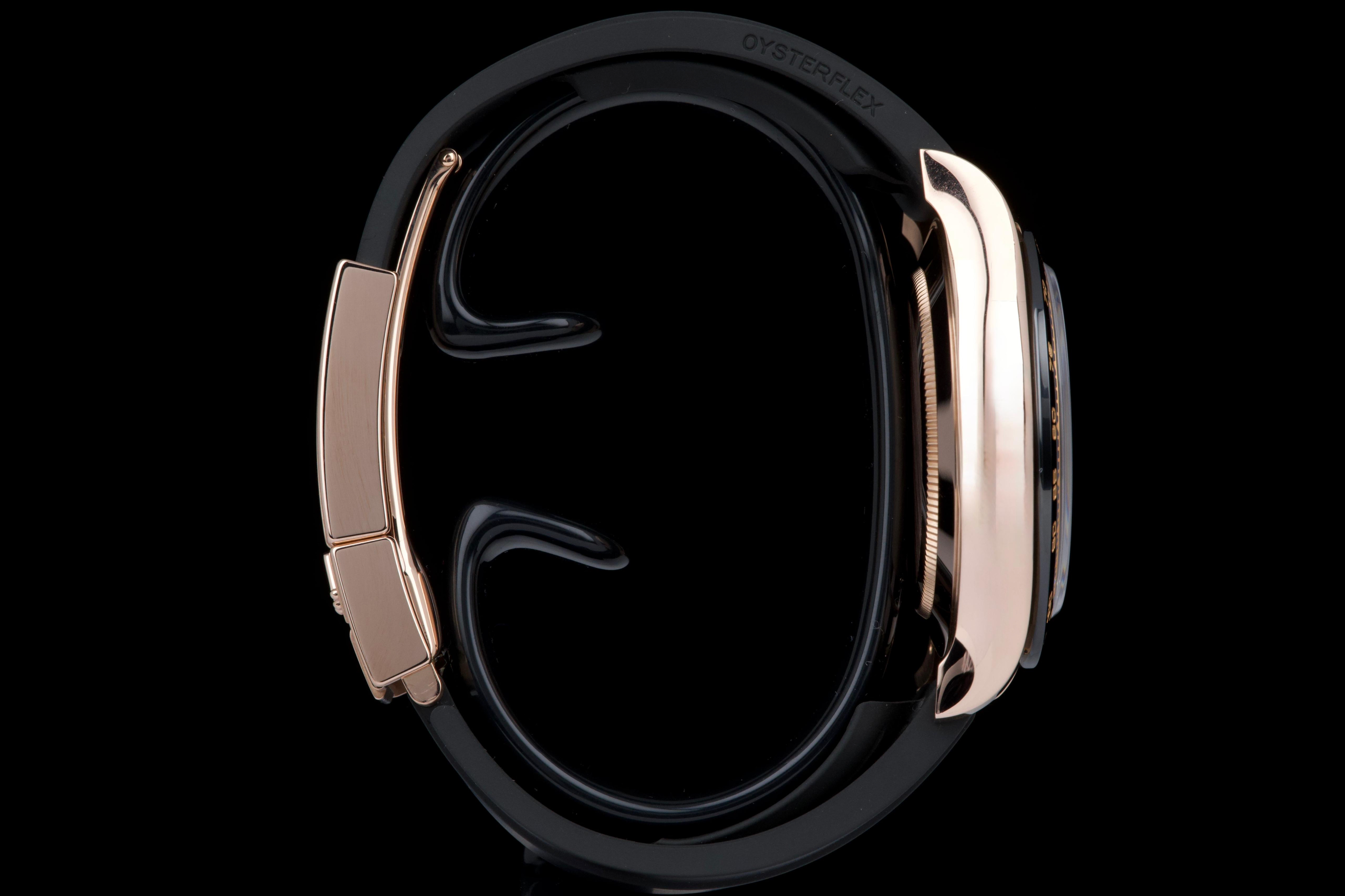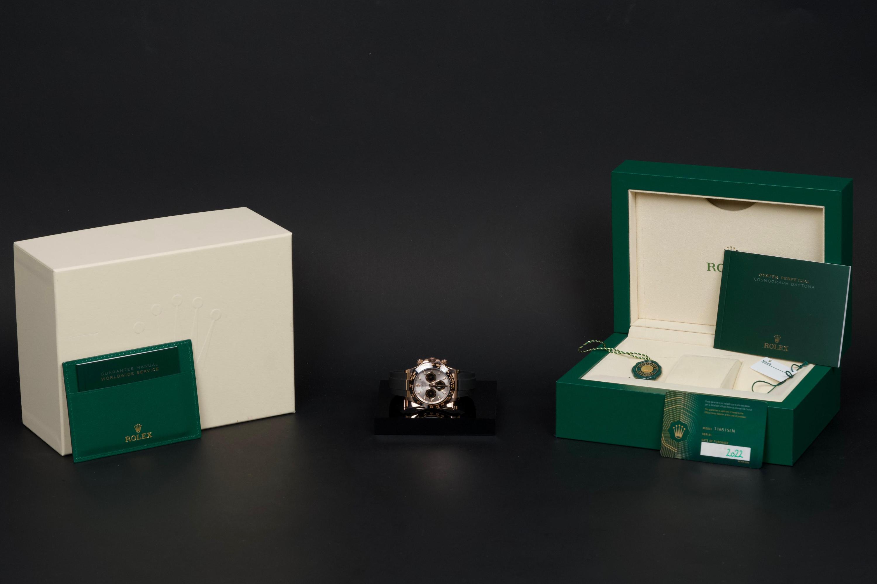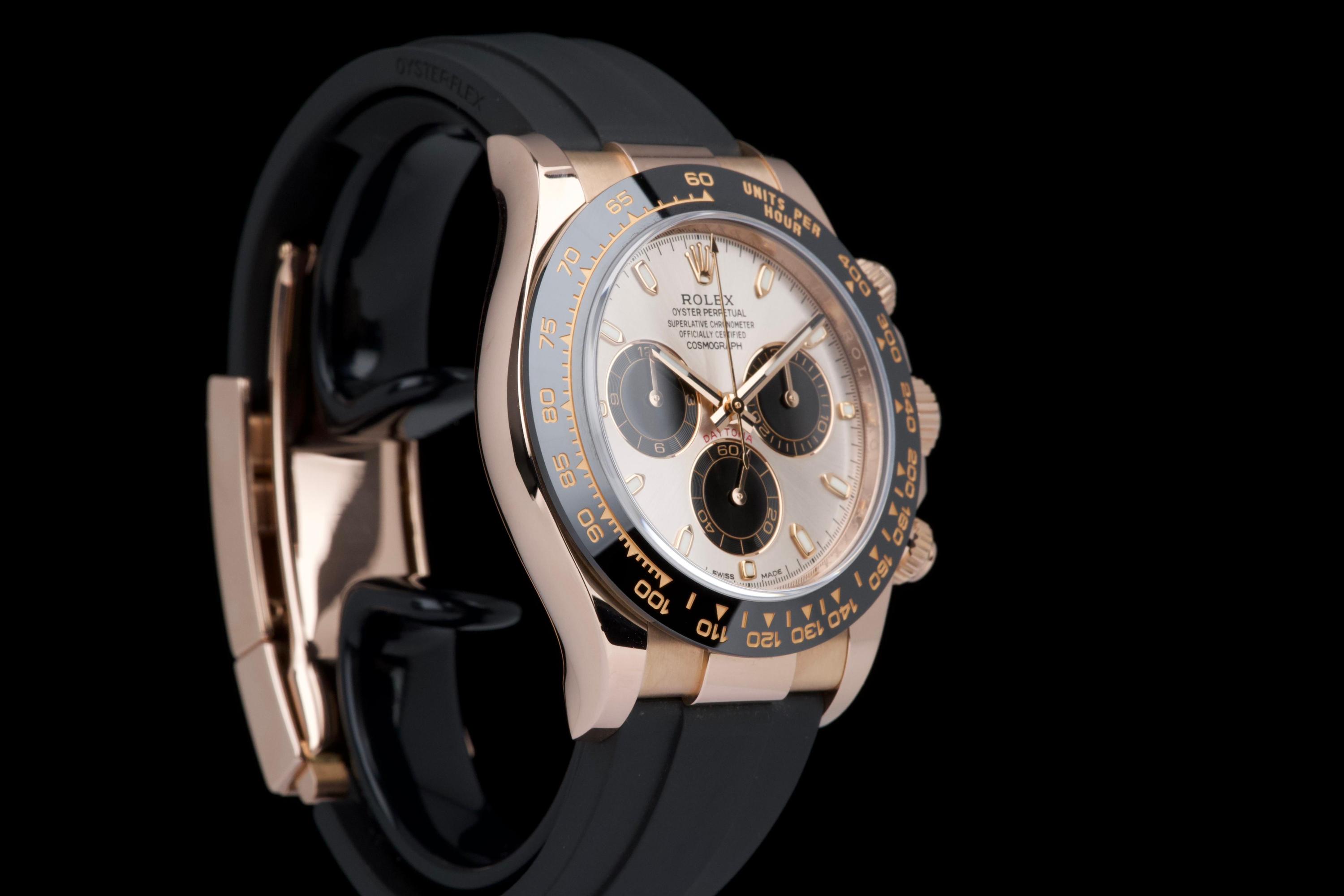 The present Rolex Cosmograph Daytona reference 116515LN, executed in Everose gold and fitted with the Oysterflex bracelet, dates to 2022 and is offered as a complete full set from its original owner. The case has just been professionally polished by our watchmaker and presents in excellent overall condition with crisp lines and a fresh appearance. The black Cerachrom bezel and warm Everose gold case create the distinctive modern aesthetic that has made this reference one of the most desirable contemporary Daytona configurations. The watch is fitted with Rolex’s innovative Oysterflex rubber bracelet, combining the durability of an elastomer strap with the structural integrity of a metal blade core, ensuring both comfort and robustness for everyday wear. Powered by Rolex’s in-house calibre 4130, the watch offers outstanding chronograph performance, reliability, and a power reserve of approximately 72 hours. Delivered as a full set from 2022 and benefiting from single-owner provenance, this Daytona 116515LN represents an excellent opportunity to acquire a modern Rolex chronograph in superb condition, combining precious-metal elegance with sporty versatility.