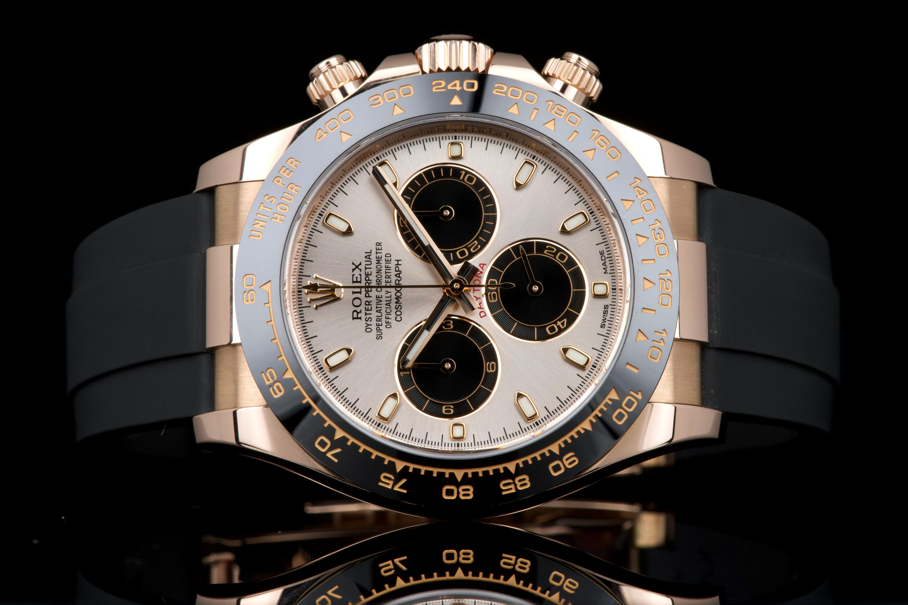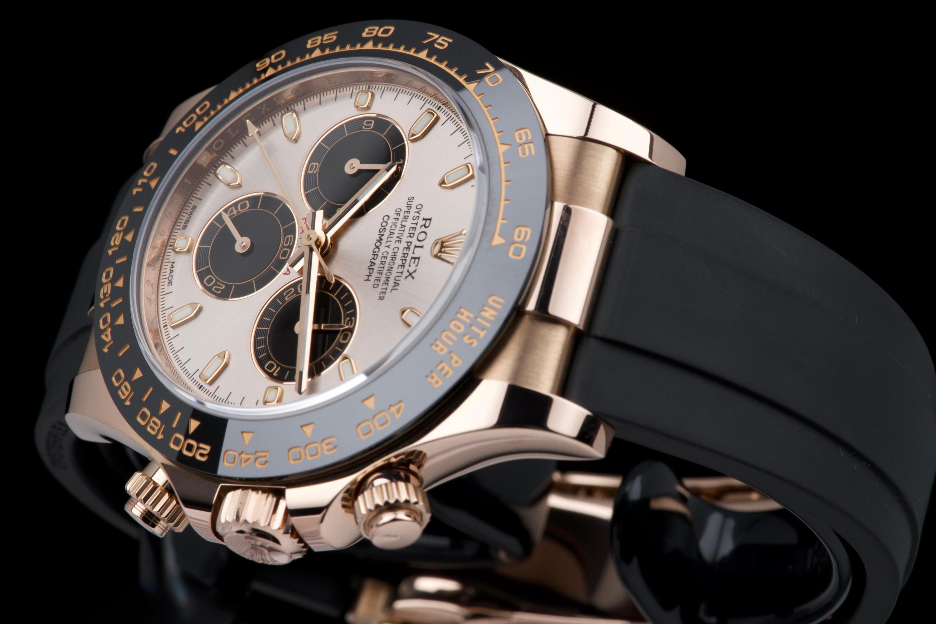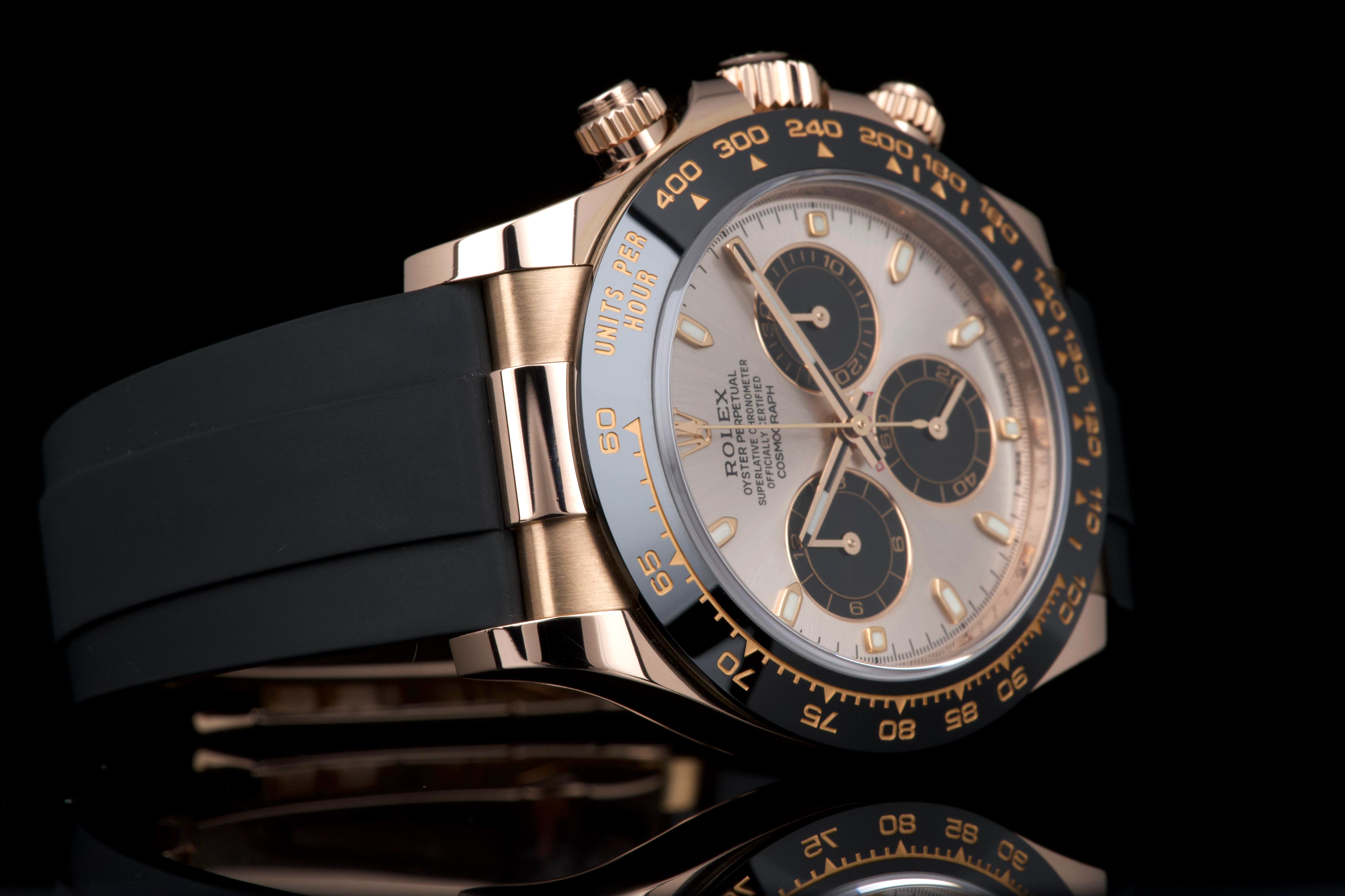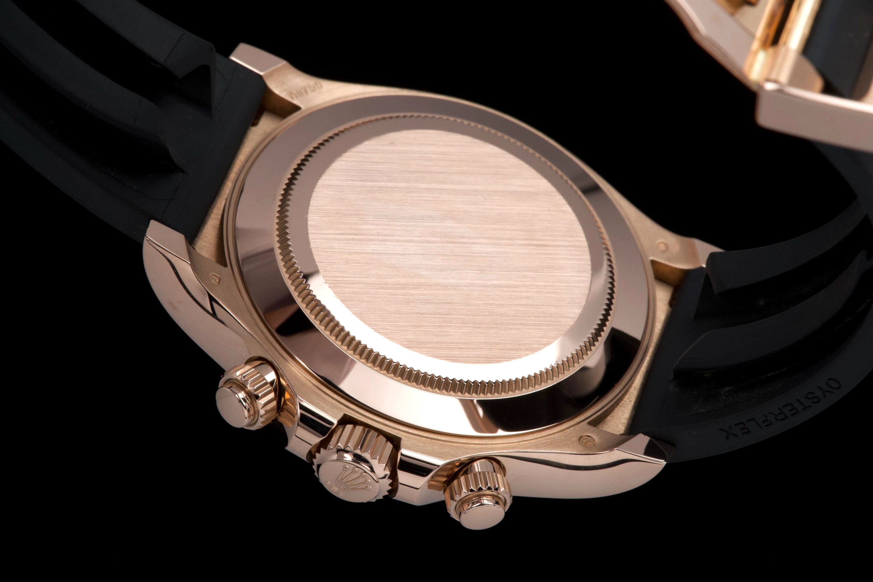 The present Rolex Cosmograph Daytona reference 116515LN, executed in Everose gold and fitted with the Oysterflex bracelet, dates to 2022 and is offered as a complete full set from its original owner. The case has just been professionally polished by our watchmaker and presents in excellent overall condition with crisp lines and a fresh appearance. The black Cerachrom bezel and warm Everose gold case create the distinctive modern aesthetic that has made this reference one of the most desirable contemporary Daytona configurations. The watch is fitted with Rolex’s innovative Oysterflex rubber bracelet, combining the durability of an elastomer strap with the structural integrity of a metal blade core, ensuring both comfort and robustness for everyday wear. Powered by Rolex’s in-house calibre 4130, the watch offers outstanding chronograph performance, reliability, and a power reserve of approximately 72 hours. Delivered as a full set from 2022 and benefiting from single-owner provenance, this Daytona 116515LN represents an excellent opportunity to acquire a modern Rolex chronograph in superb condition, combining precious-metal elegance with sporty versatility.