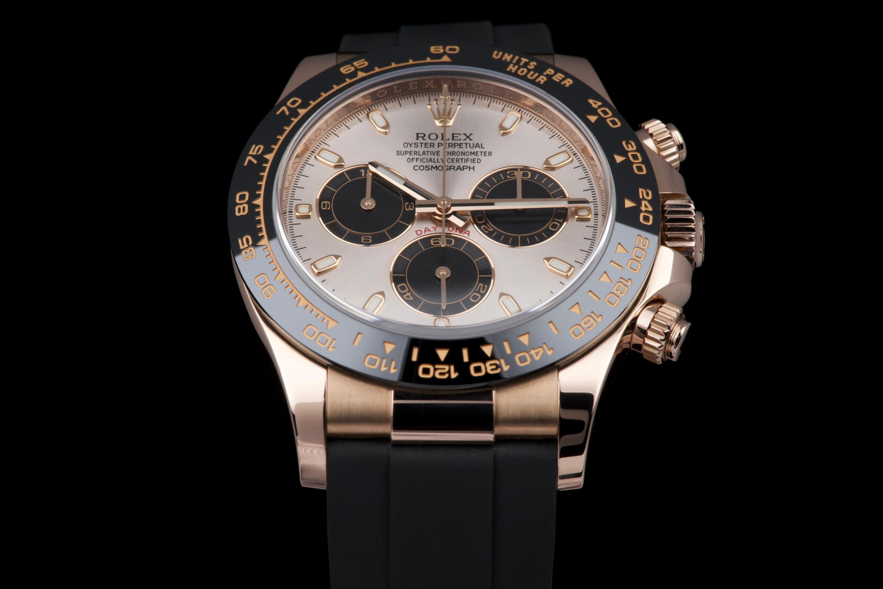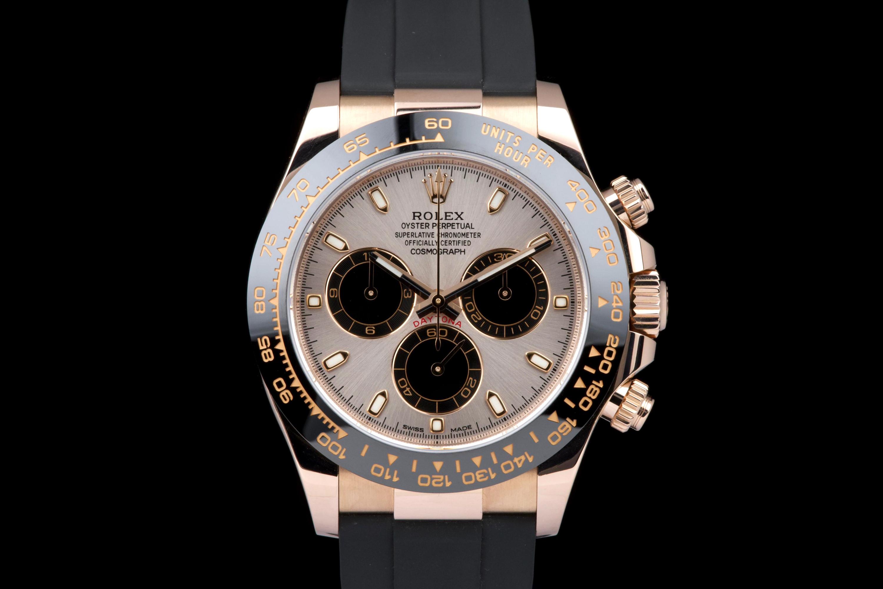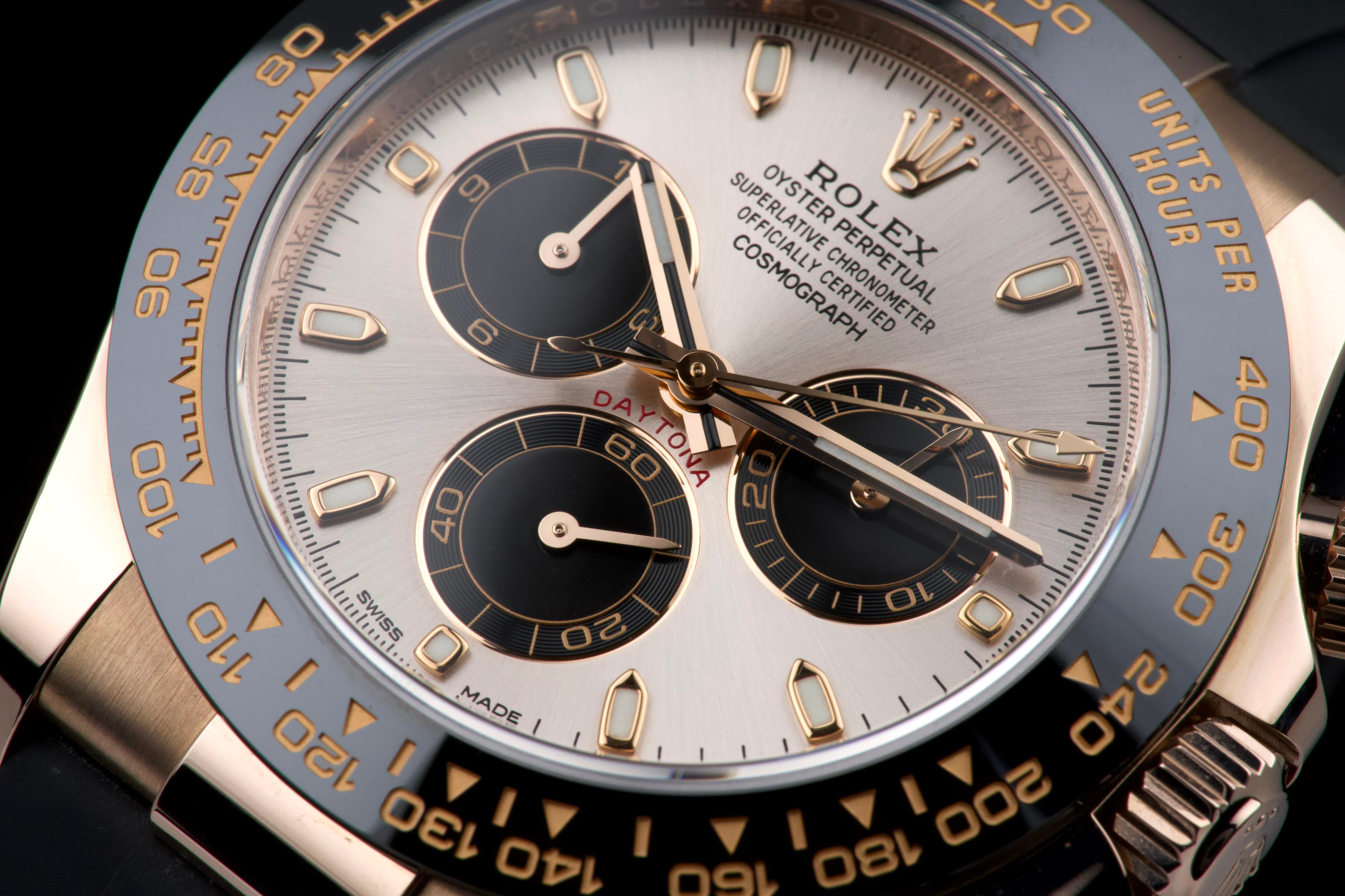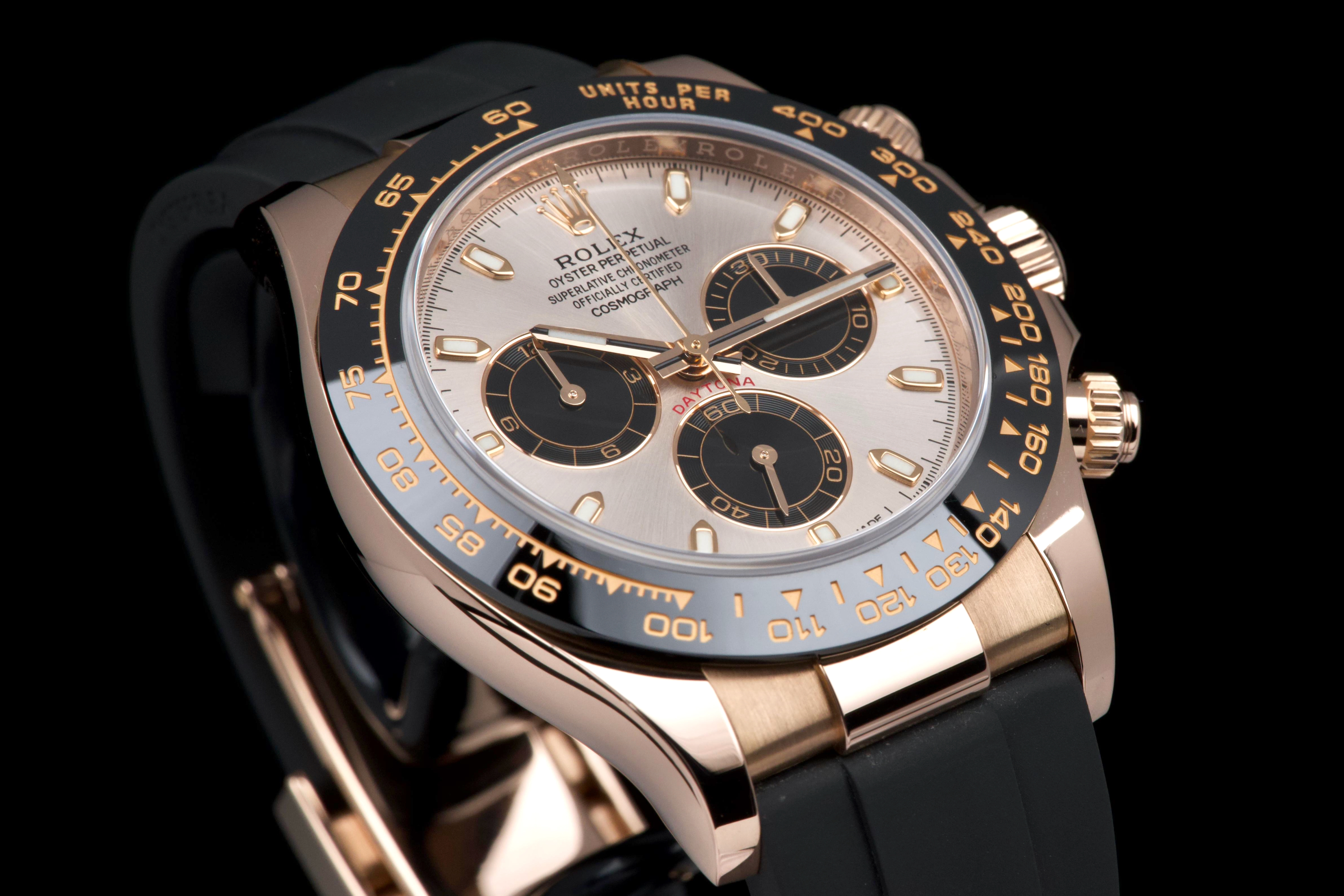 The present Rolex Cosmograph Daytona reference 116515LN, executed in Everose gold and fitted with the Oysterflex bracelet, dates to 2022 and is offered as a complete full set from its original owner. The case has just been professionally polished by our watchmaker and presents in excellent overall condition with crisp lines and a fresh appearance. The black Cerachrom bezel and warm Everose gold case create the distinctive modern aesthetic that has made this reference one of the most desirable contemporary Daytona configurations. The watch is fitted with Rolex’s innovative Oysterflex rubber bracelet, combining the durability of an elastomer strap with the structural integrity of a metal blade core, ensuring both comfort and robustness for everyday wear. Powered by Rolex’s in-house calibre 4130, the watch offers outstanding chronograph performance, reliability, and a power reserve of approximately 72 hours. Delivered as a full set from 2022 and benefiting from single-owner provenance, this Daytona 116515LN represents an excellent opportunity to acquire a modern Rolex chronograph in superb condition, combining precious-metal elegance with sporty versatility.